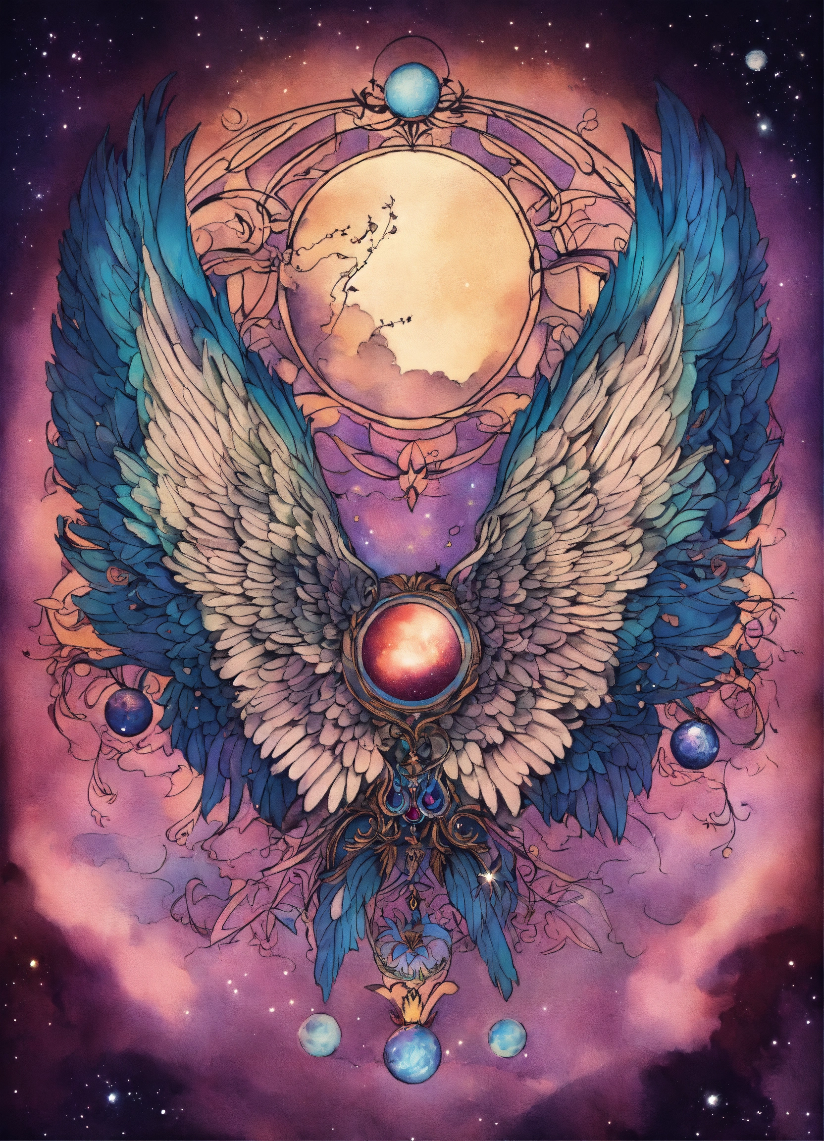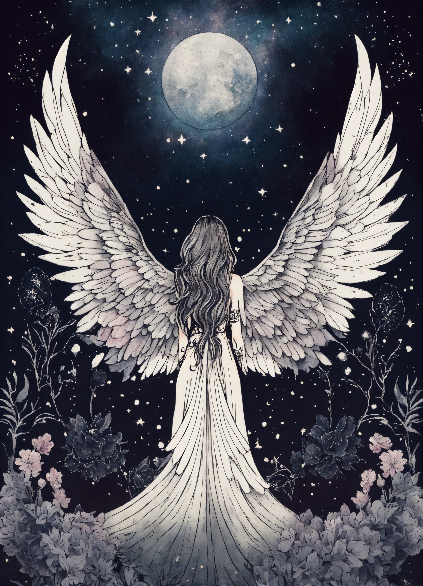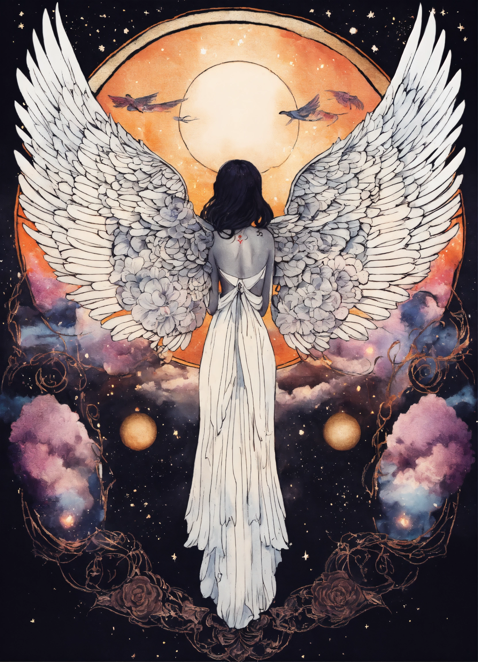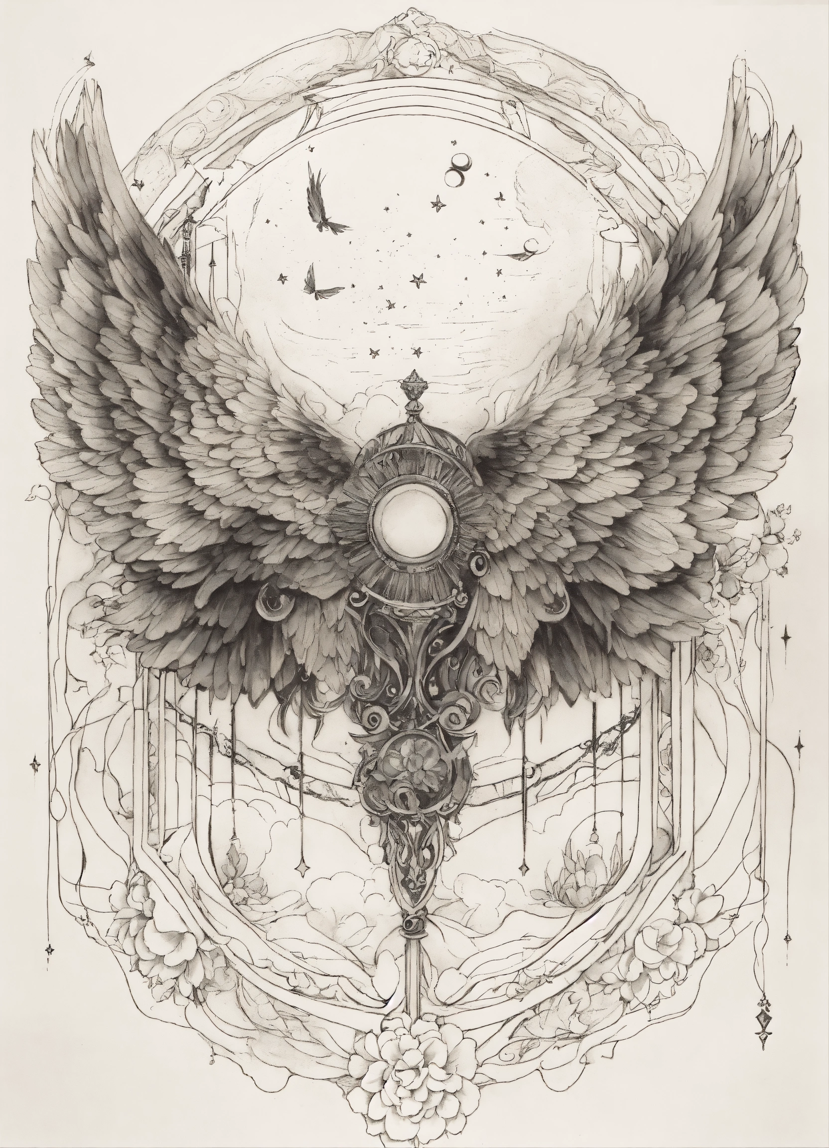 Tattoo style ink drawing mystical and magical glimpse of pair of wings the back looking surrounded by the cosmos