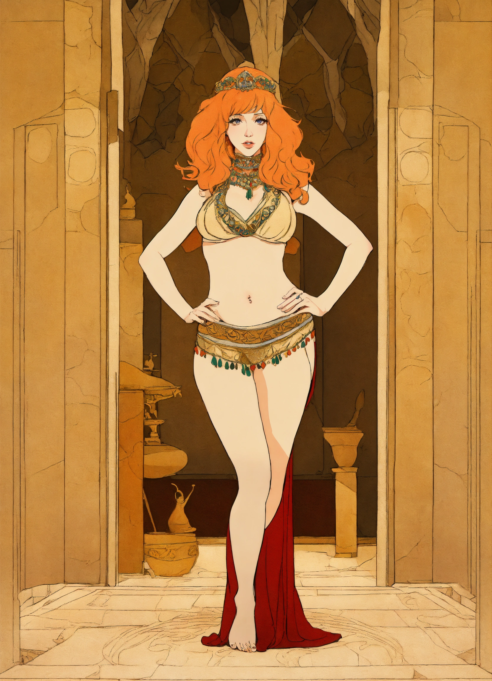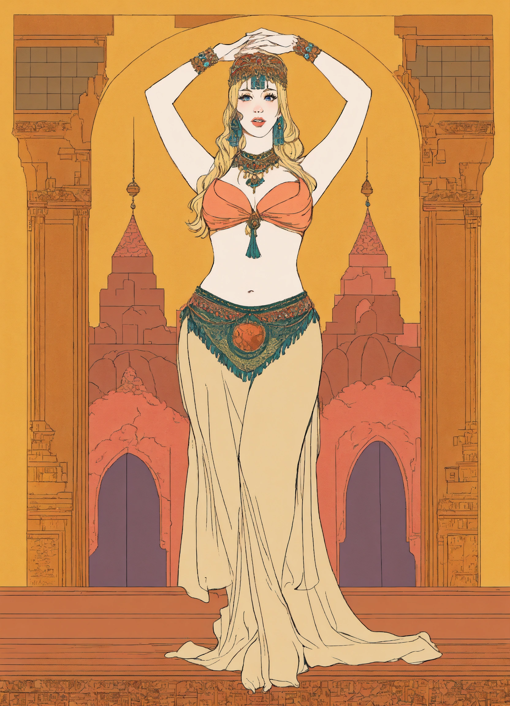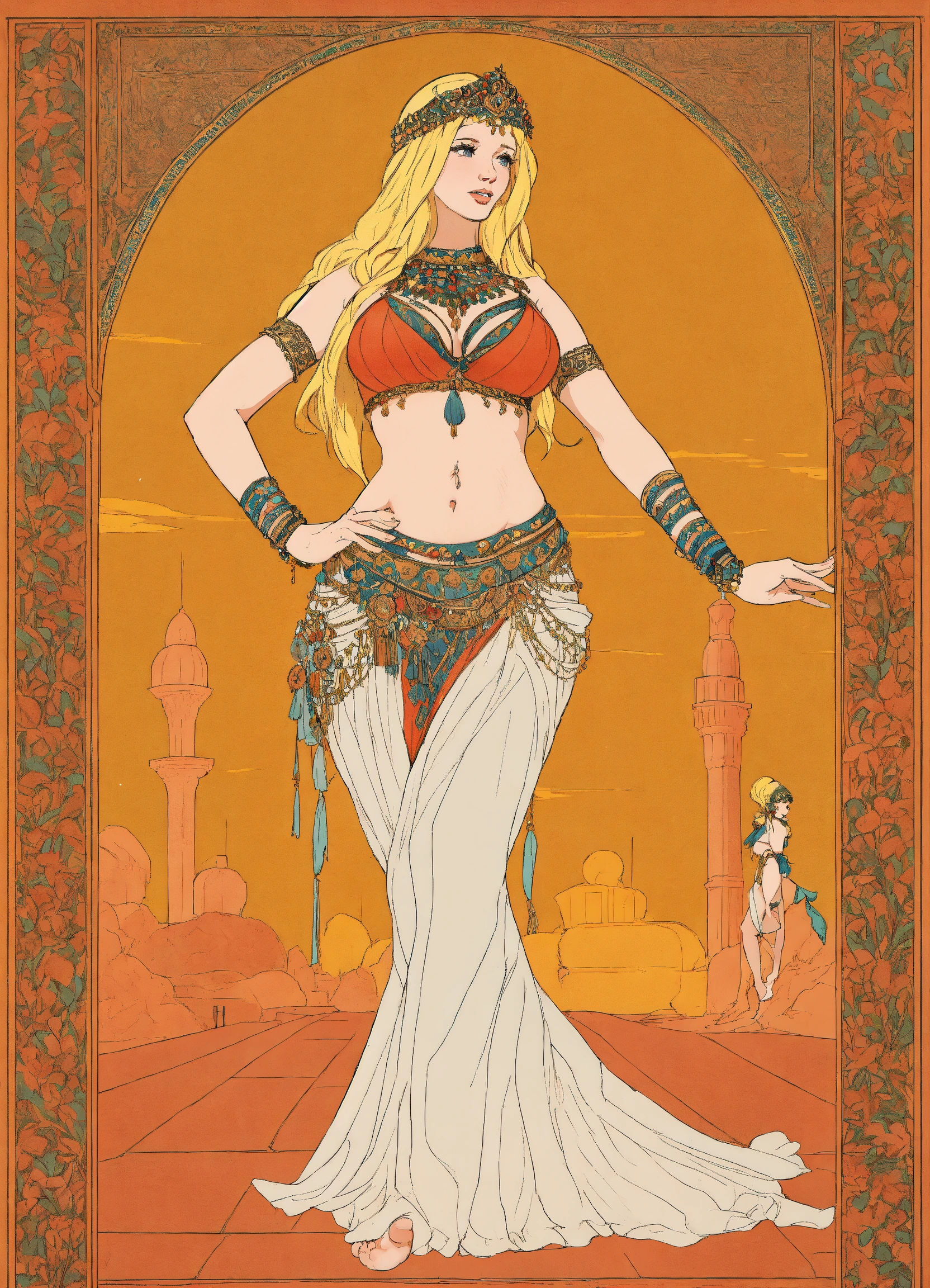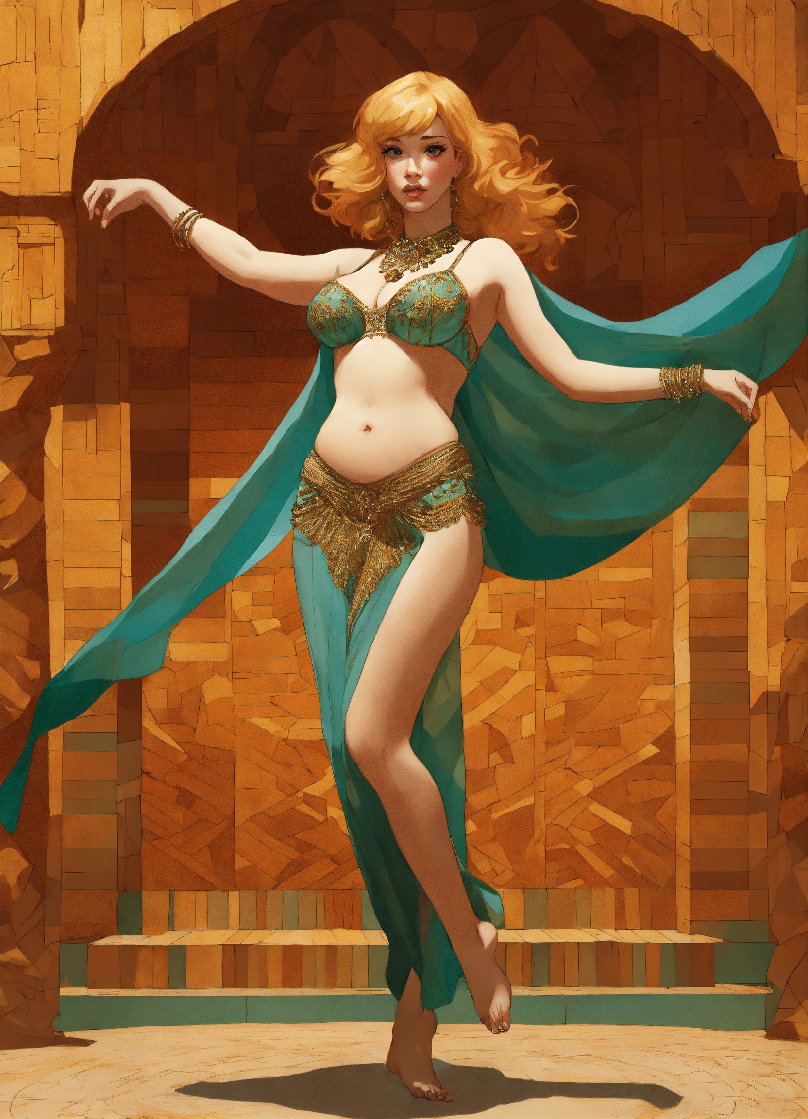 Blonde christina hendricks as gigantomastic belly dancer, steatopygia, full body, 1960's fantasy book cover, paper drawing, minimalist far perspective, style by stefan kostic, barefoot, jordan grimmer, barefeet, gigantomastia, greg rutkowski