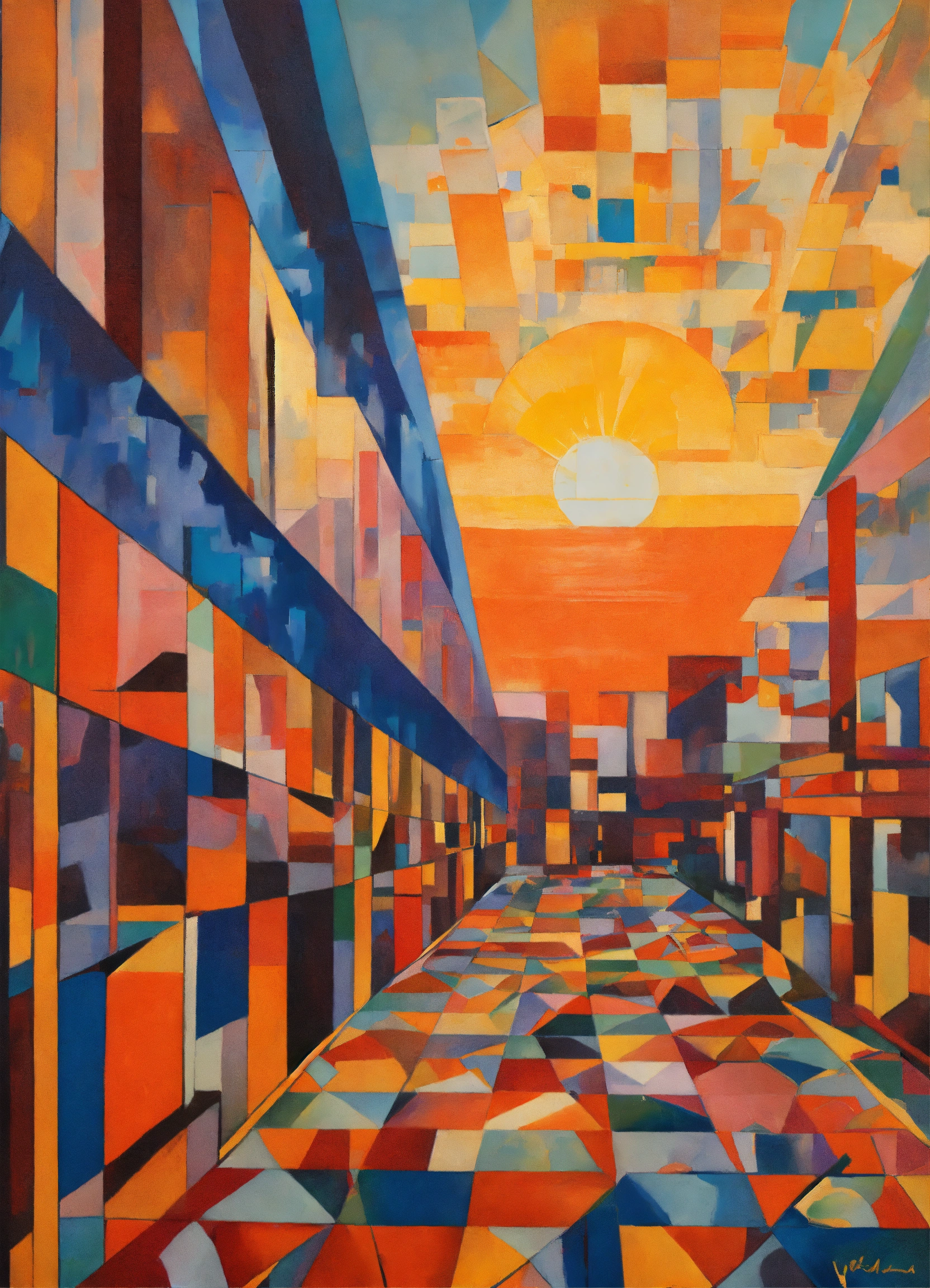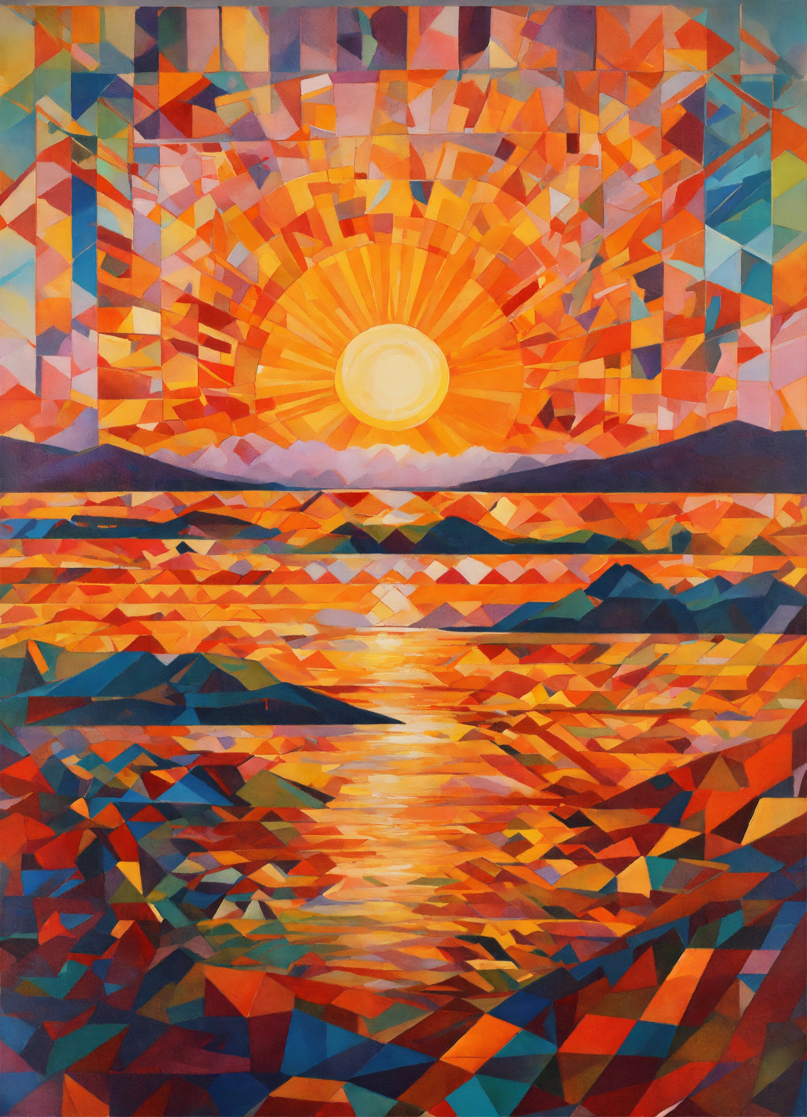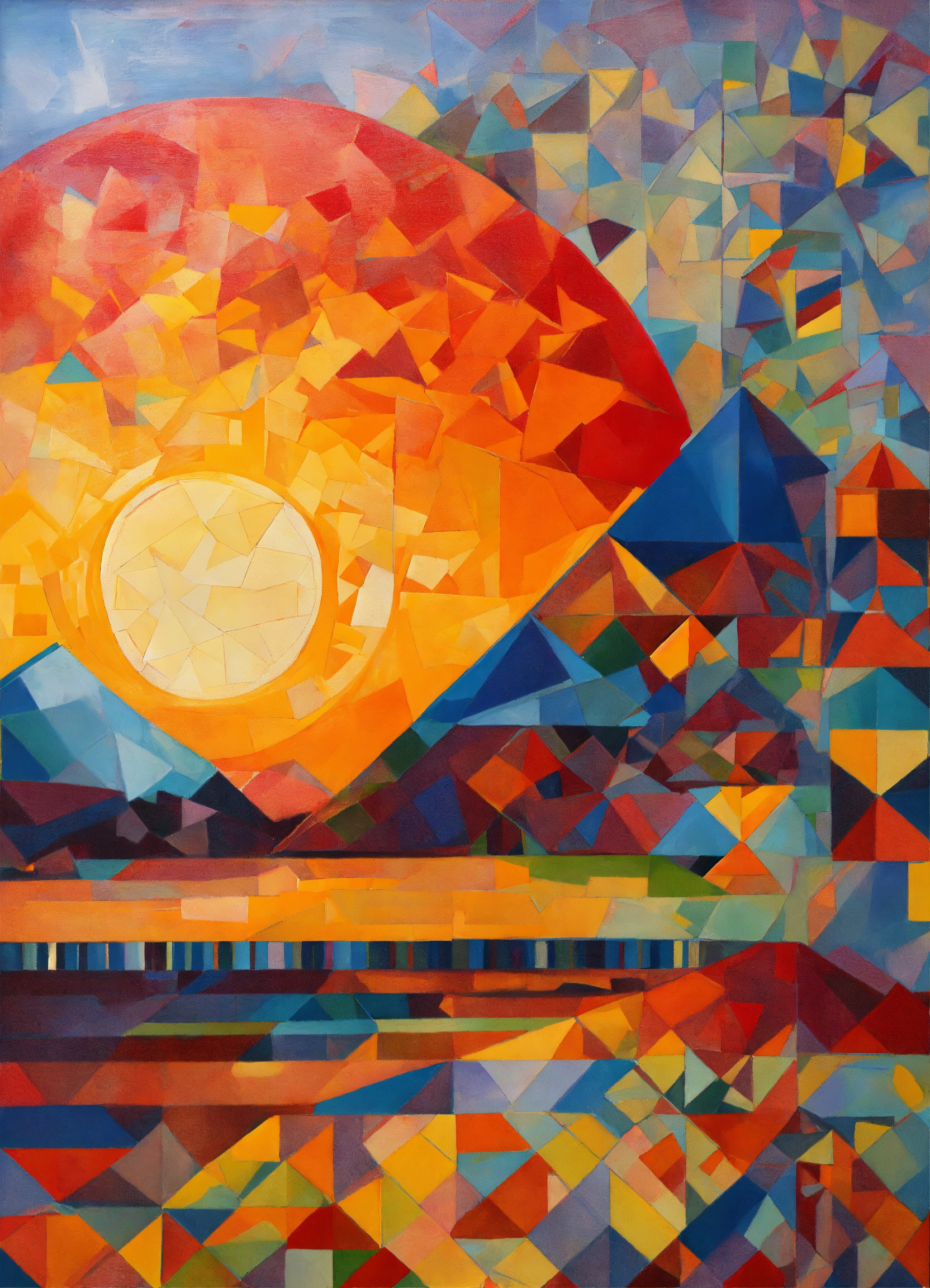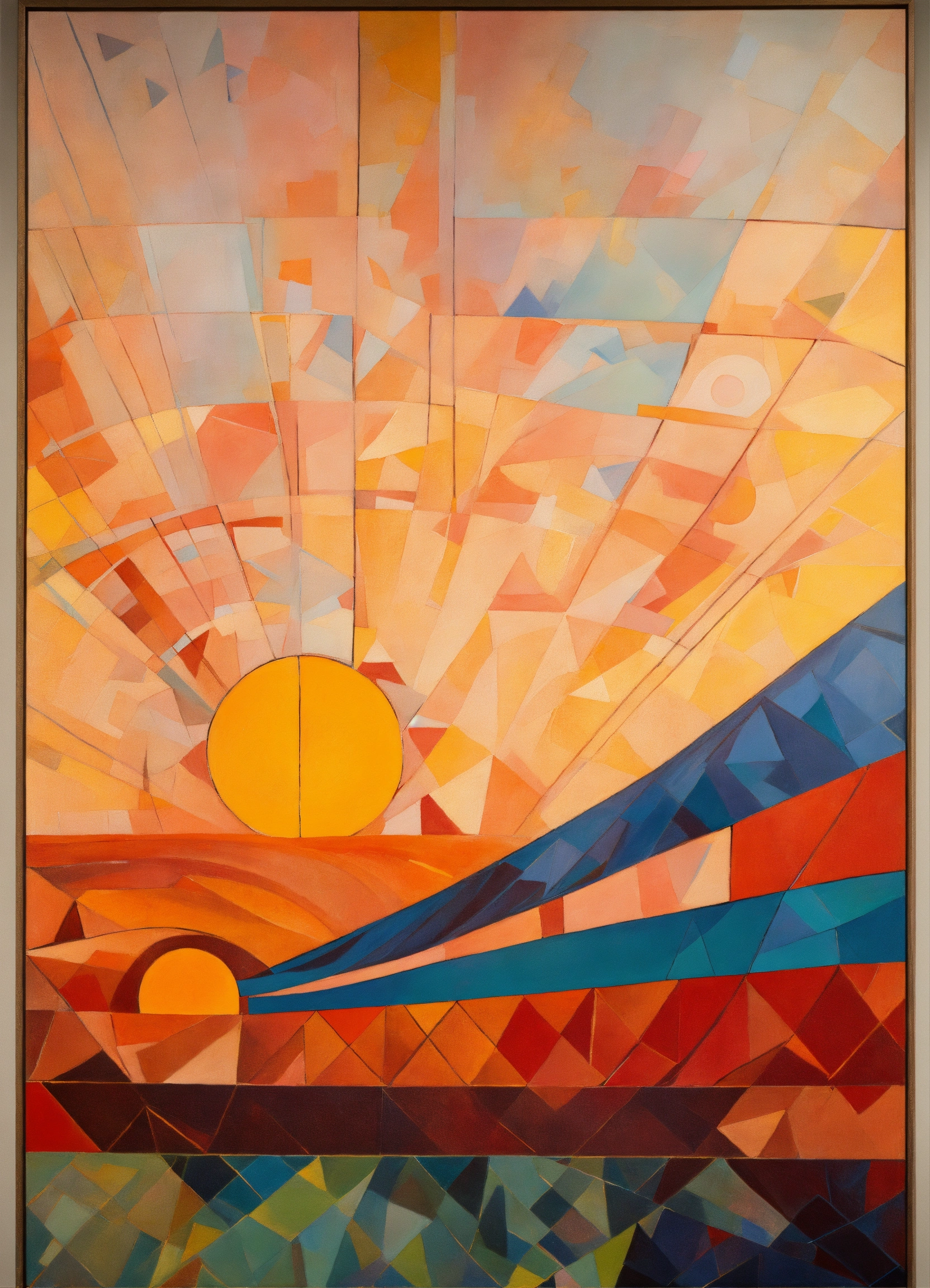 A neo expressionist painting of an a sunrise partially obscured by a challenging geometric pattern