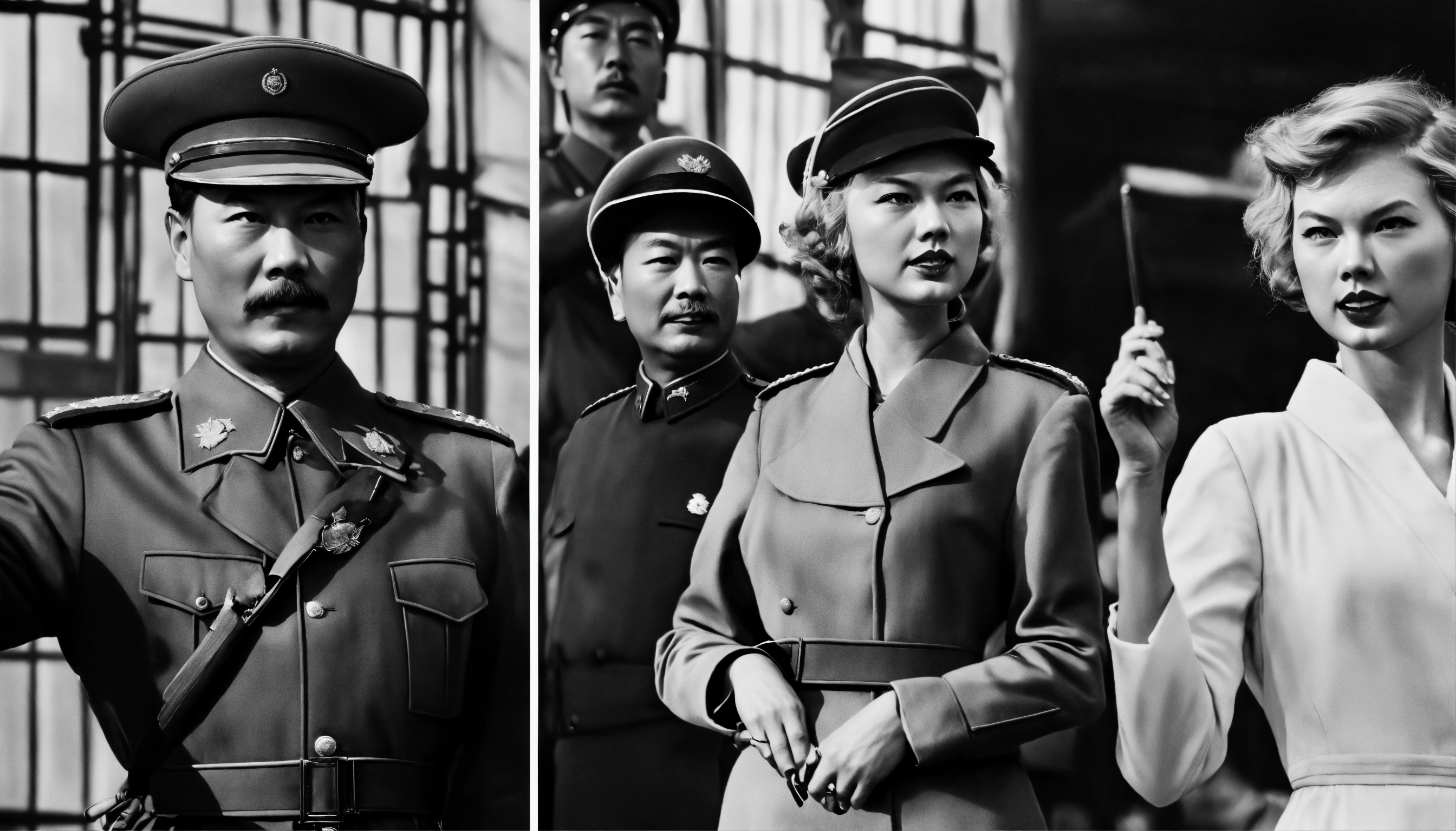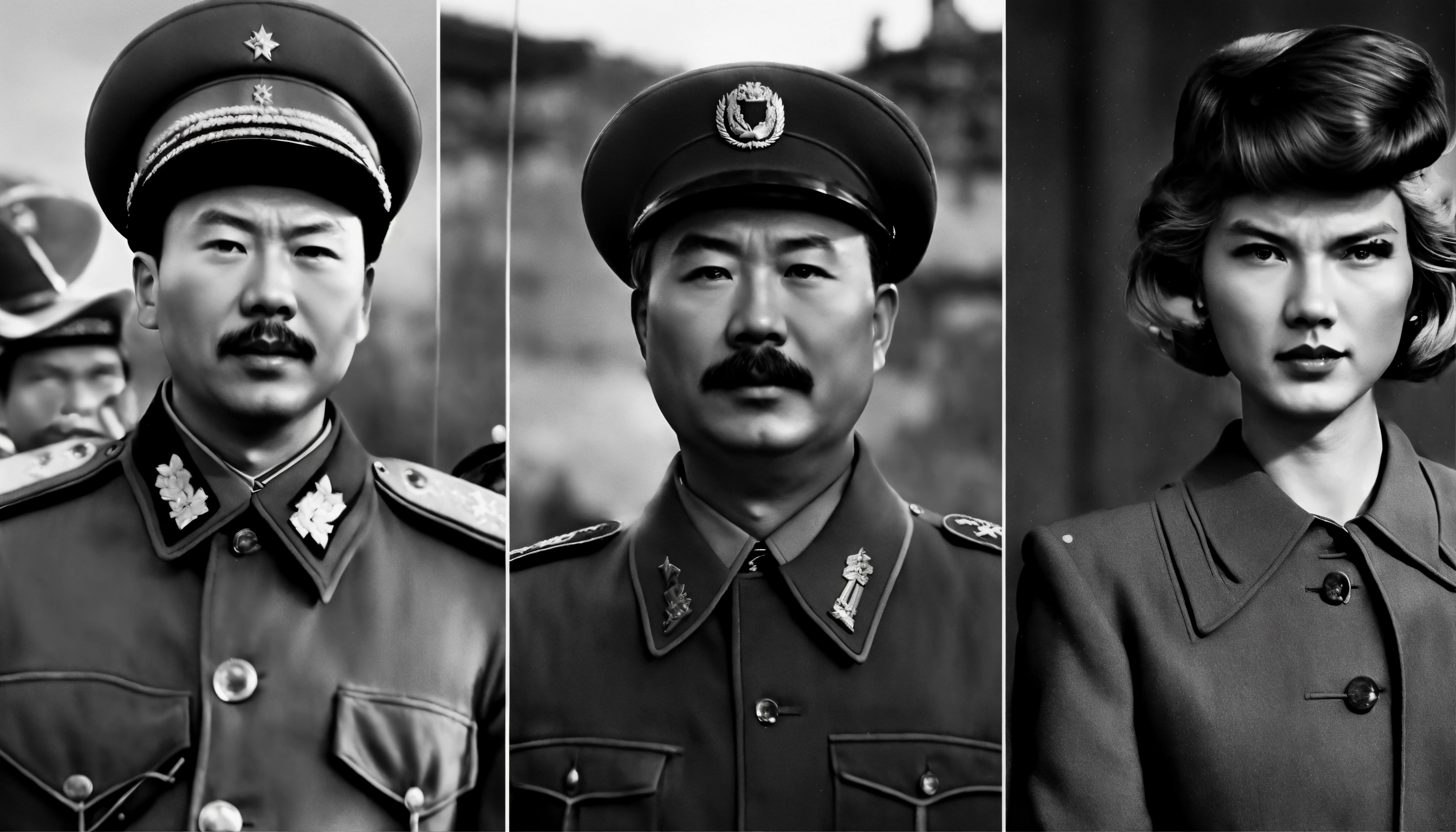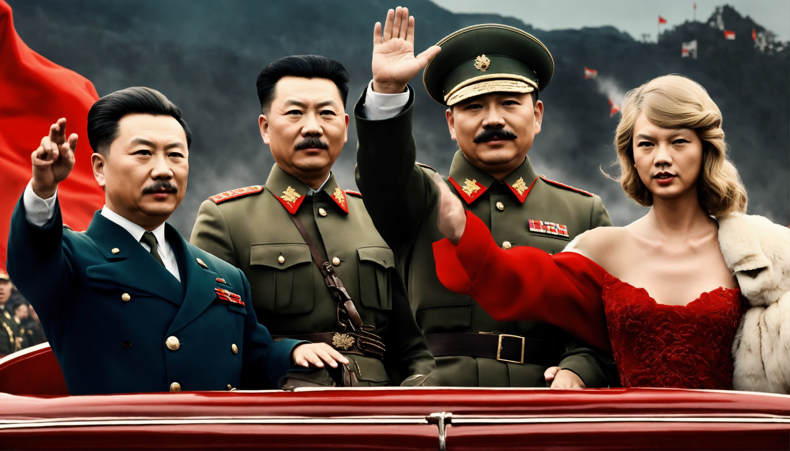 Chinese mao, russian stalin, and white taylor swift waving to the camera. black and white, in world war 2 style.
