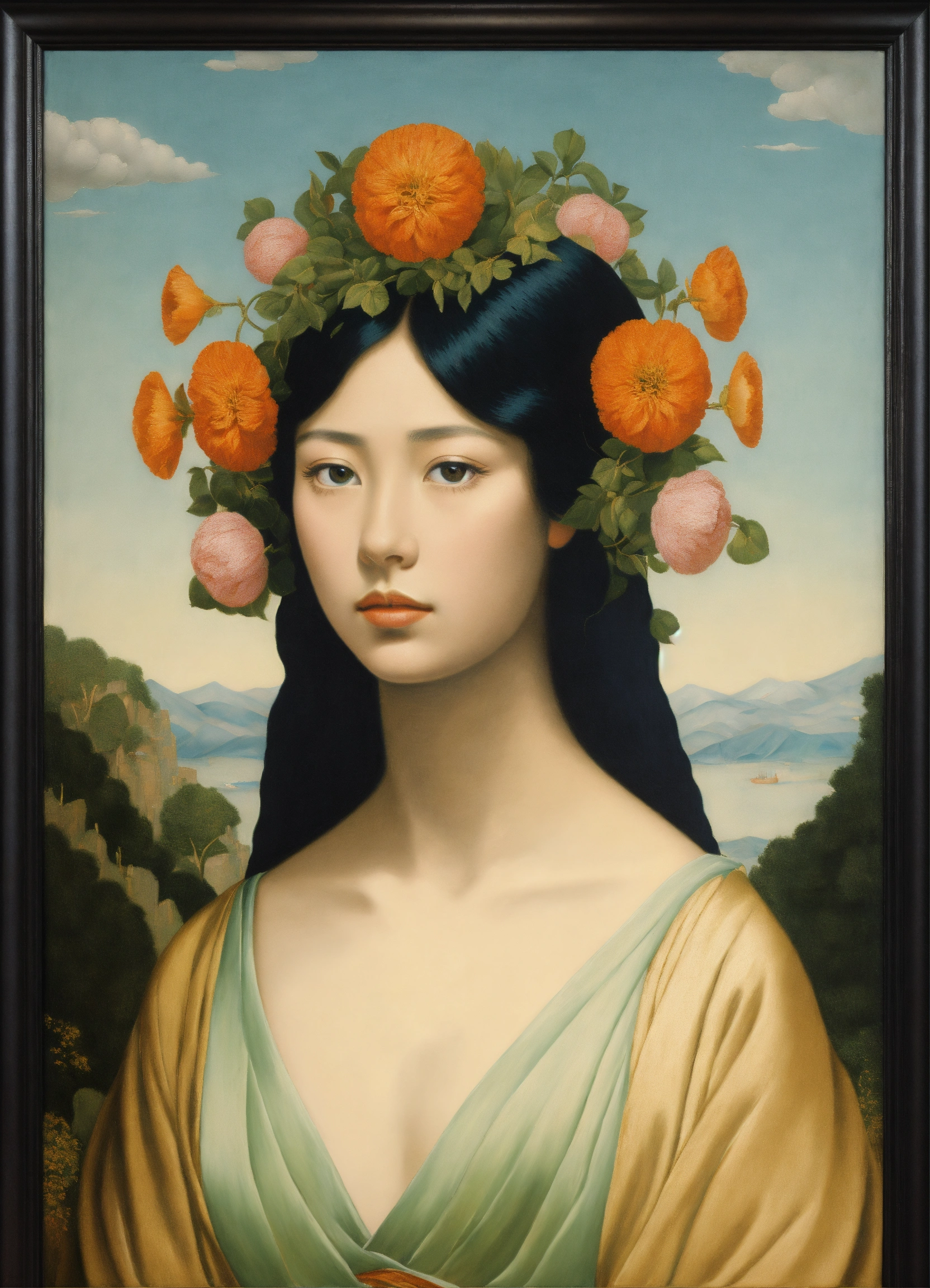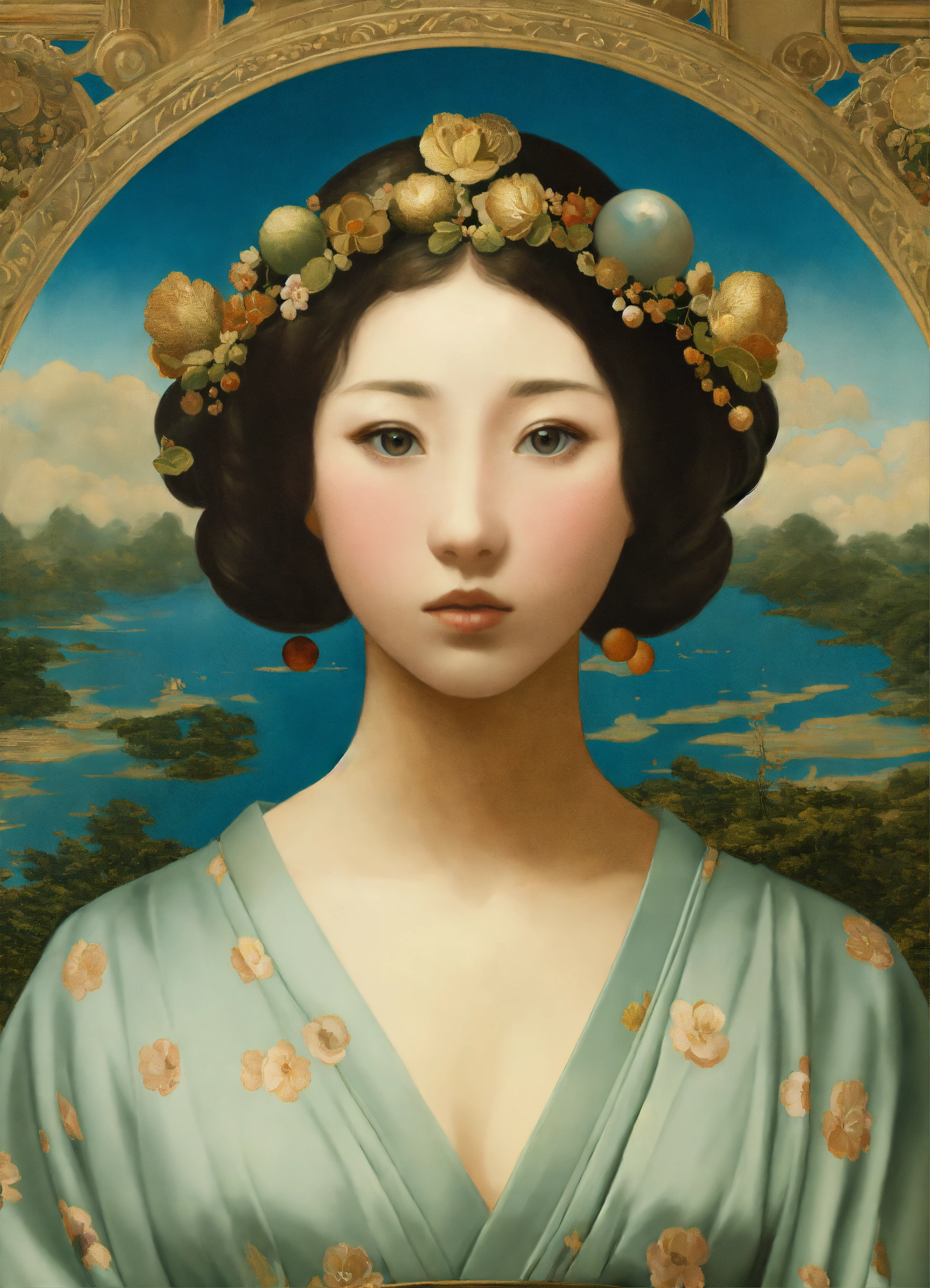 "closeup of a japanese aphrodite looking at us with very big eyes" in a painting by rene magritte and raphael, surrealistic, 64k resolution, highly detailed, sharp image.