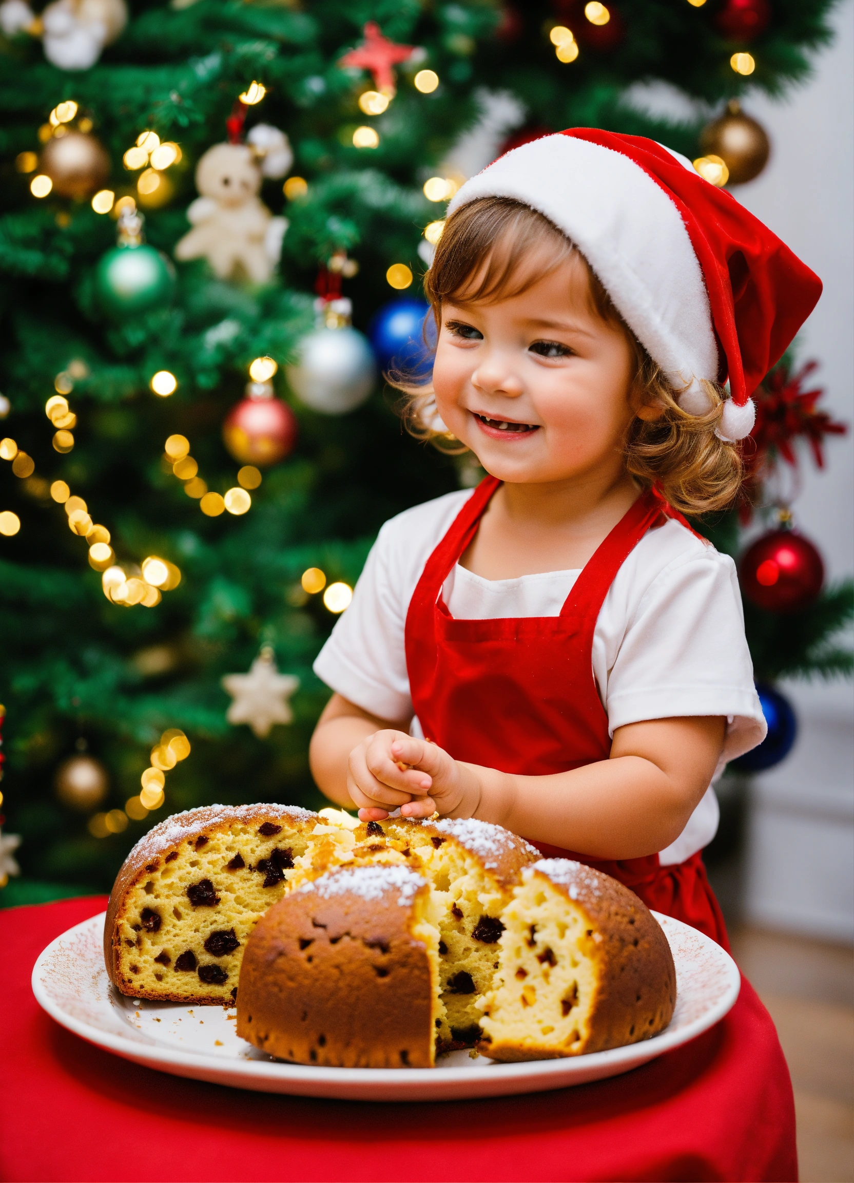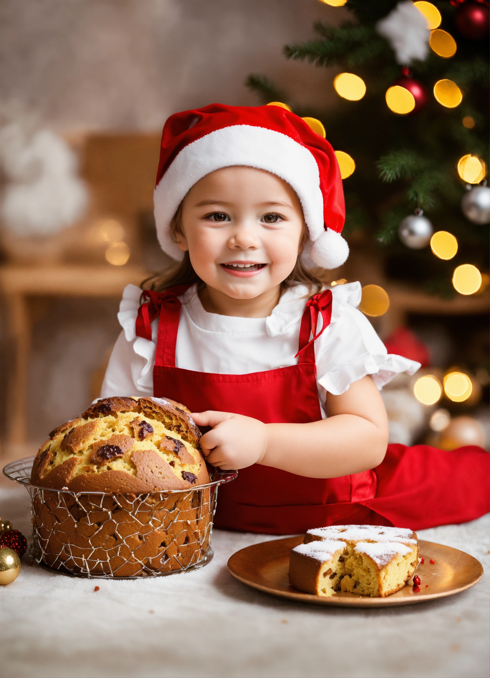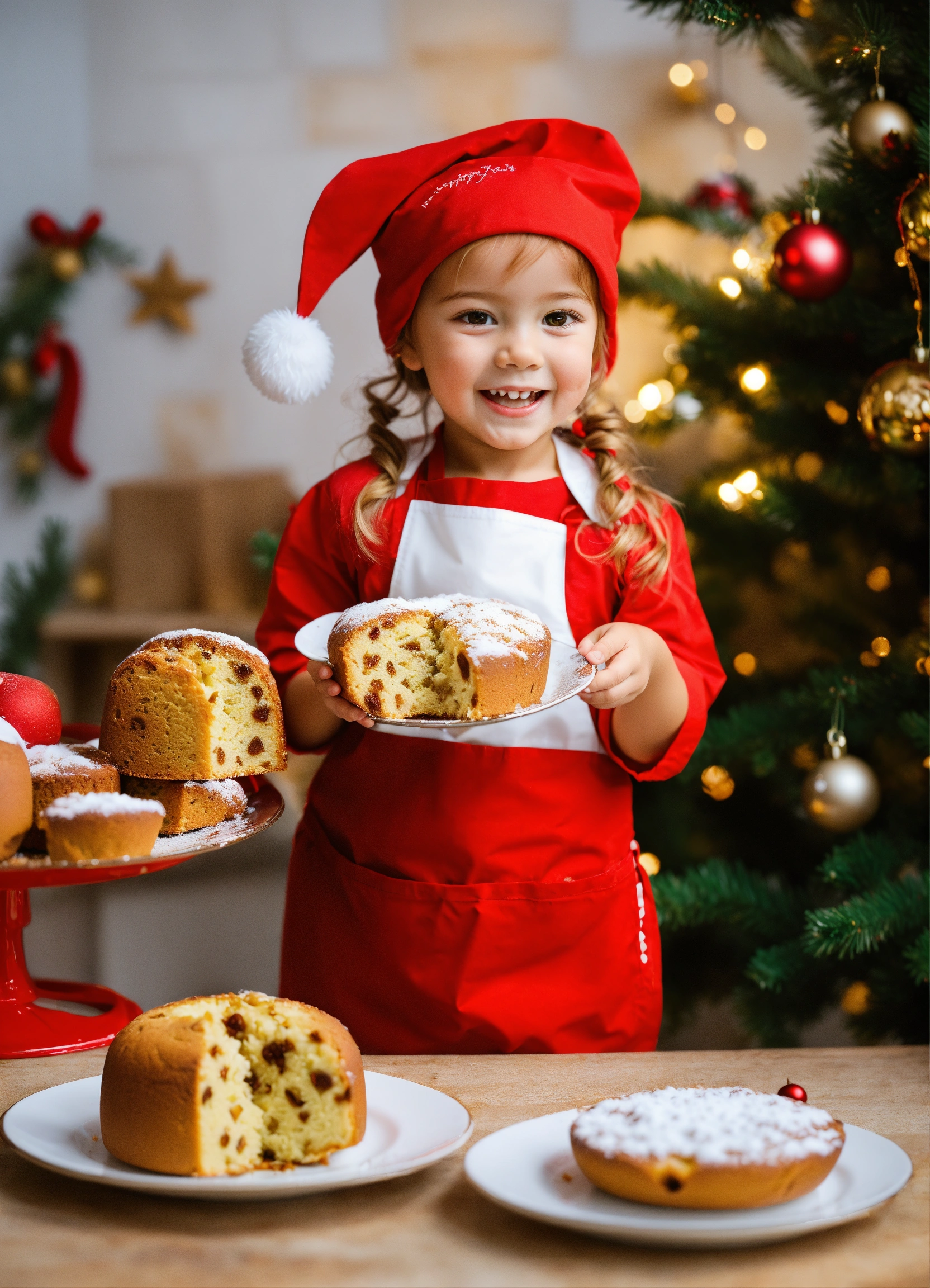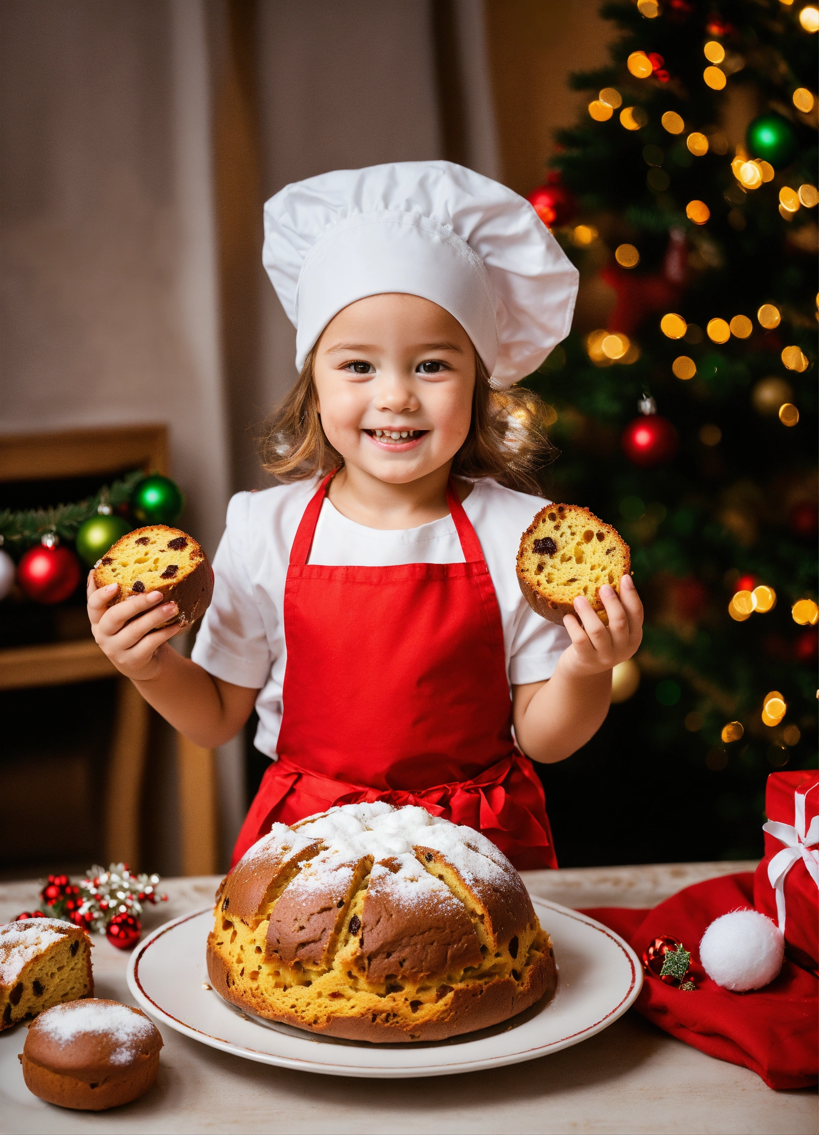 Imagine at christmas, a happy 3-year-old girl, dressed in a red t-shirt, a white apron and a white cap, she holds a piece of panettone. on a white plate there is a panettone with christmas decorations.