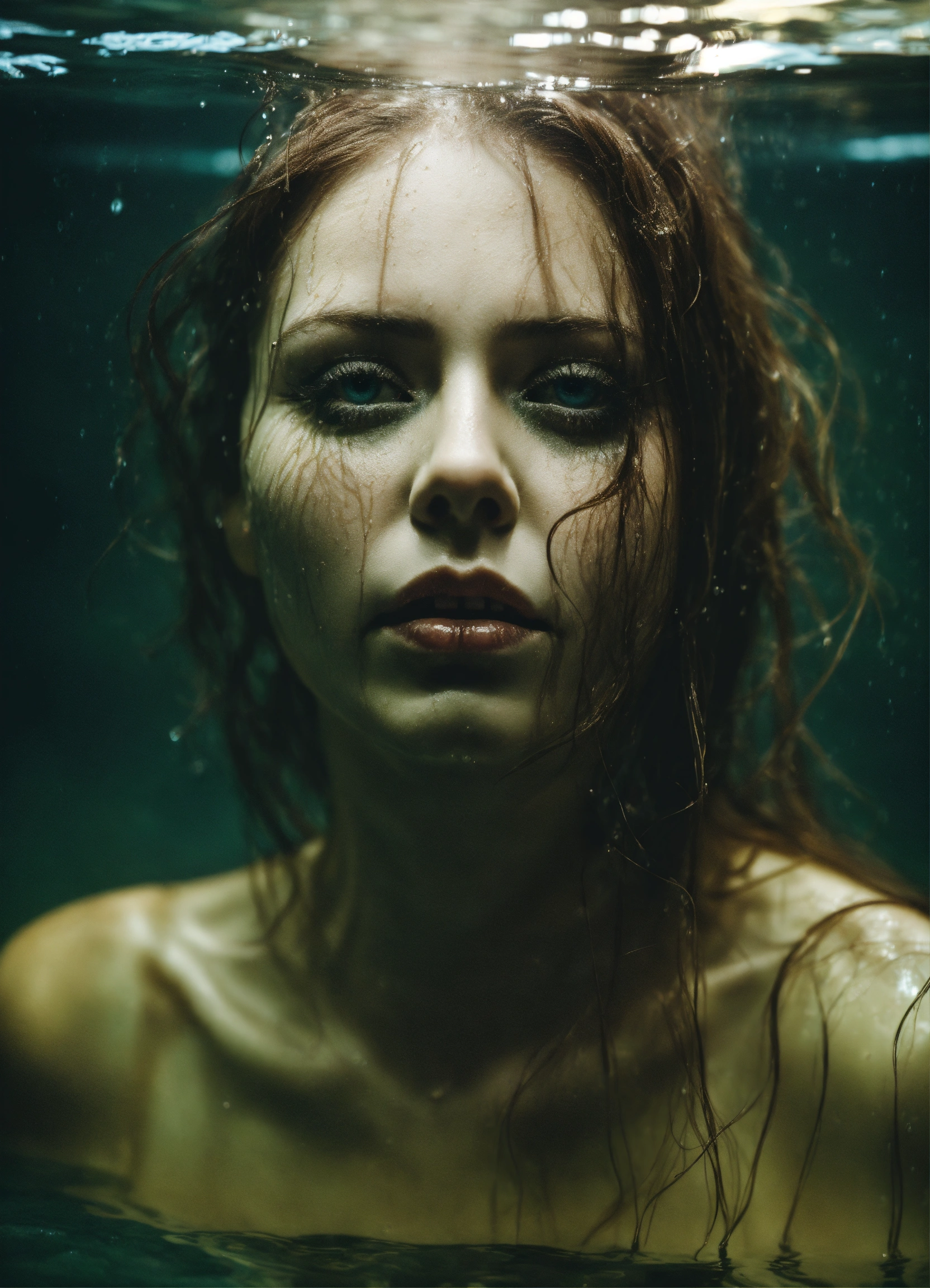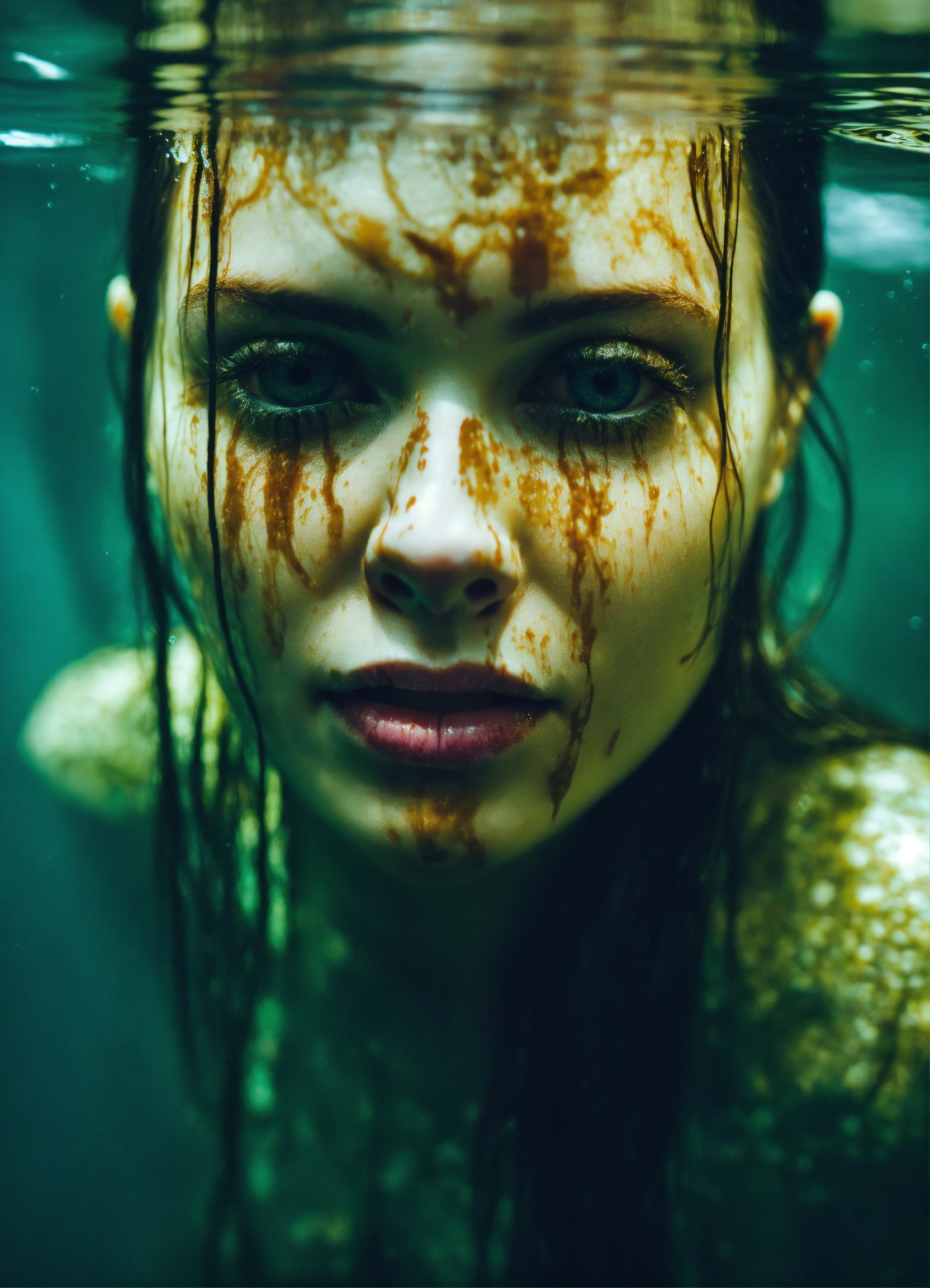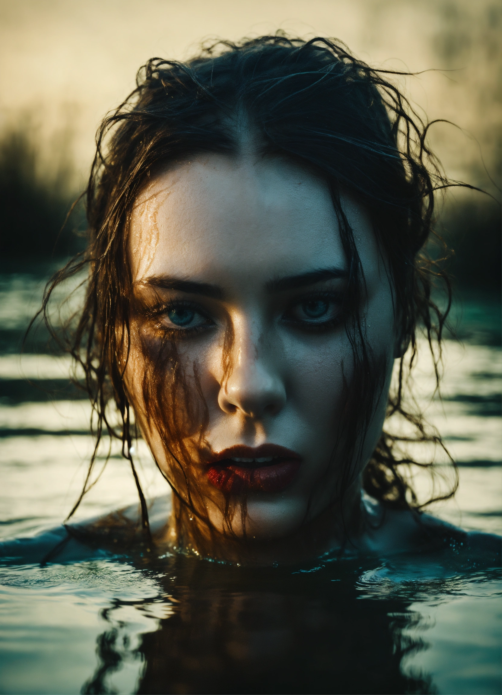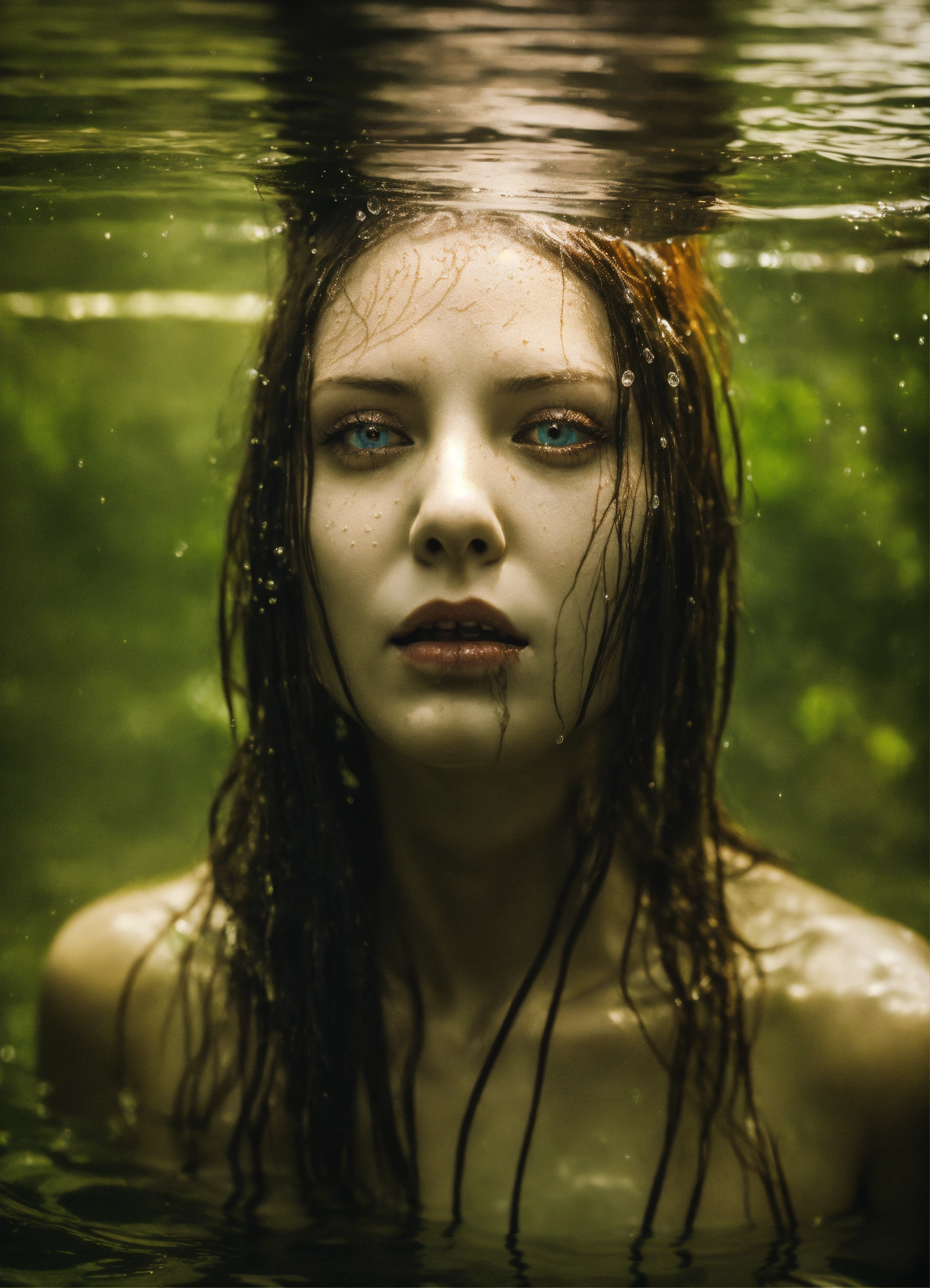 Scary monster non human woman head in water