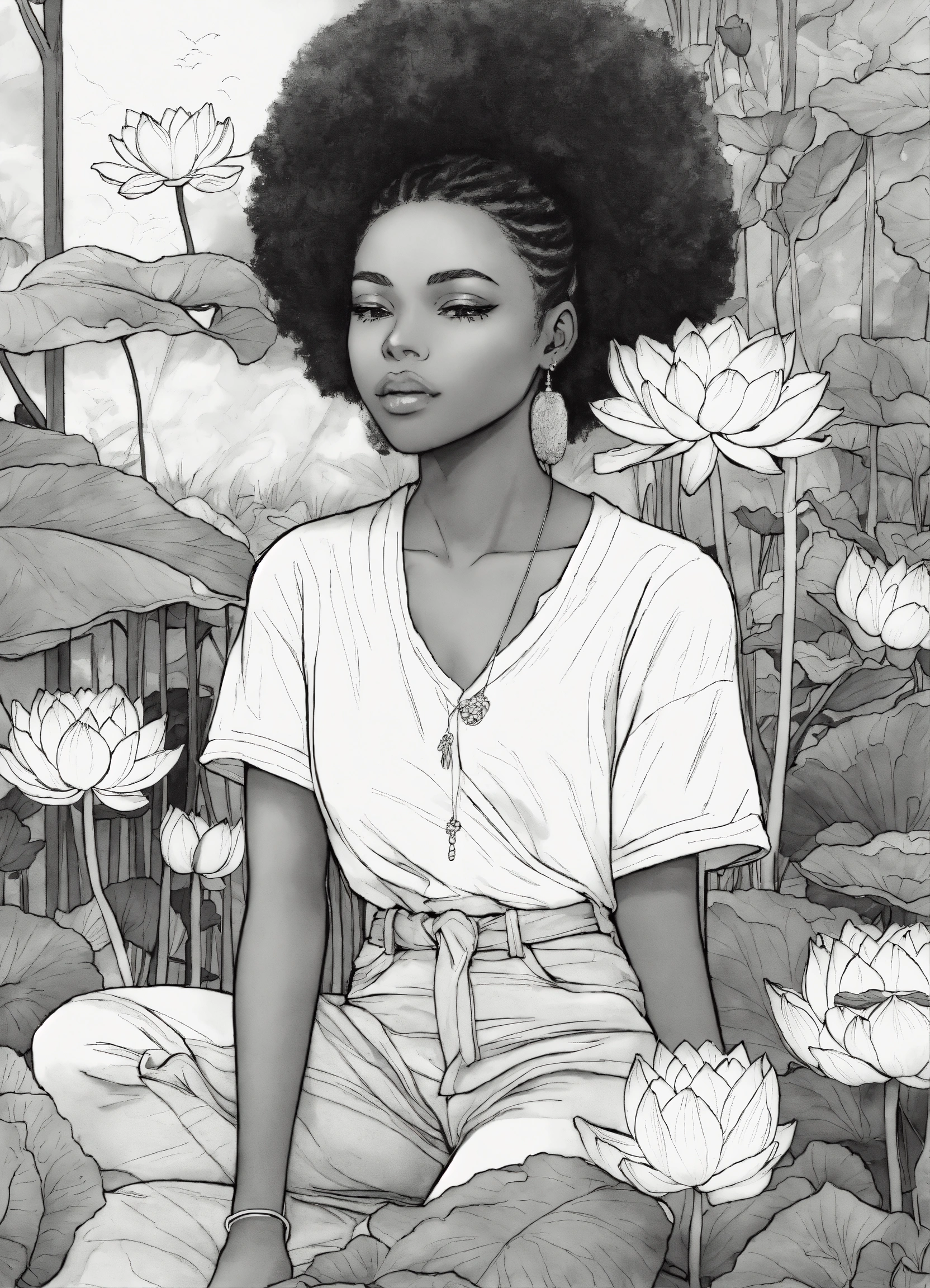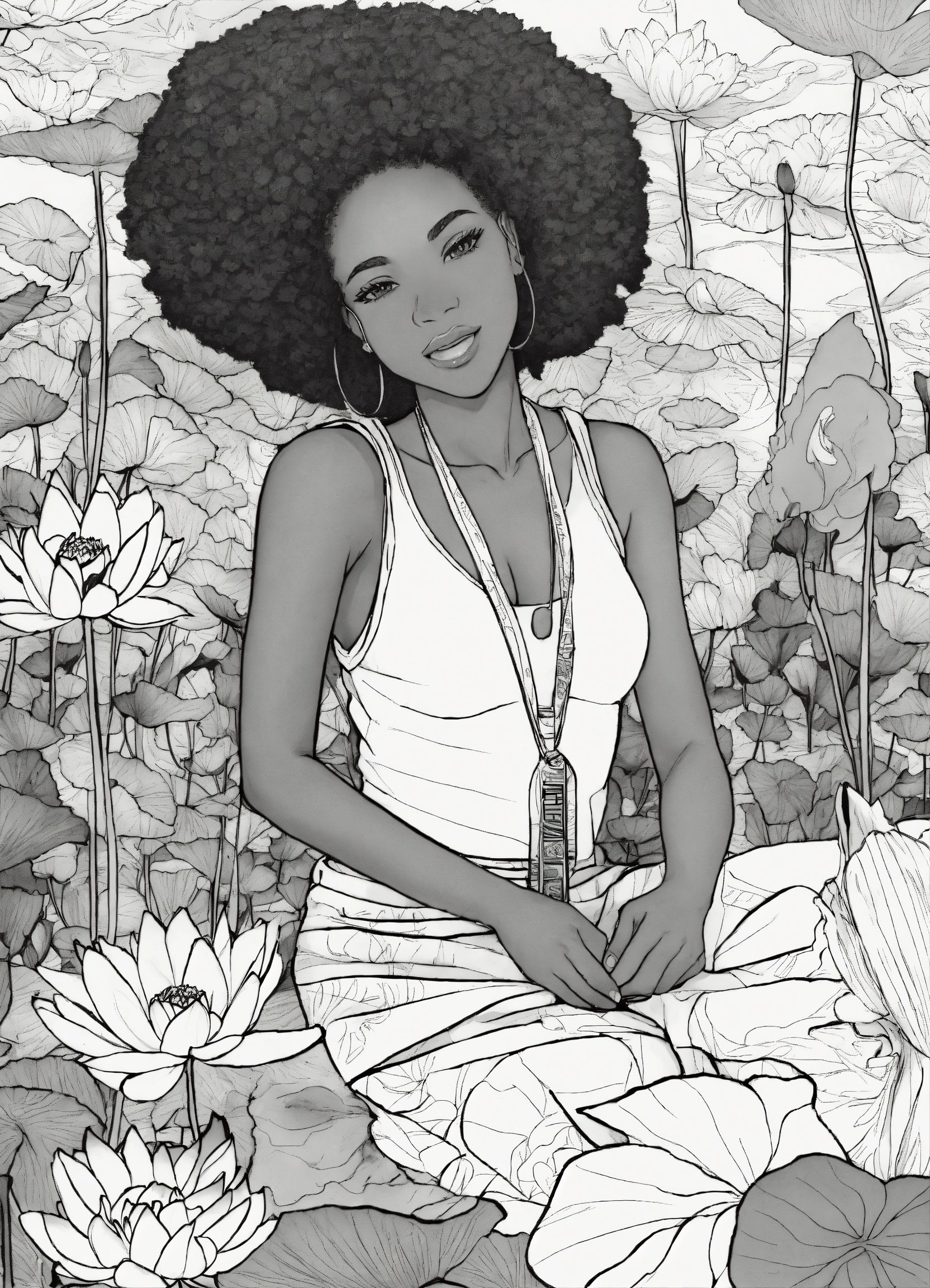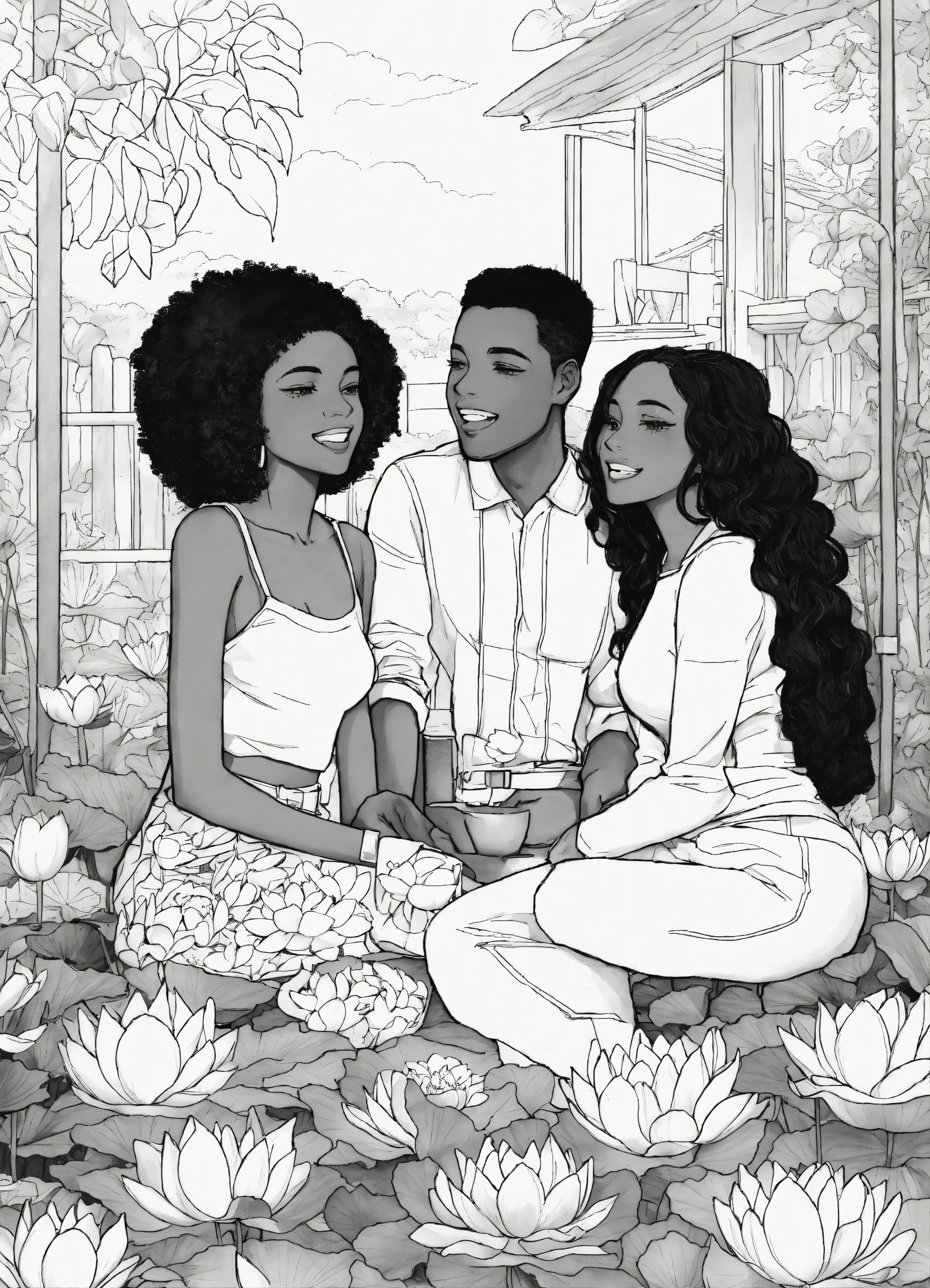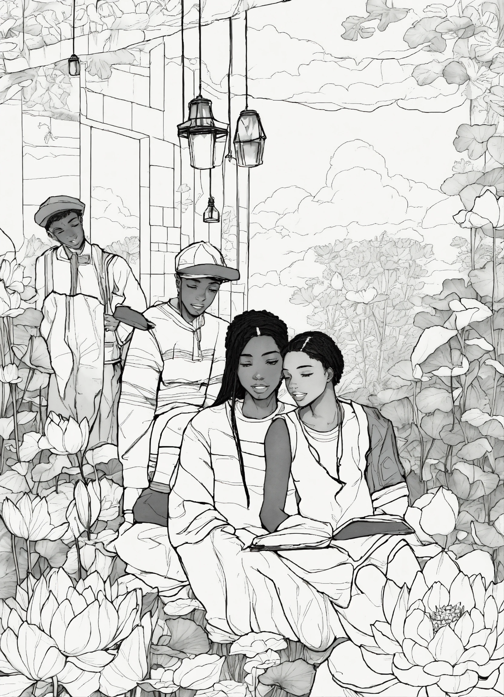 Black and white coloring book image of african american young adults lotus flowers hanging out