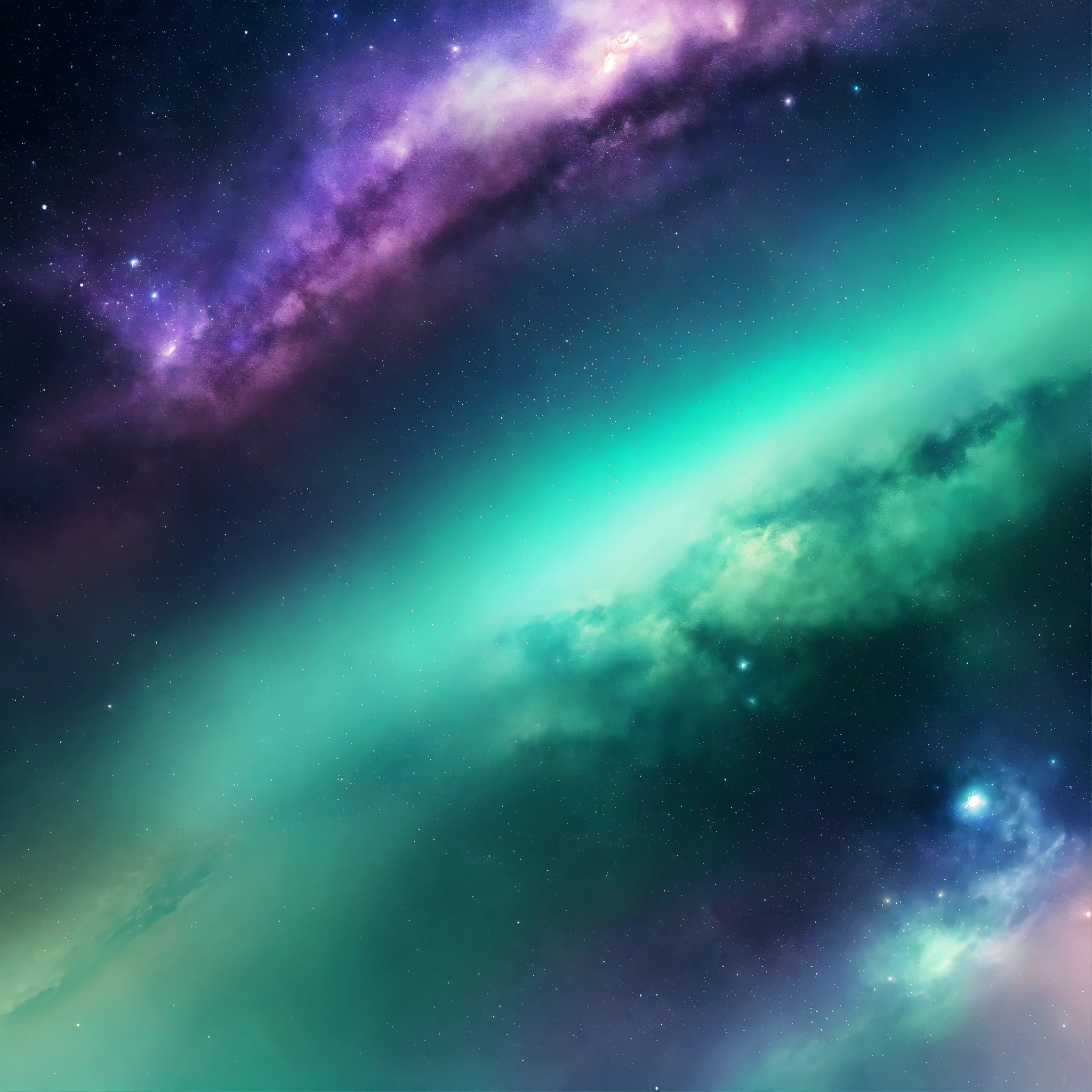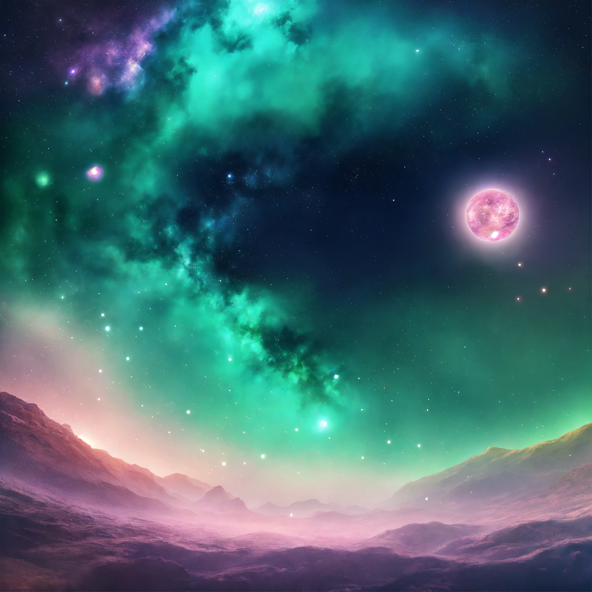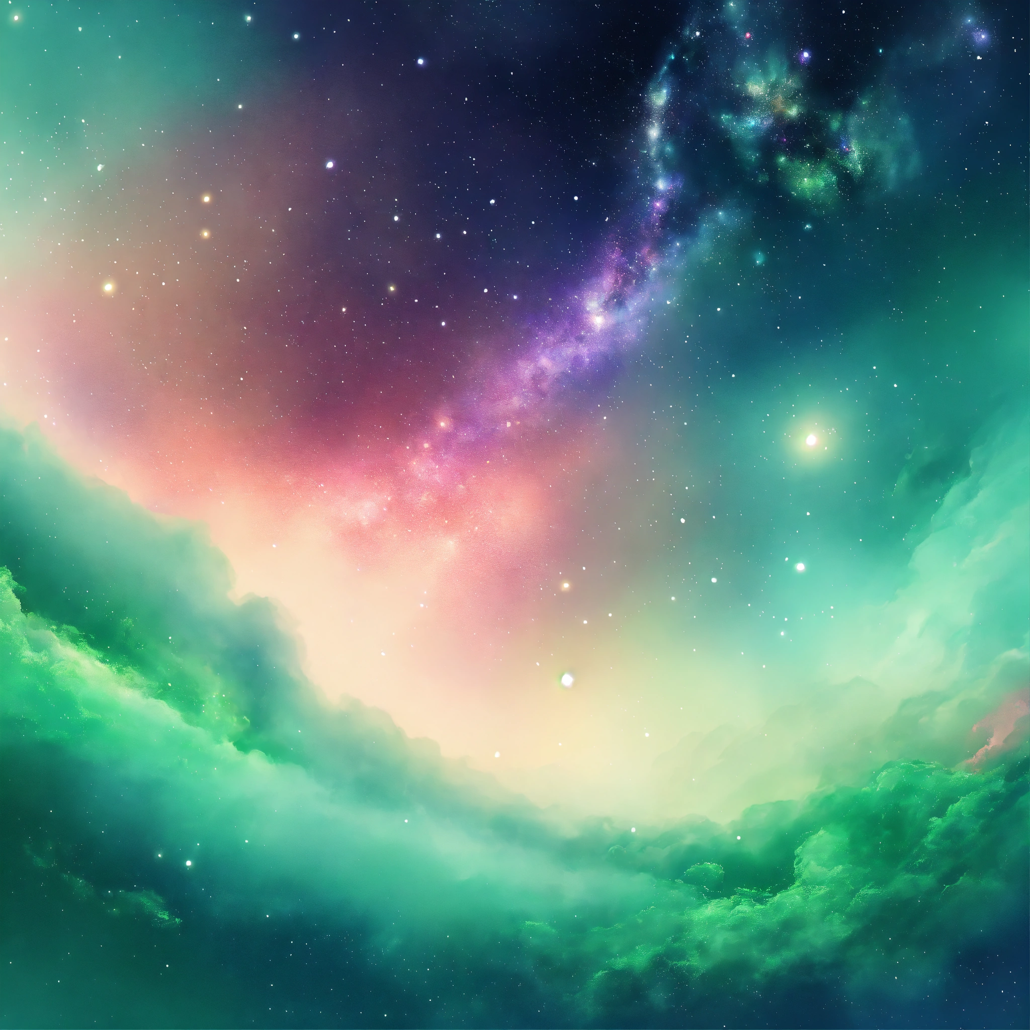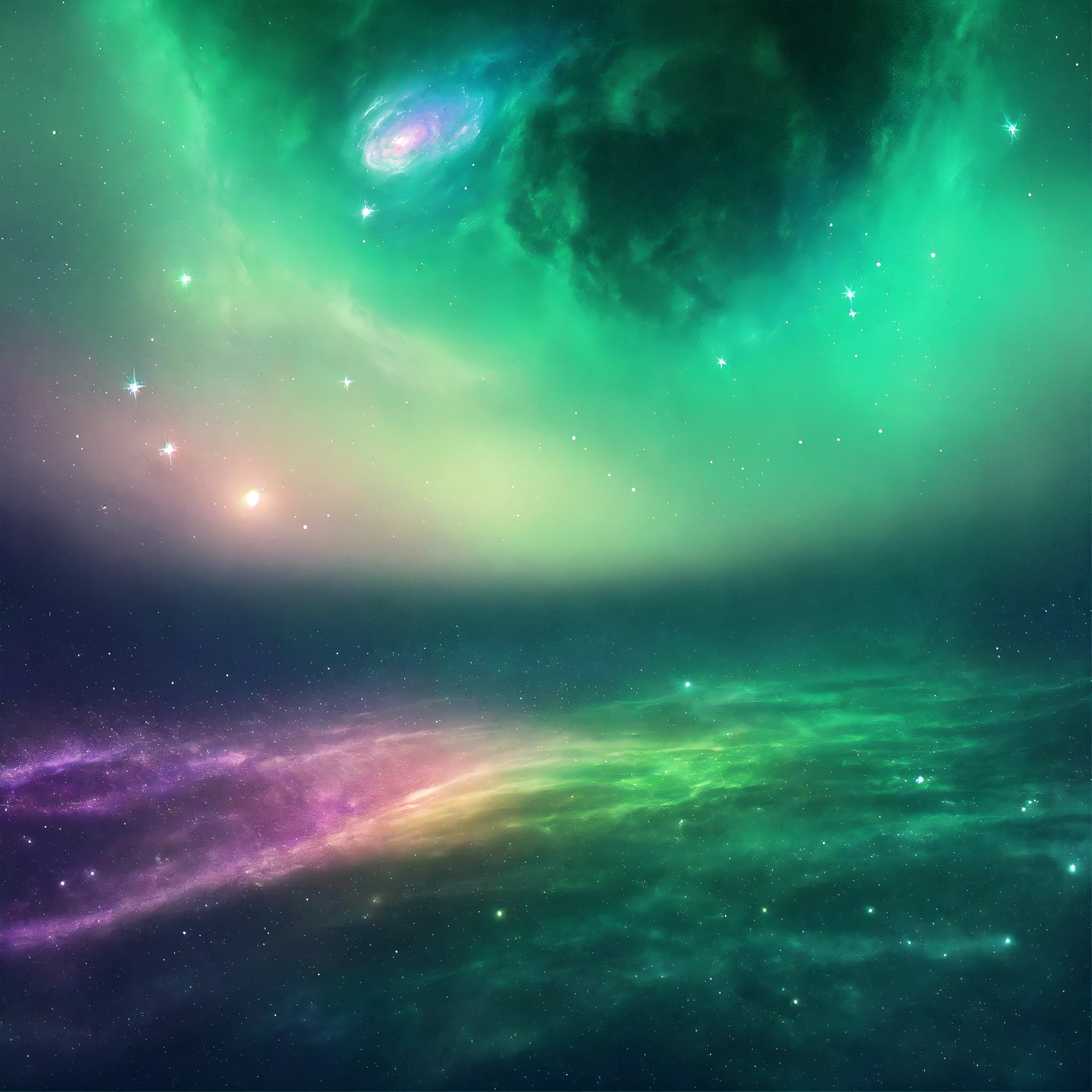 Interstellar space fantasy wallpaper, background, creative imagination, soft colors with green tints, ombre, vibrant, cosmic essence
