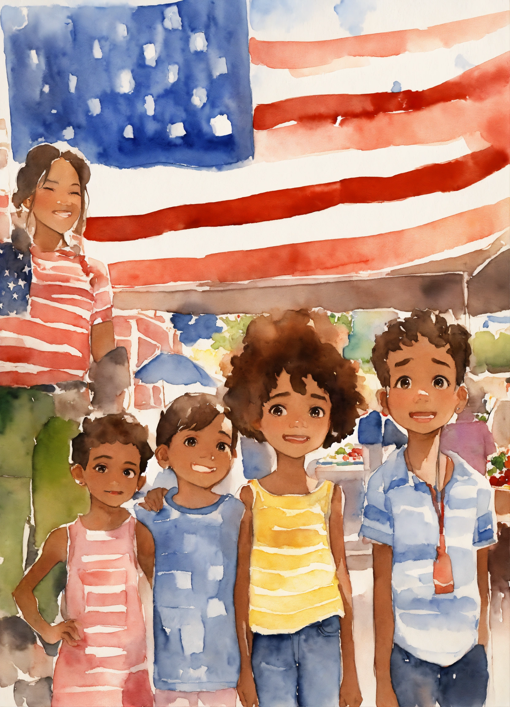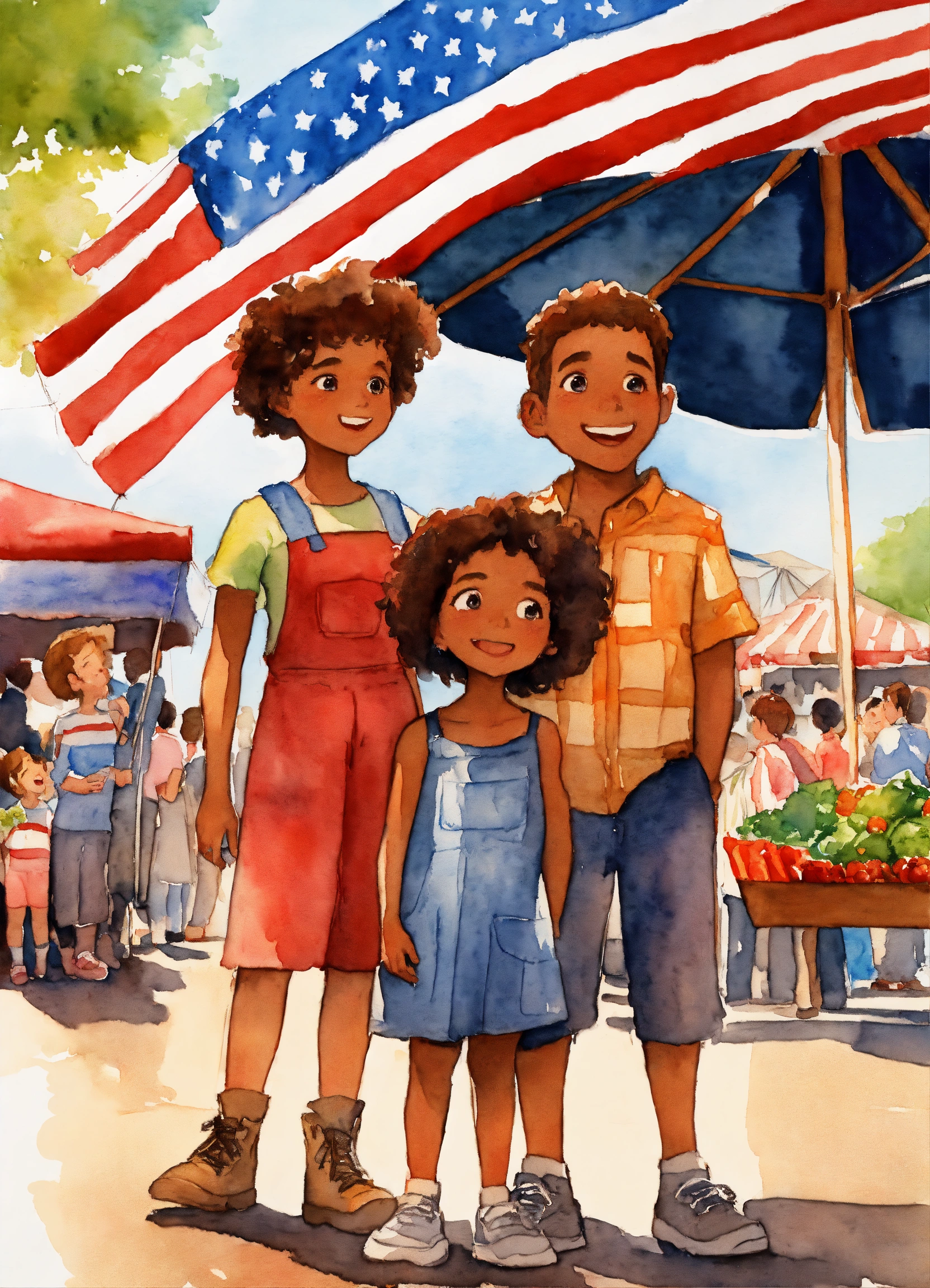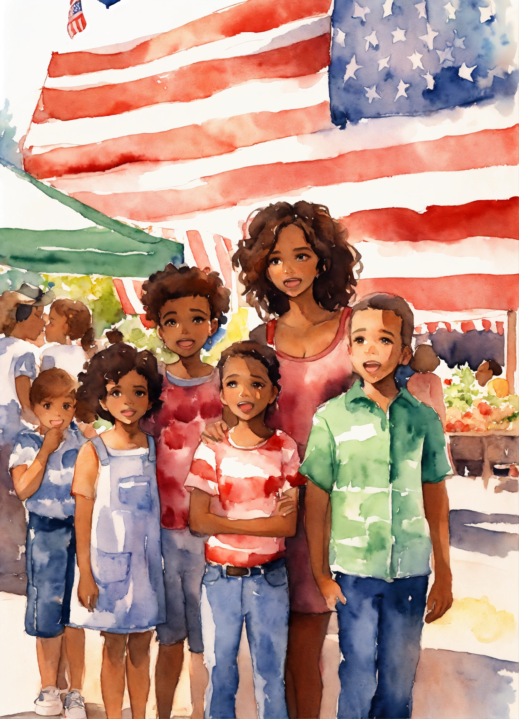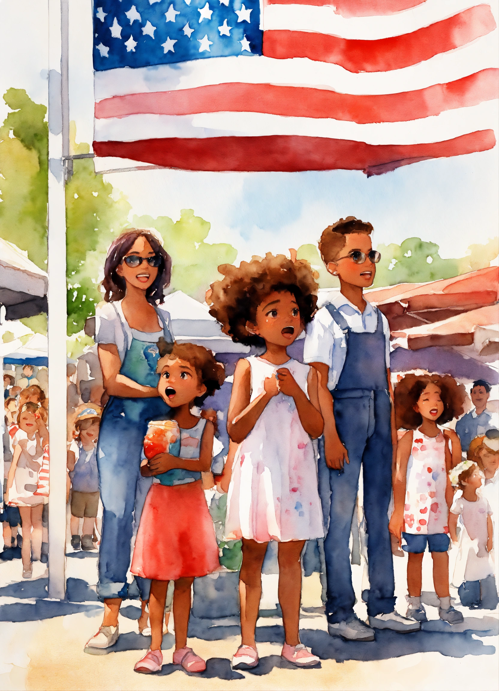 Watercolor pixar painting of 8 year old halle berry and her family singing the national anthem at the farmer's market with the american flag in the background, watercolor pixar style cartoon