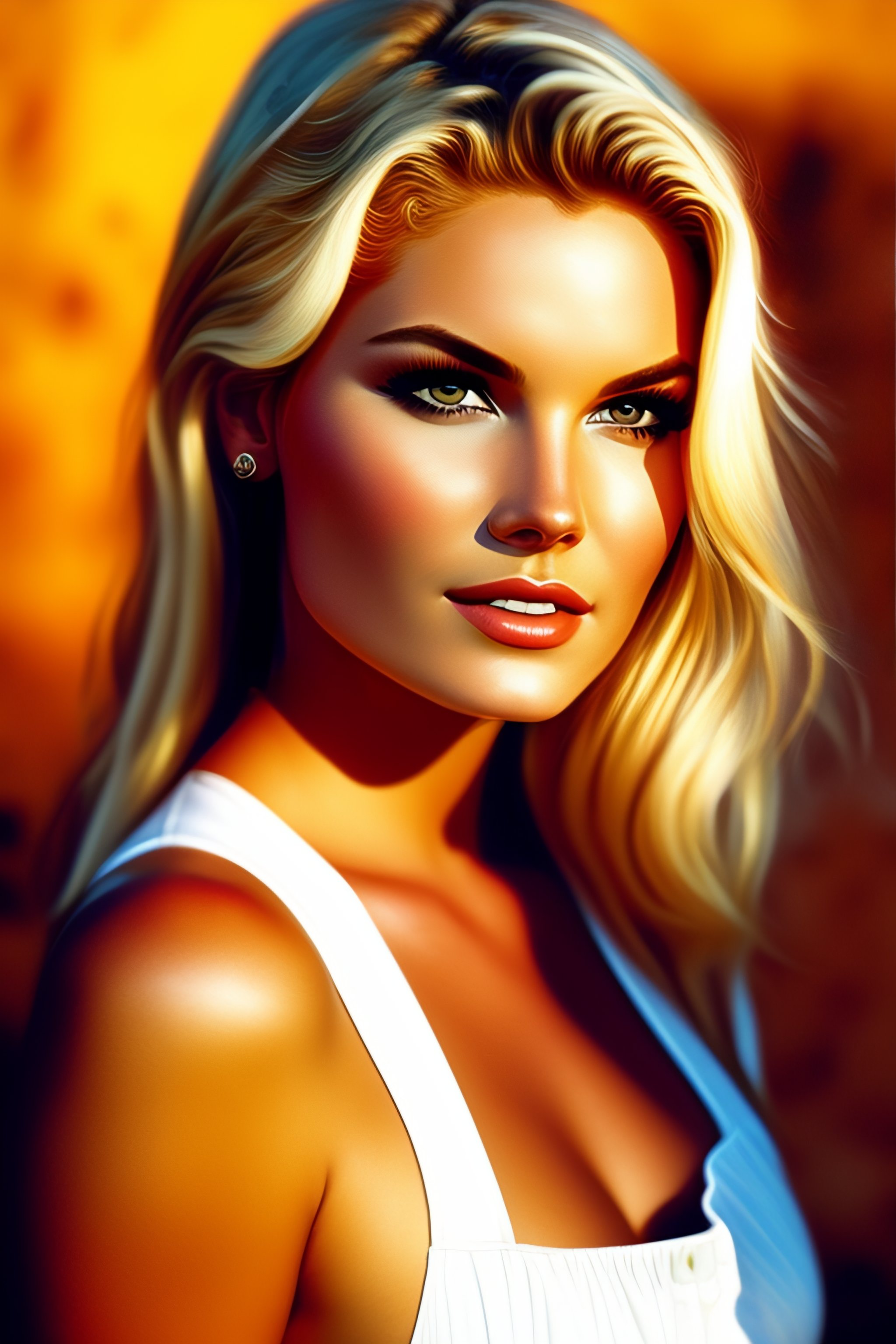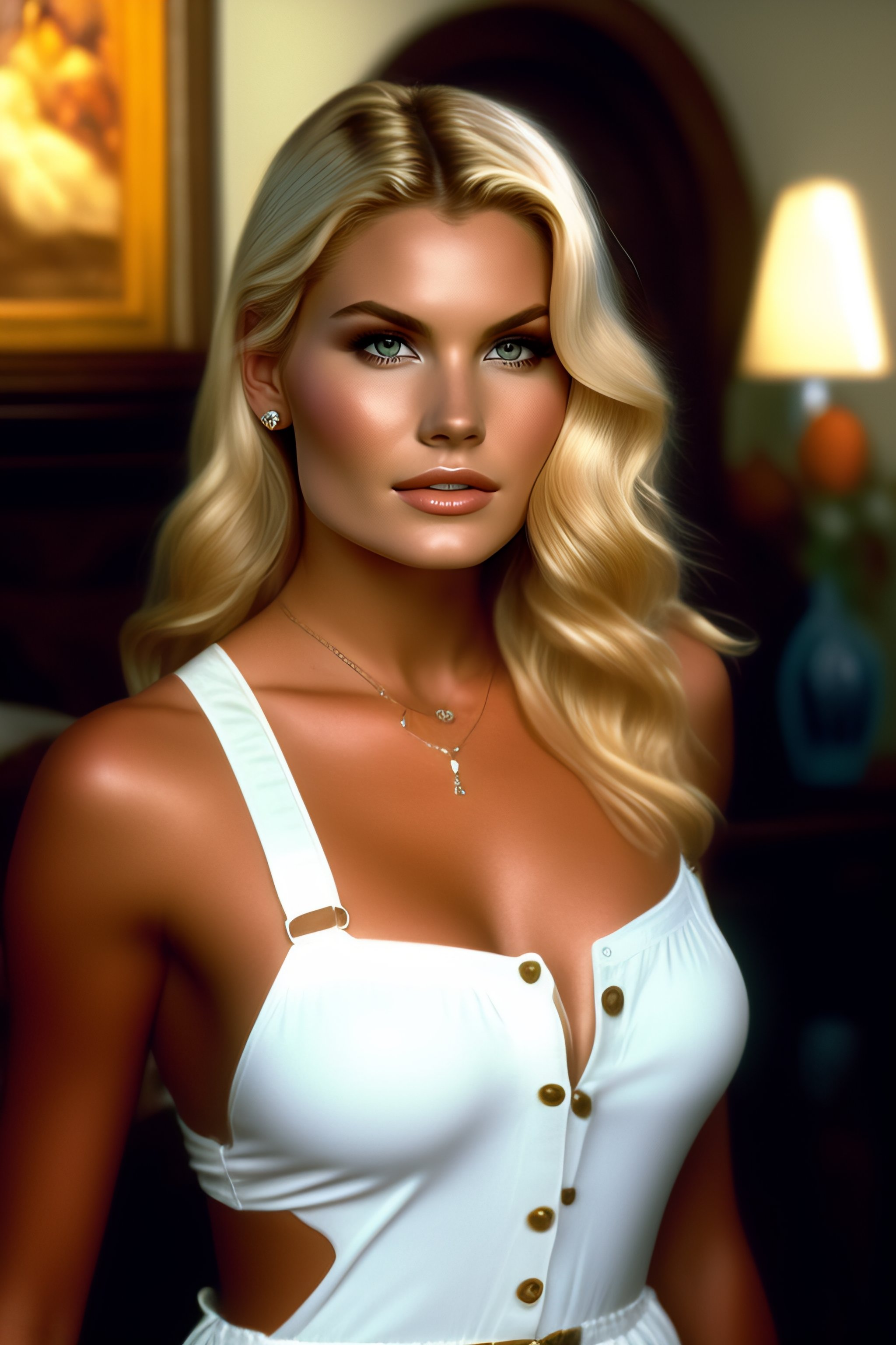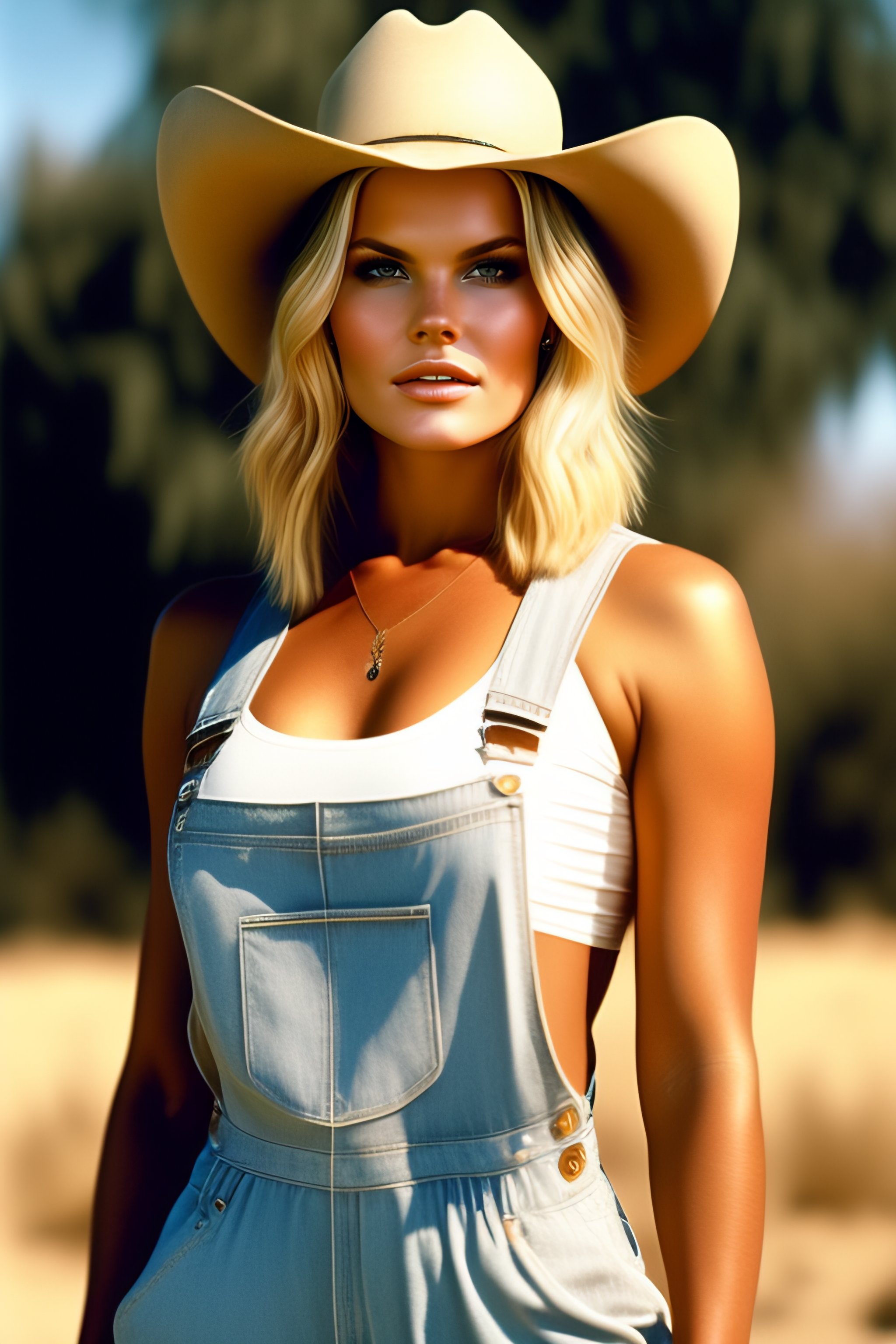 Portrait of an 21 year old elisha cuthbert from the movie the girl next door, wearing demin overalls with a white tanktop with a large bust and a cowboy hat