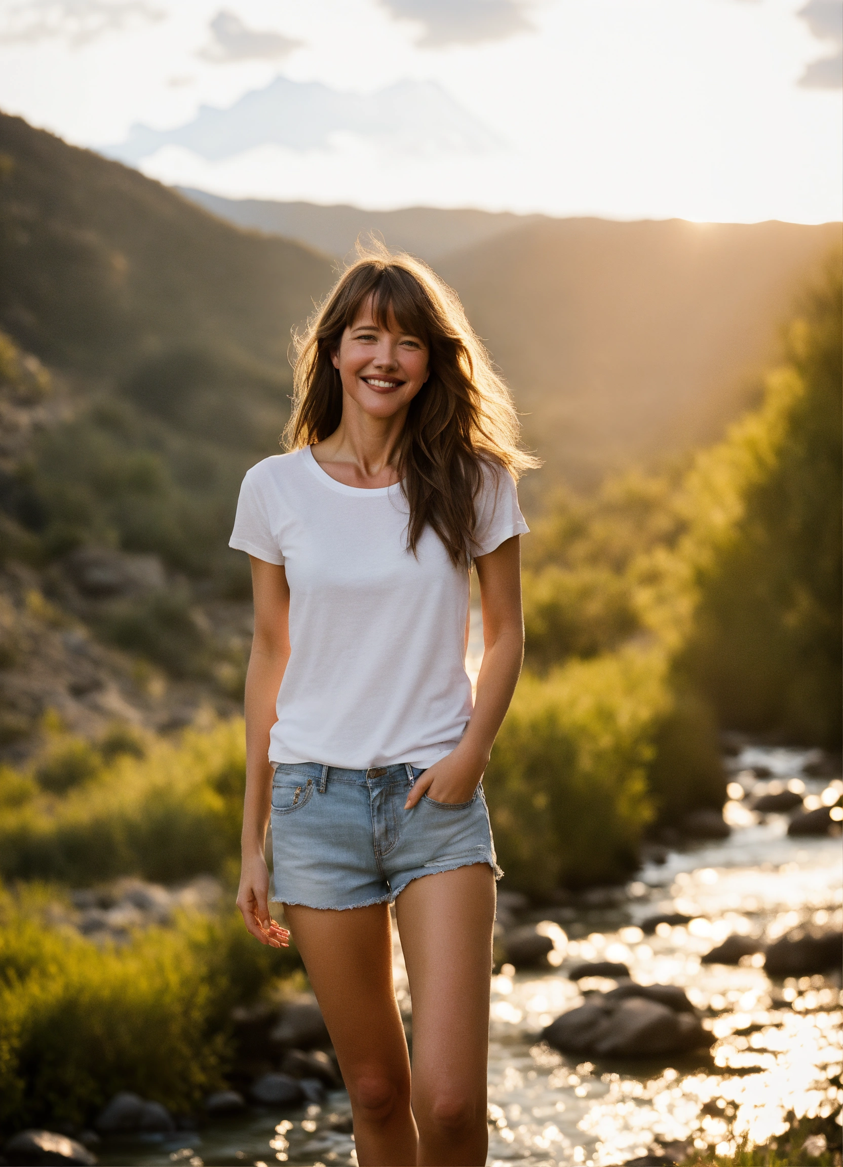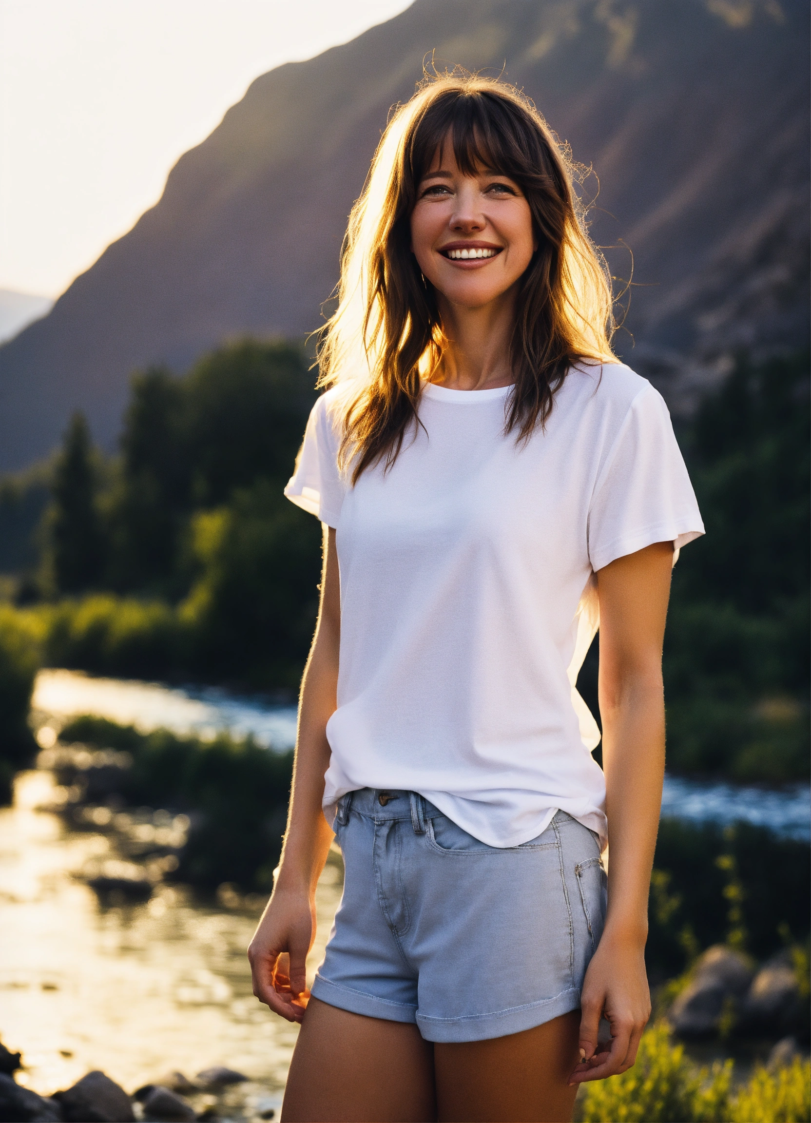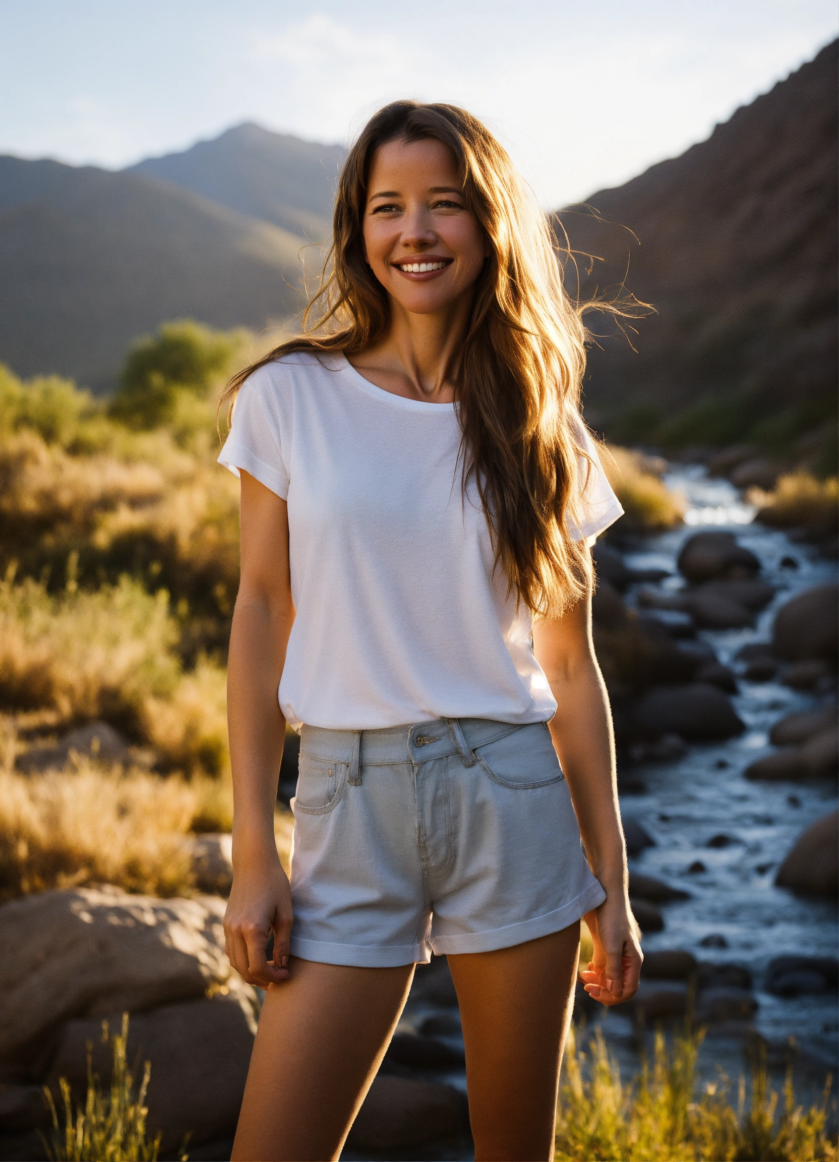 Knees up photo of one happy 20 yr old sophie marceau, similar model, with beautiful long hair, modeling plain blank white t-shirt, shorts, at golden hour the mountains by a stream. front of tee shirt needs to be visible and blank.