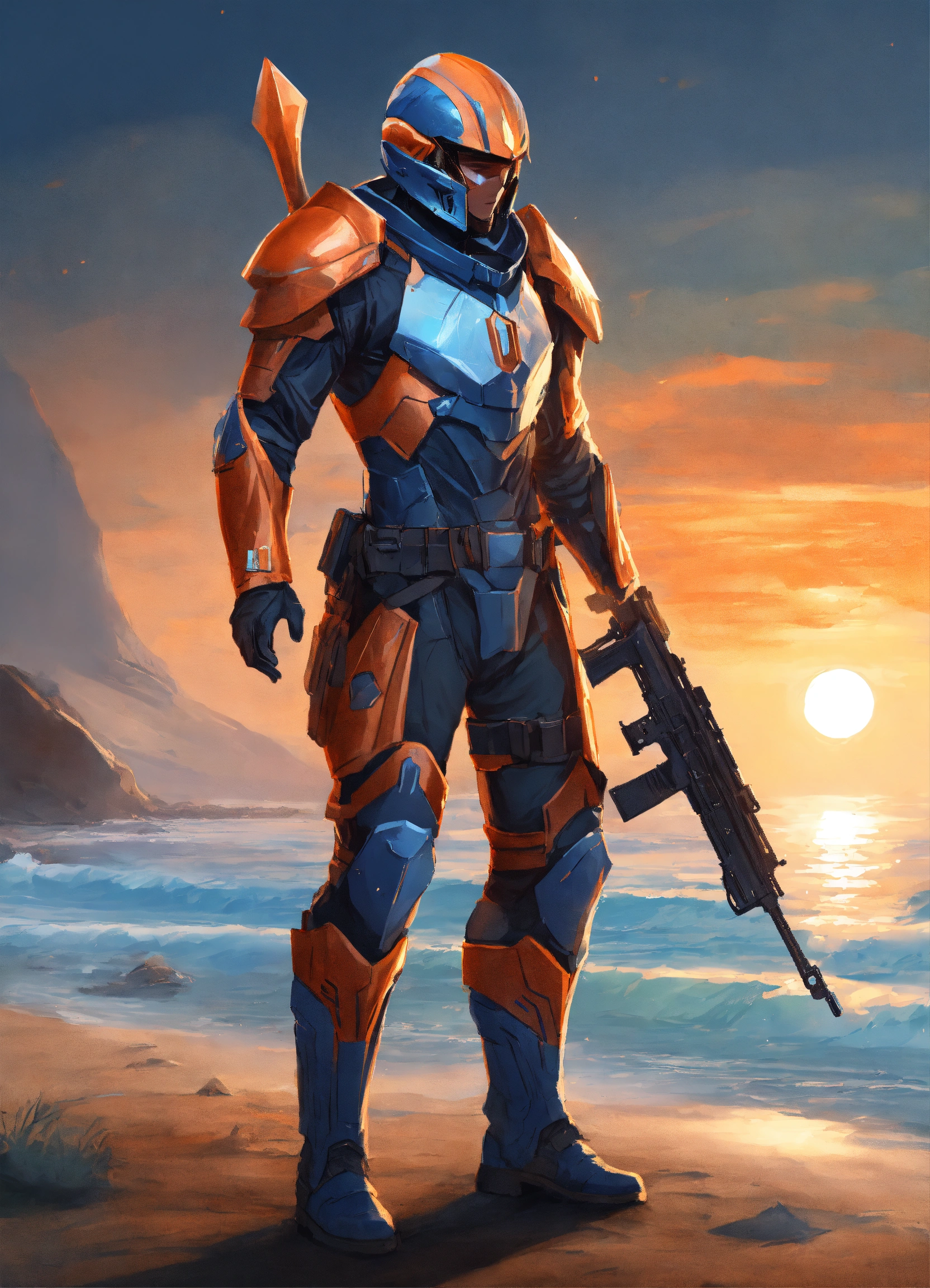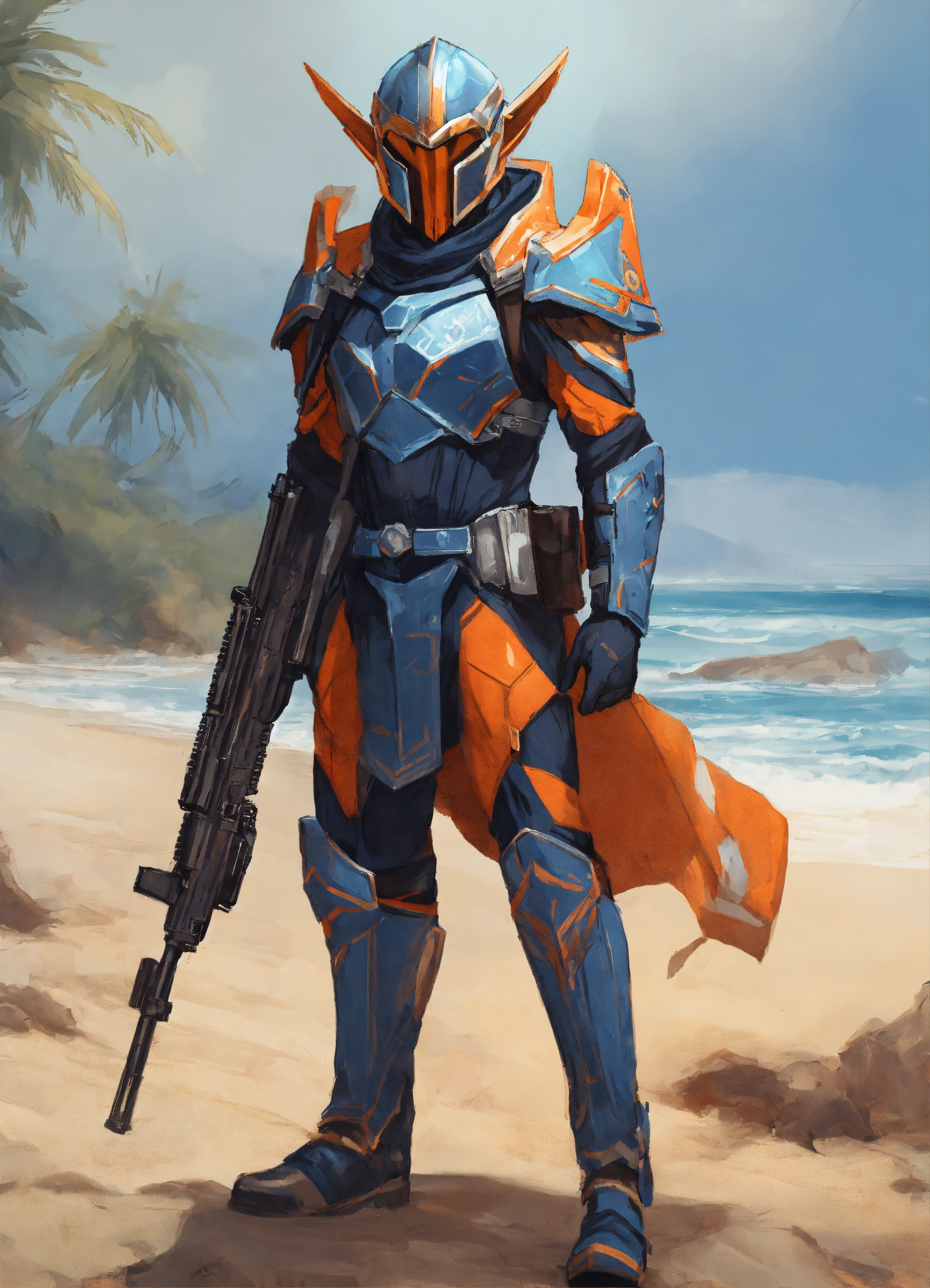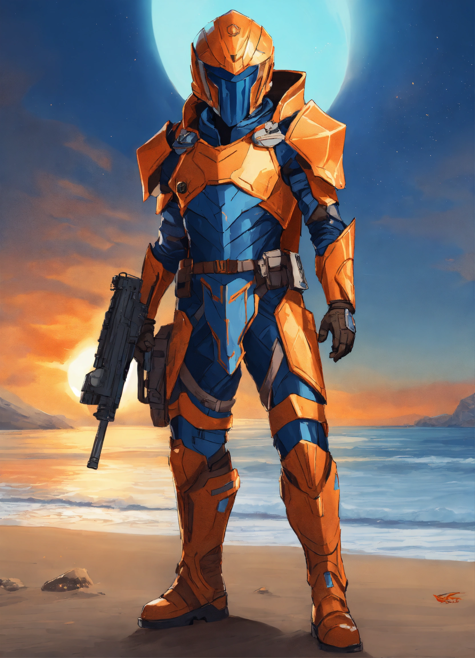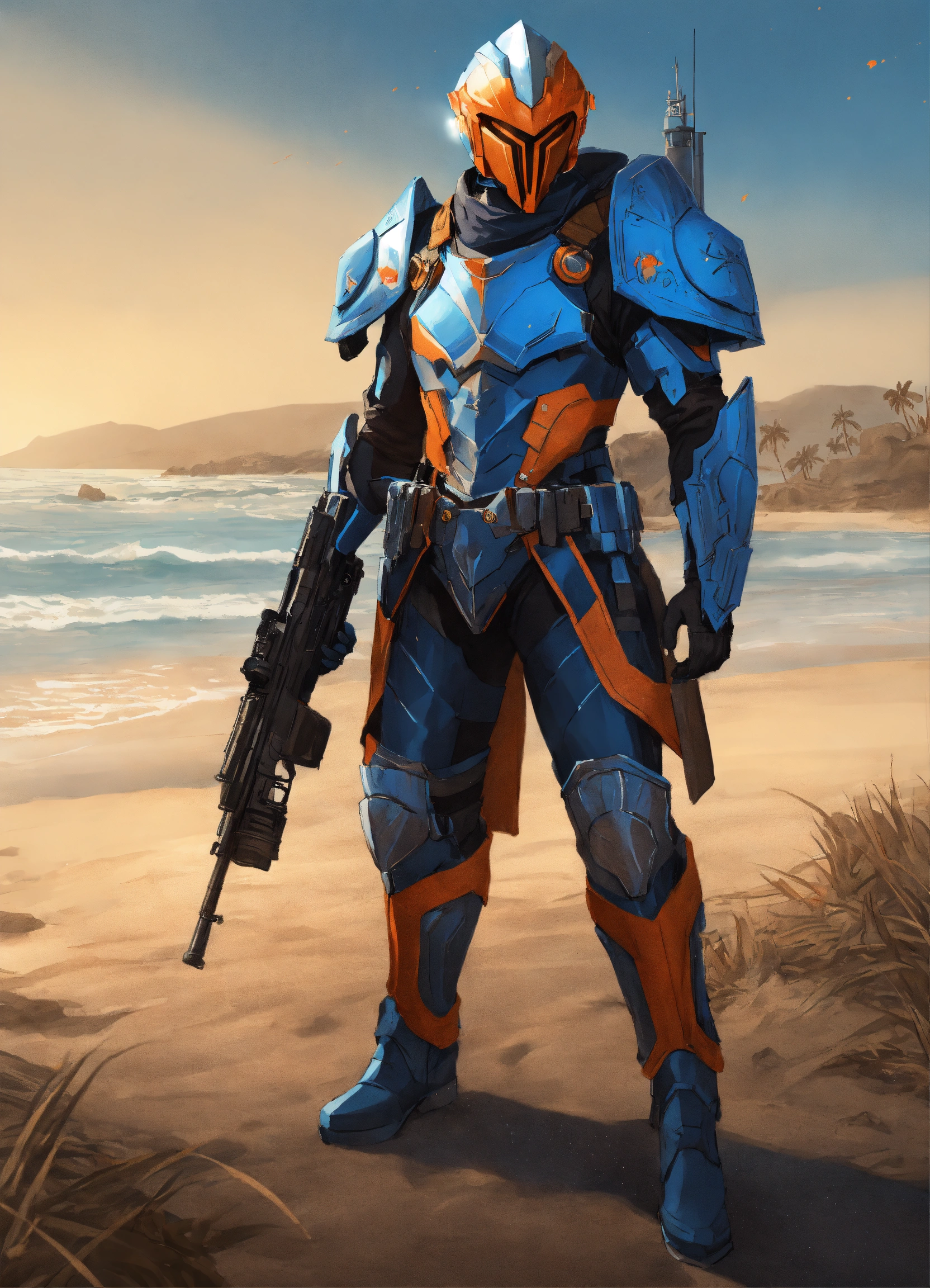 Epic drawing of a full body of a high elf sci fi soldier wearing sci fi armor and helmet, navy blue and orange armor with light blue trim on the fabric, boots, male, holding a machine gun with both hands, standing on a beach