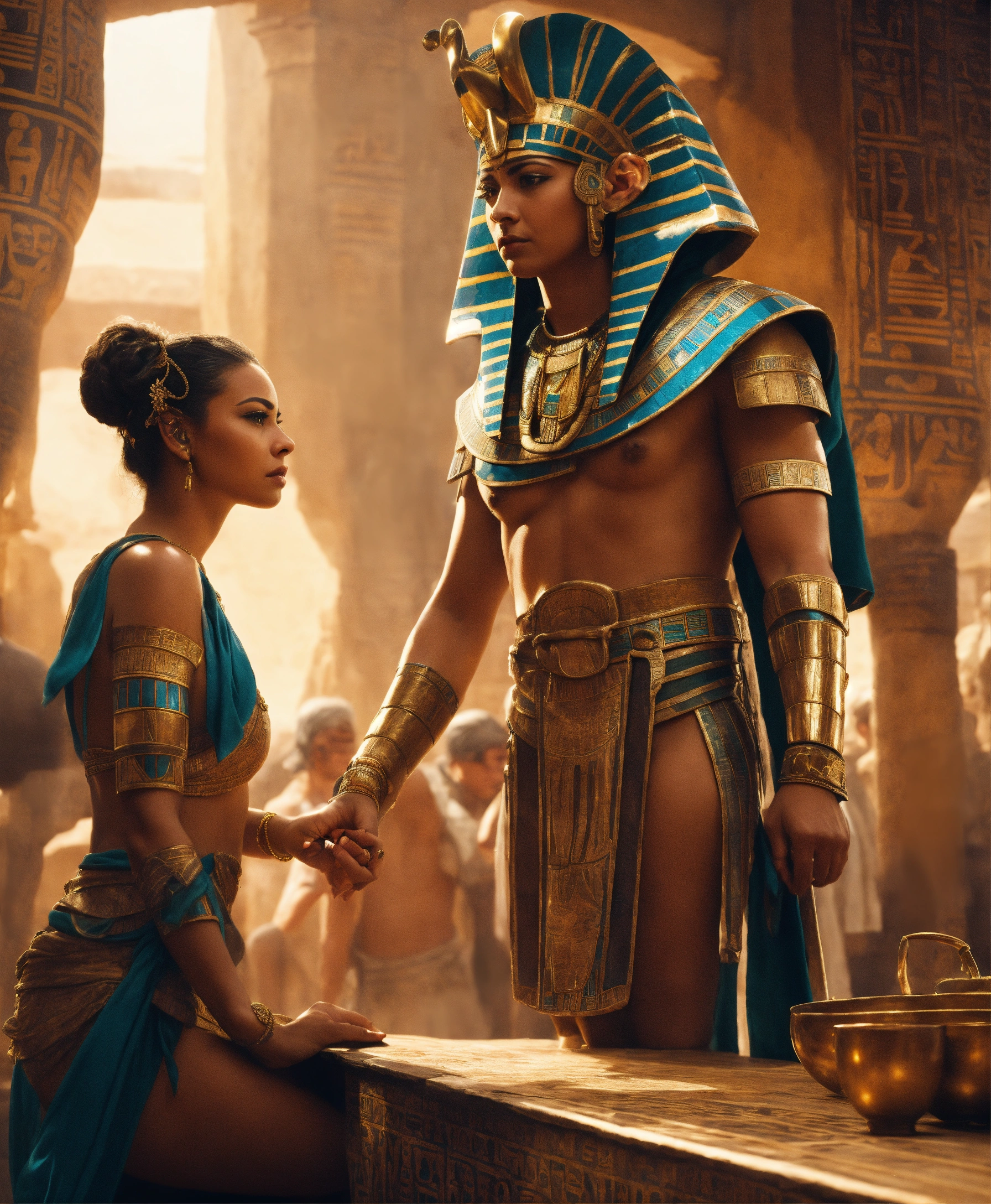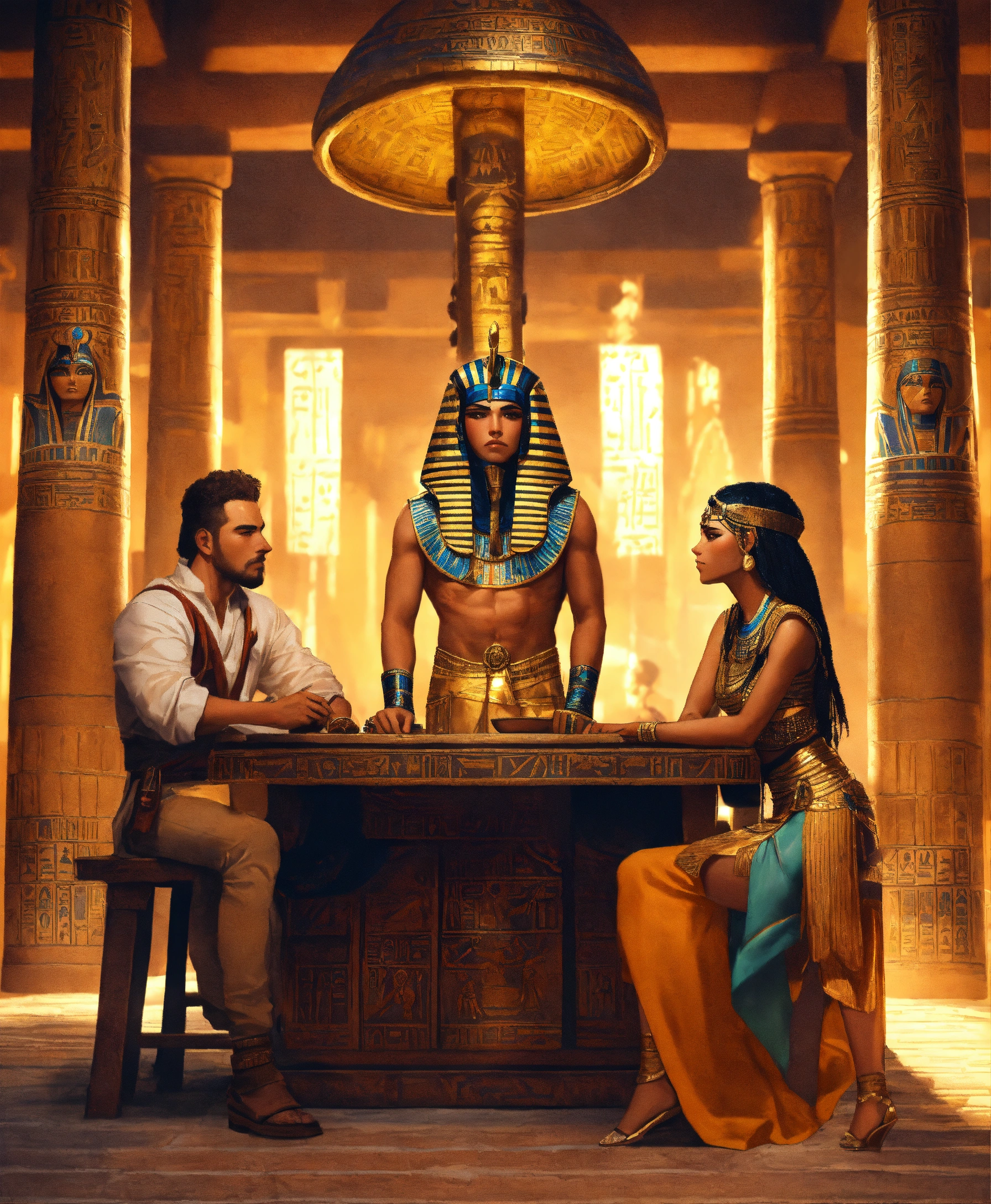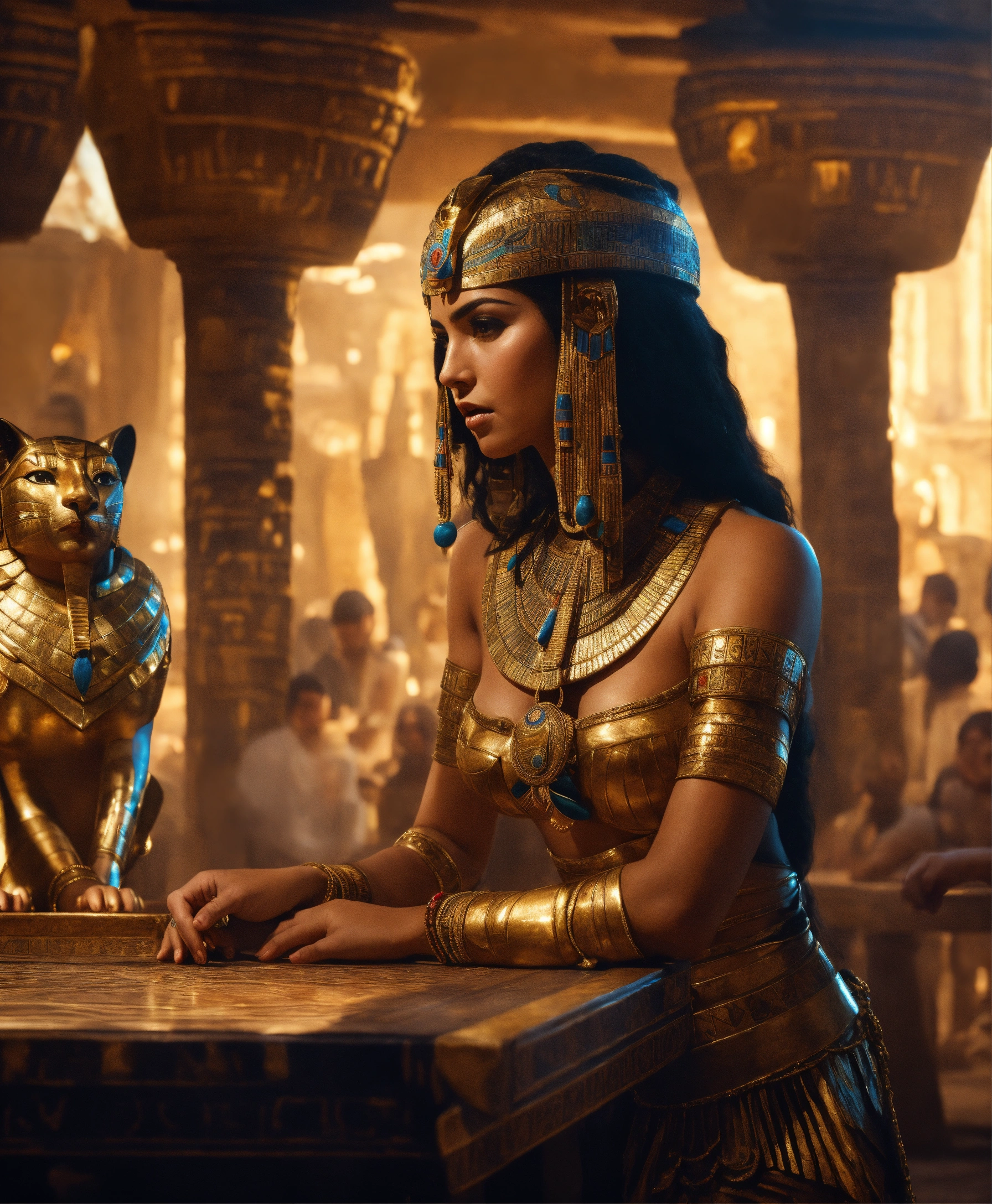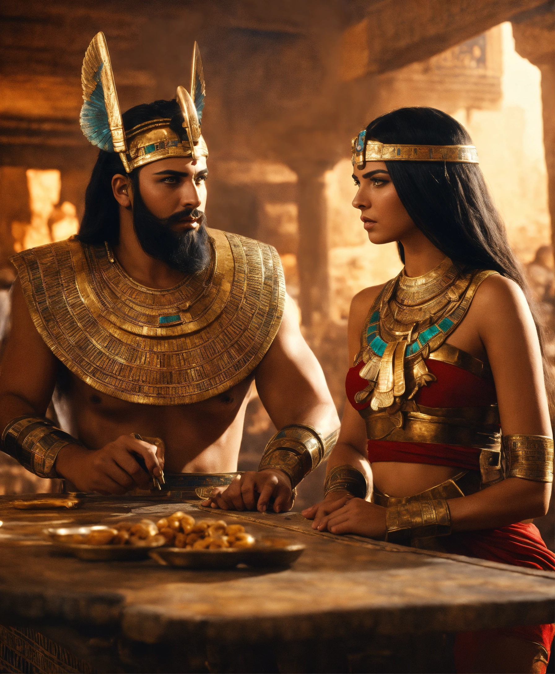 An epic fantasy scene featuring an ancient egyptian tavern, a gorgeous beautiful girl in attractive outfit is talking with a stern and frowning head of security on a table, close view, sharp detail