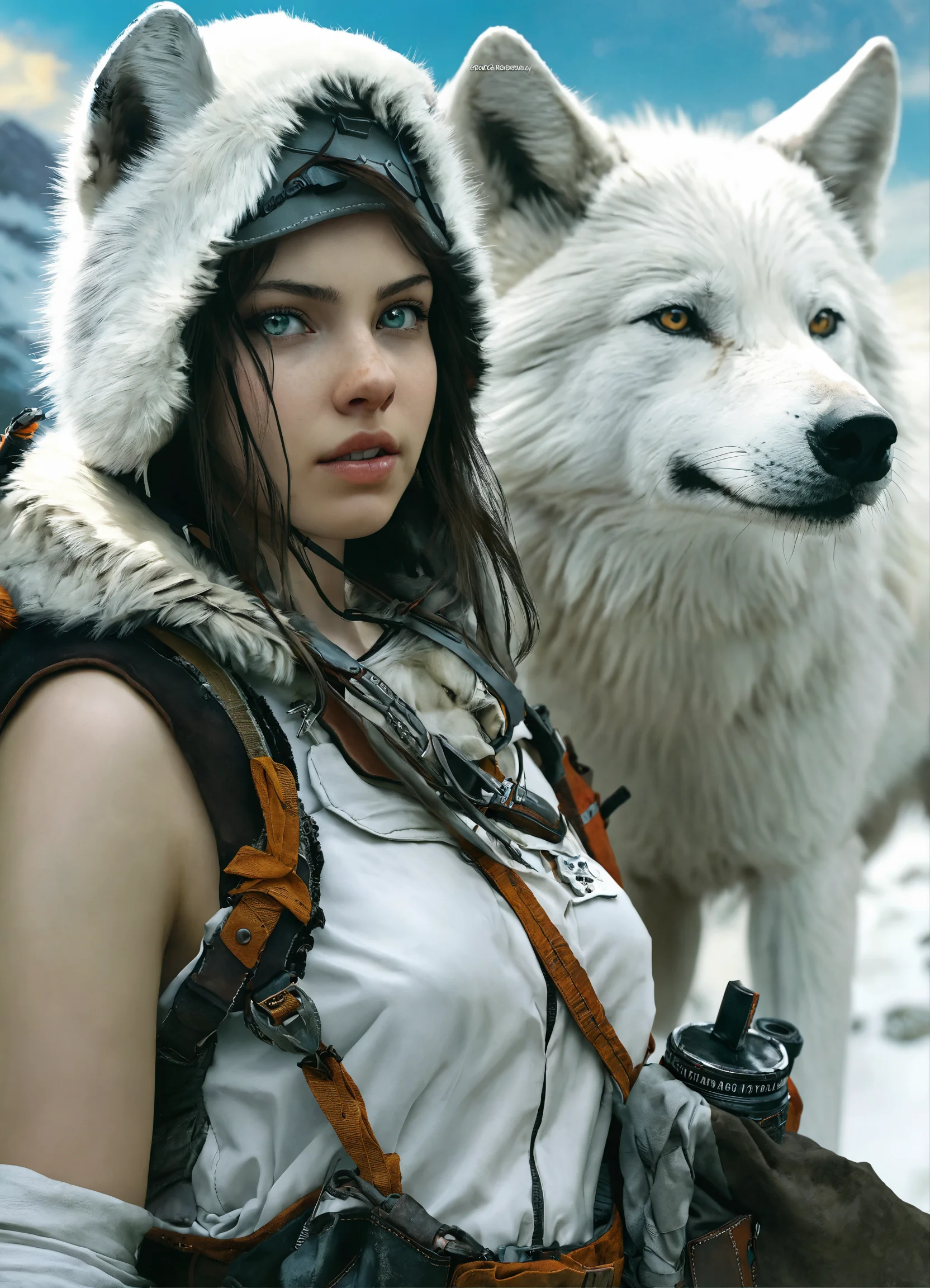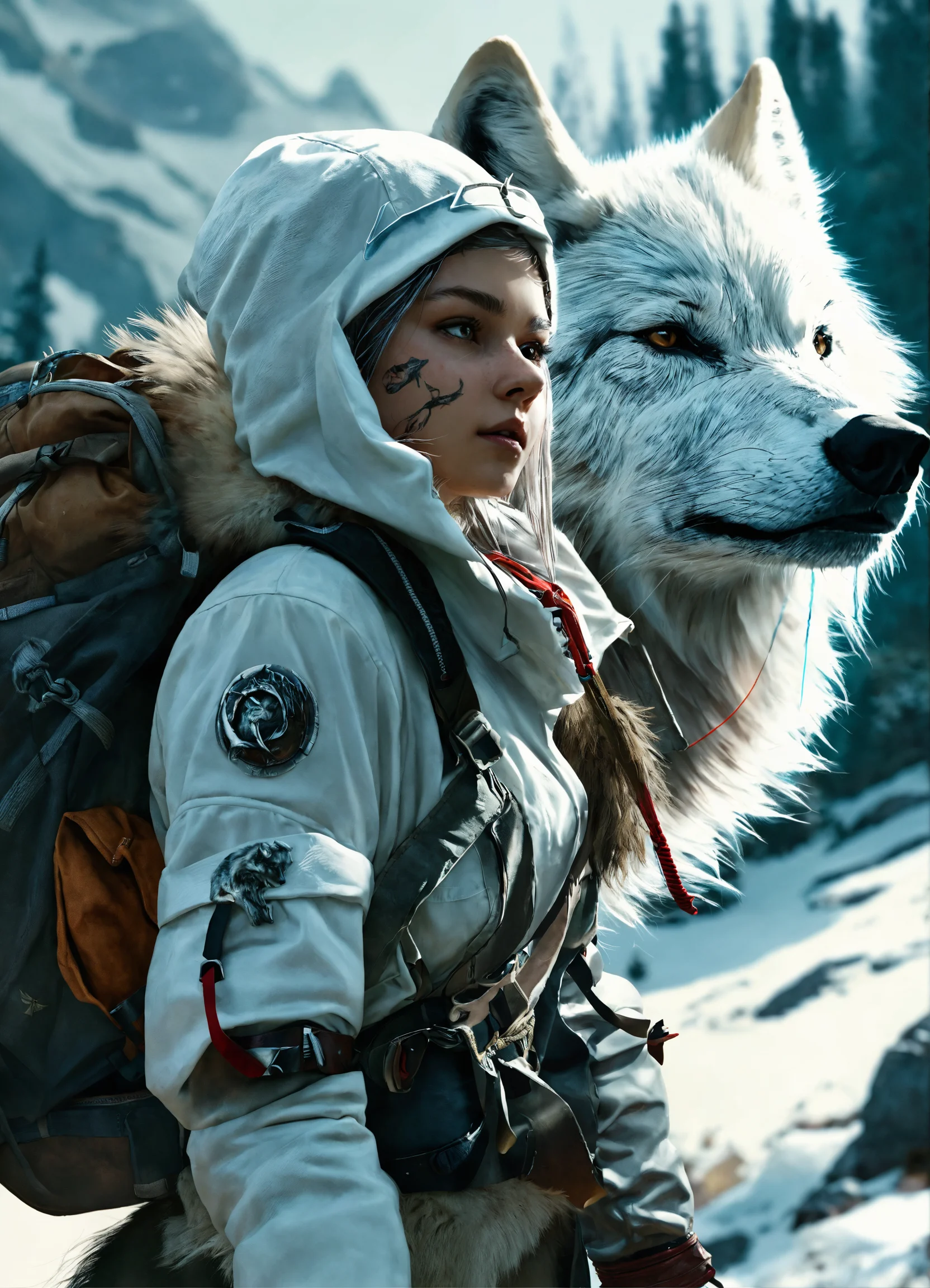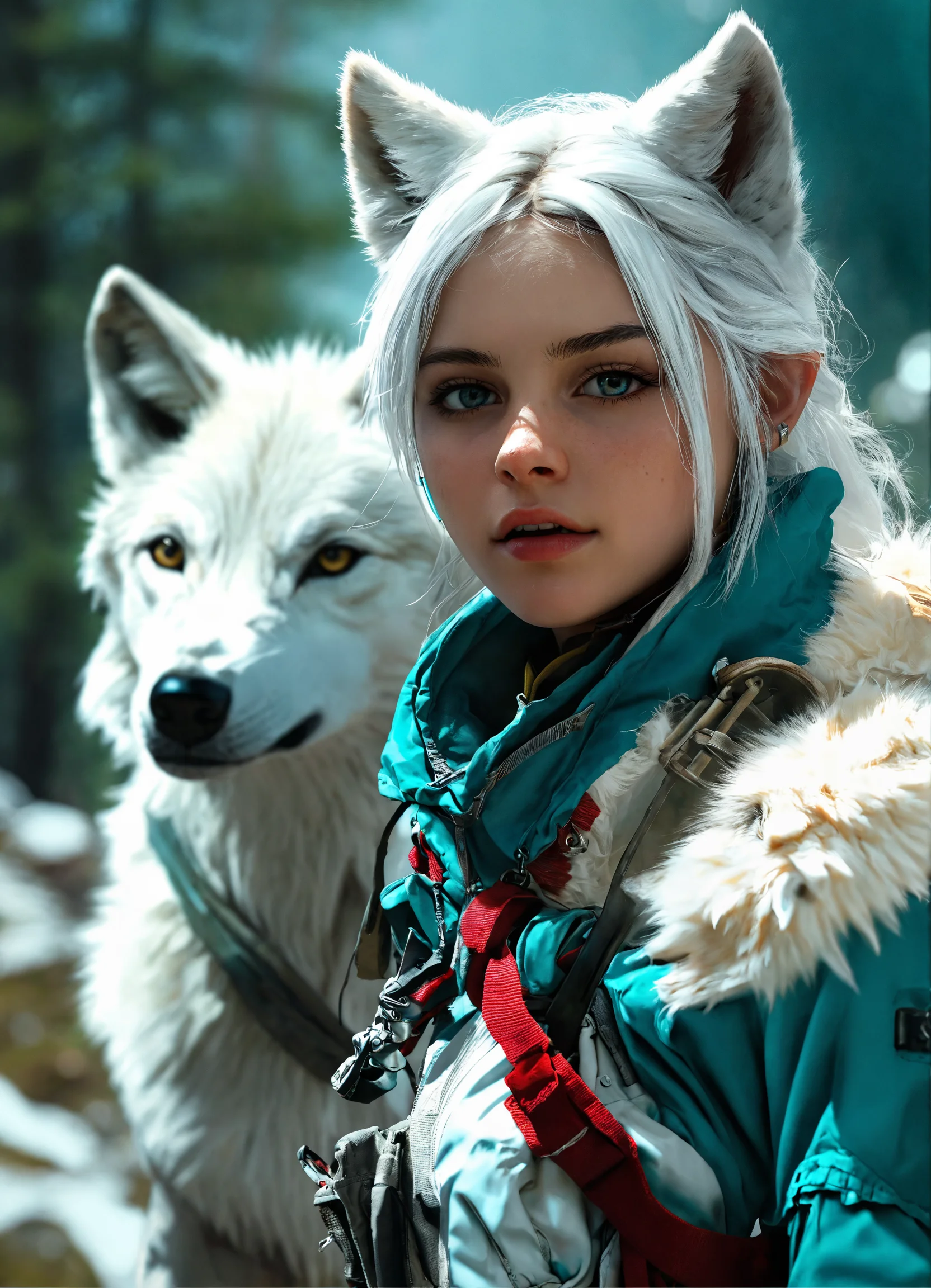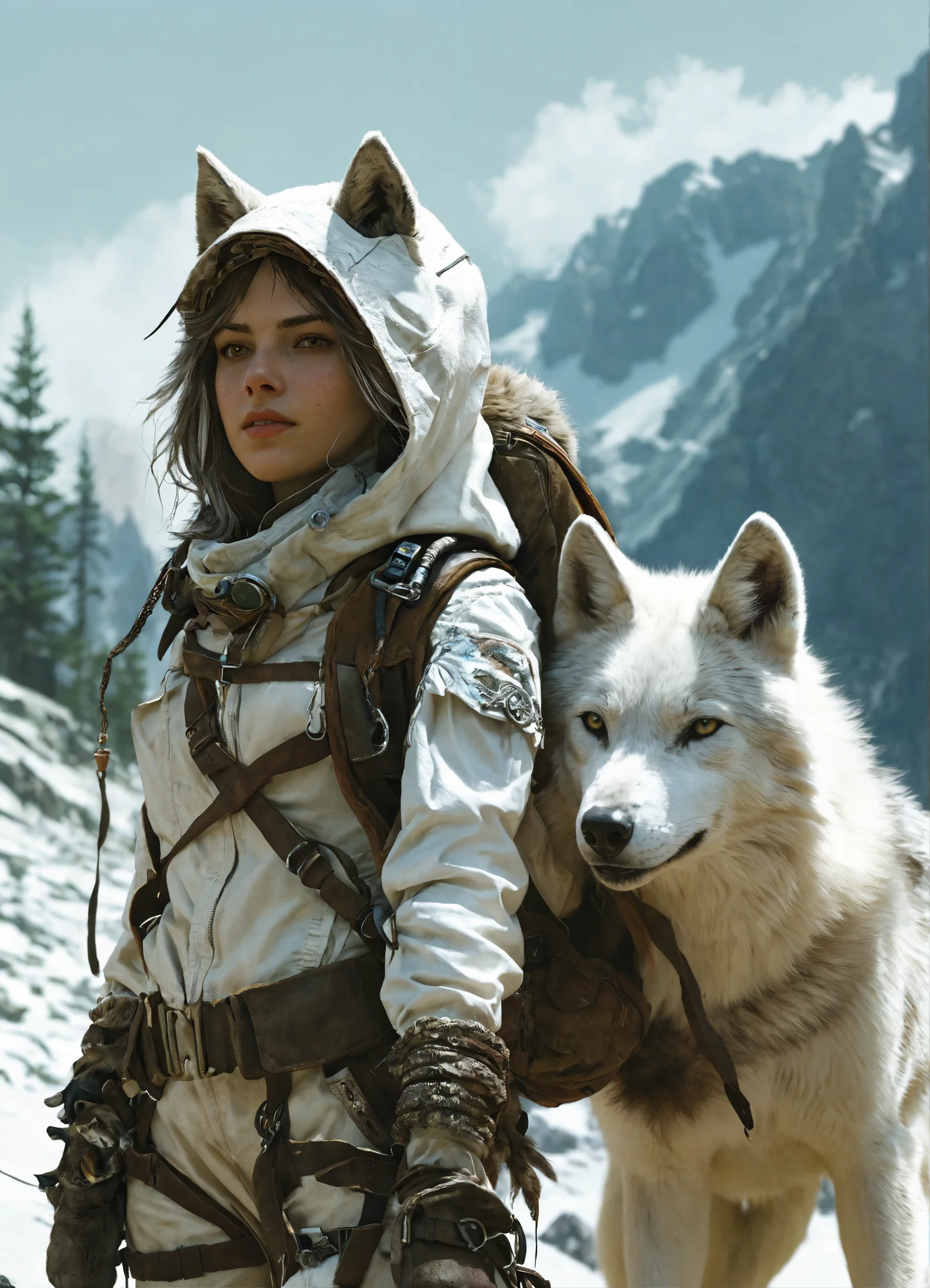 Photorealistic art of a wolf girl dressed in adventuring gear with a white wolf in the background