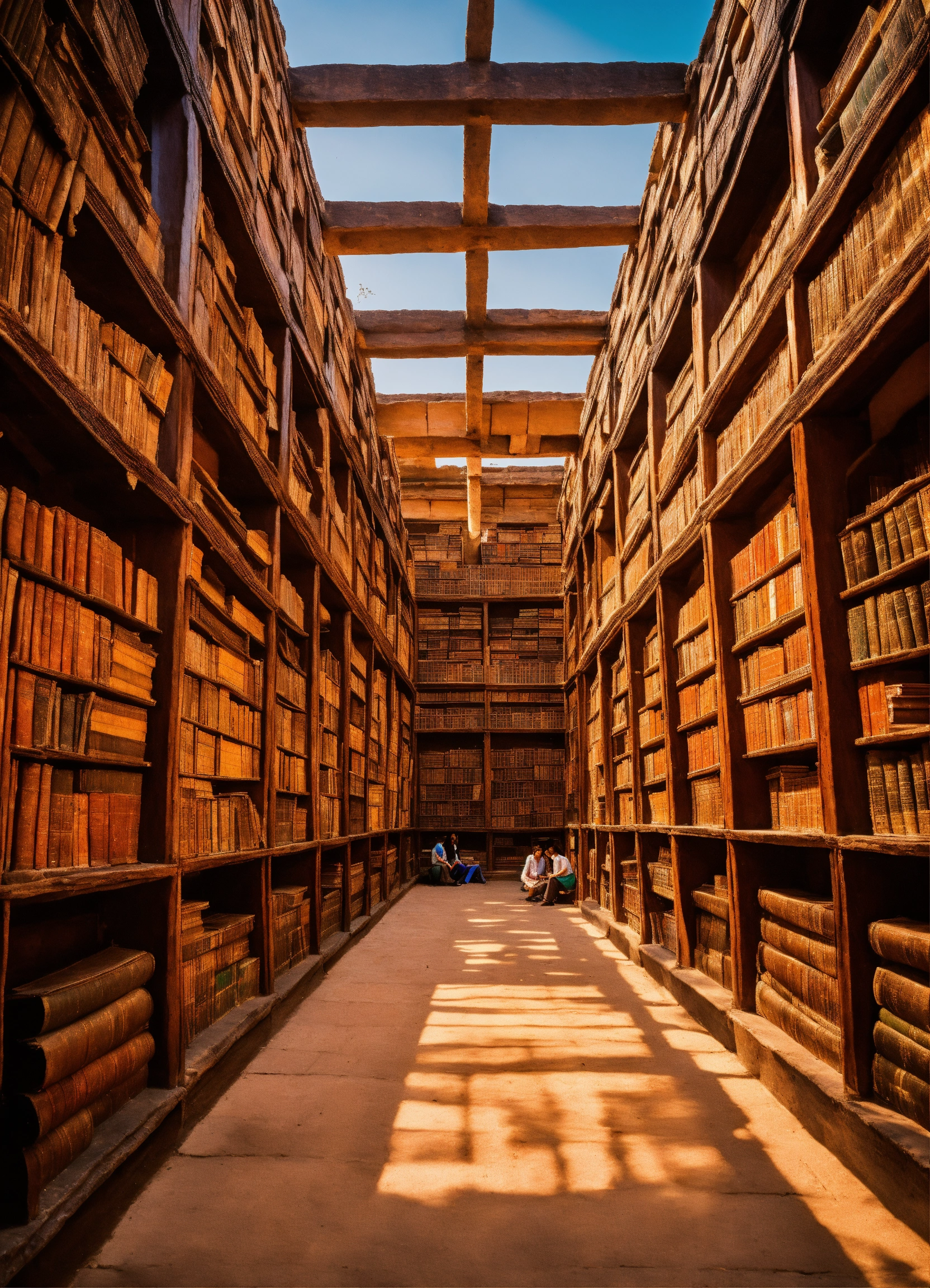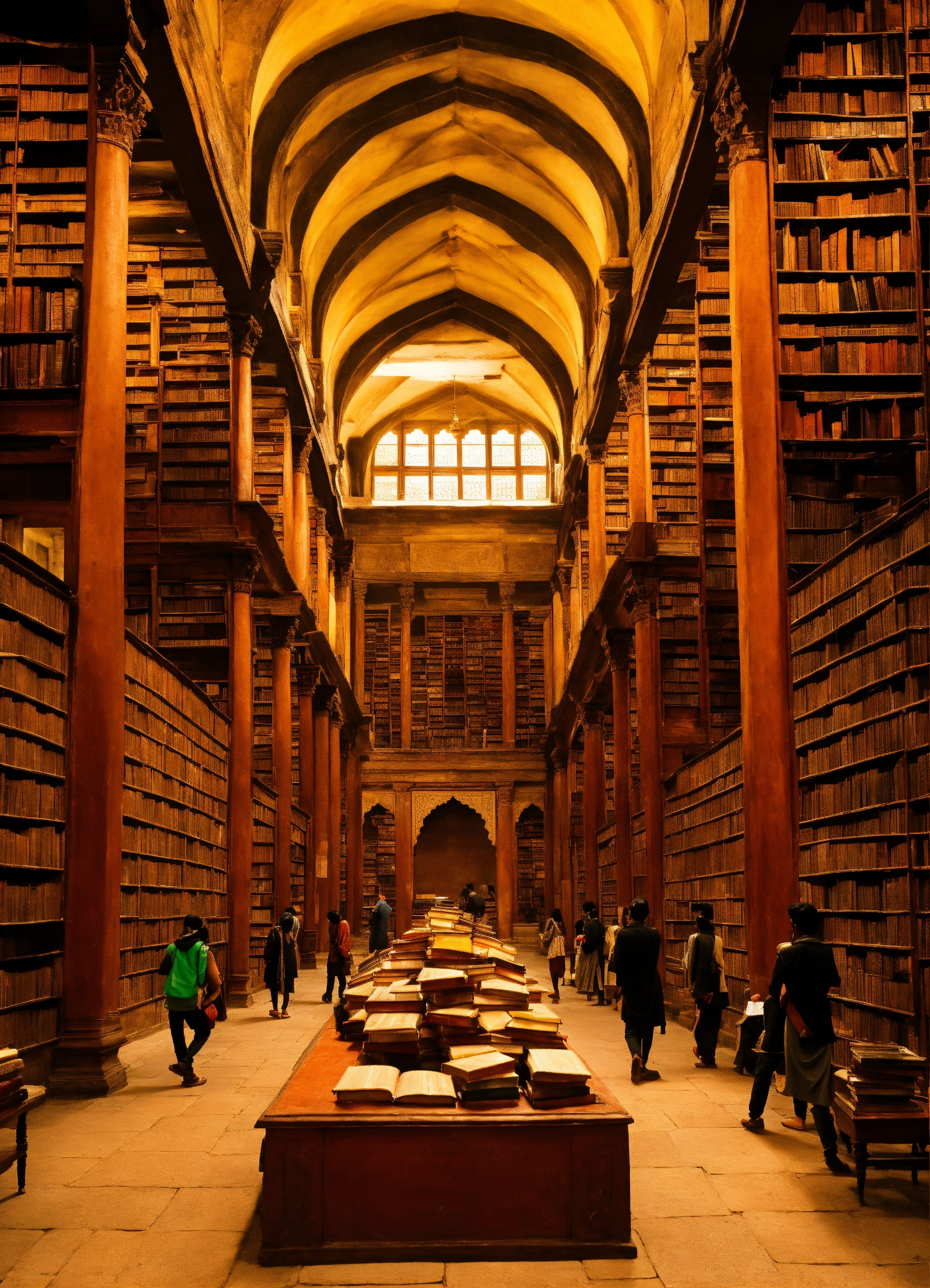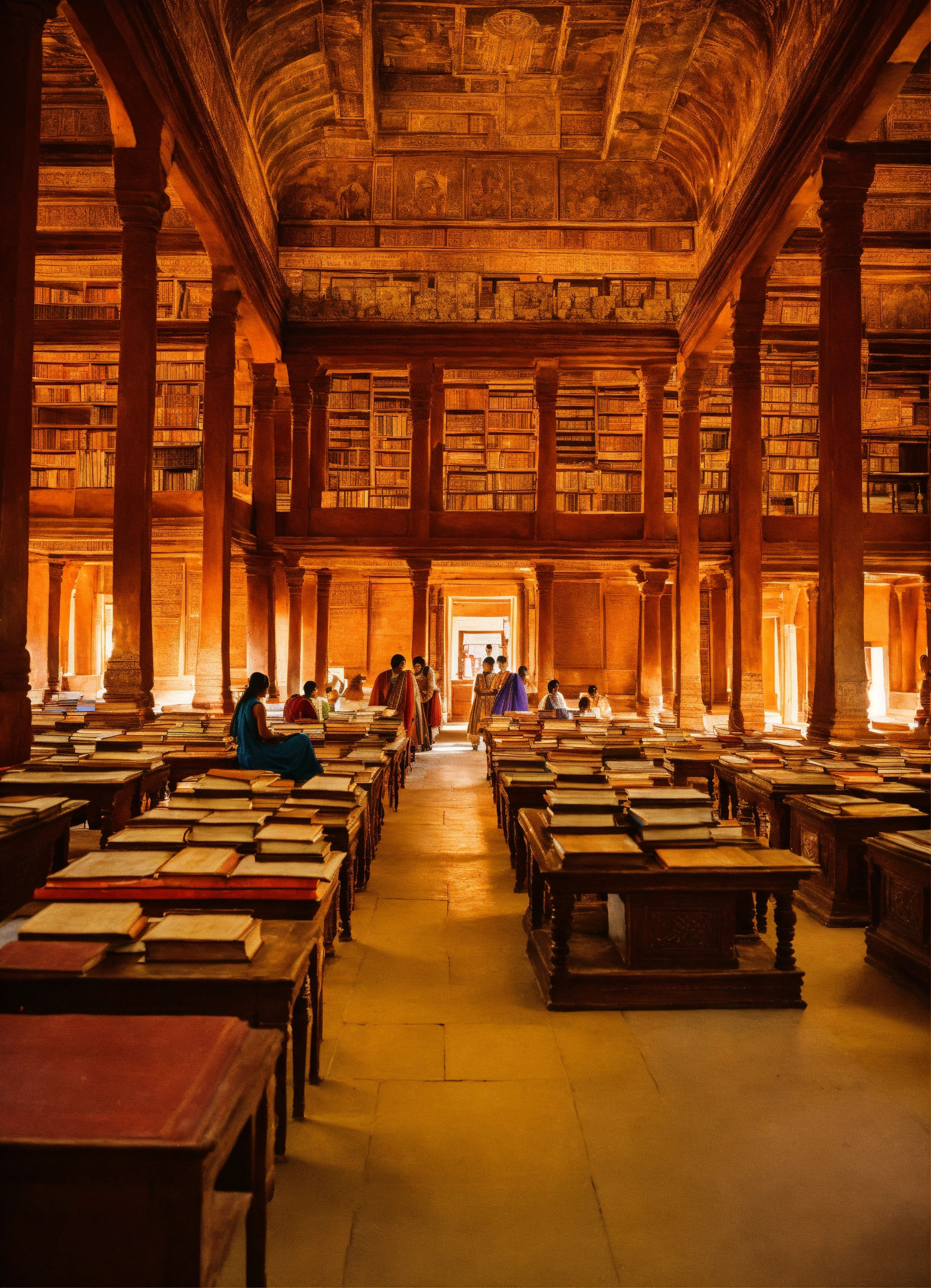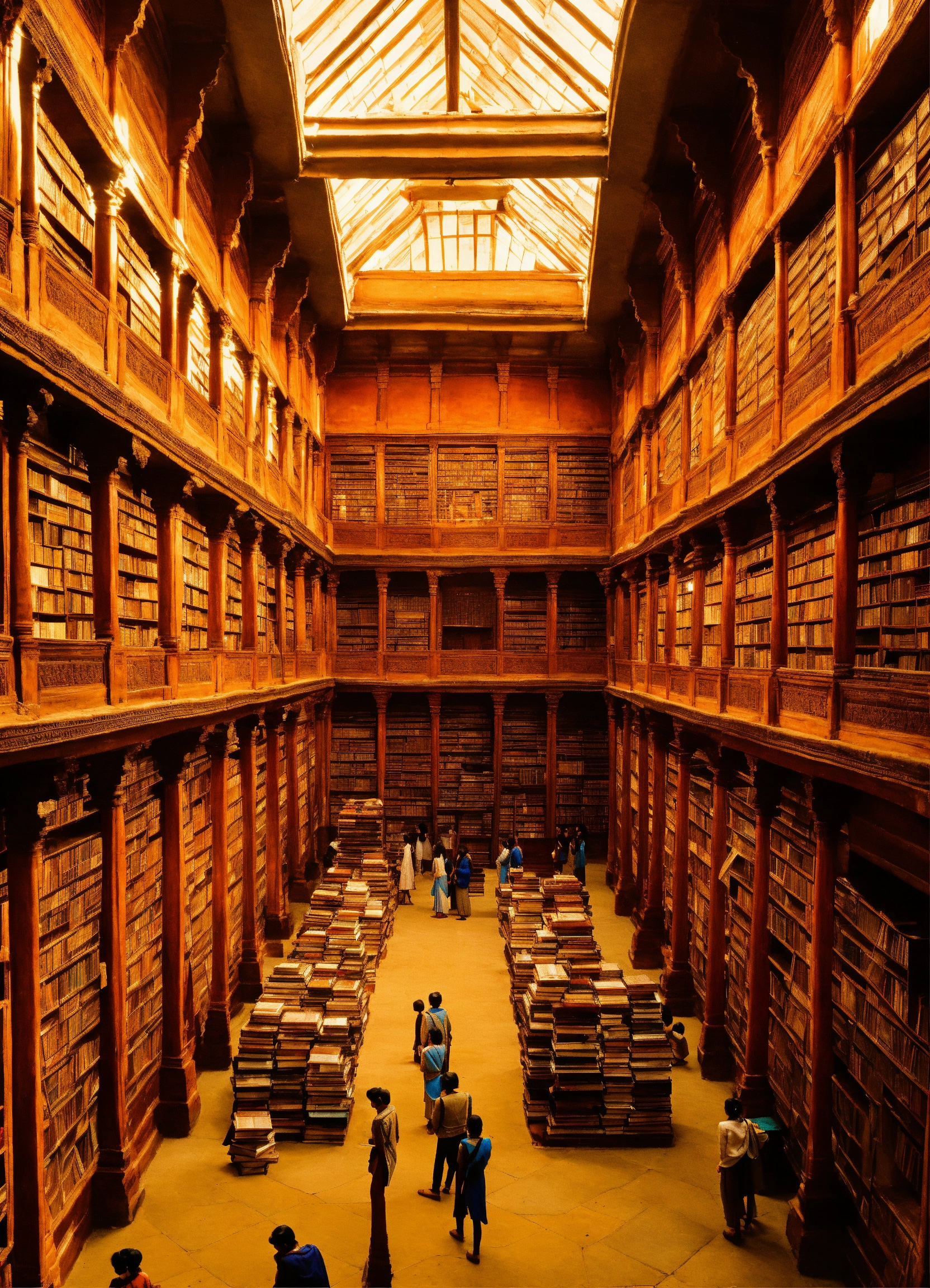 Ancient indian library containing hundreds of thousands of books, ancient india, surrounded by students looking at the books