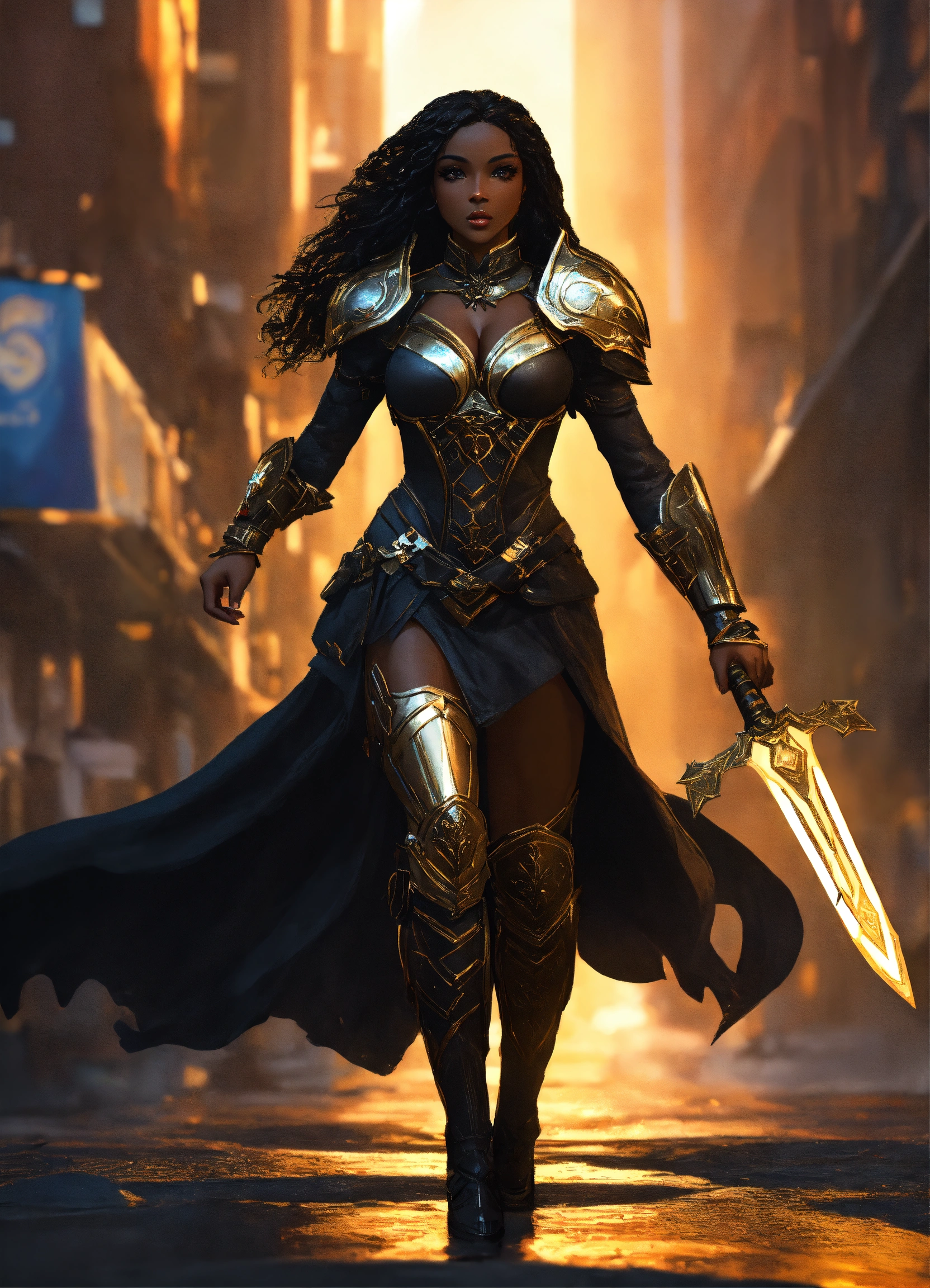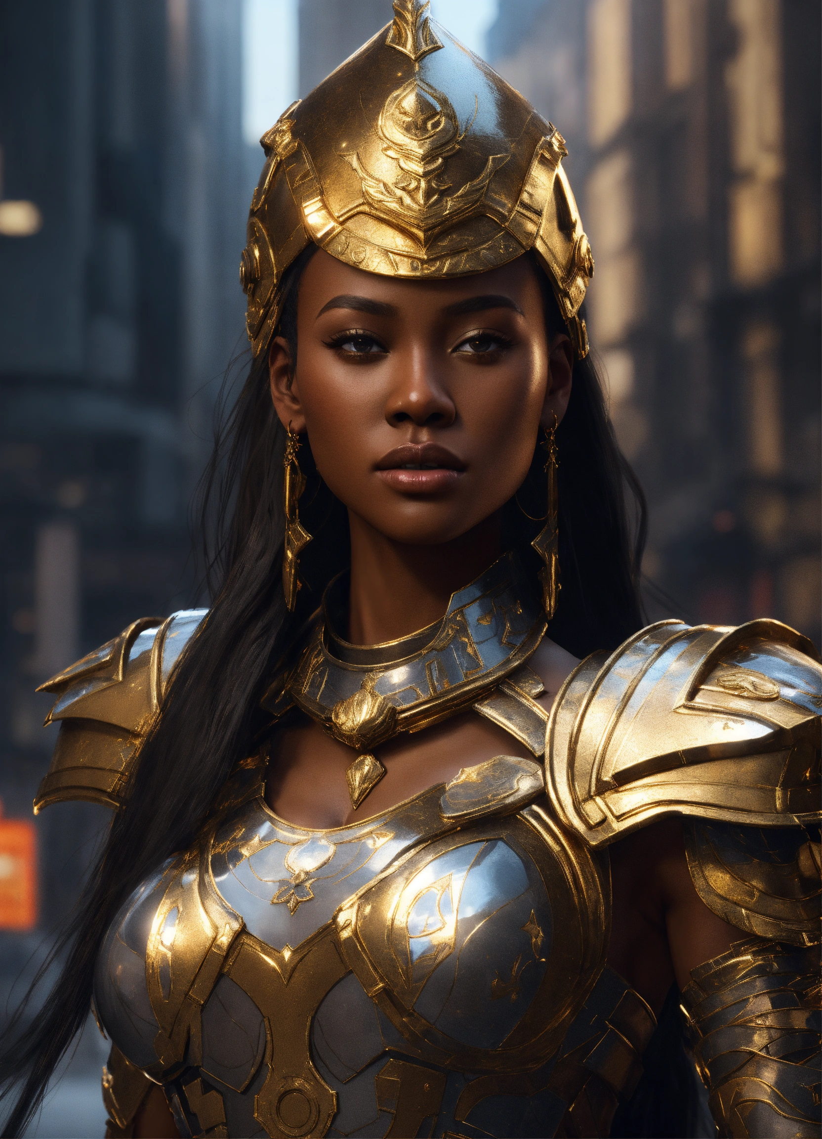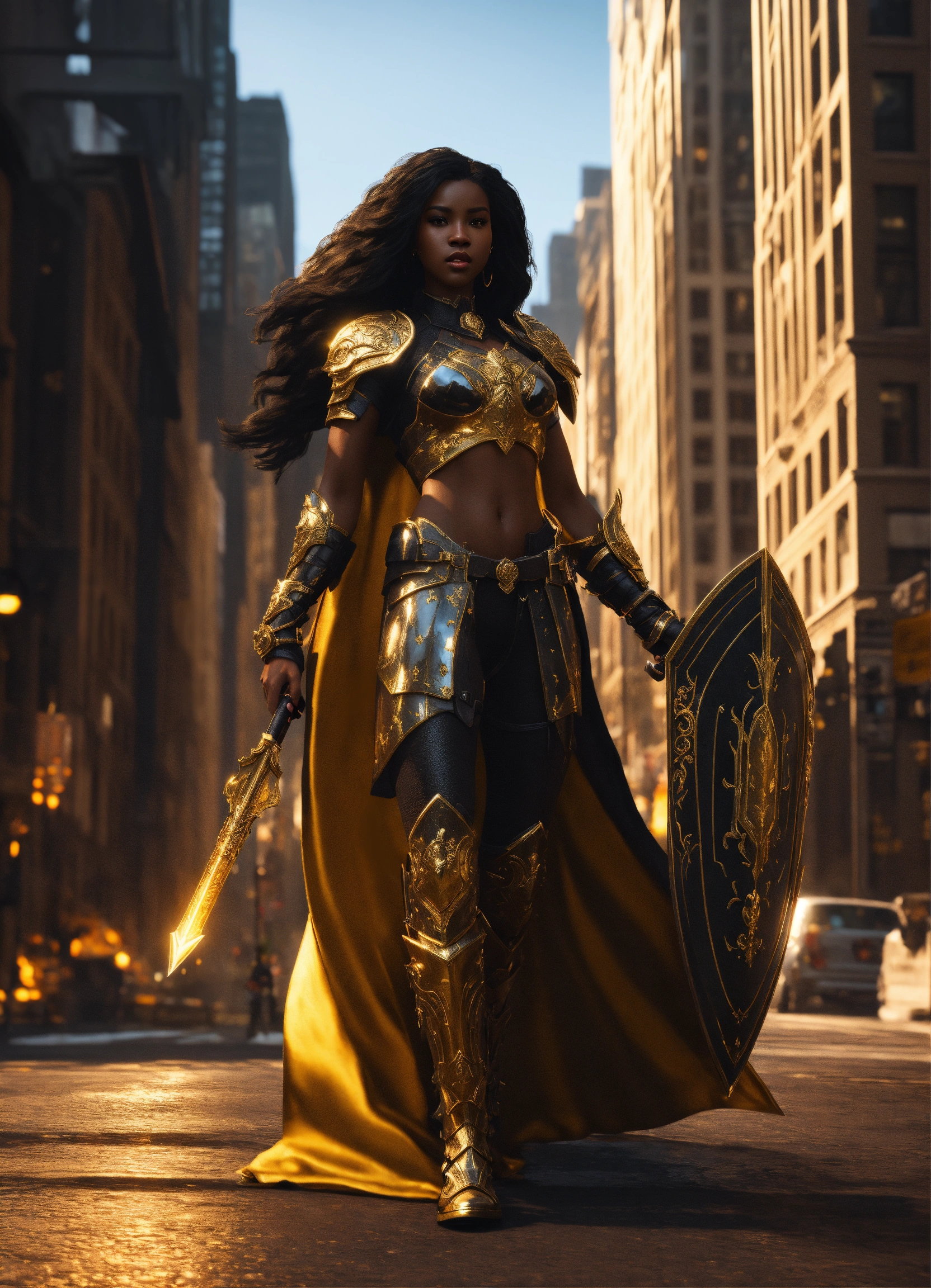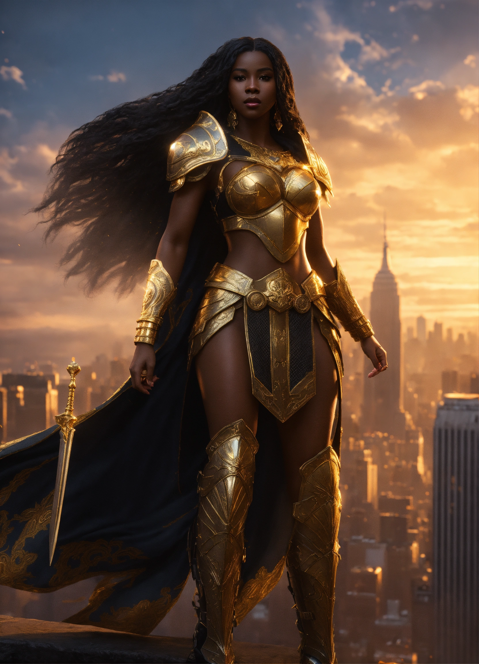 Full body of a beautilul, gorgeous long hair, shapely black female goddess of war with long flowing hair, perfect dark skin, perfect face, full lips most beautiful woman in the world, shapely hour-glass figure, a a dark skin hero wearing gold and black armor, fully covered, in new york city, full body, 8k resolution concept art portrait dynamic lighting hyperdetailed intricately detailed splash art trending on artstation unreal engine 5 volumetric lighting