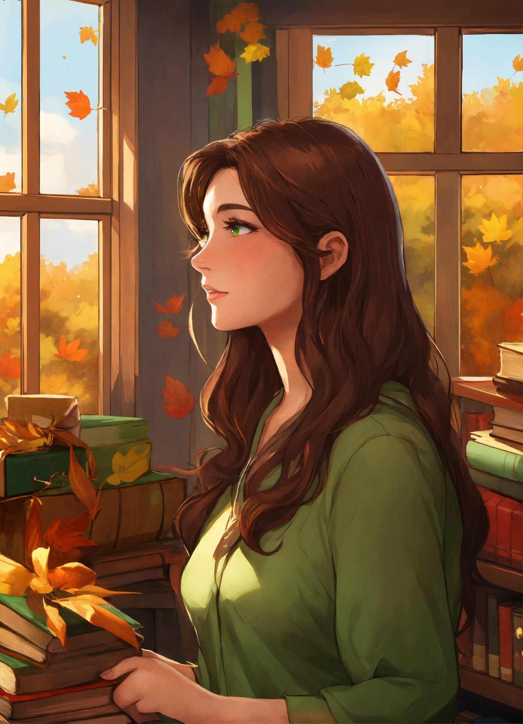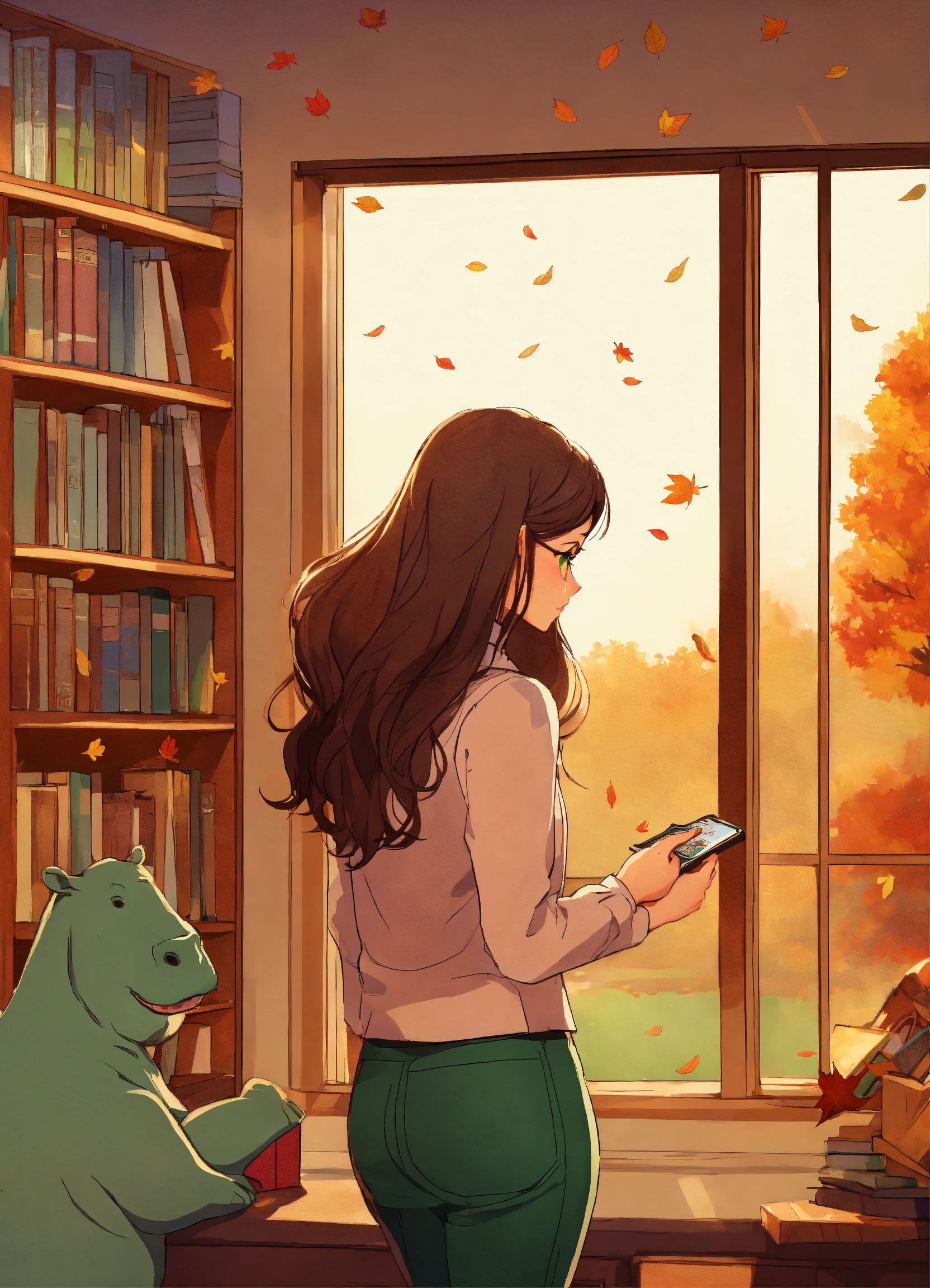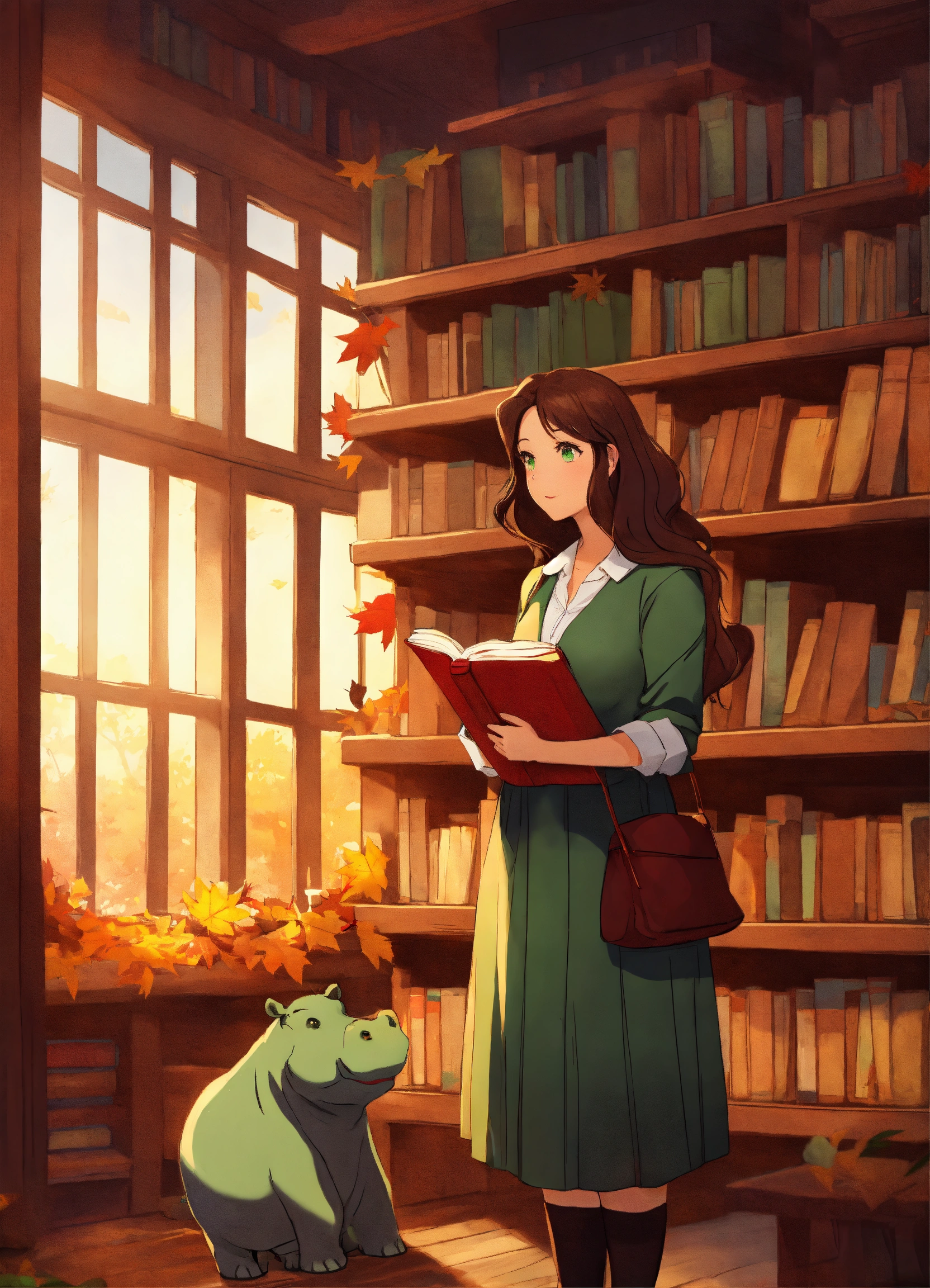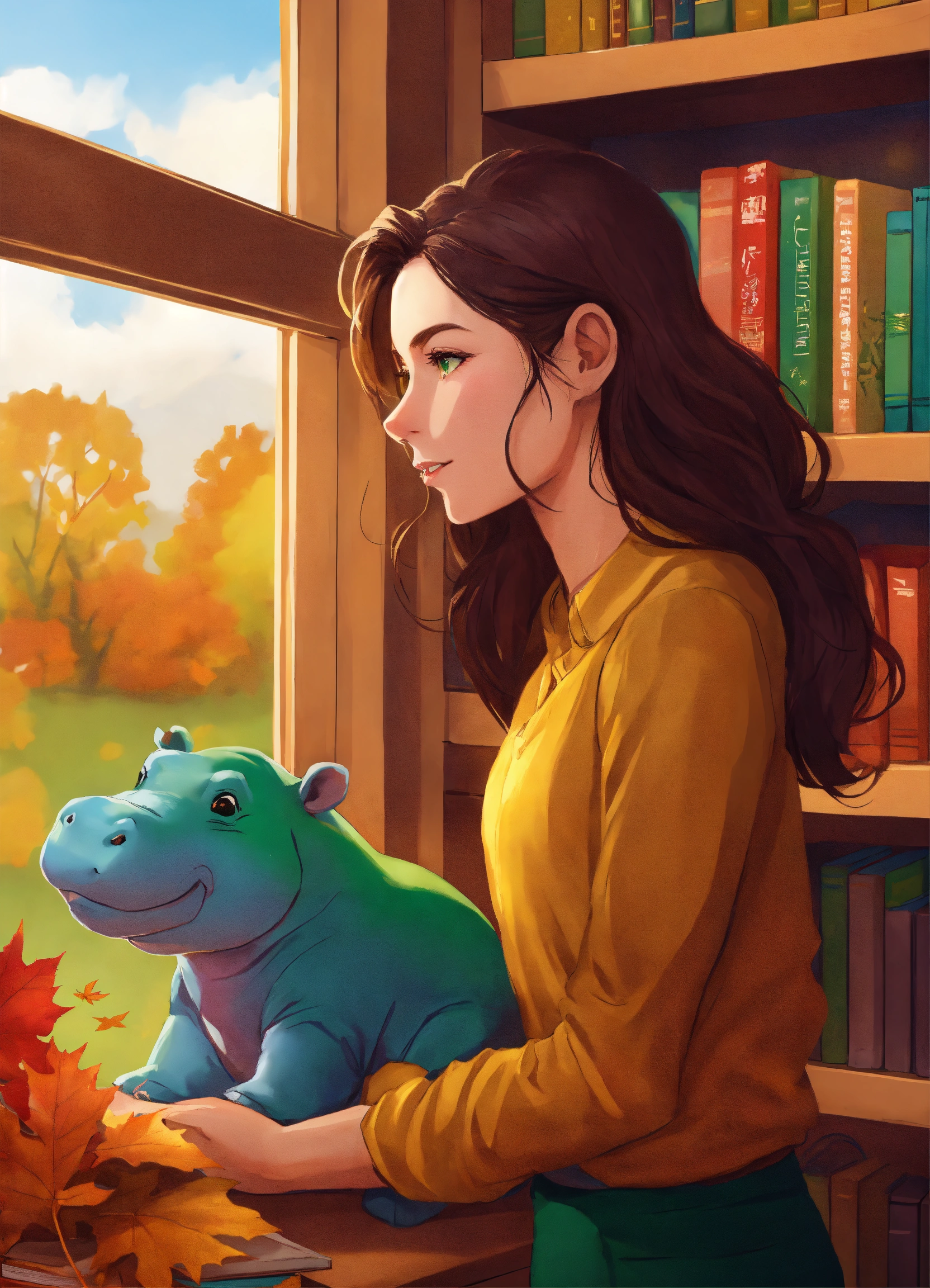 Female teacher, library, wooden bookshelves, looking out the window, long wavy dark brown hair, green eyes, a hippo present, autumn