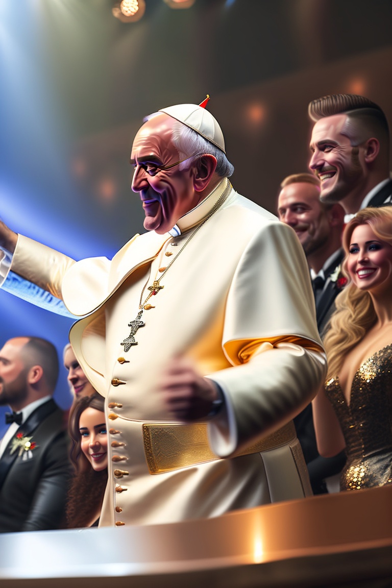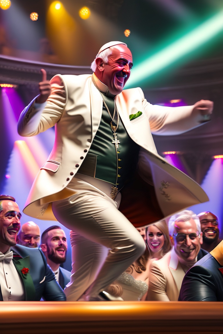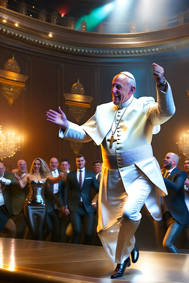(pope francis) wearing leather jacket is dancing in a bar, dancers on stage, bar in the background table, 4k resolution, a masterpiece