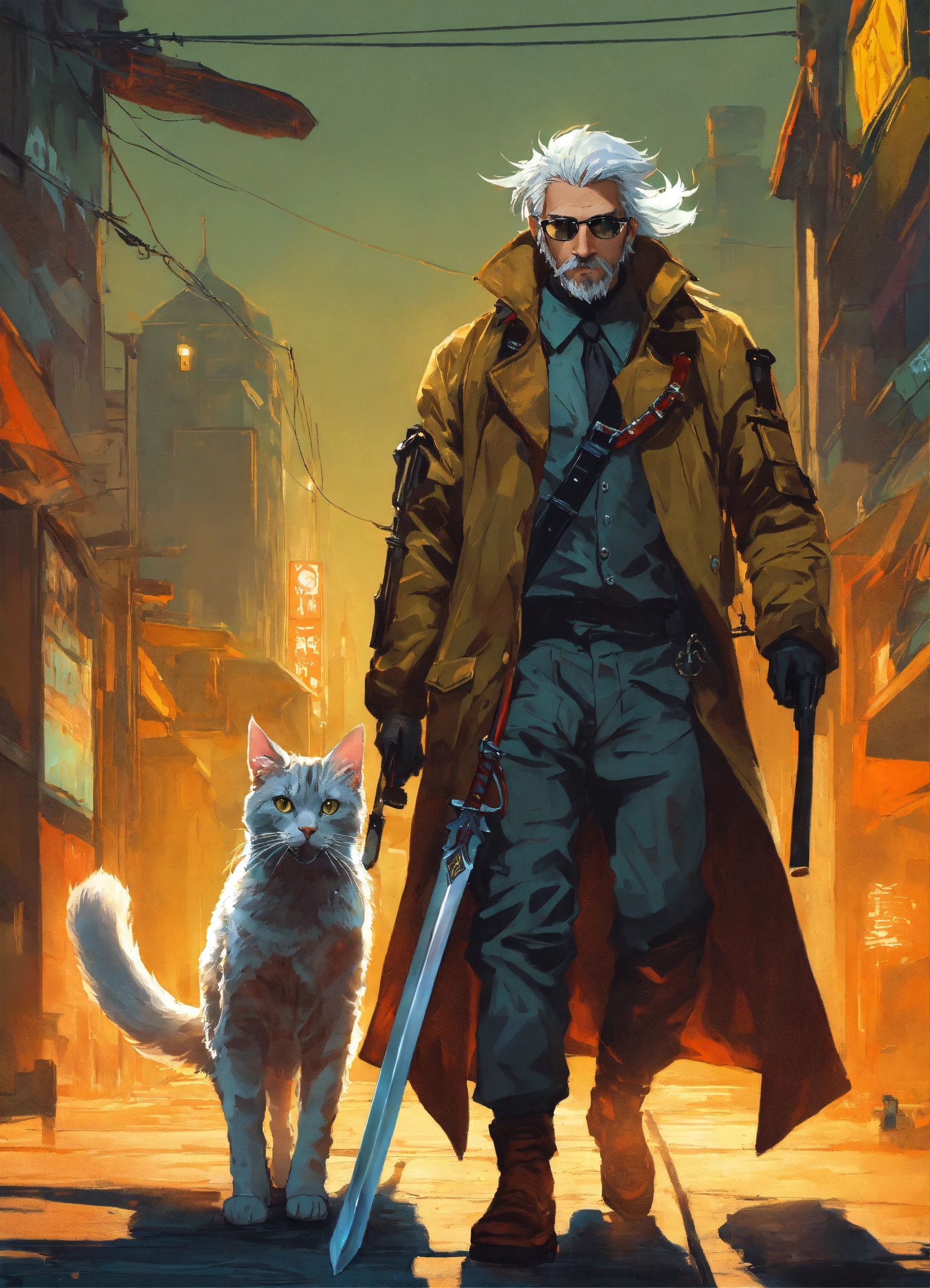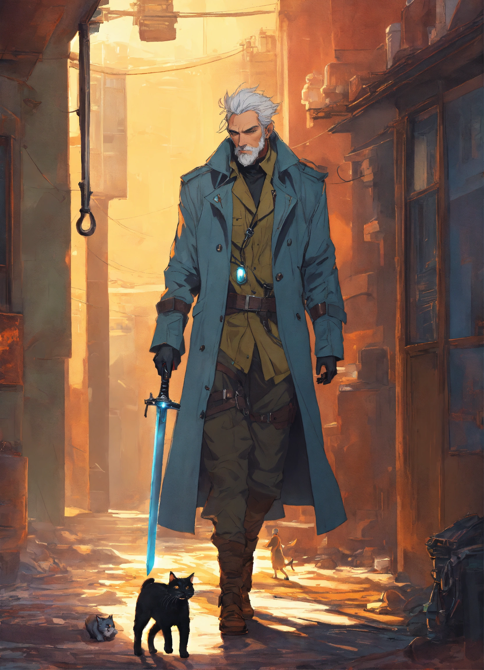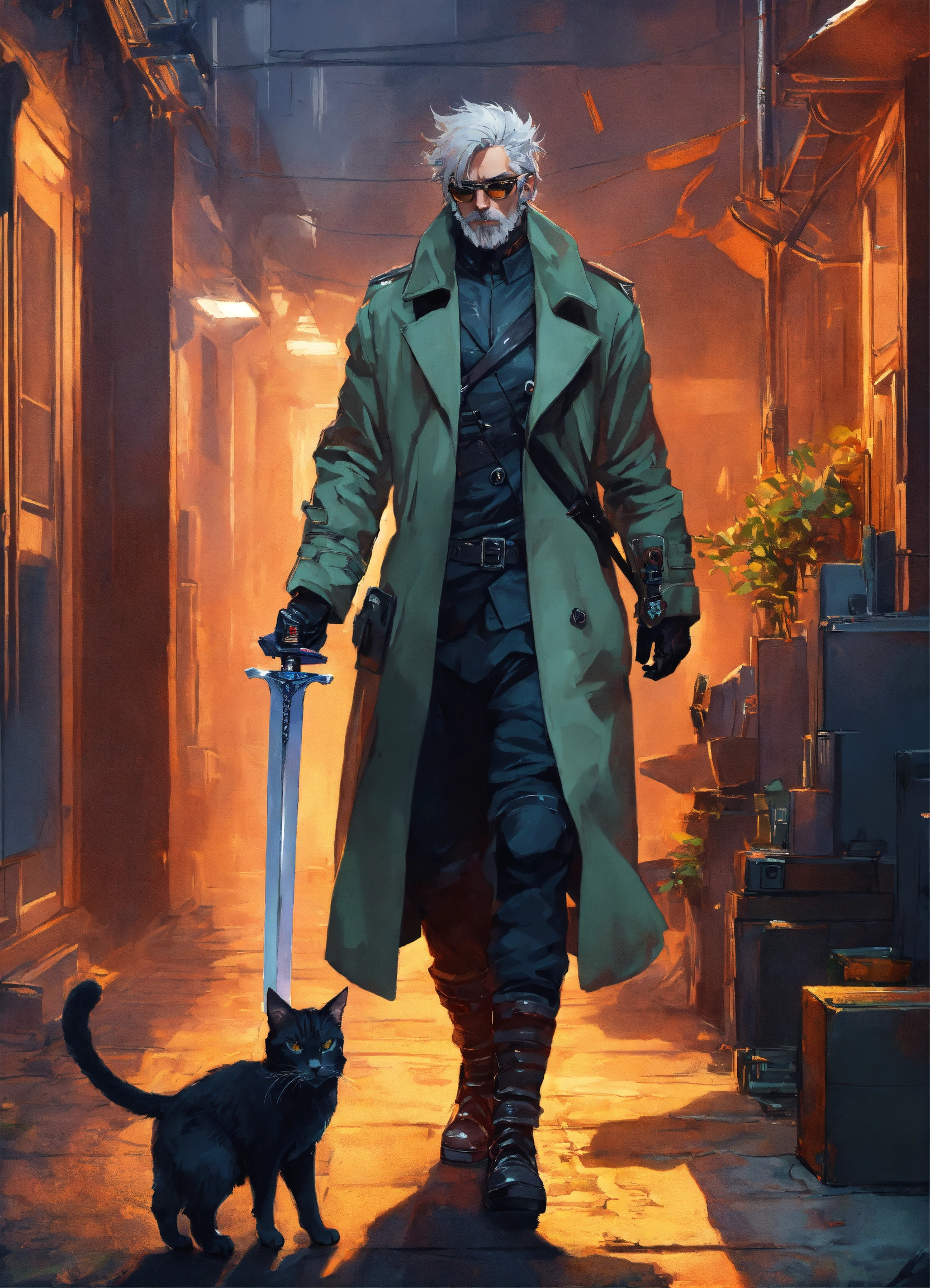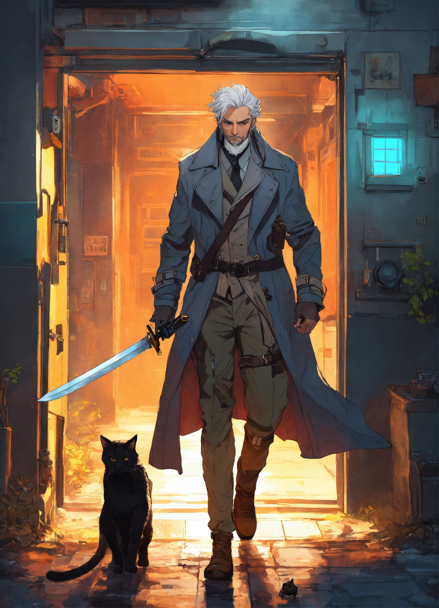 Brutal silver haired men with sword in biopunk trenchcoat with his cat walking to the door to the infinite