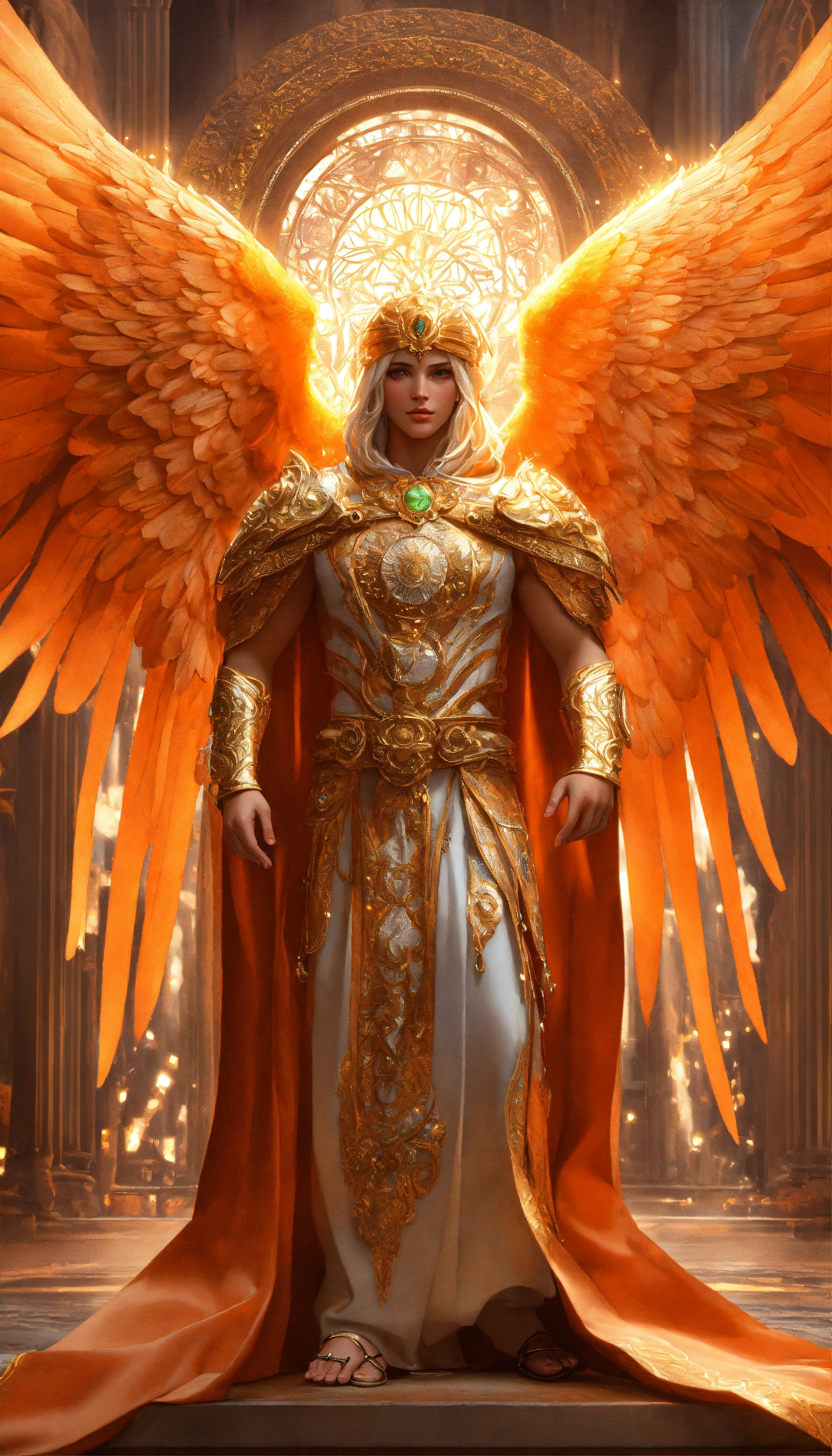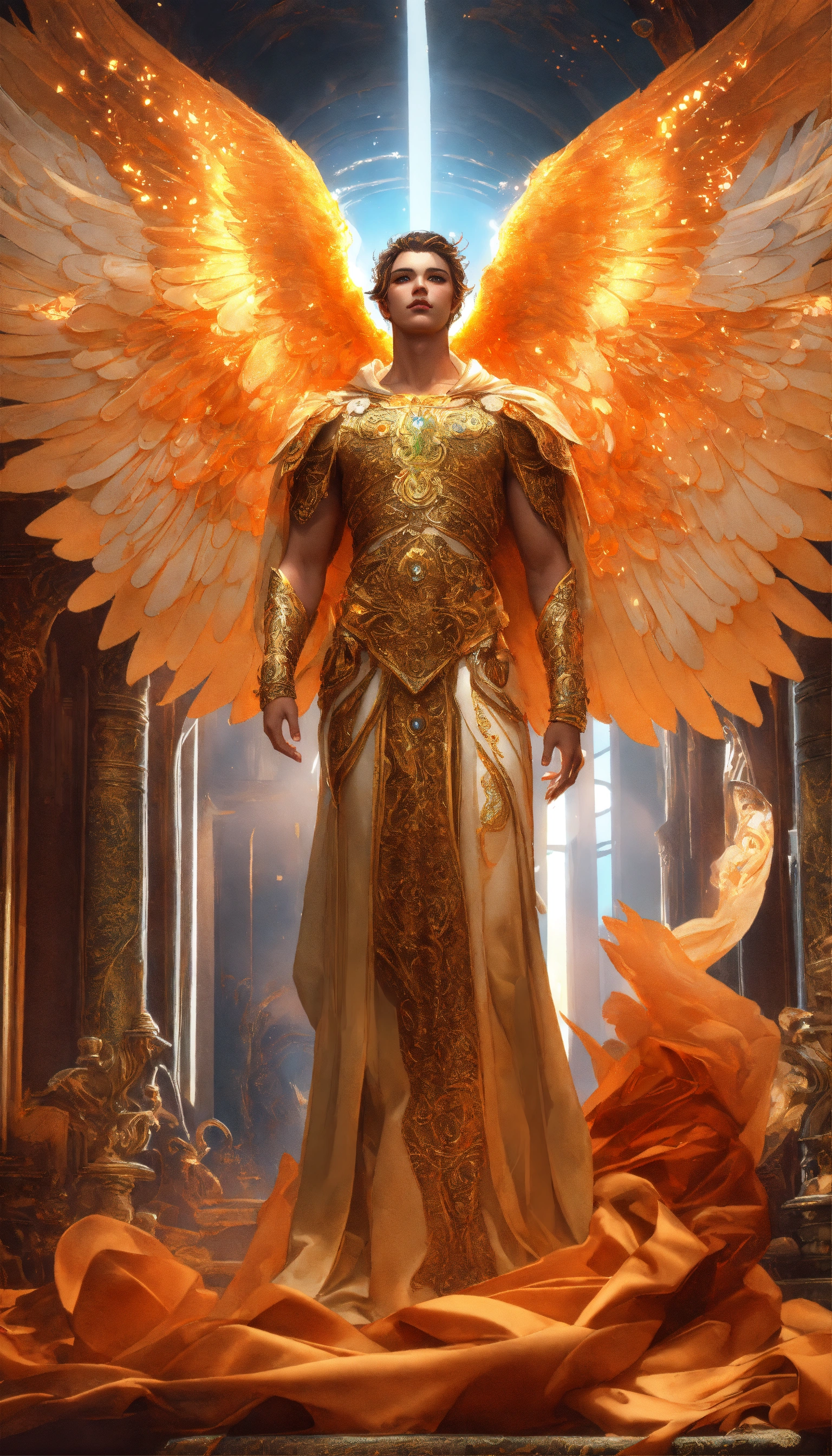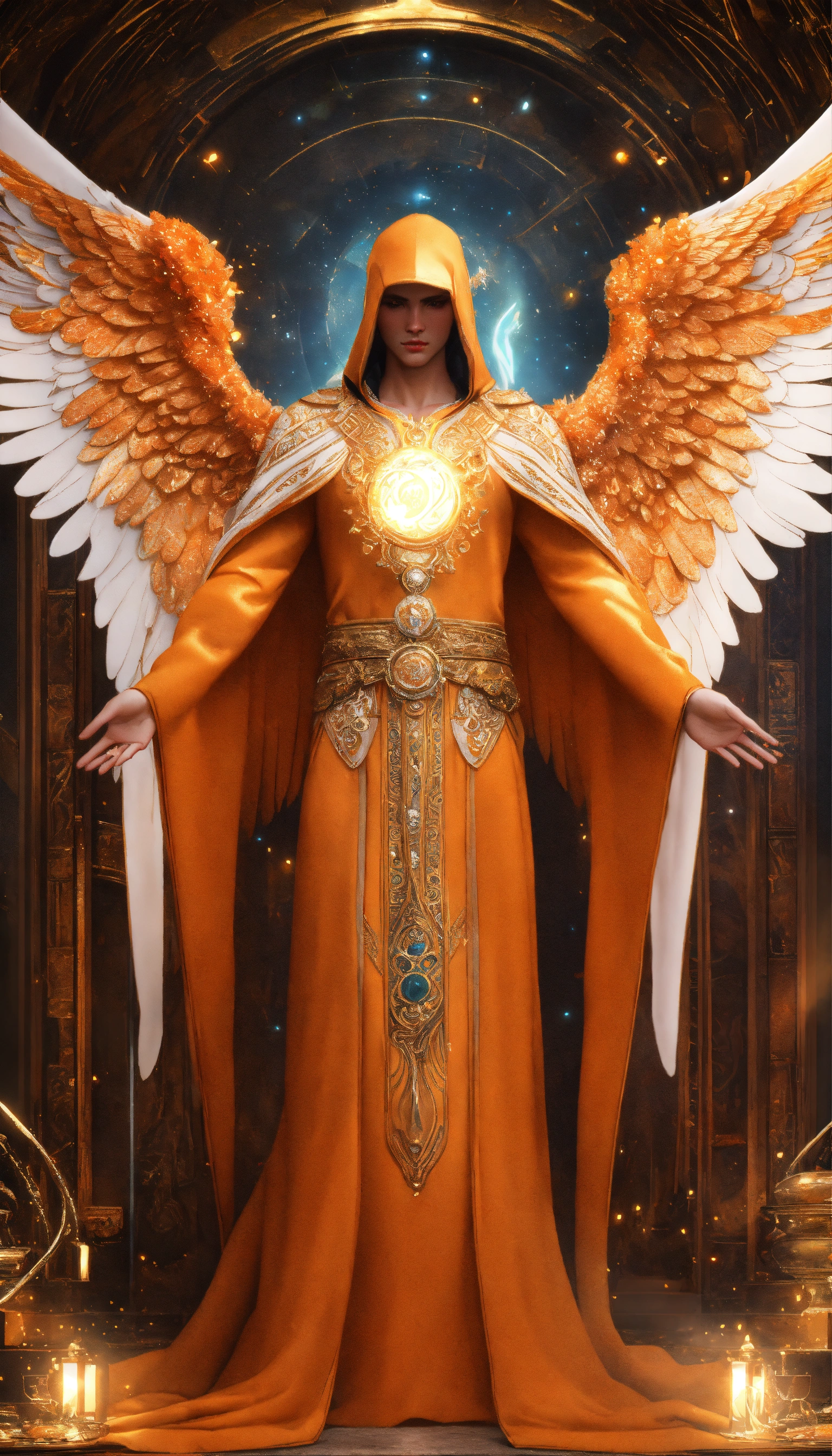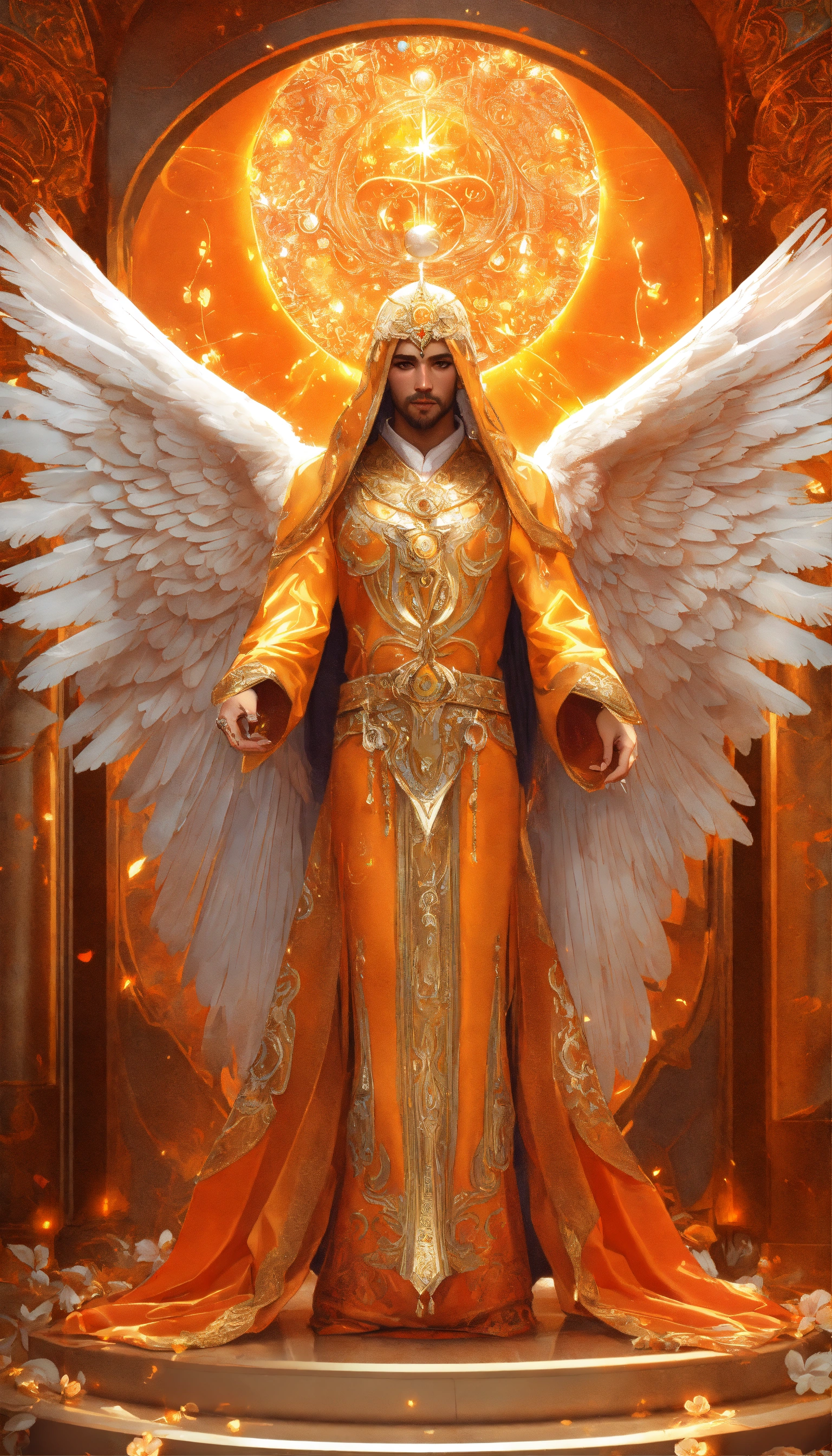 Text male angel, wings, intricate, highly detailed, photomanipulation, art station, real, 3d, orange wings with luminous white flashes, large and detailed wings, clear eyes and deep look, face perfect in beauty and detail, jewel in the third eye, orange robe with white and gold details, sacred, mystical, sharp focus, cinematic lighting, 8k, art by artgerm and greg rutkowski, alphonse mucha, cgsociety, high quality and resolution, hyper realistic