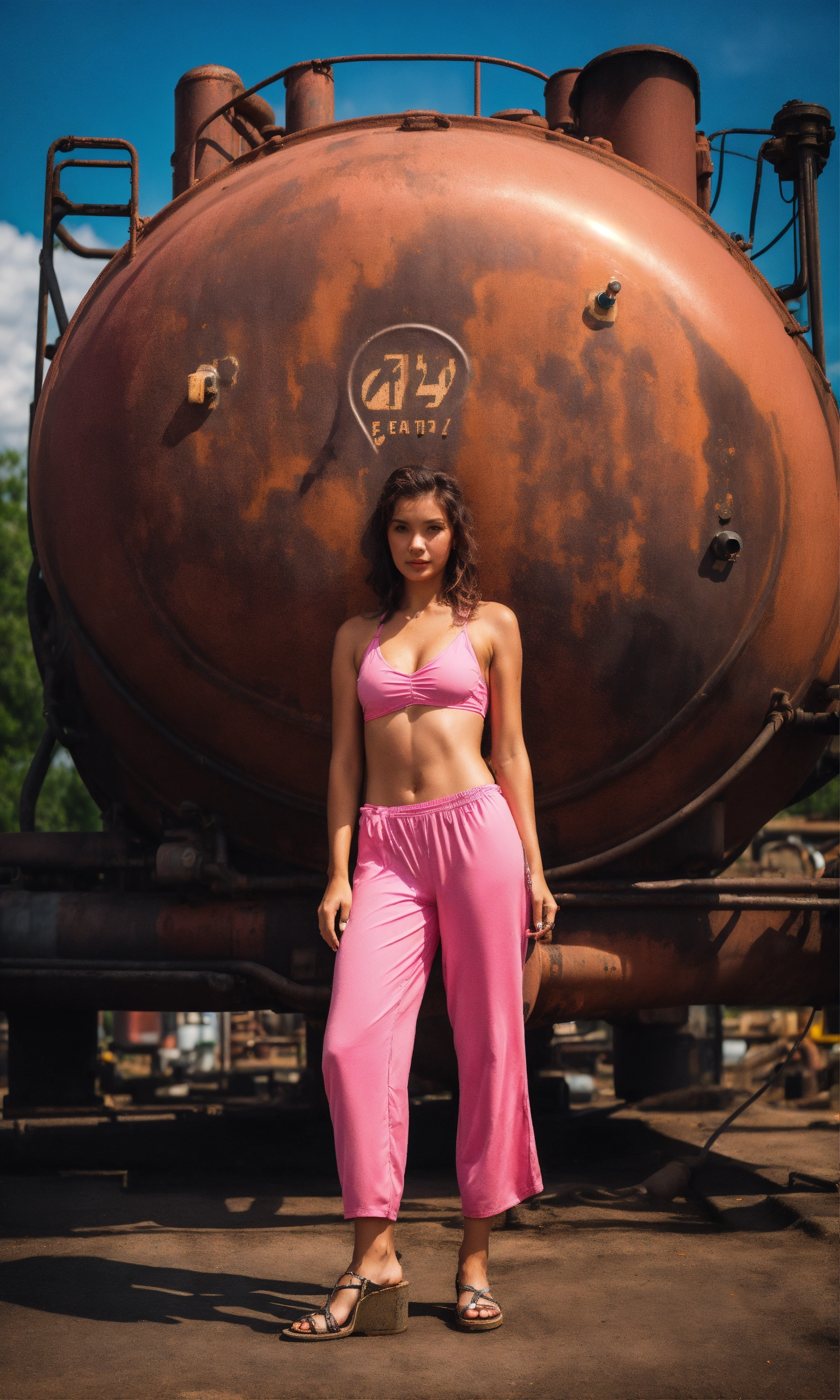 25 years old lady wearing pink swimming suit standing on top a giant fuel tank and a rusty fuel pump with a lots of diesel leaks under tanks
