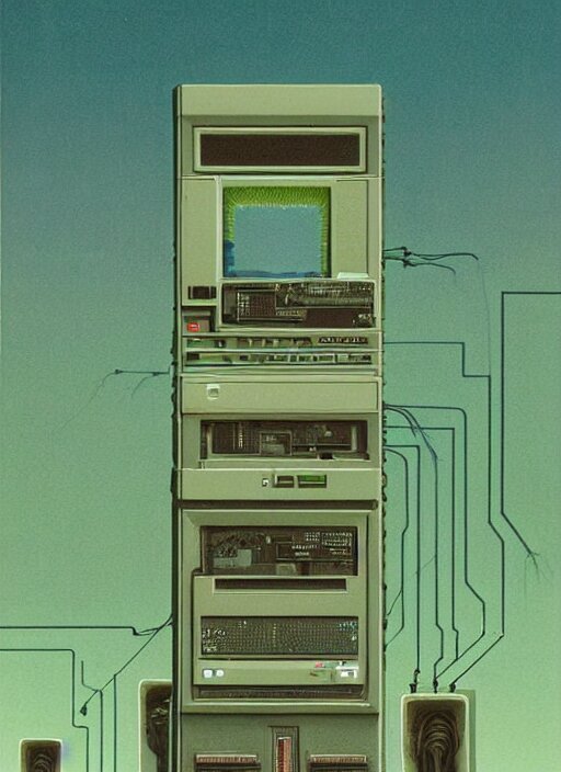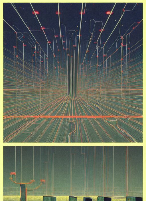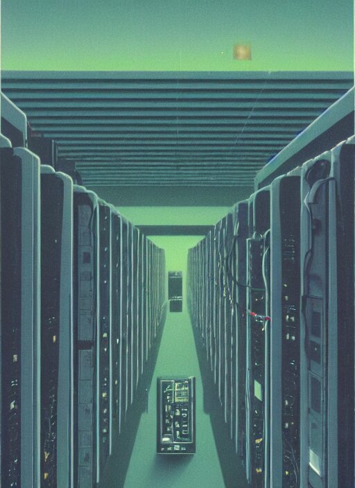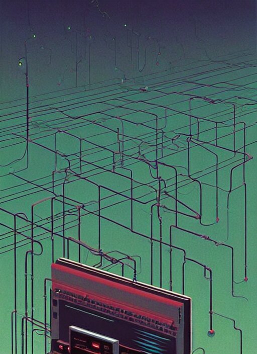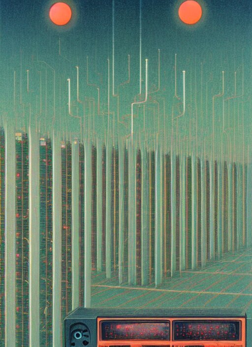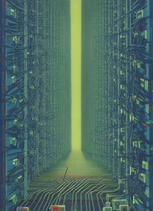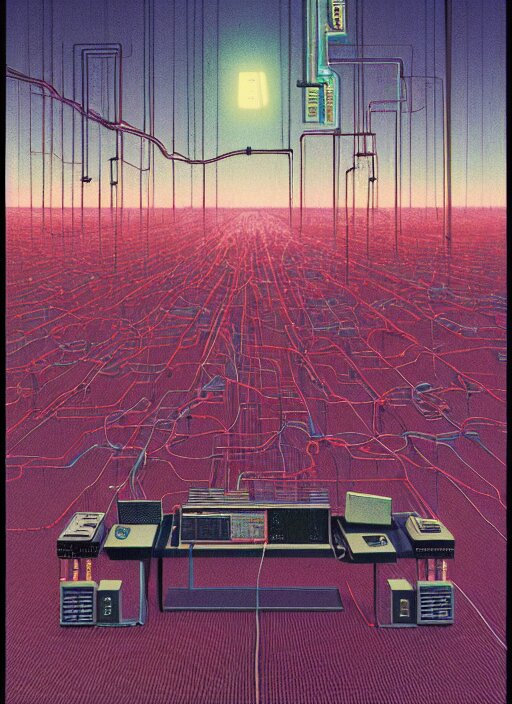 Mainframes connected by neuronal wires cluster in lilting colonies atop a three and a quarter inch floppy disk that stretches into the distance edward hopper and james gilleard, zdzislaw beksinski, mark ryden, wolfgang lettl highly detailed, hints of yayoi kasuma