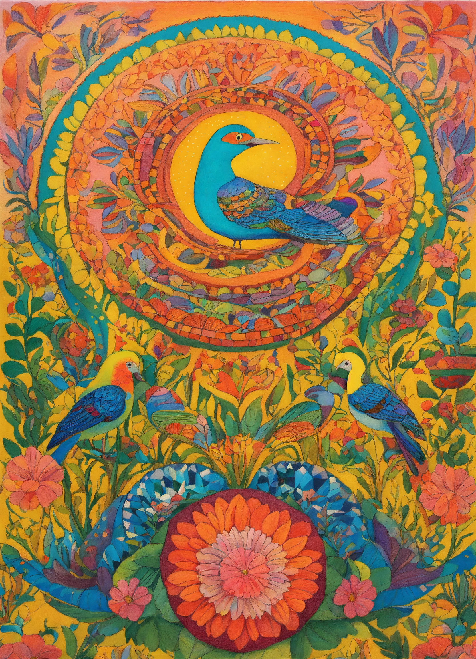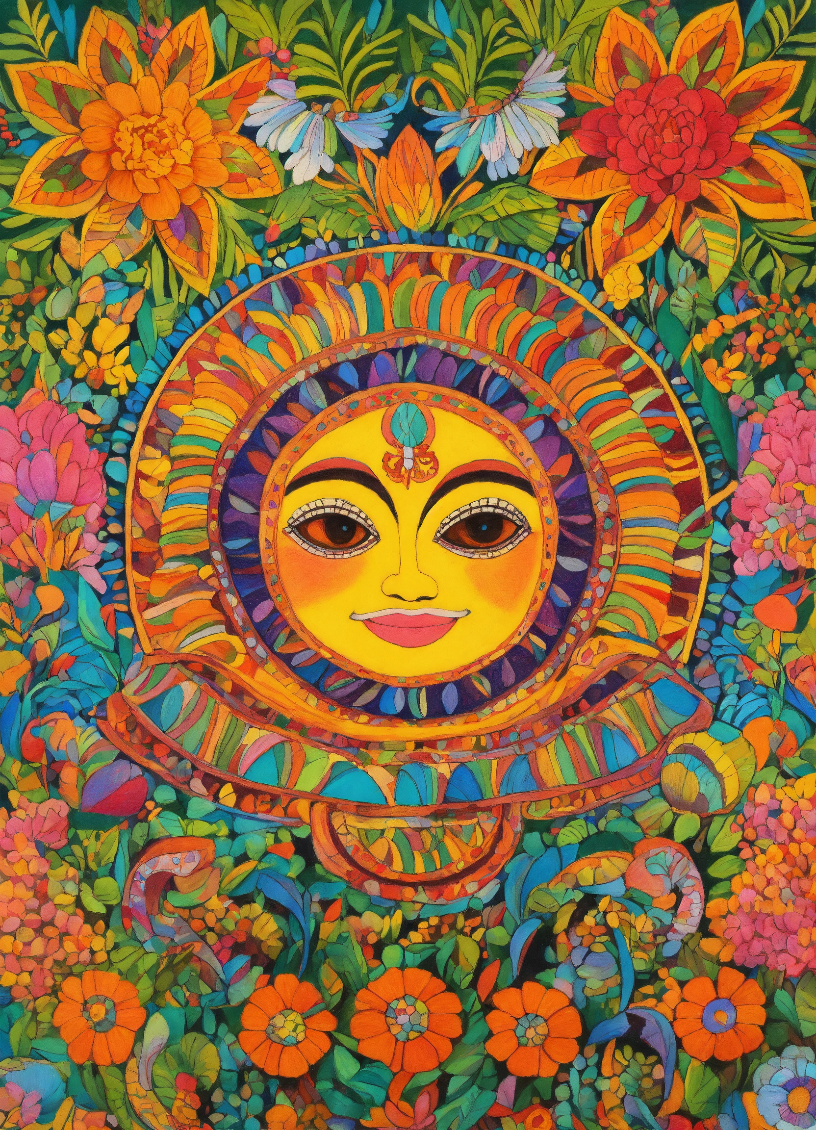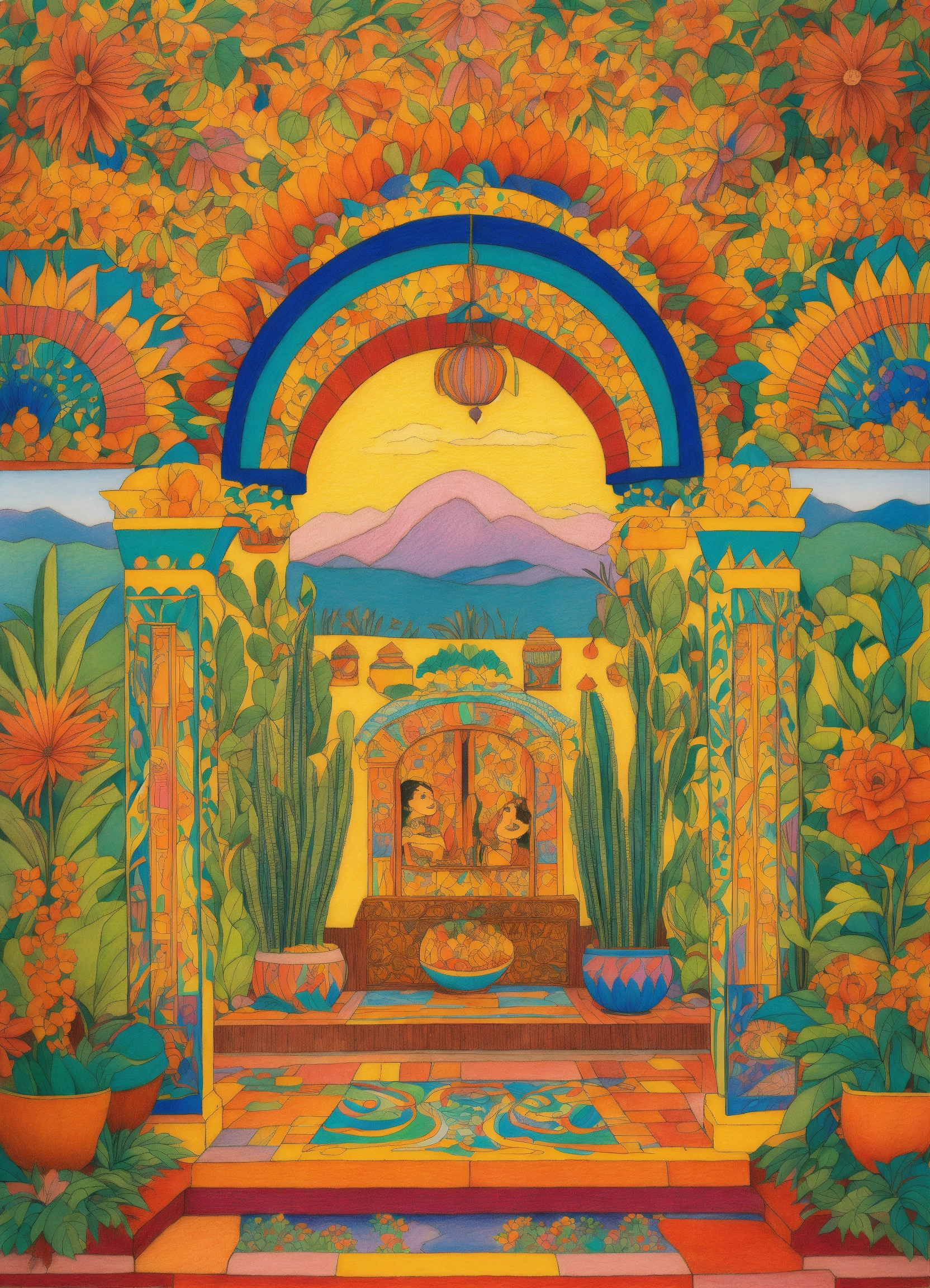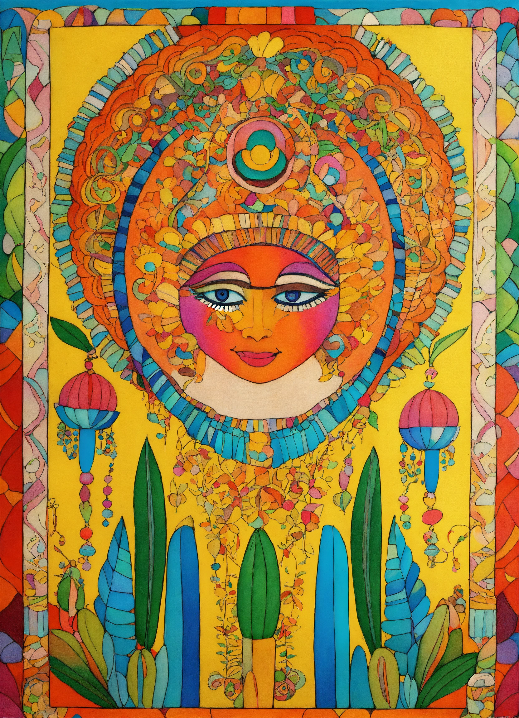 Mexican folk art art drawing the smiling spirit of nature. crystal clear, line drawing, clean clear lines, coloring book style, bright colors, intricate details, brazilian patterns elements, elegant, magical, serene, fine details, pastel pencils, winsor mccay style