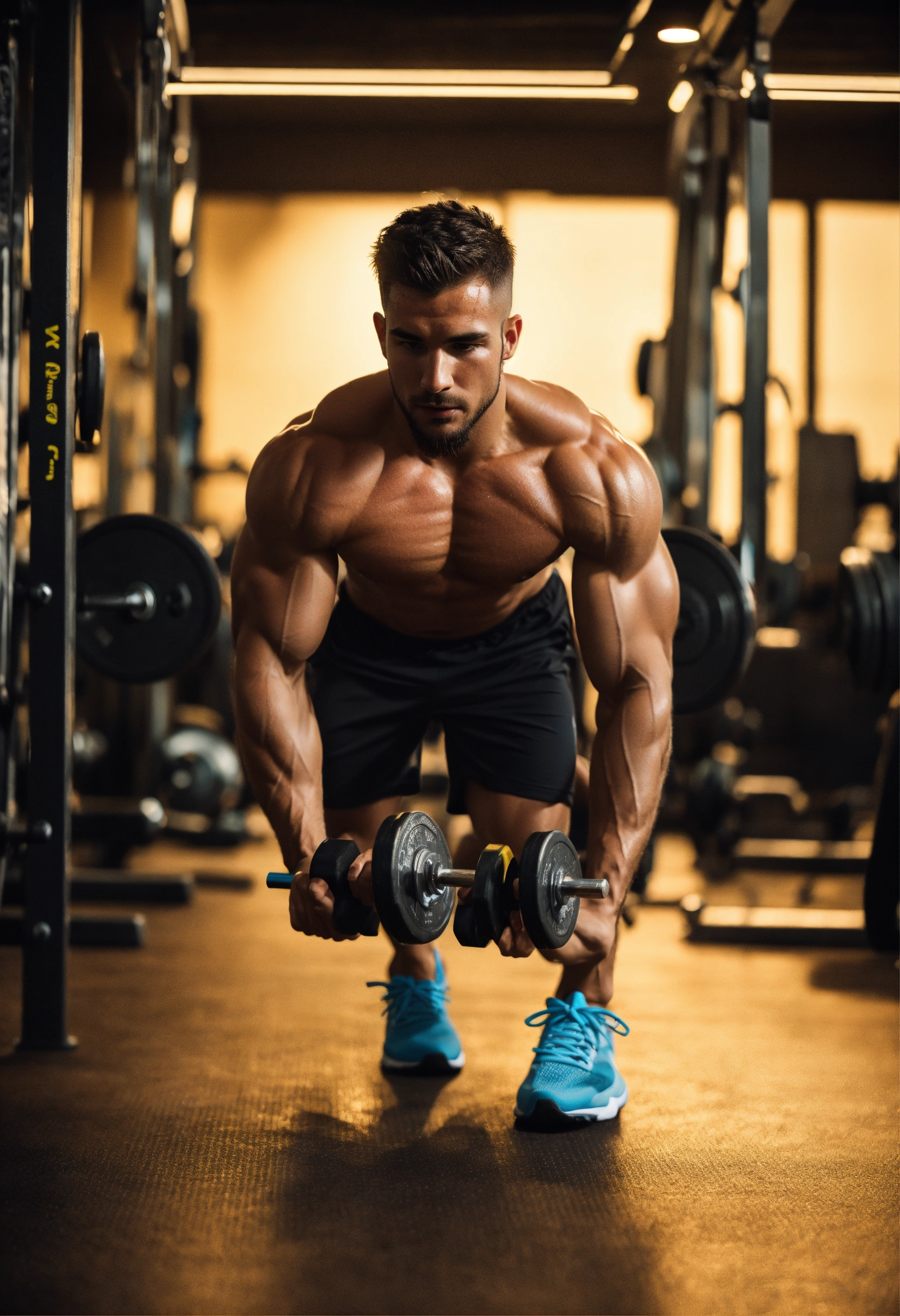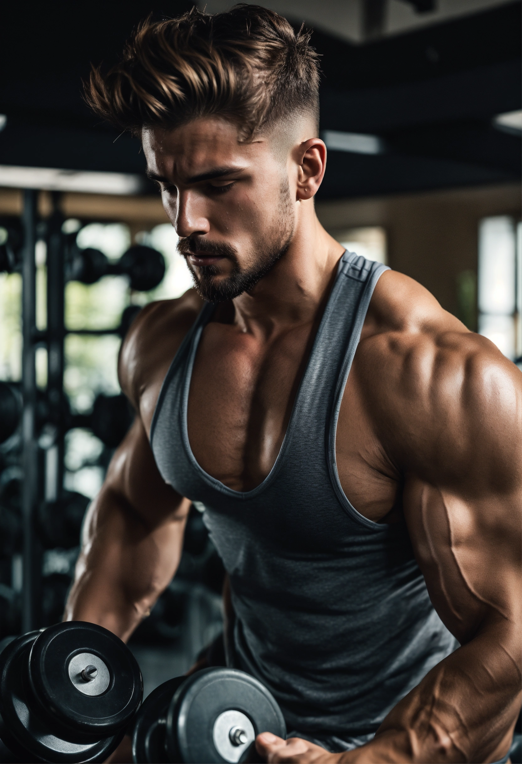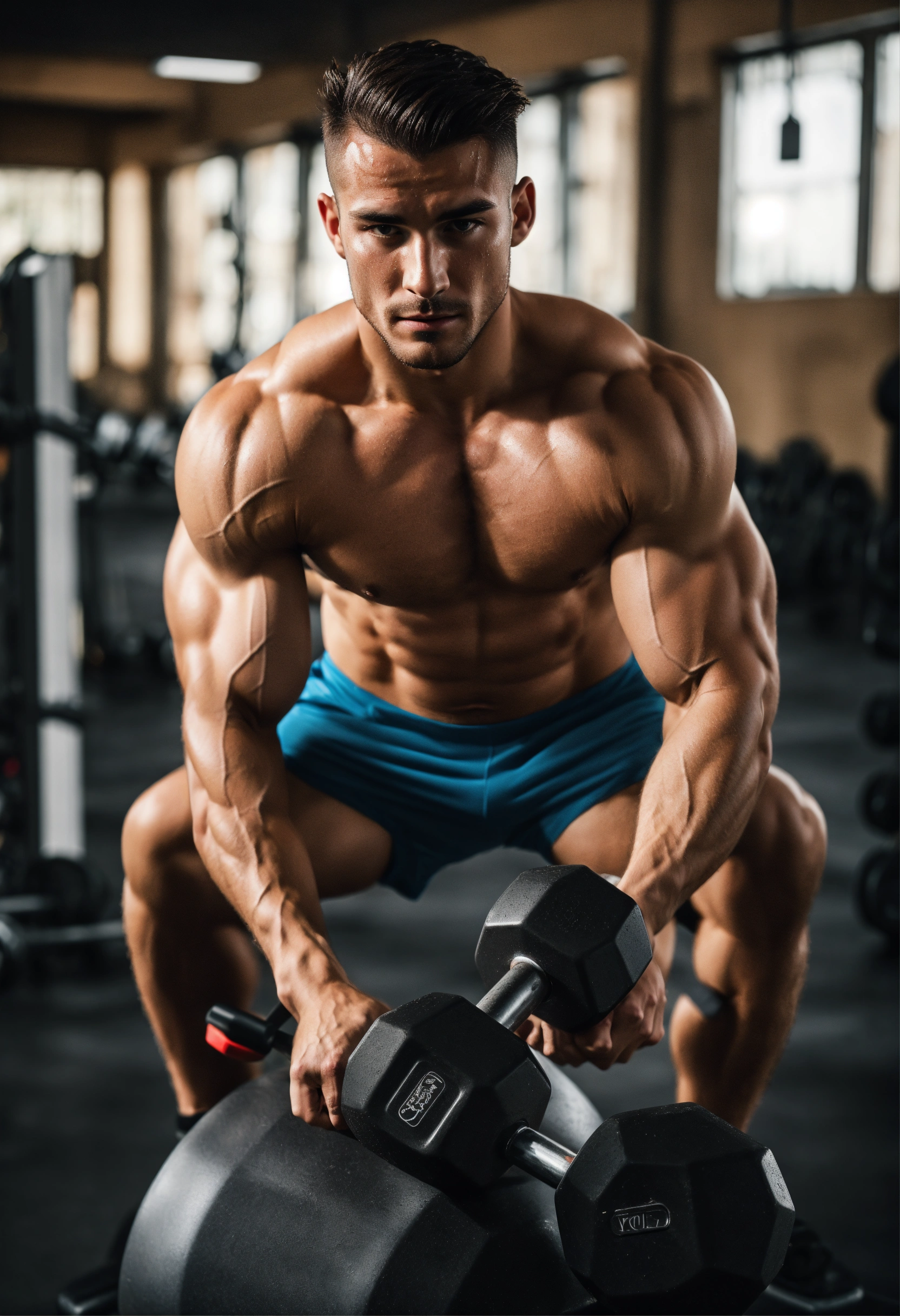 A beautiful man with an amazing body is working out, he is sweaty, the working out equipment is old school