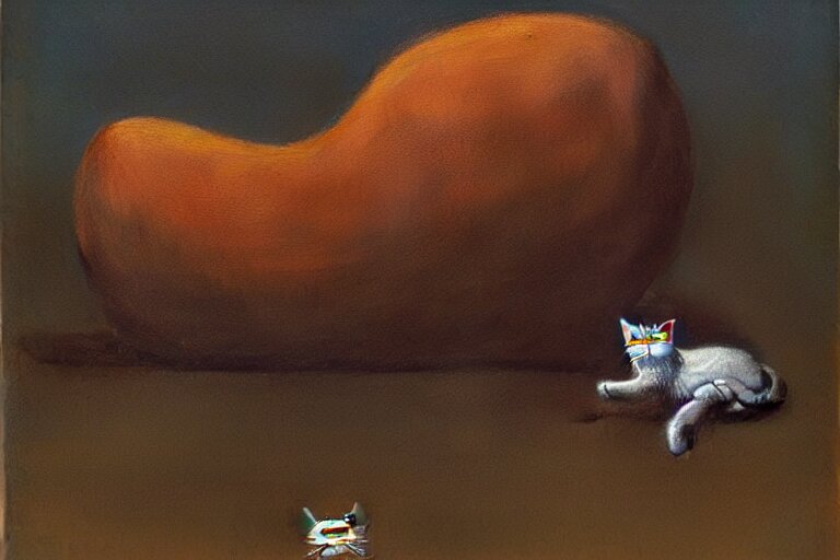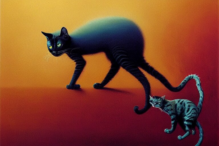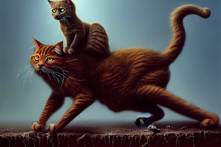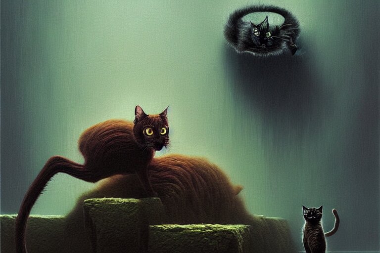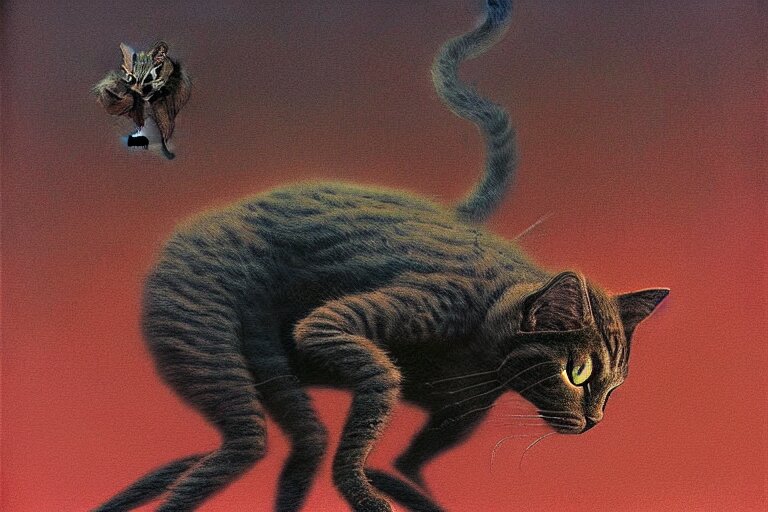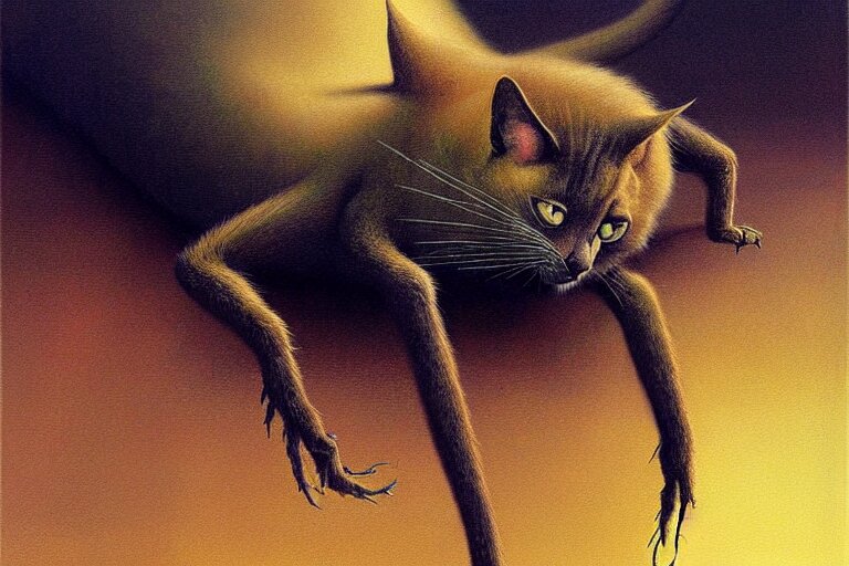 Painting of hybrid spider!!! & cat, intercrossed animal, by zdzislaw beksinski, by lewis jones, cold hue's, warm tone gradient background, concept art, beautiful composition, digital painting