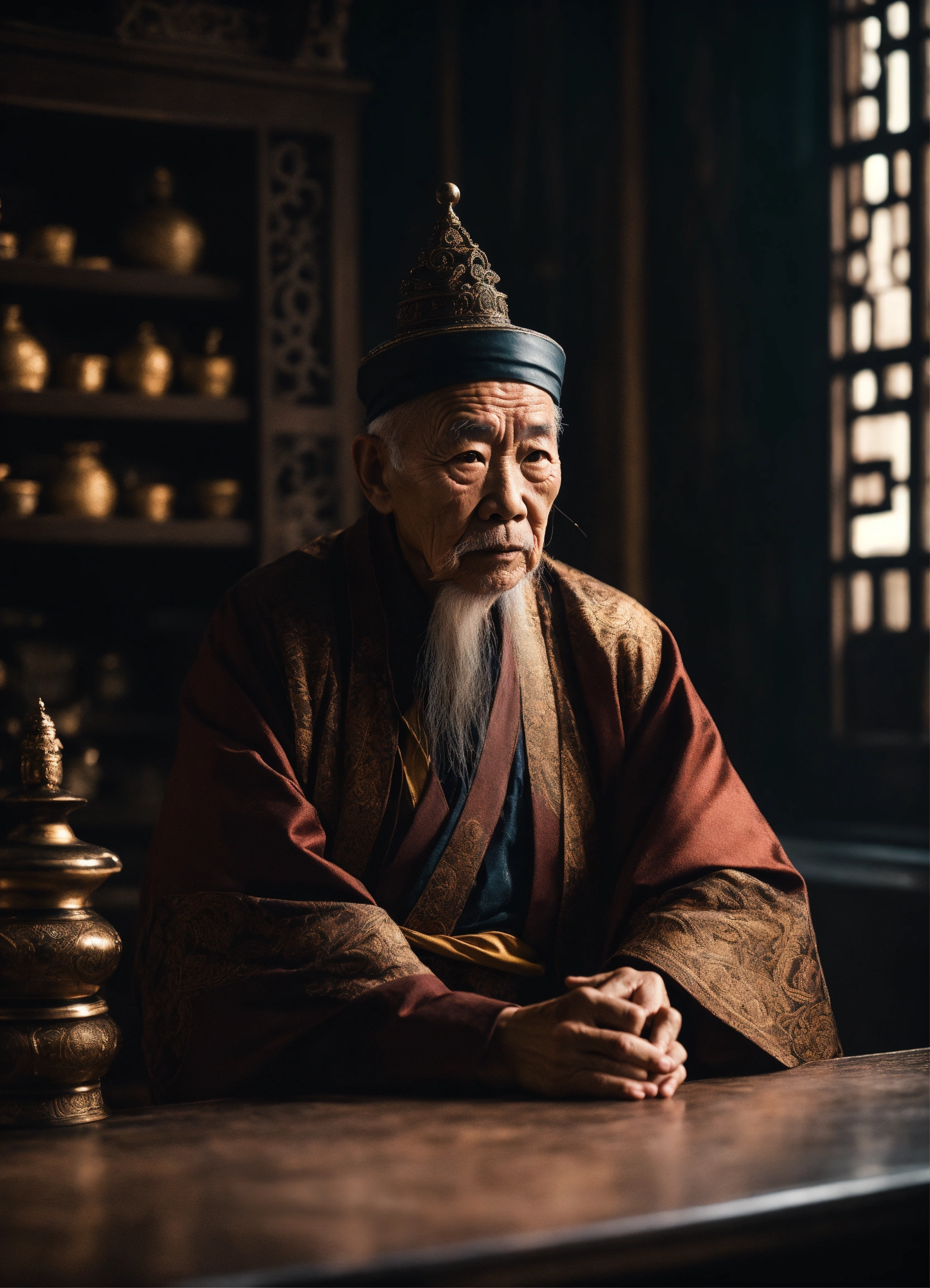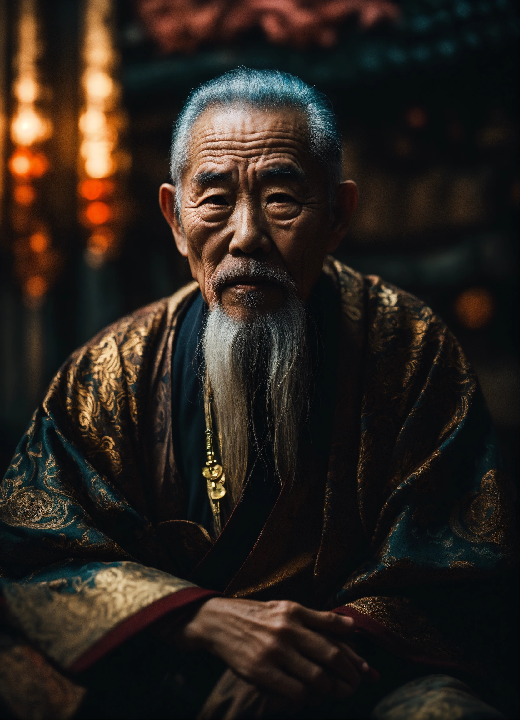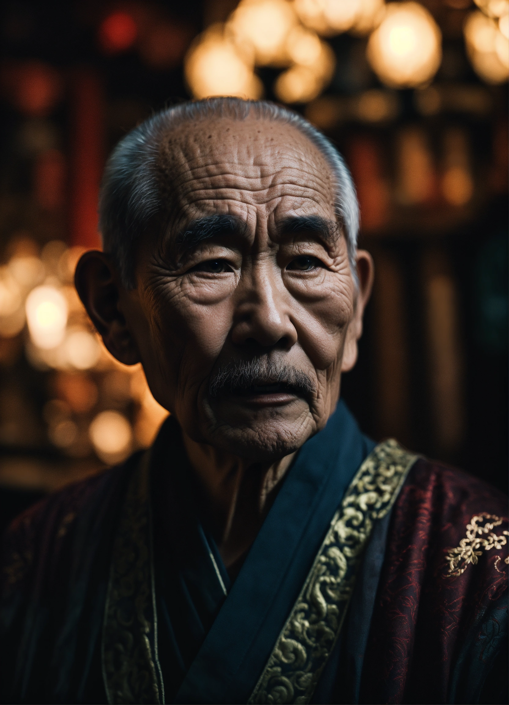 Wise old asian man, intricate, sharp focus, fantasy, cinematic lighting, other worldy, surreal 8k photo, dark moody aesthetic