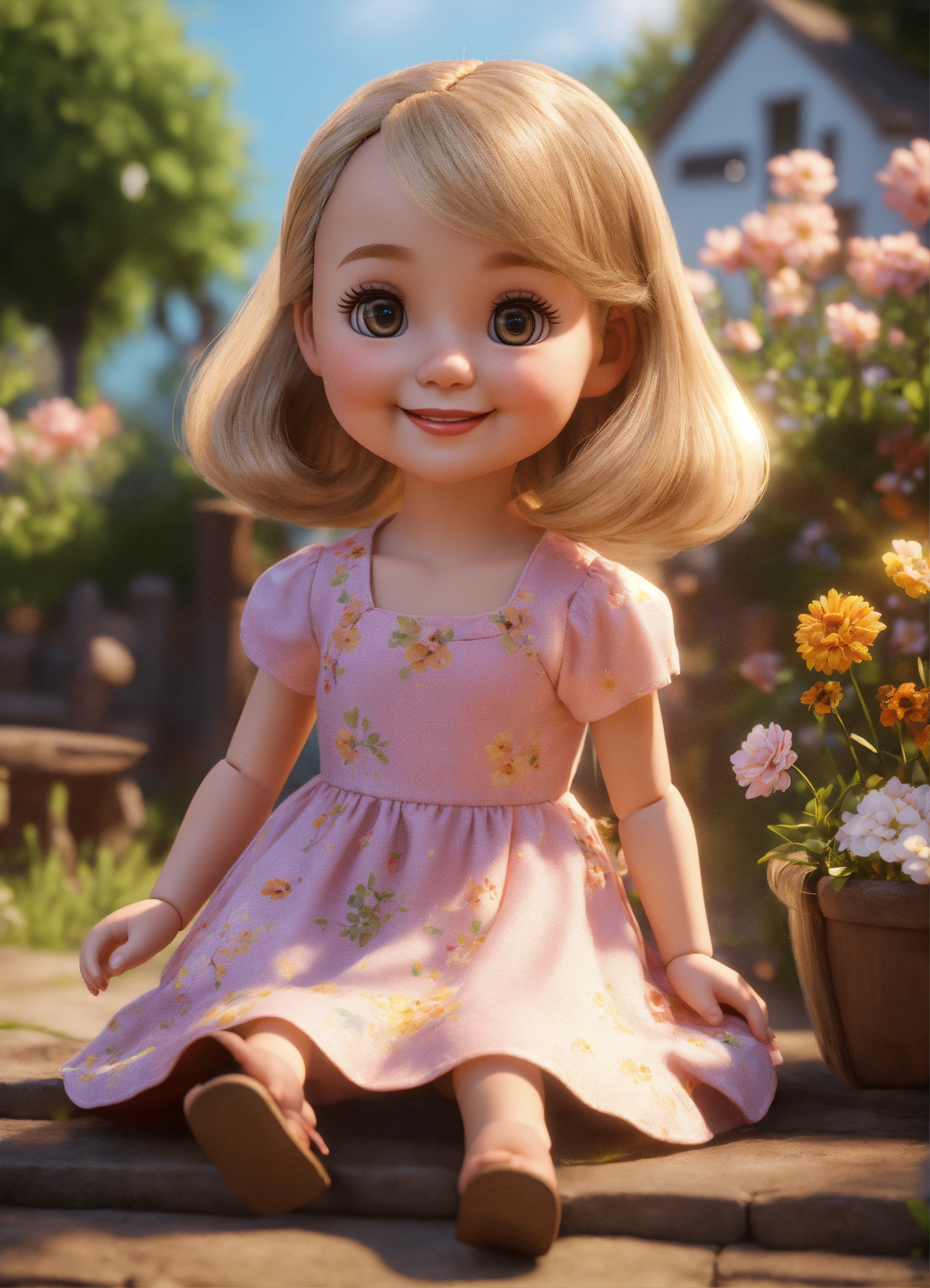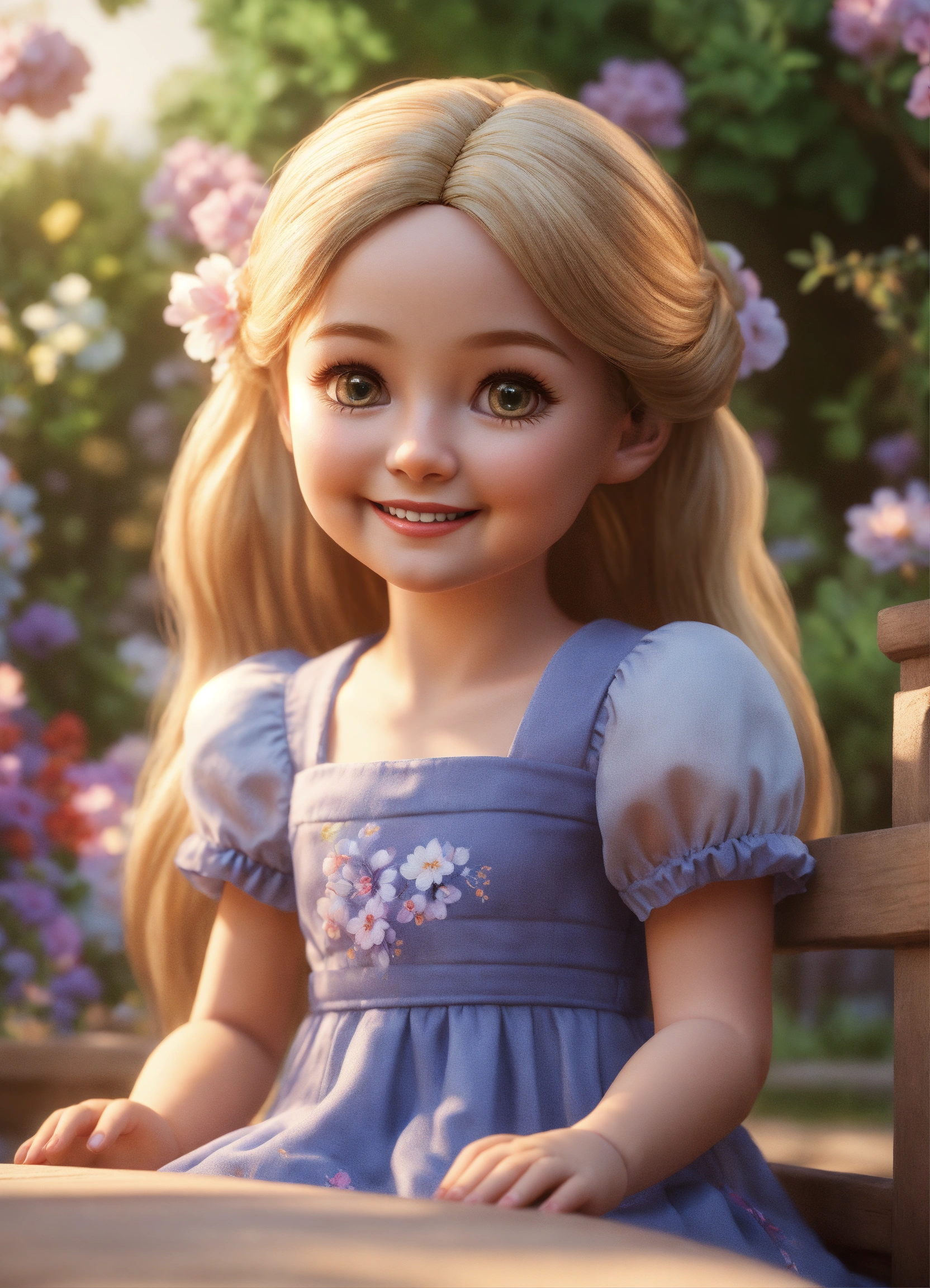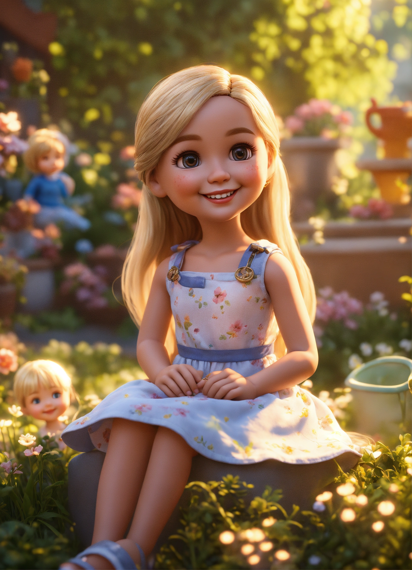 Cute adorable doll style tiny girl smiling greeting me, long blond hair, she wears a summer dress, unreal engine, she is seated, outdoor garden lighting, art station, detailed digital painting, cinematic, character design by pixar, unreal 5, daz, hyper realistic.