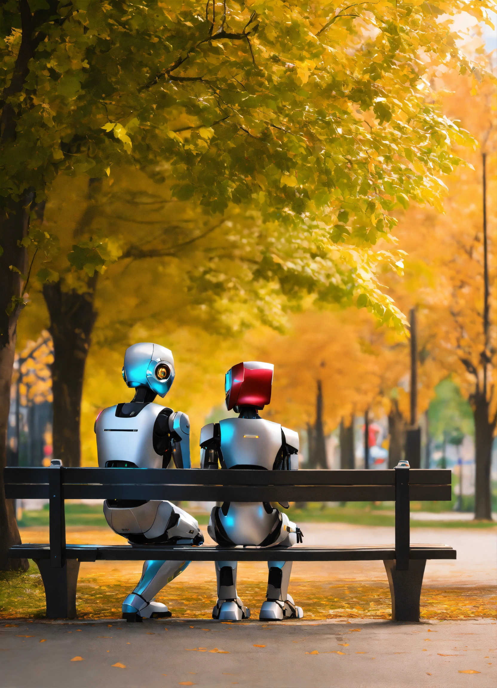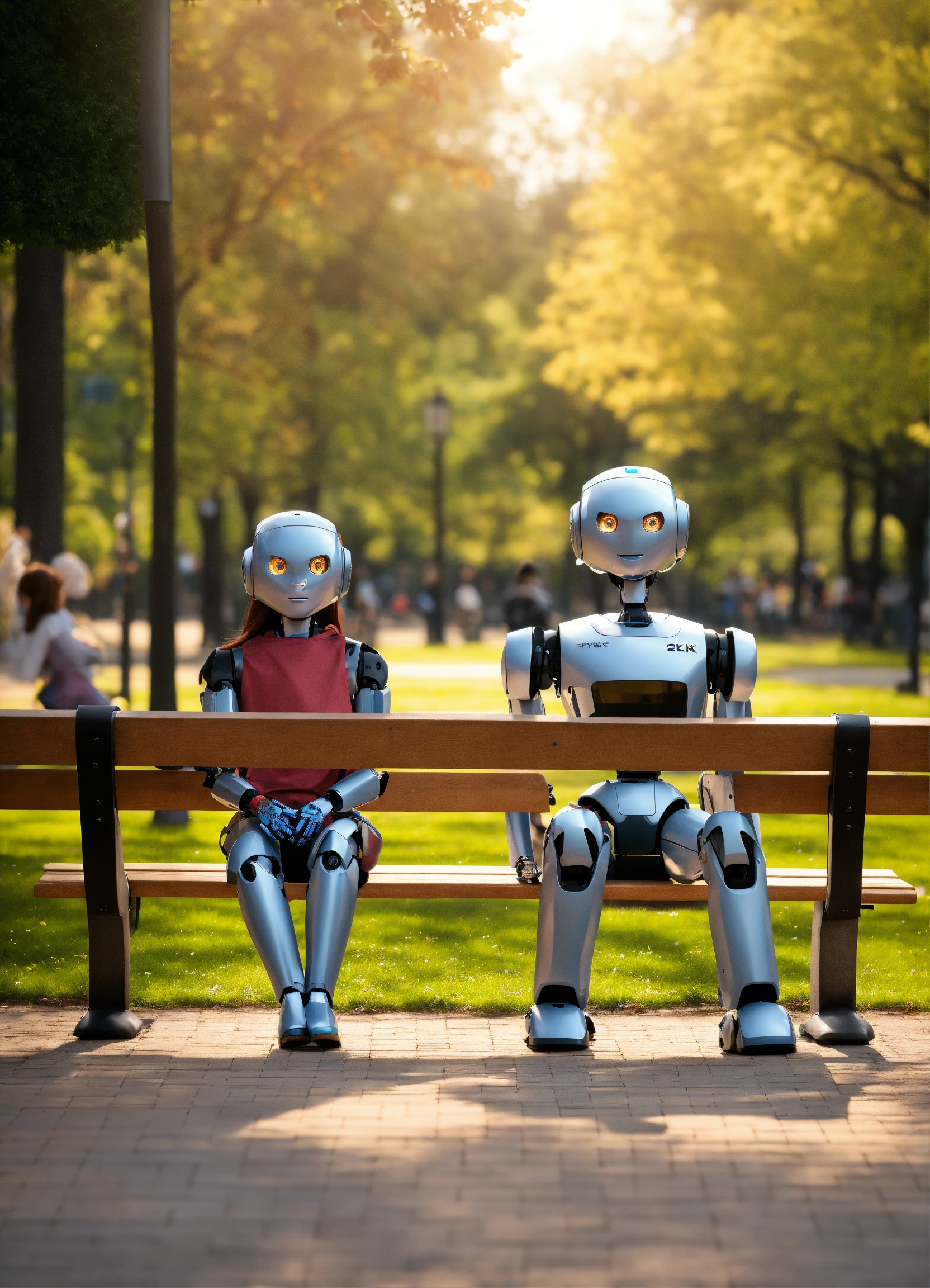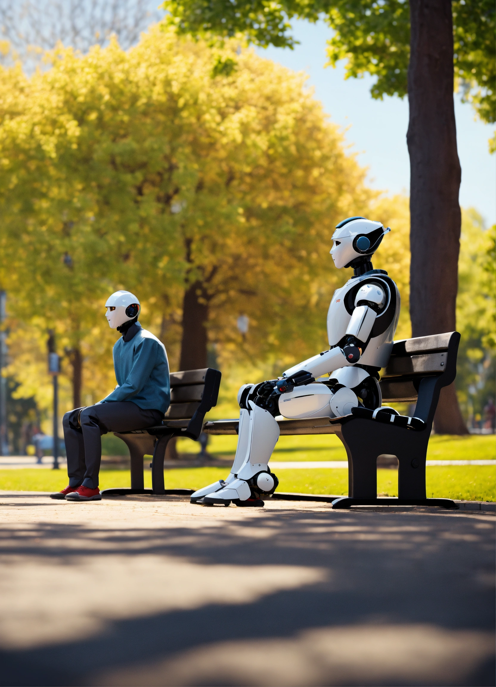 Generate a hyper-realistic image in 4k resolution that portrays a humanoid robot sat at park bench with 2 humans seated at the same bench, chatting happily. they are three on the bench the robot and two humans, chasing to each other.