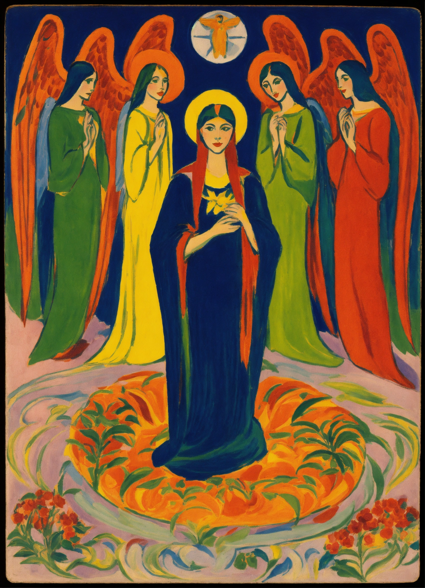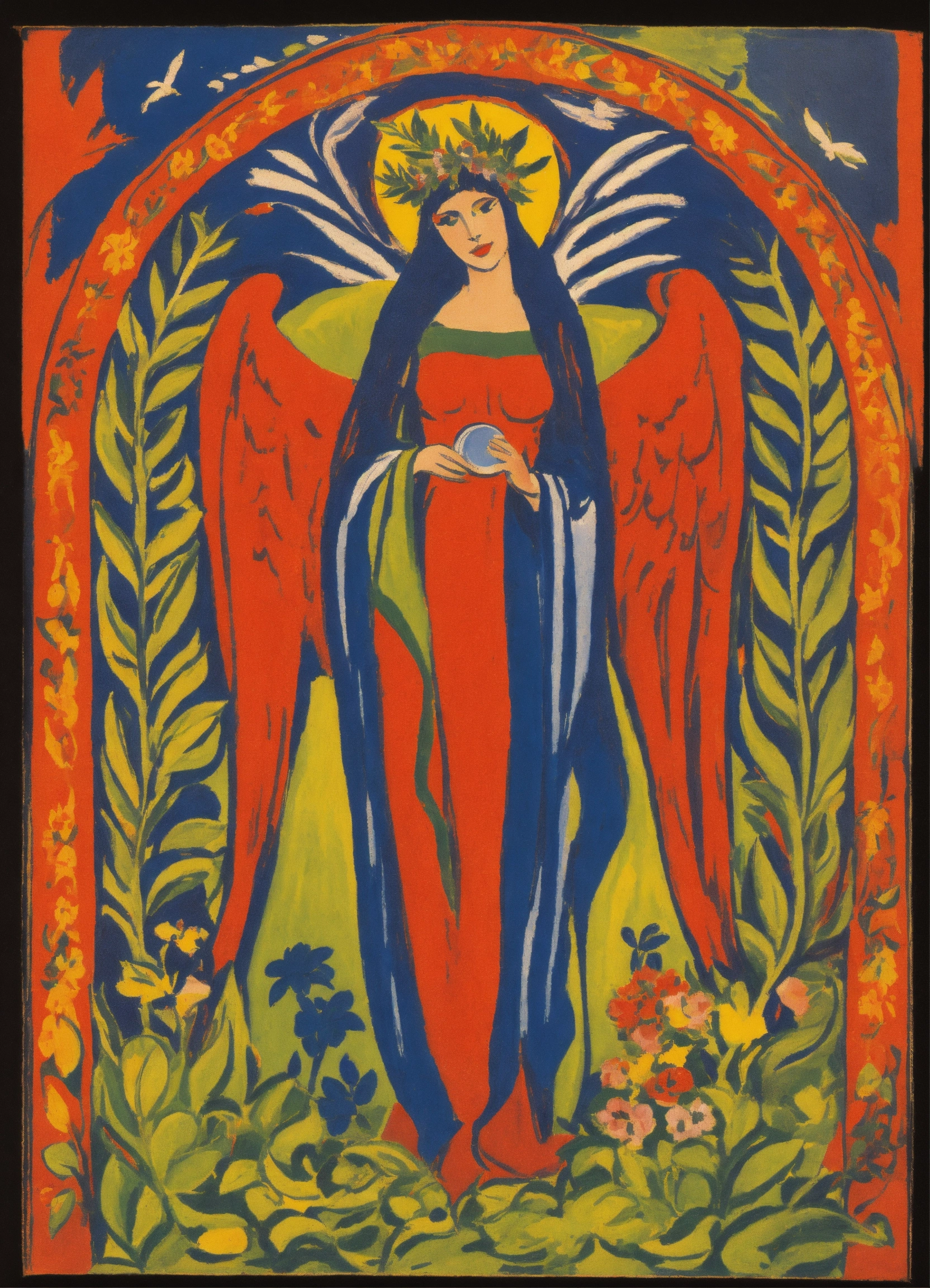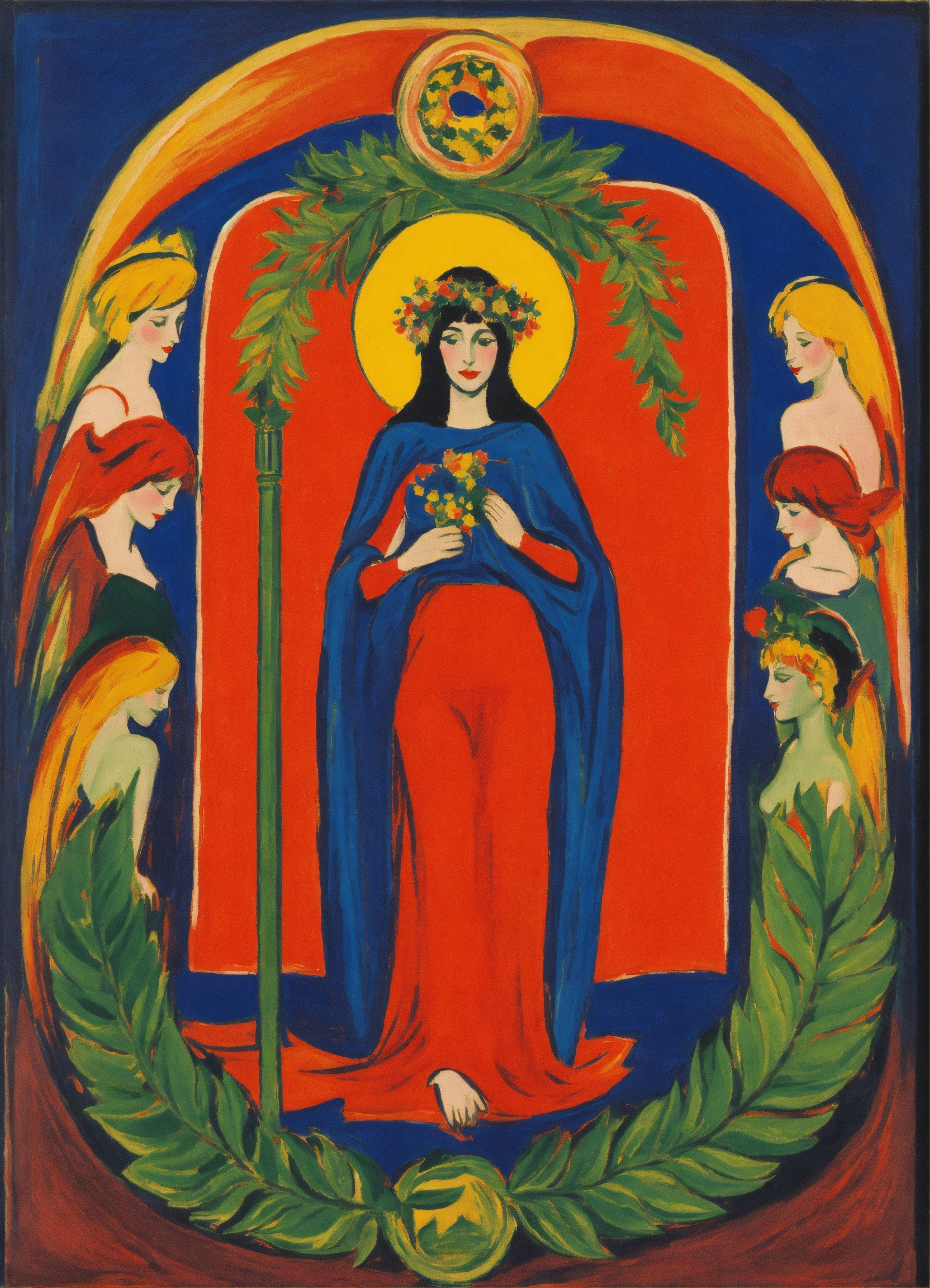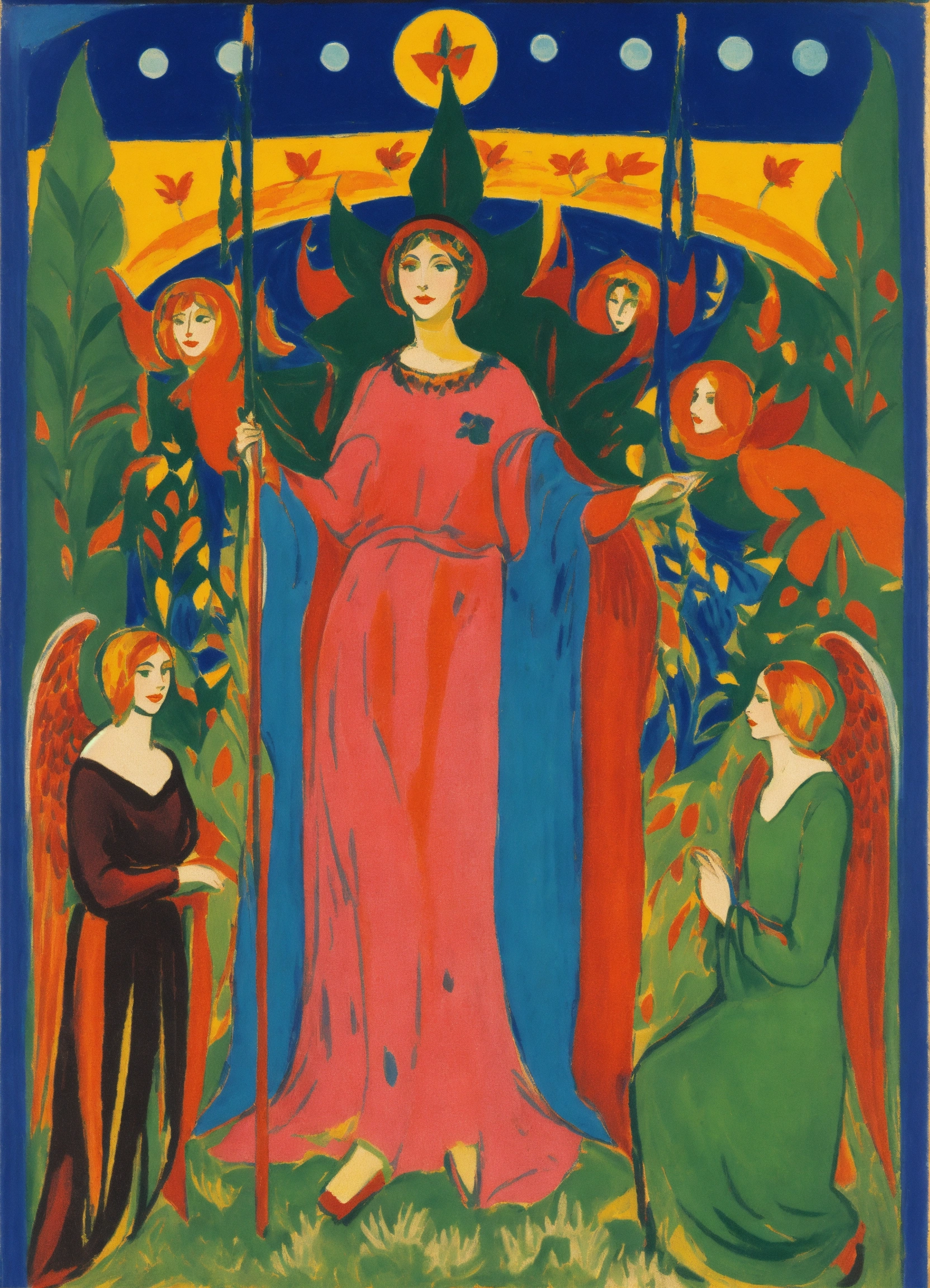 Ernst ludwig kirchner peinture, representation of the tarot card, the world, a woman surrounded in a laurel wreath, angels around