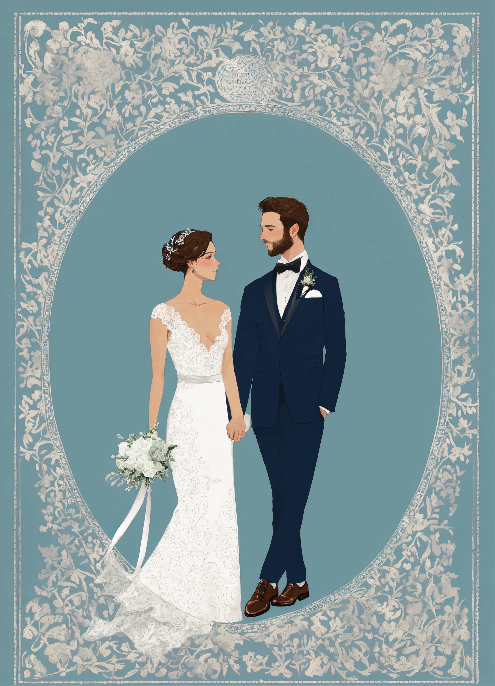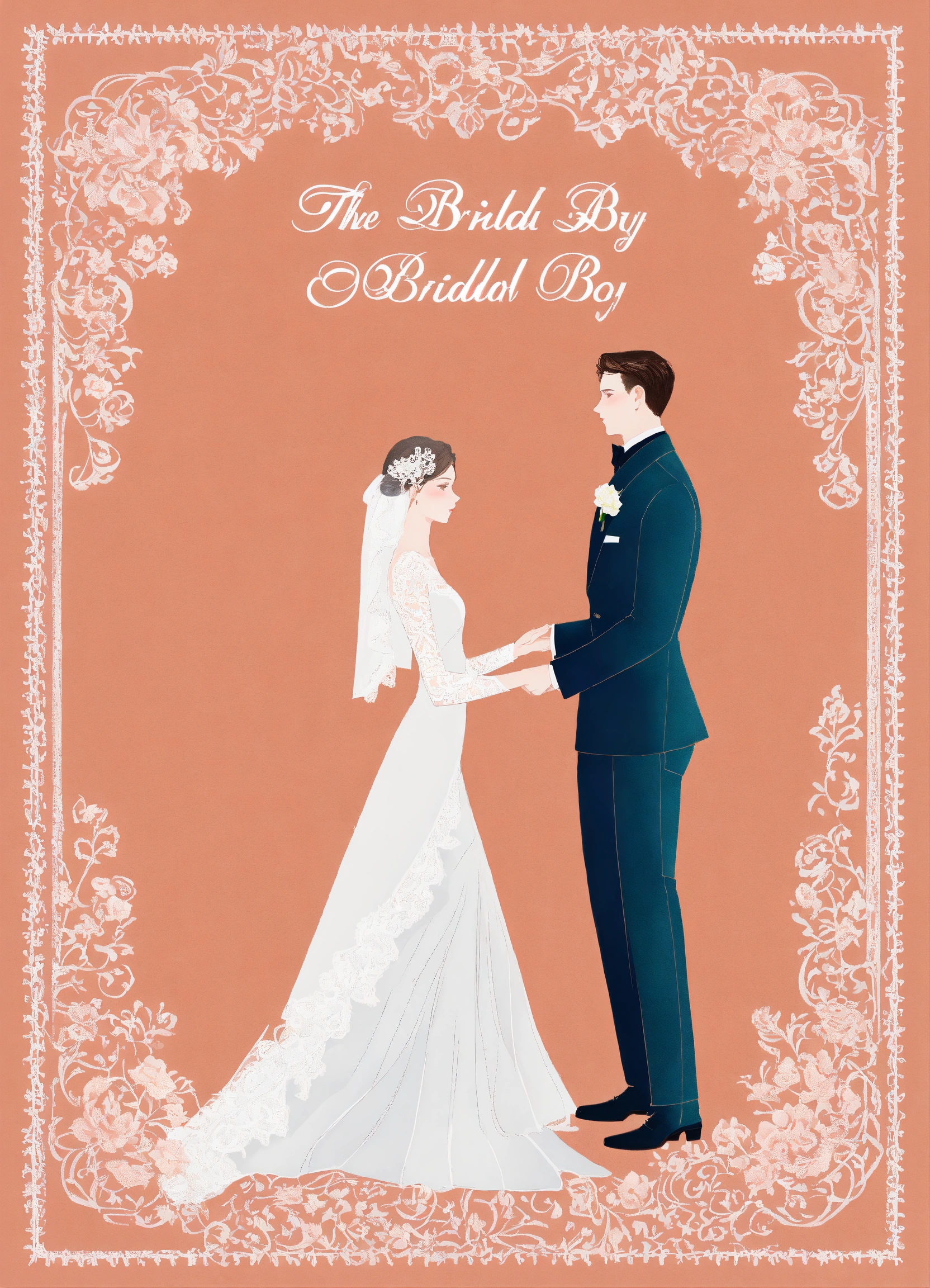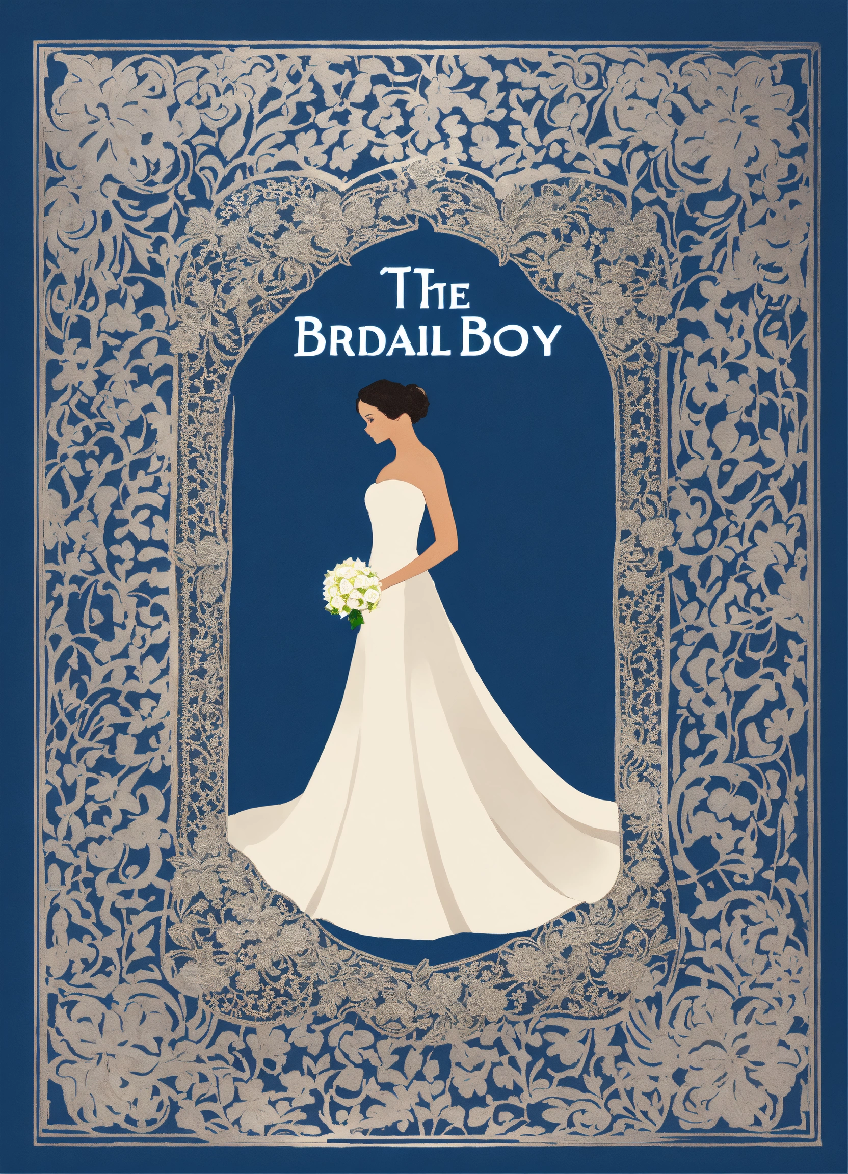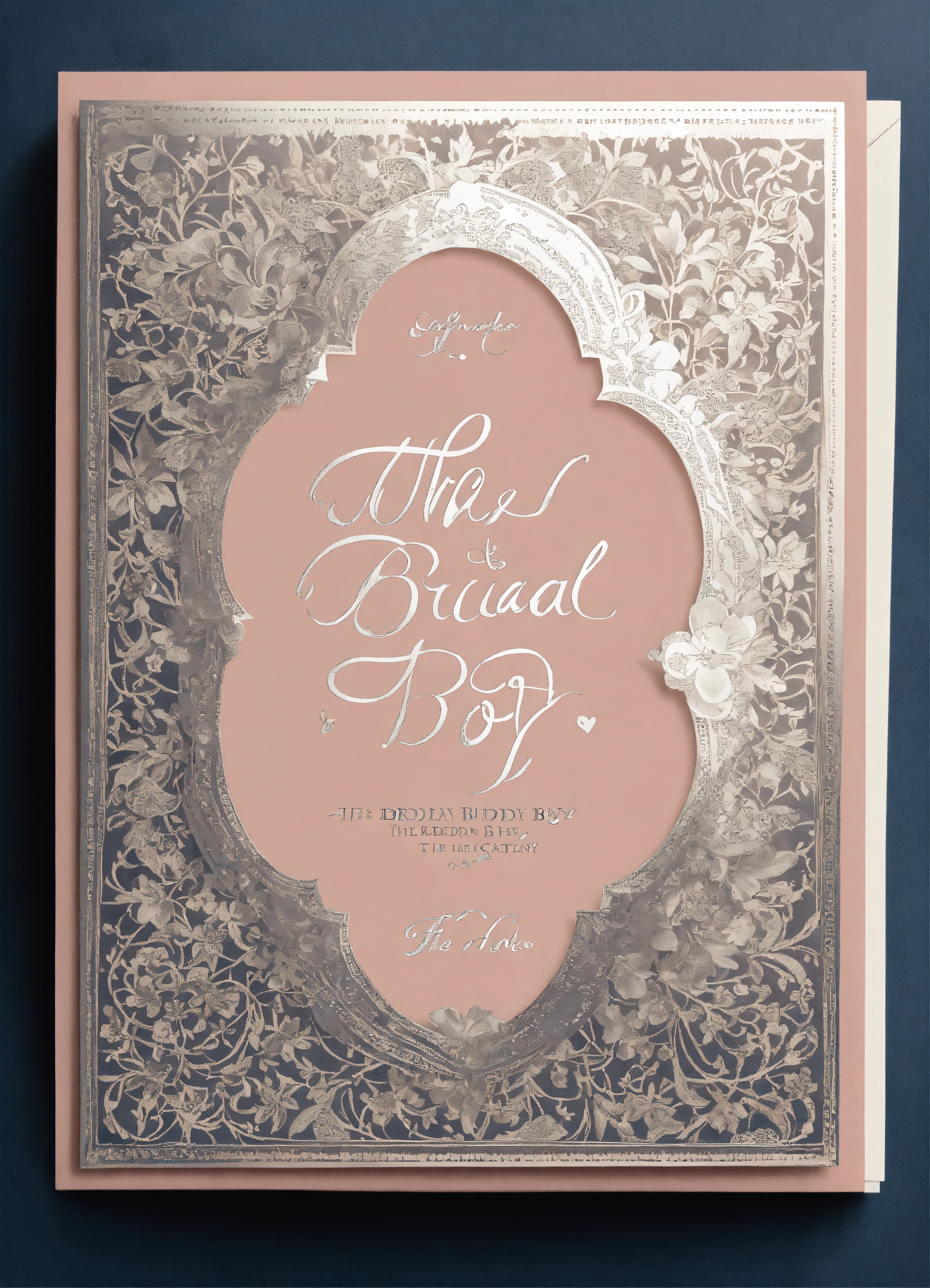 Illustration of a sophisticated wedding card, featuring the title 'the bridal boy' embossed in silver with intricate lace patterns bordering the edges.