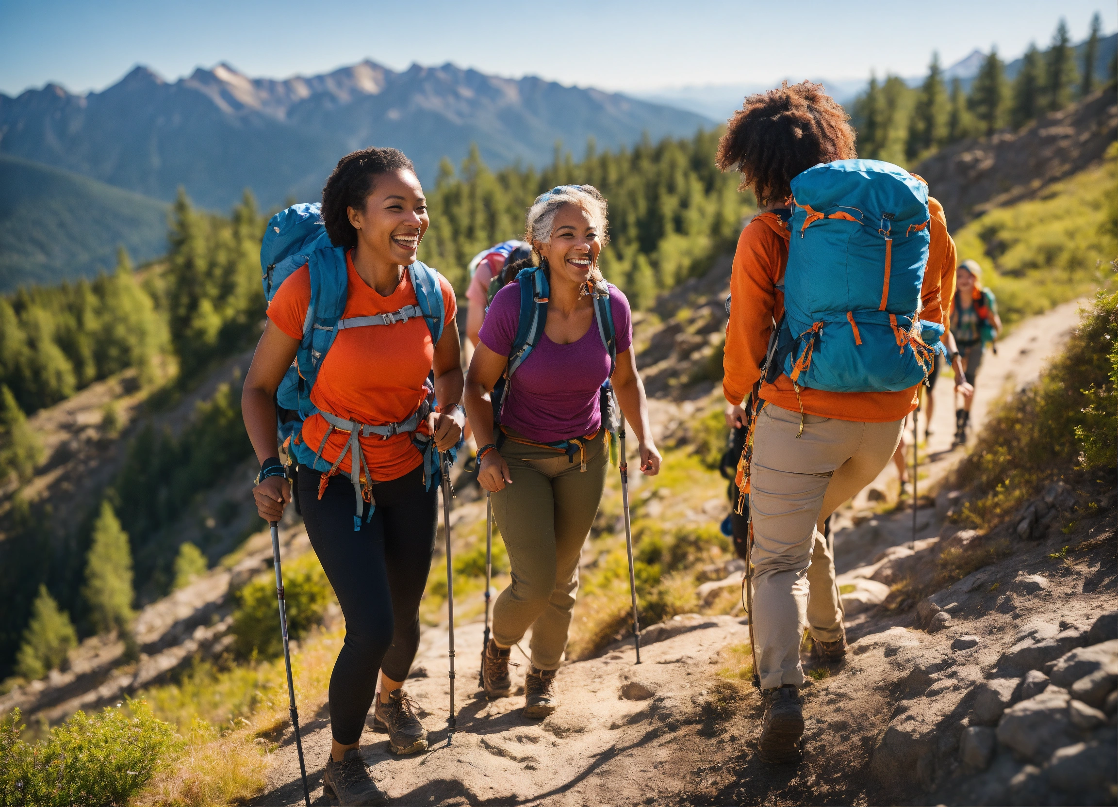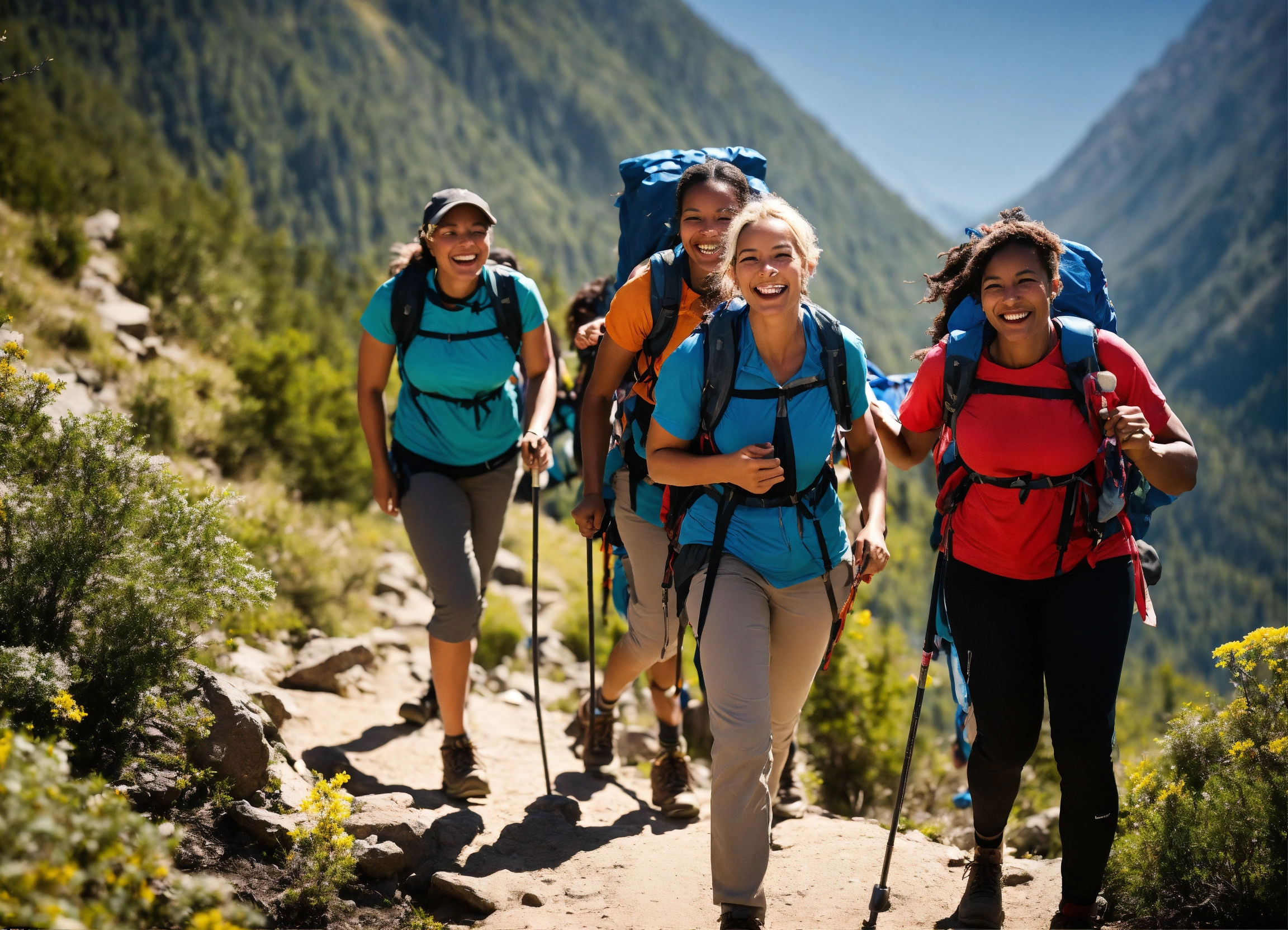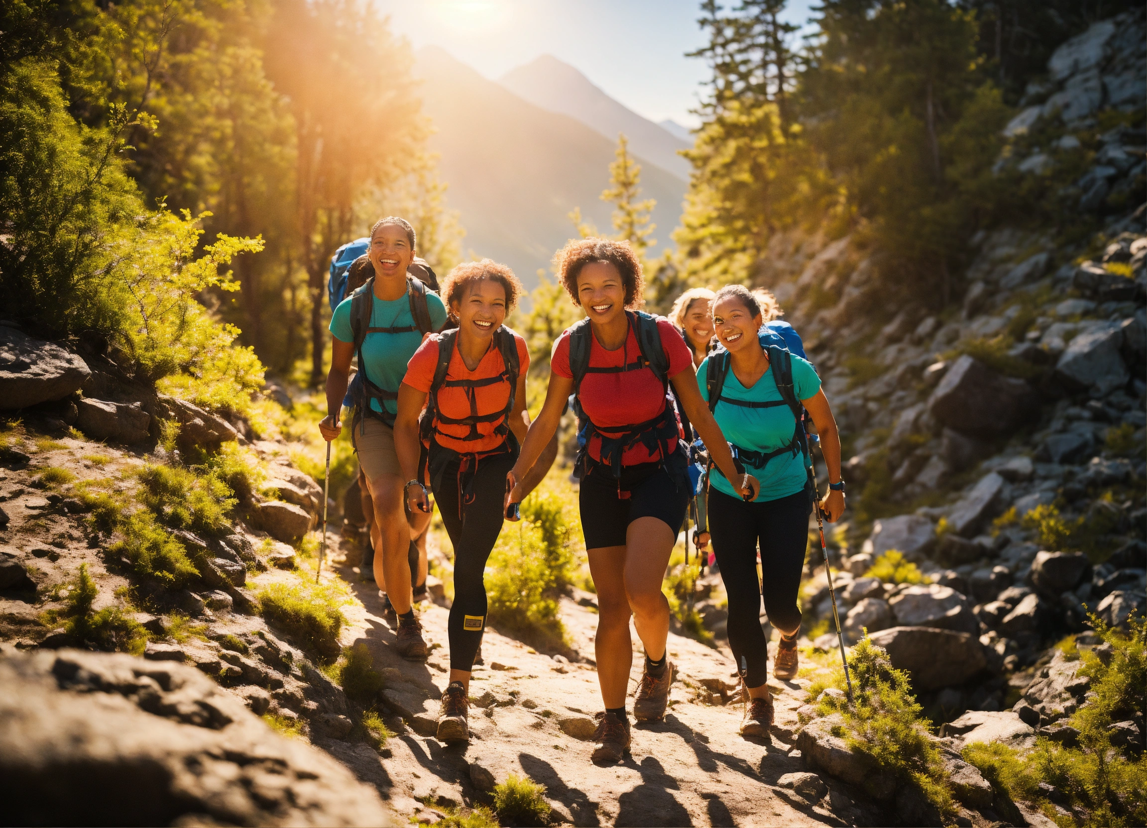 "a vibrant candid photo of a diverse group hiking up a mountain trail together. they smile and motivate each other, depicting hard work and teamwork on the sunny day. one woman reaches down to help a friend up. the photo captures the essence of community and perseverance."work.