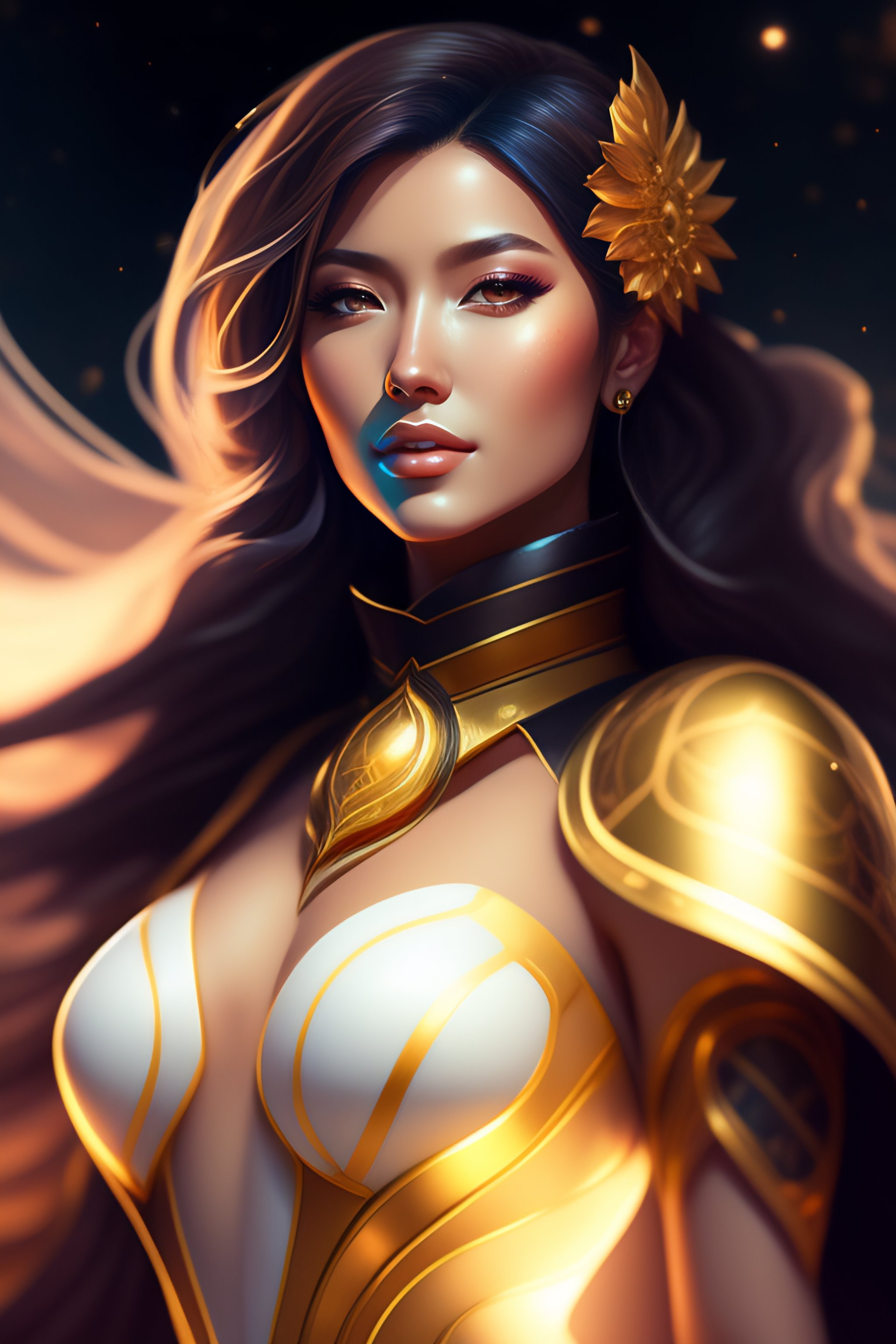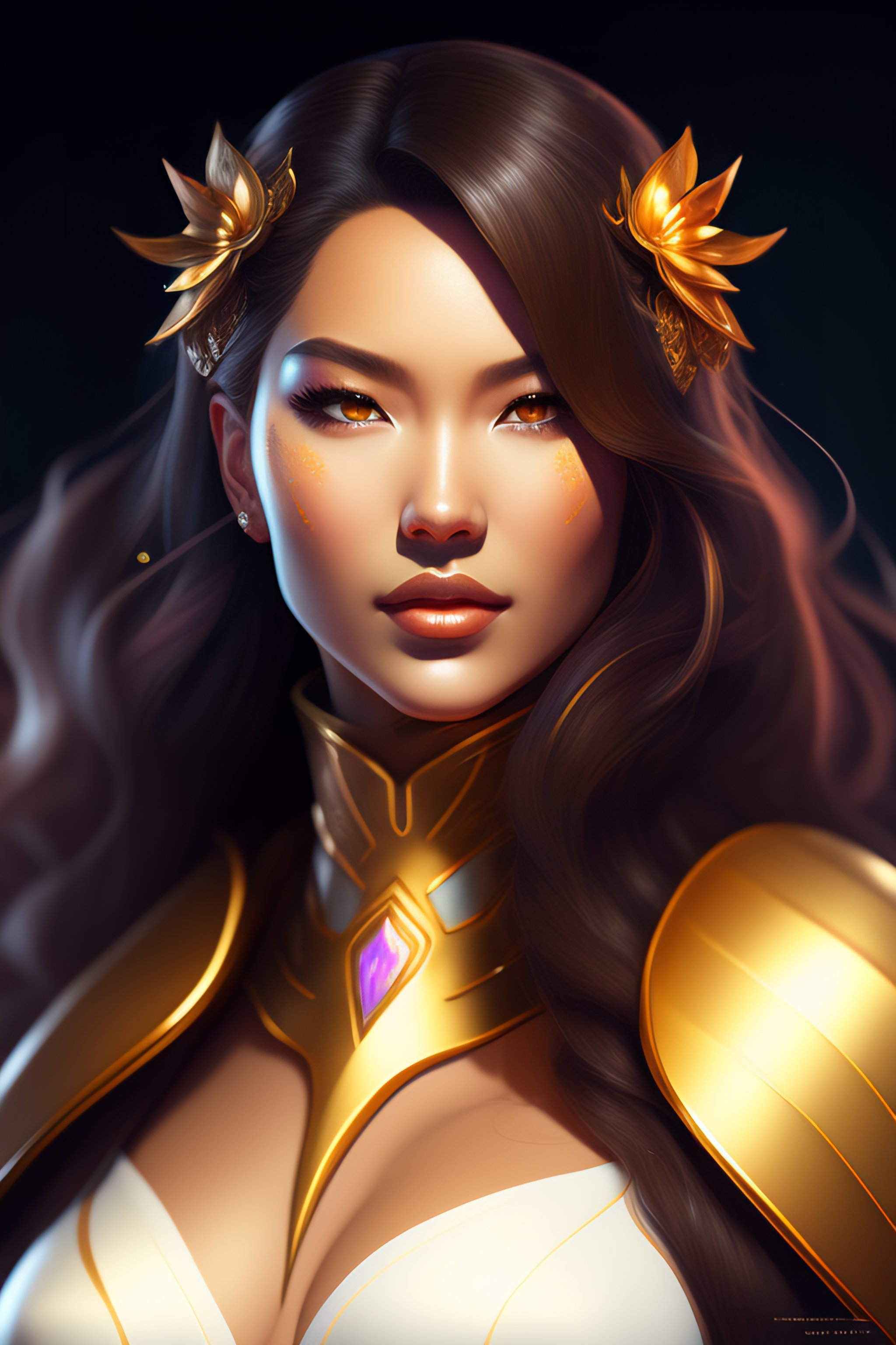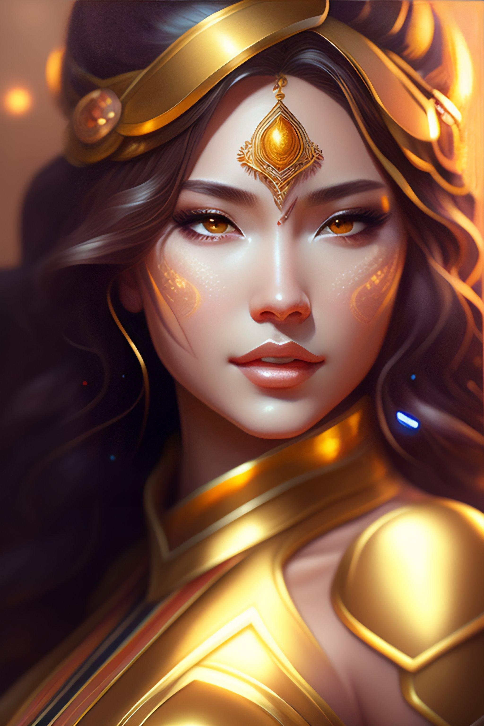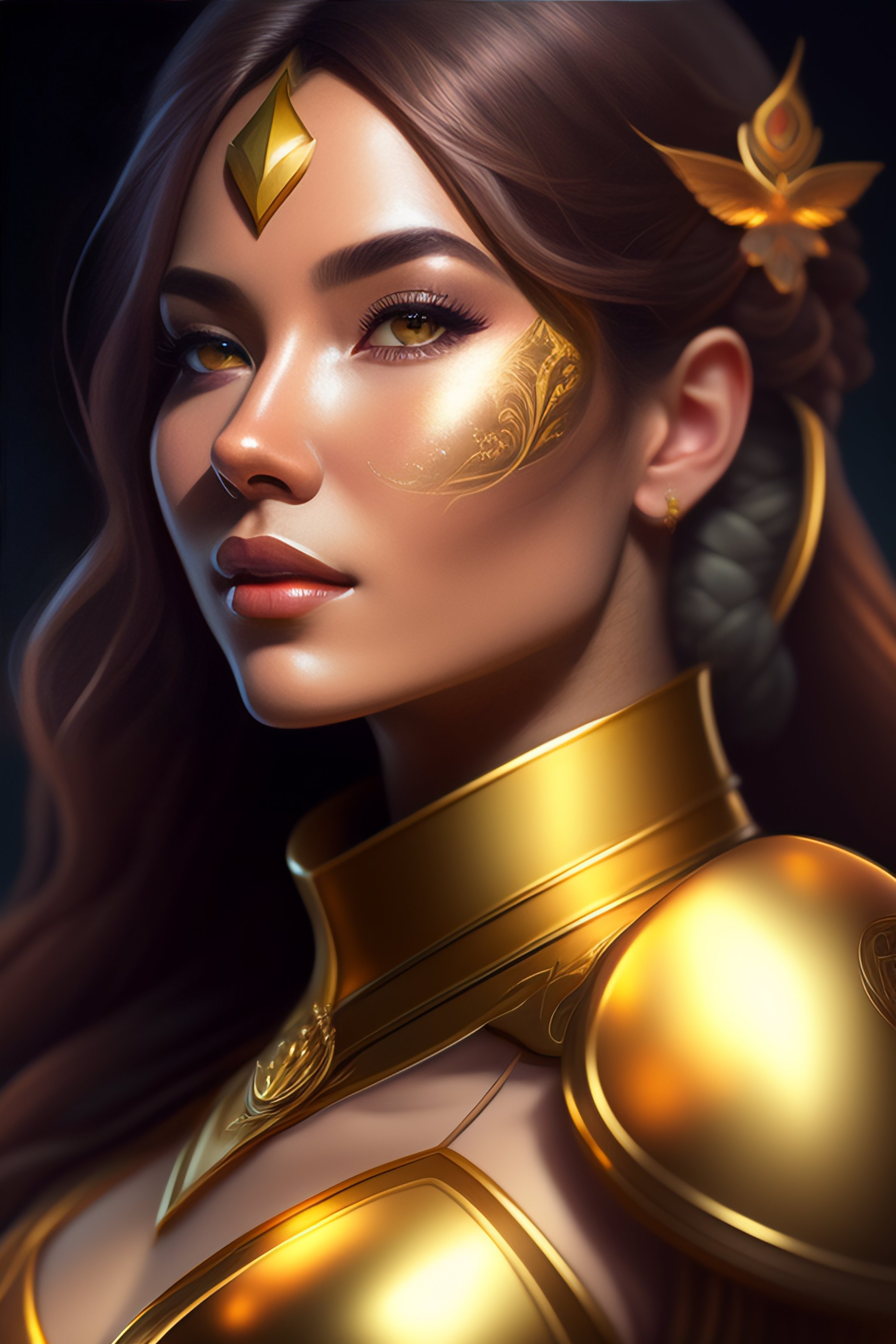 Mercy overwatch, beautiful portrait of a gorgeous princess, beautiful princess, round shaped face, round button nose, glowing glass skin, sparkling hazel green eyes, highlighted chestnut brown long straight hair, adorned in intricate golden jewelry, confident half smile, face painting, dramatic lighting, intricate, wild, exotic beauty, highly detailed, digital painting, artstation, concept art, smooth, sharp focus, illustration, art by artgerm and greg rutkowski and alphonse mucha, footage from space camera