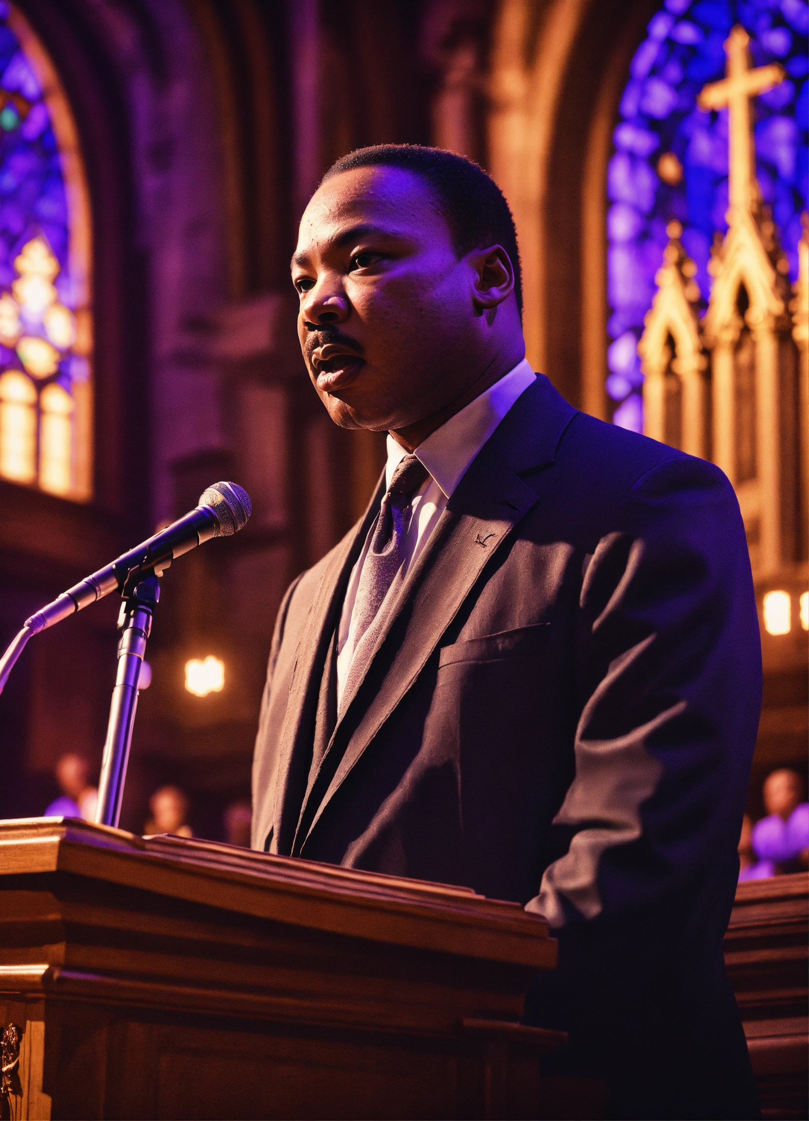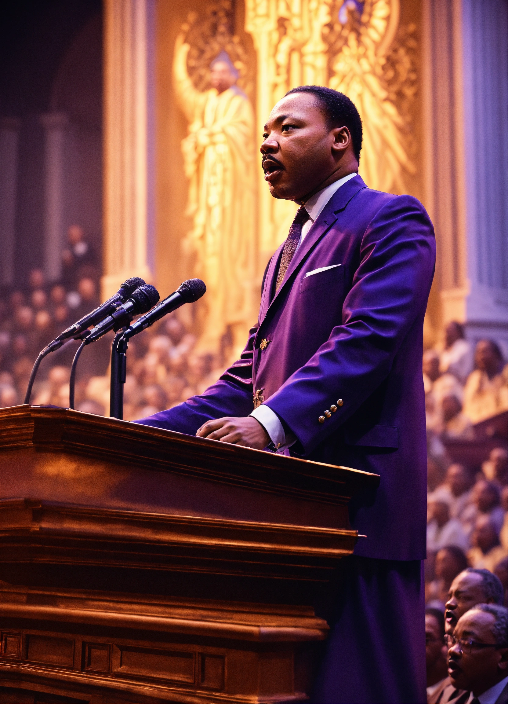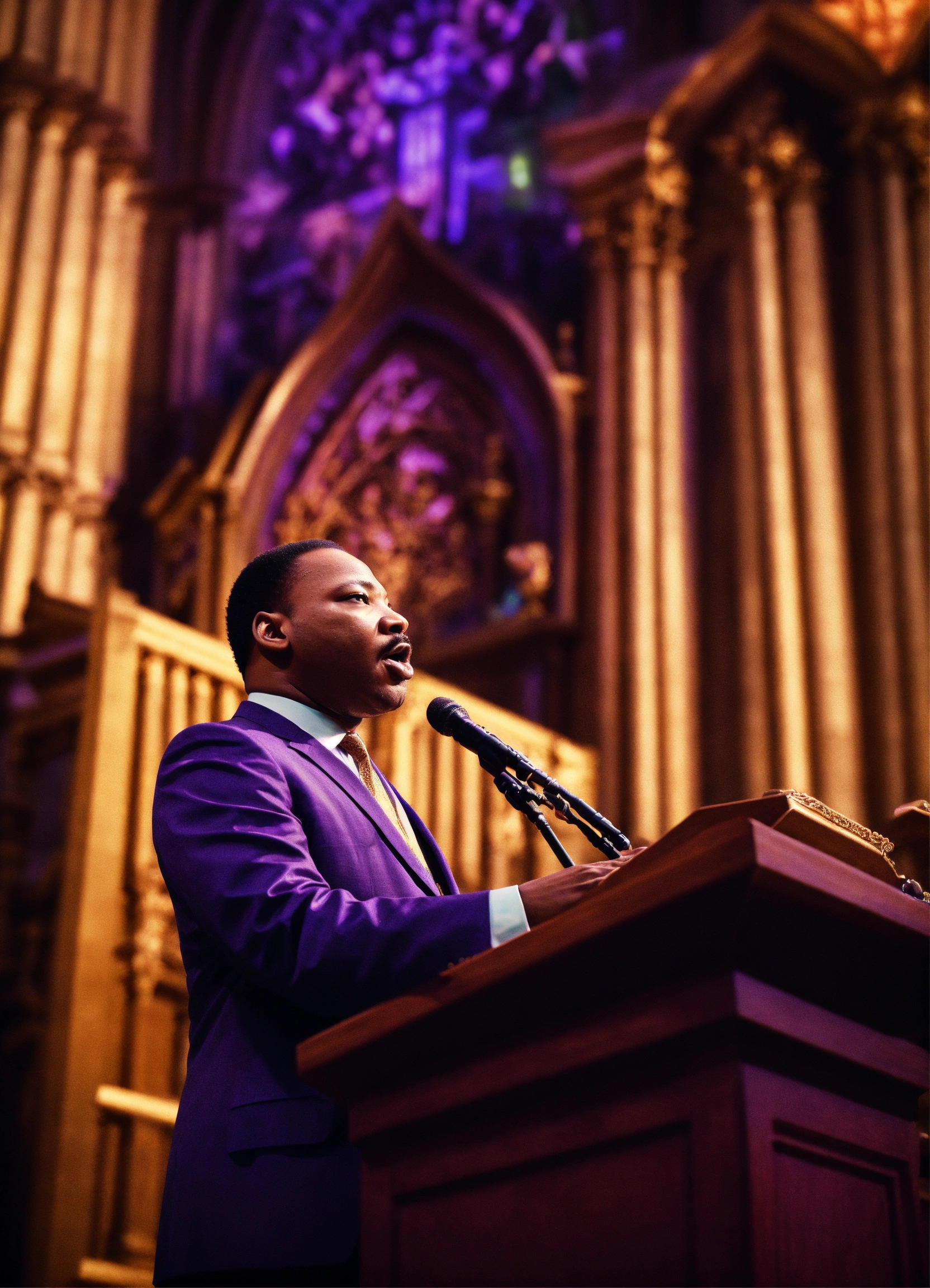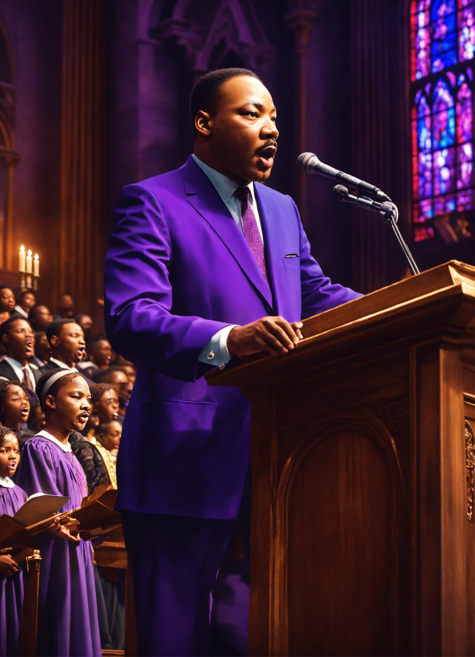 Martin luther king preaching in pulpit, 8k octane detailed render, post-processing, extremely hyper detailed, intricate, epic composition, cinematic lighting + masterpiece, very detailed, masterpiece, volumetric, chiaroscuro, matte textured, choir in background, purple and gold church decor