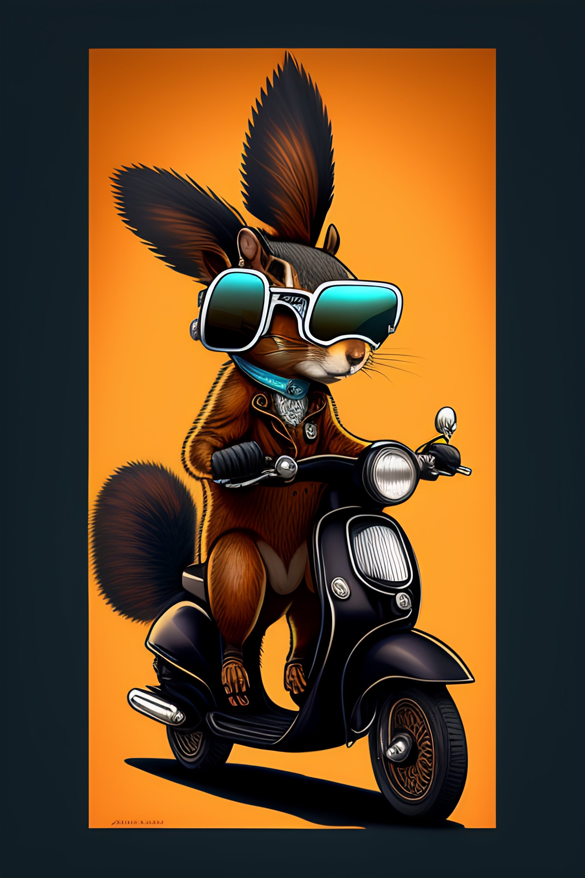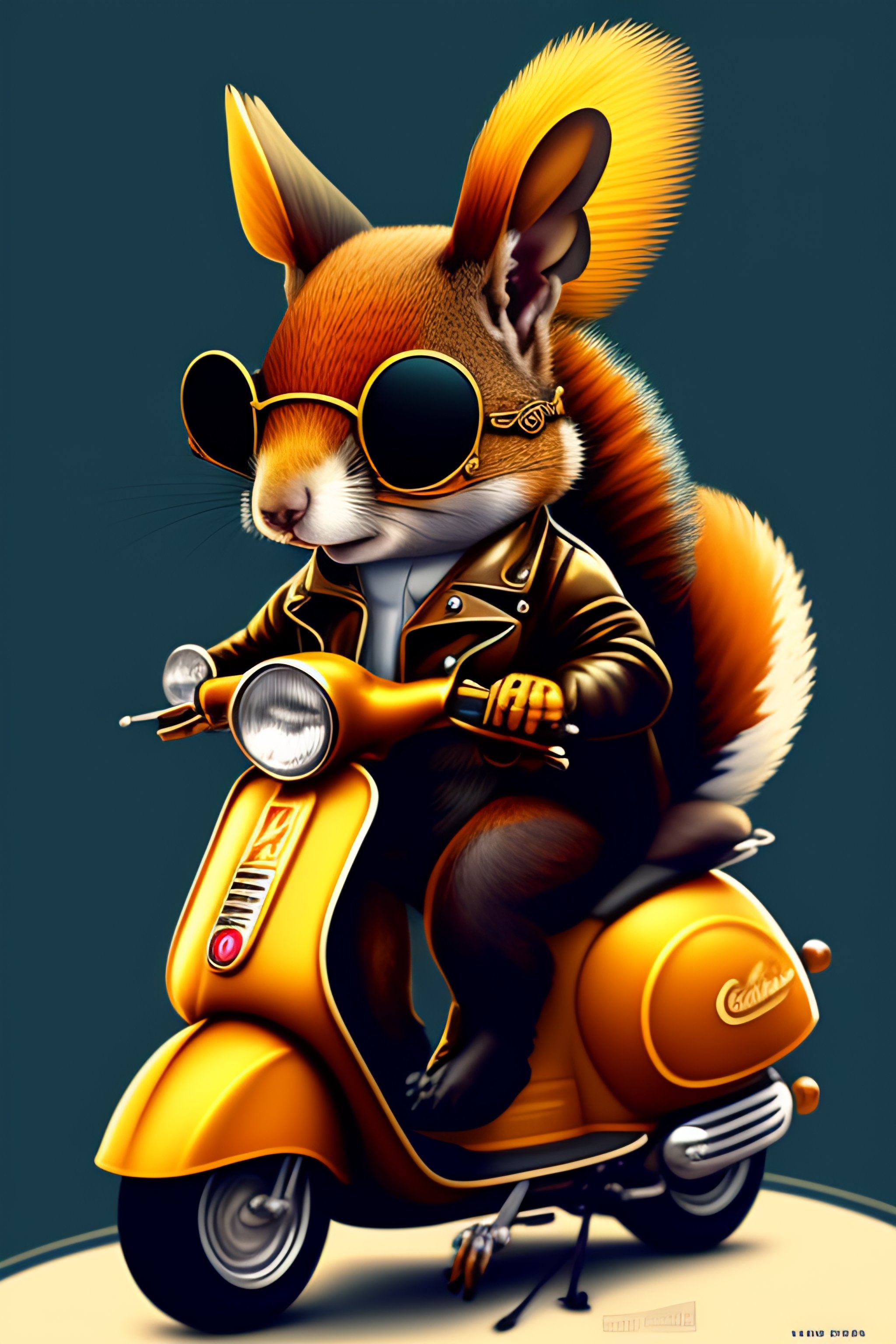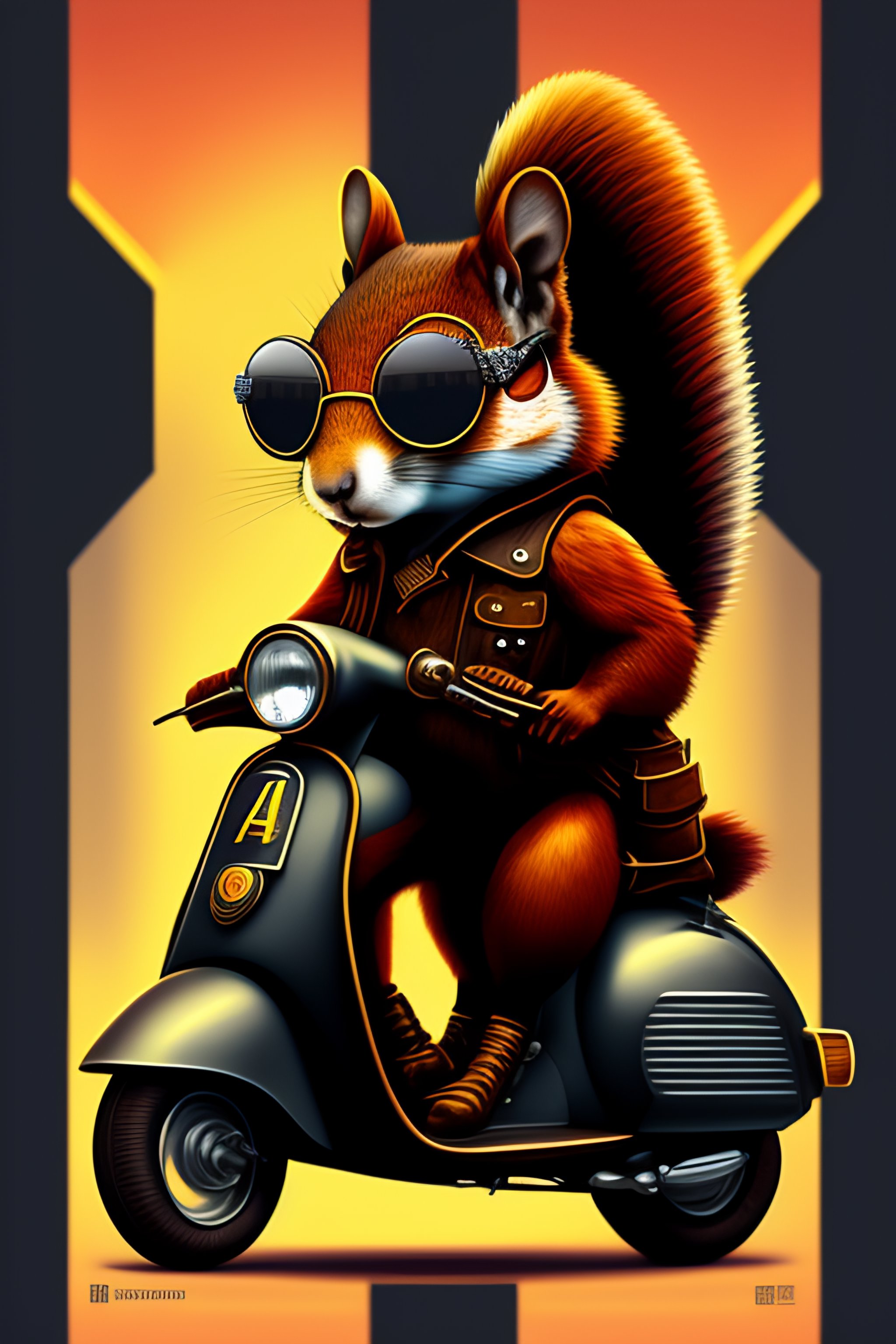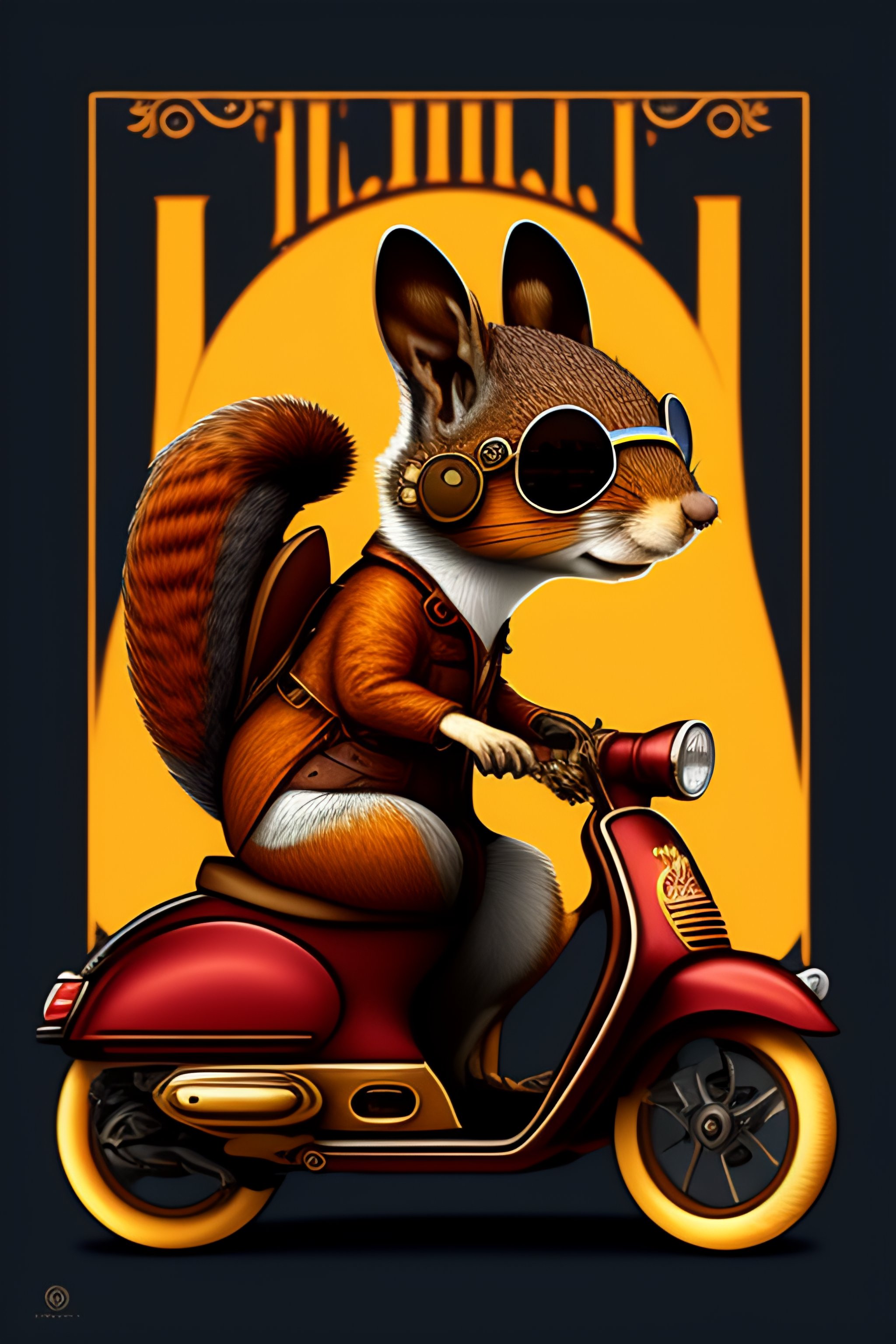 A steampunk squirrel fursona with boots sitting on a vespa moped with sunglasses vector, graphic novel, grunge, geometric horror tshirt design