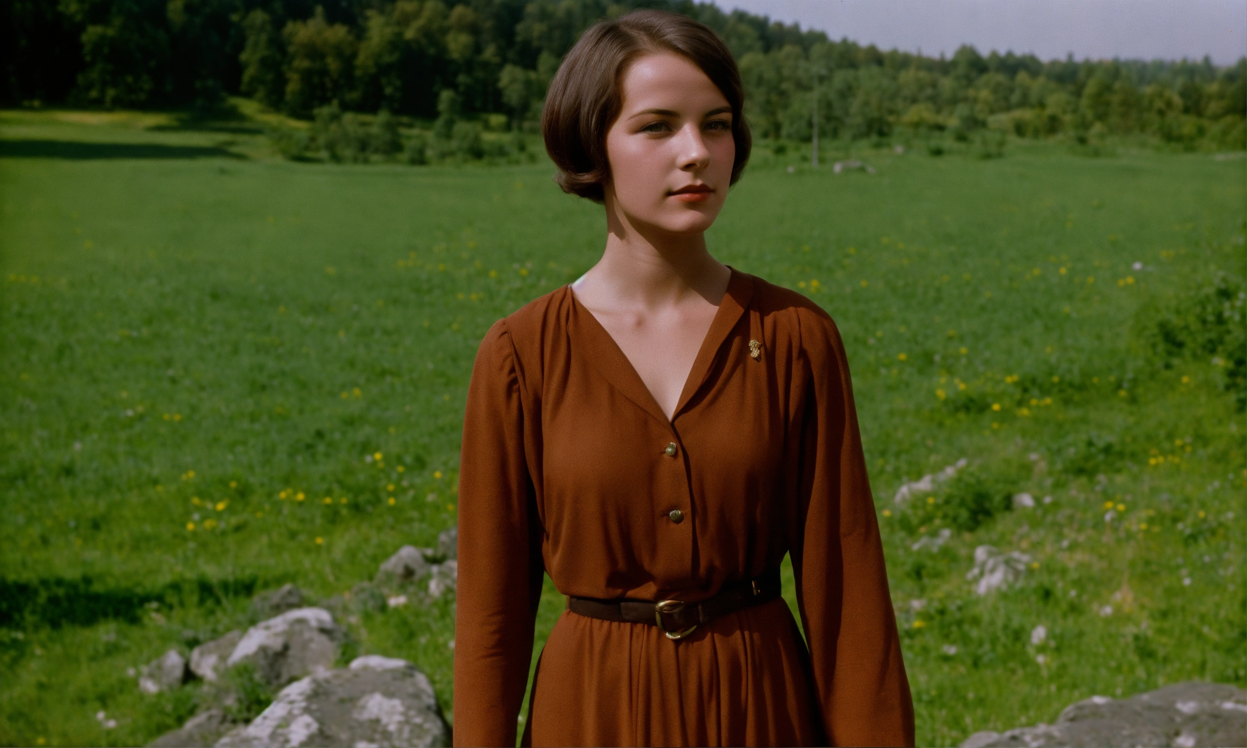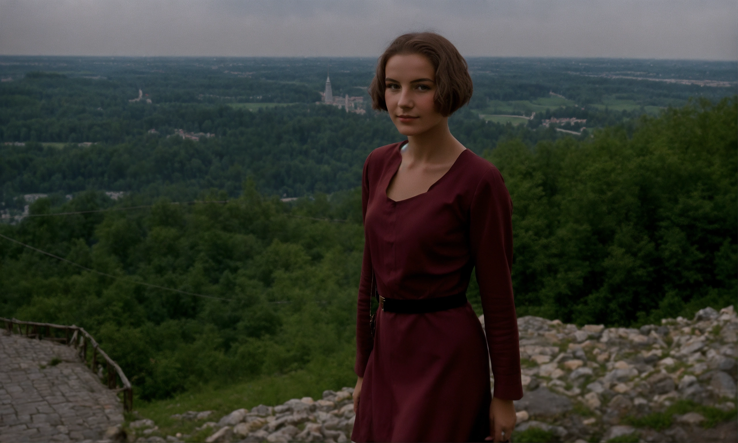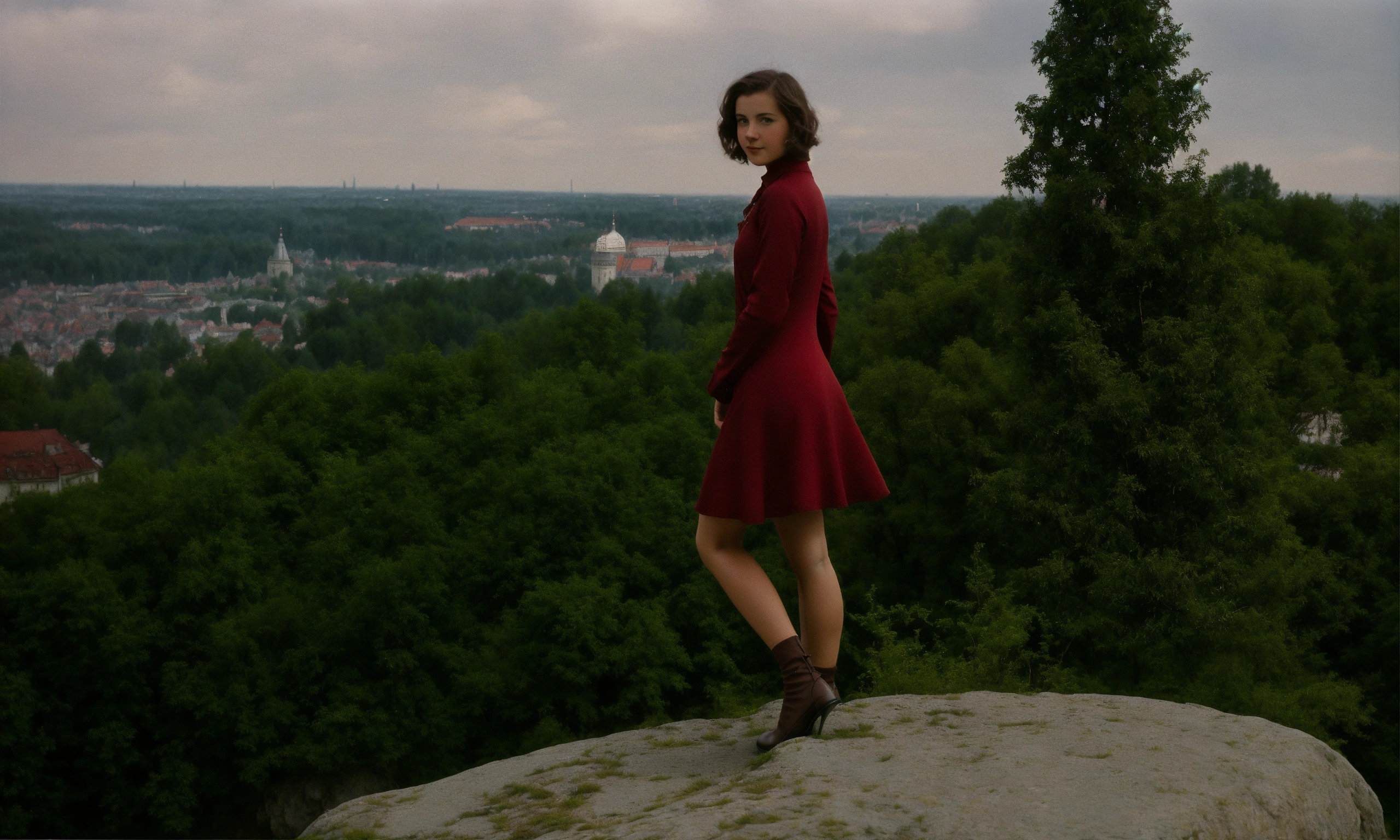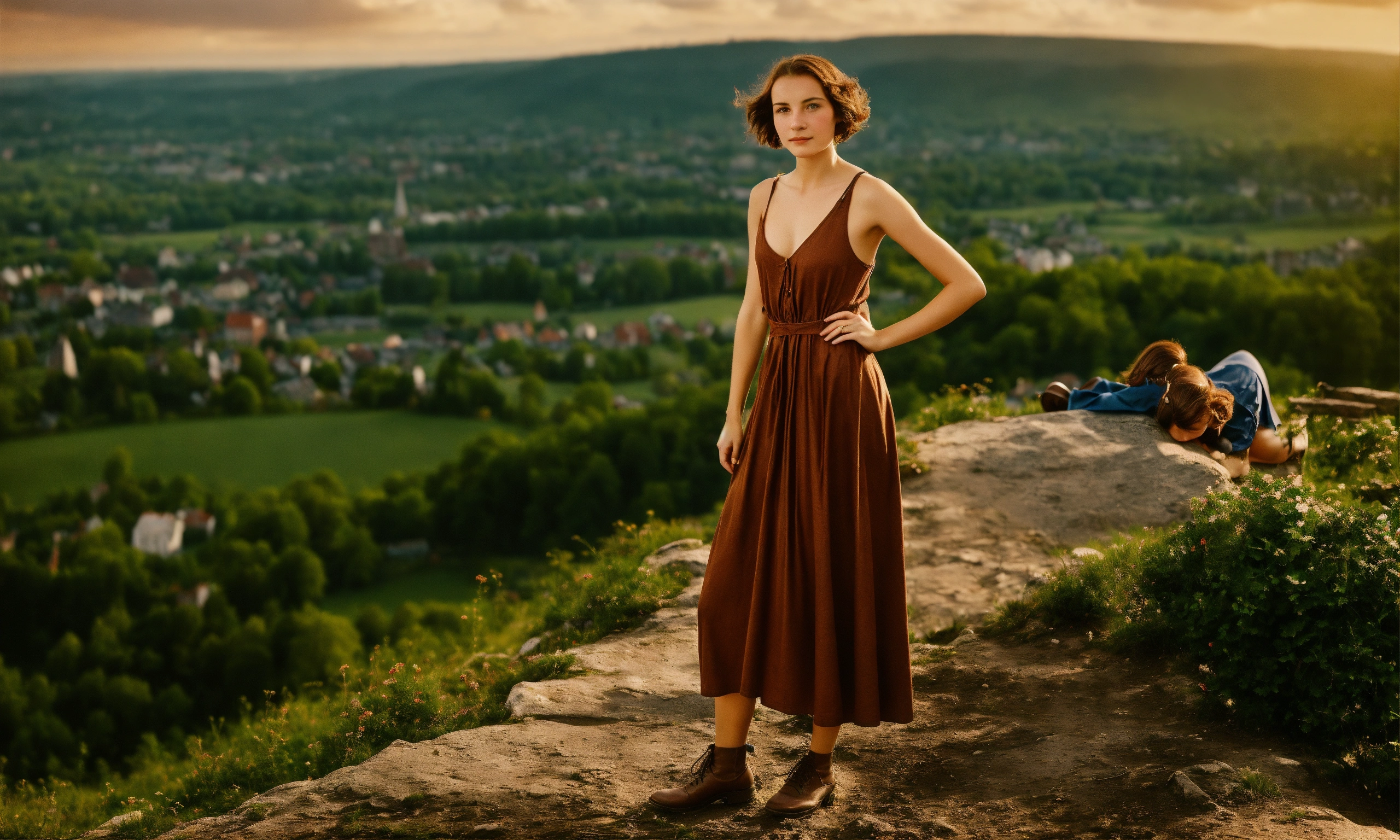 Warszawa 1920-1930, europian woman age 20, on top of a mountain, looks at the camera at full height, bald, clothing short dress. brown hair.