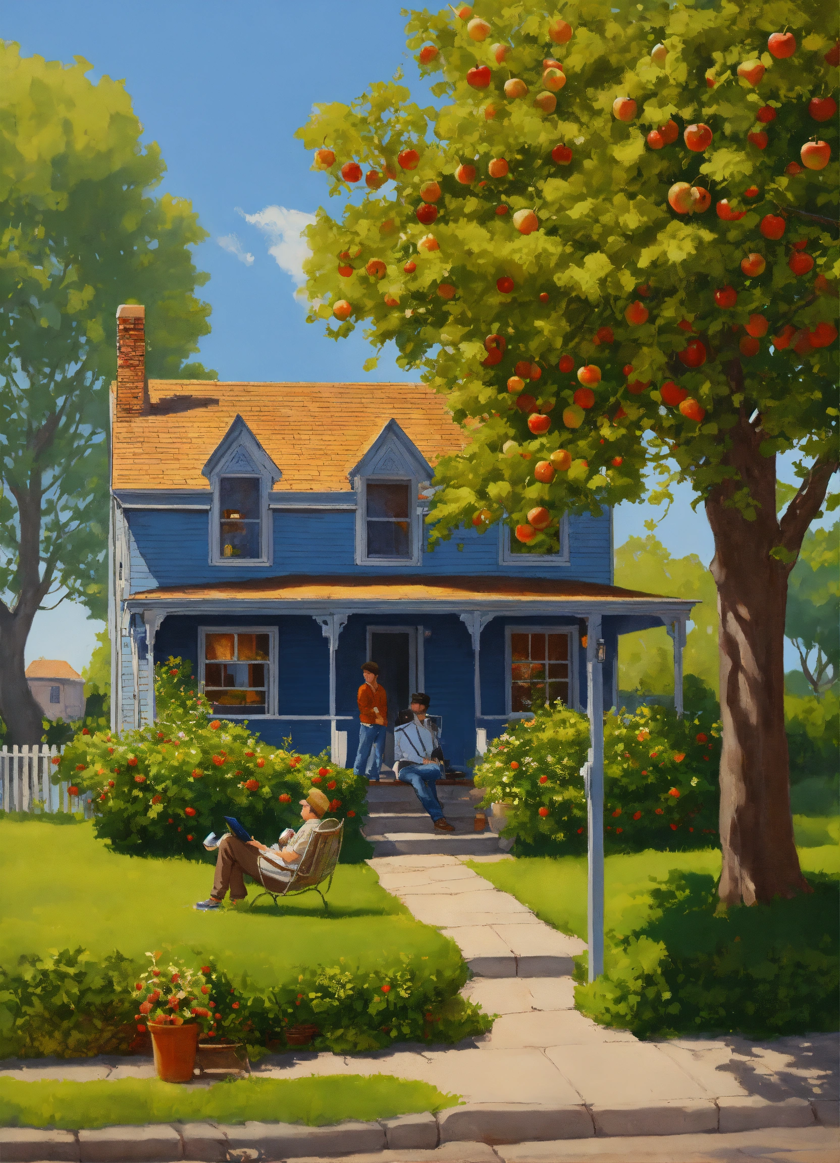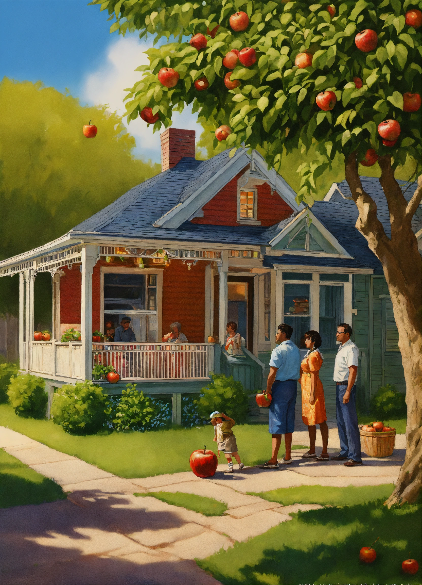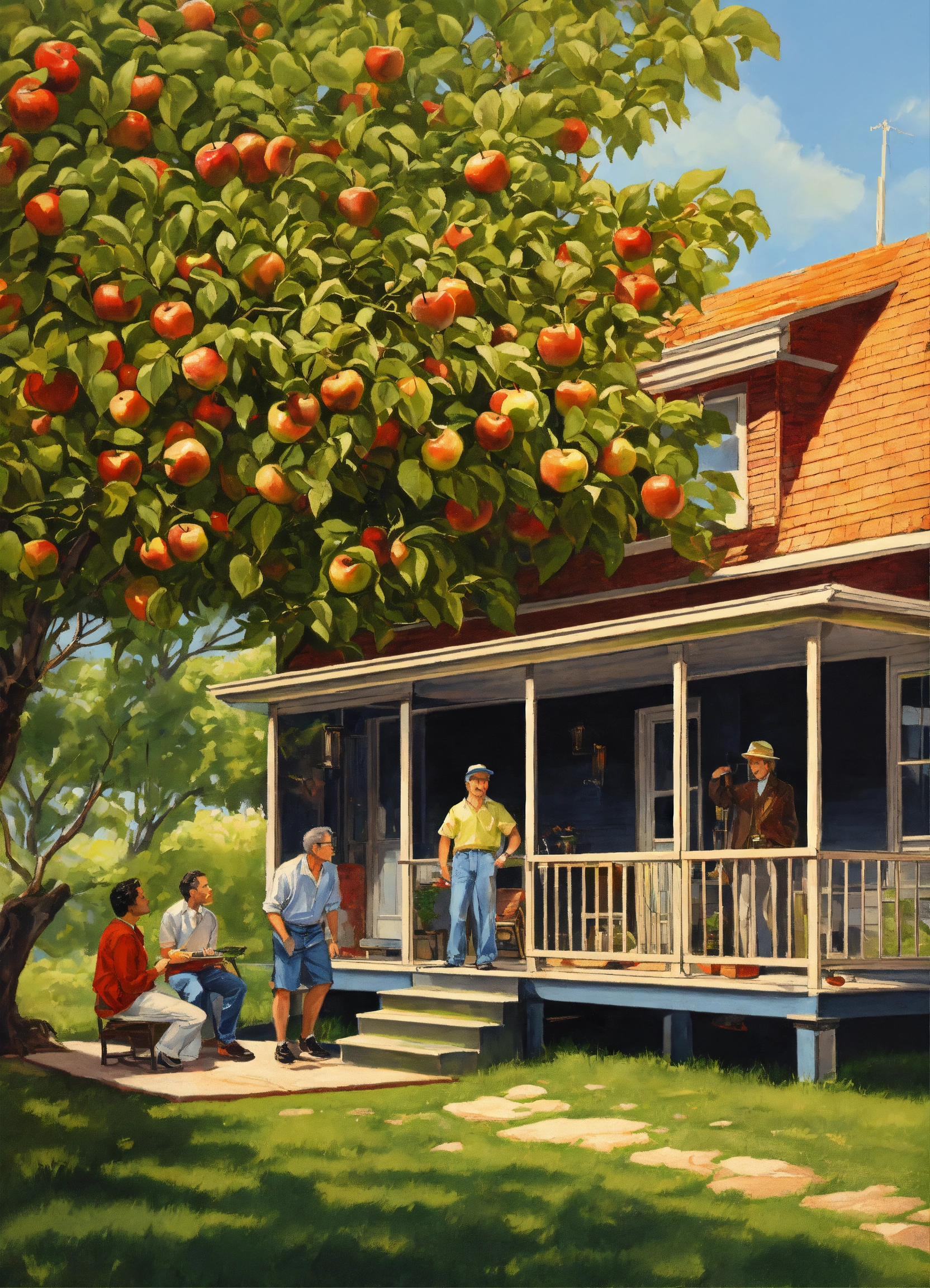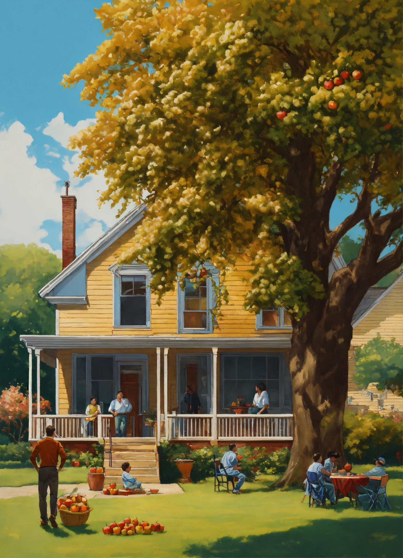 2d vector illustration of the 1960s black family home backyard with porch, a 55-year-old woman seated on the porch, a 5-year-old boy with woman, looking out from the porch, two men together talking, 55-year-old man in the yard, under an apple tree, a 25-year-old man under an apple tree, men talking by themselves, a well-grown apple tree, design art, chrome art, painting and stunning artwork, highly detailed digital painting, airbrush art, highly detailed digital artwork, dramatic artwork, stained antique yellow copper paint, digital airbrush art, detailed by mark brooks, chicano airbrush technical specifications steps 20 sampler dpm++ 2m karras cfg scale 18 desired output size 1024x960 pixels