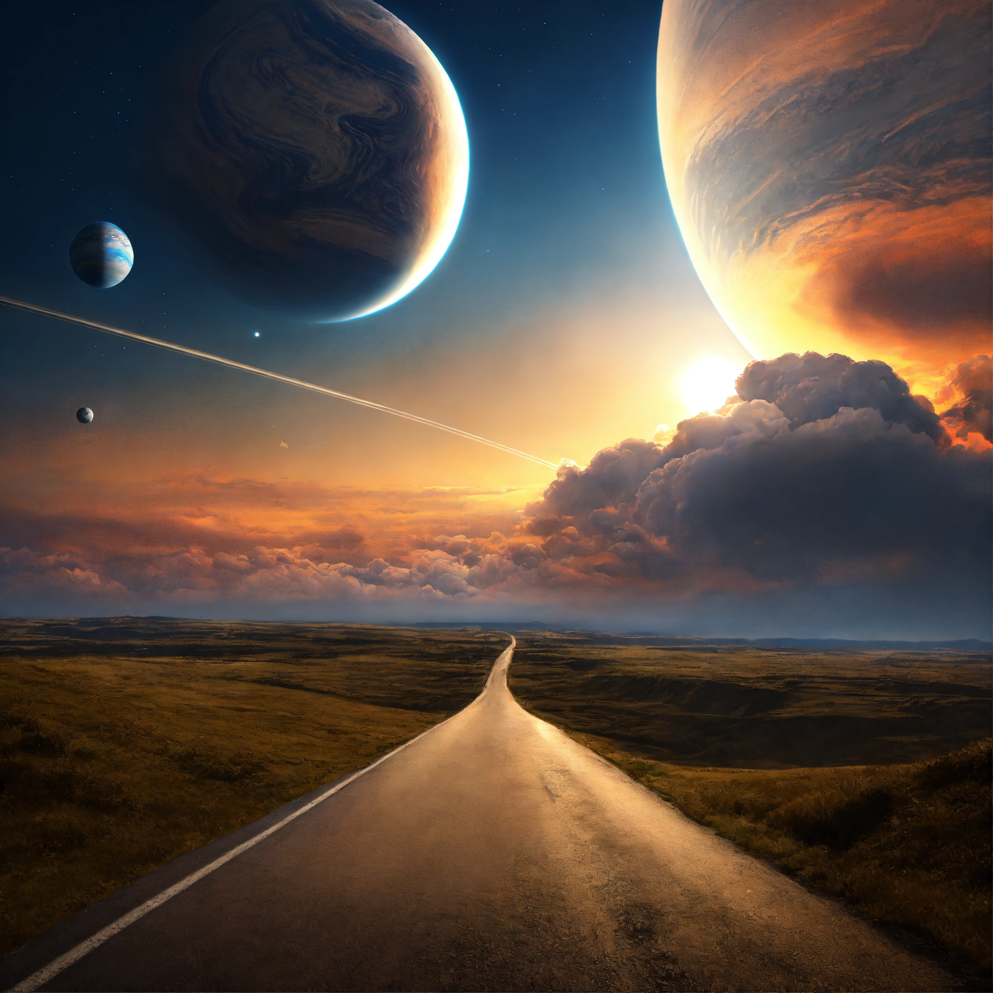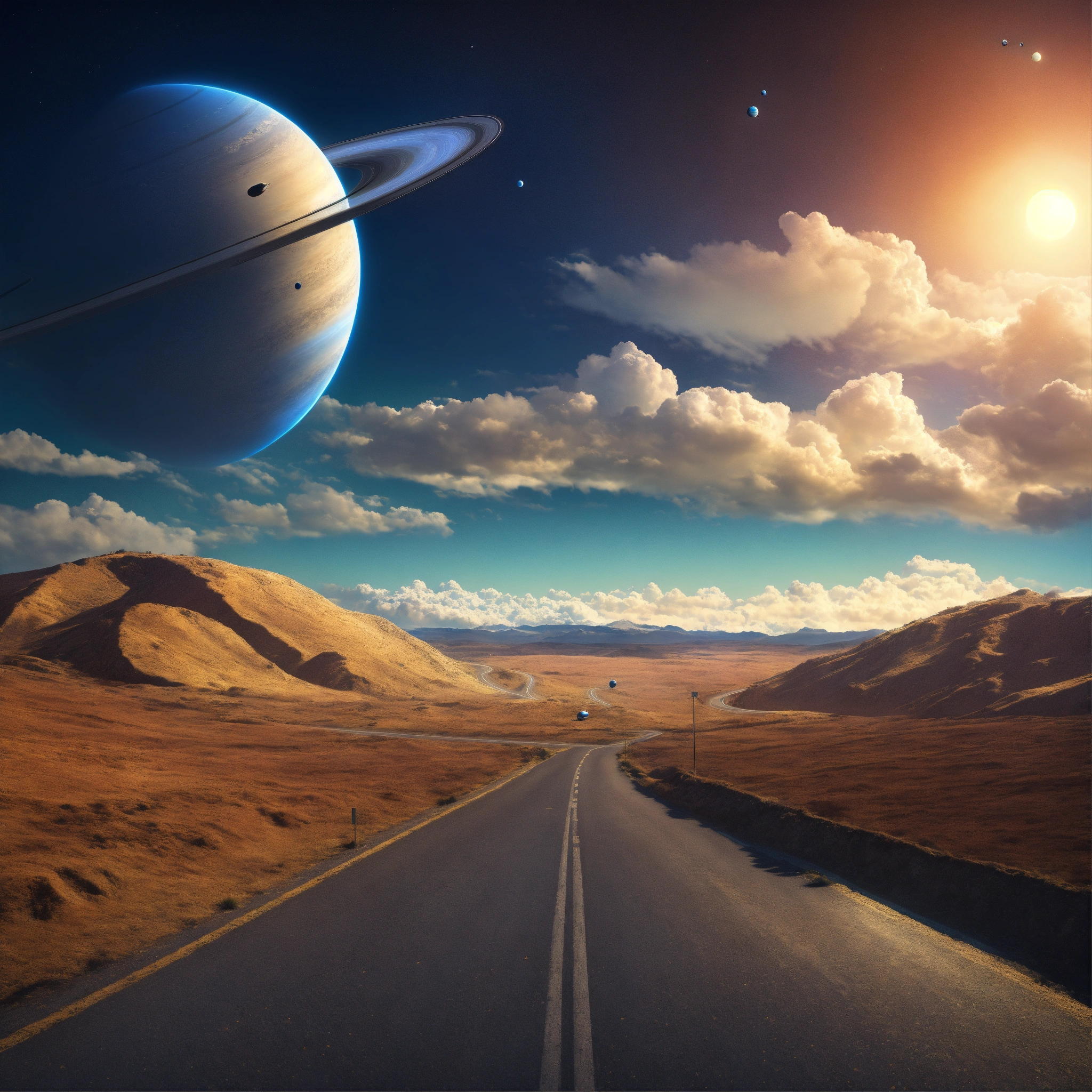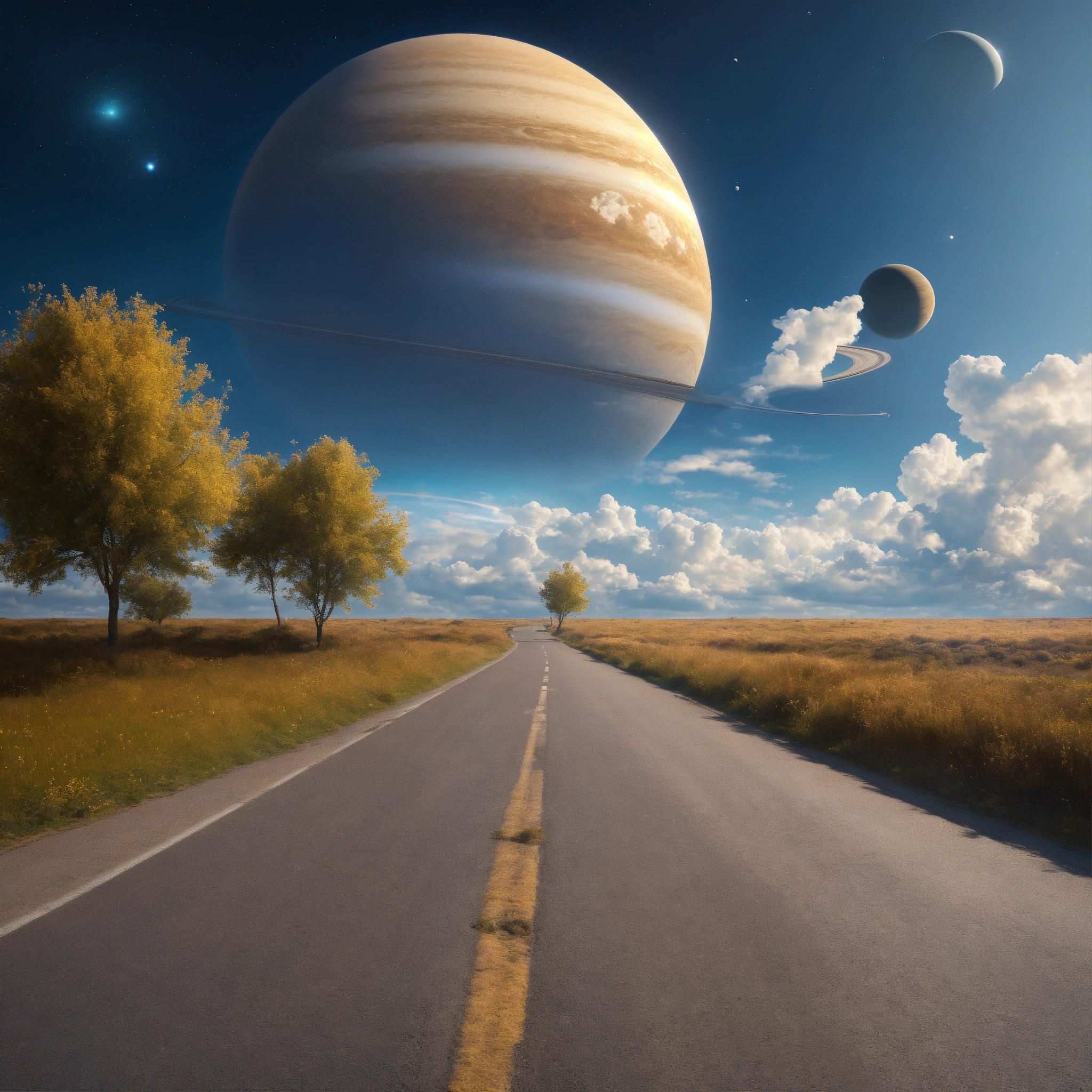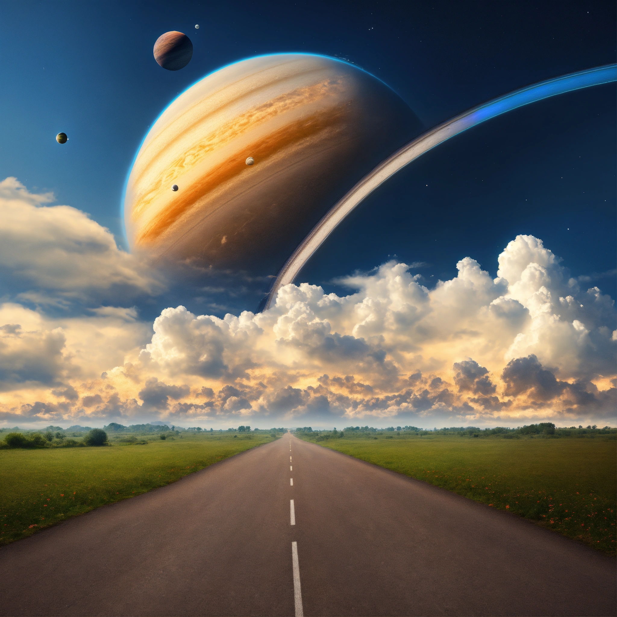Generates a landscape full of clouds, blue sky and a small planet saturn in a corner with a road next to it