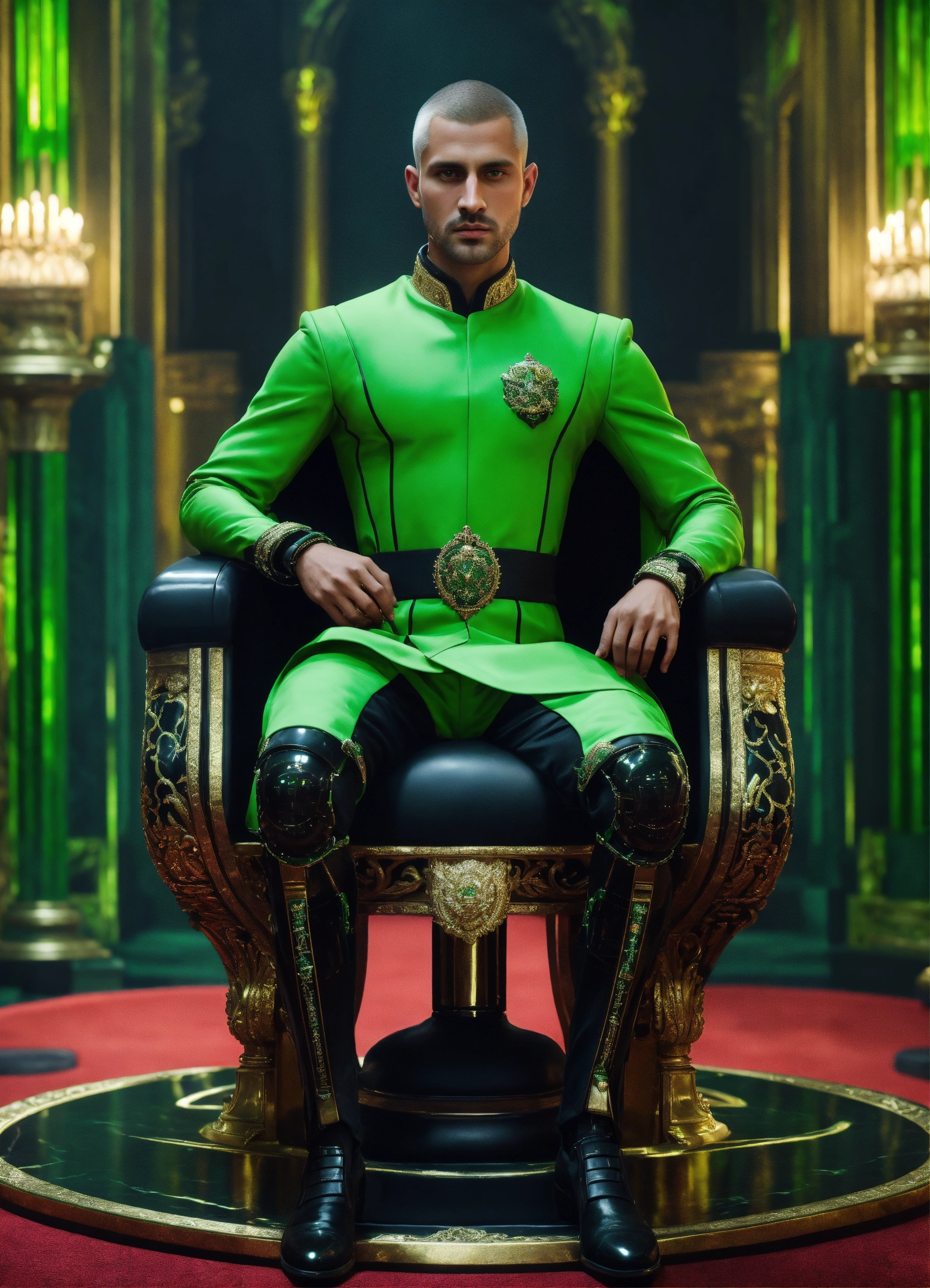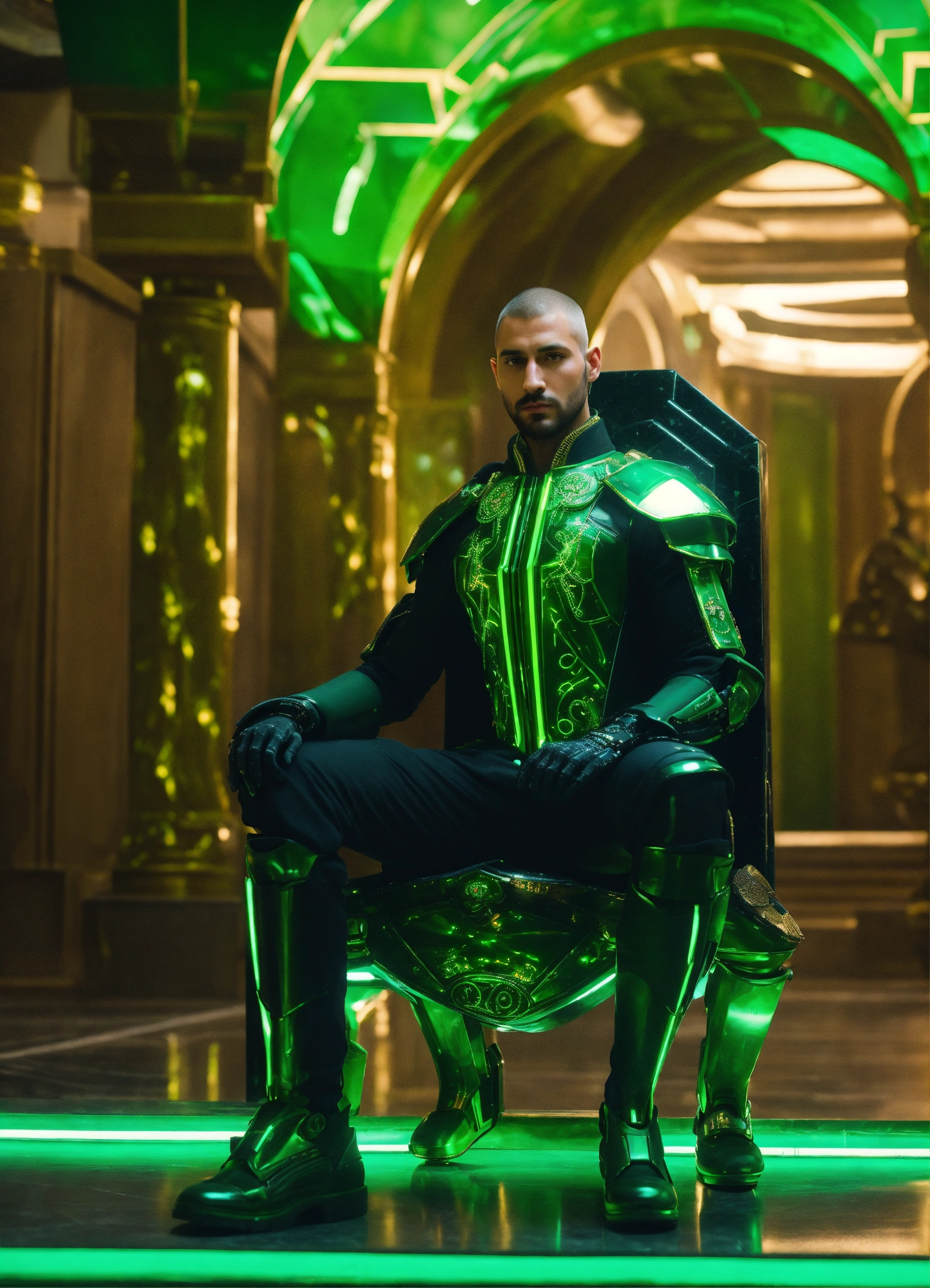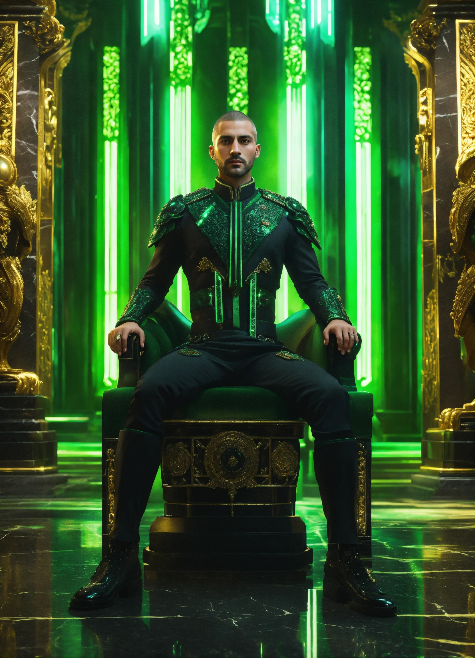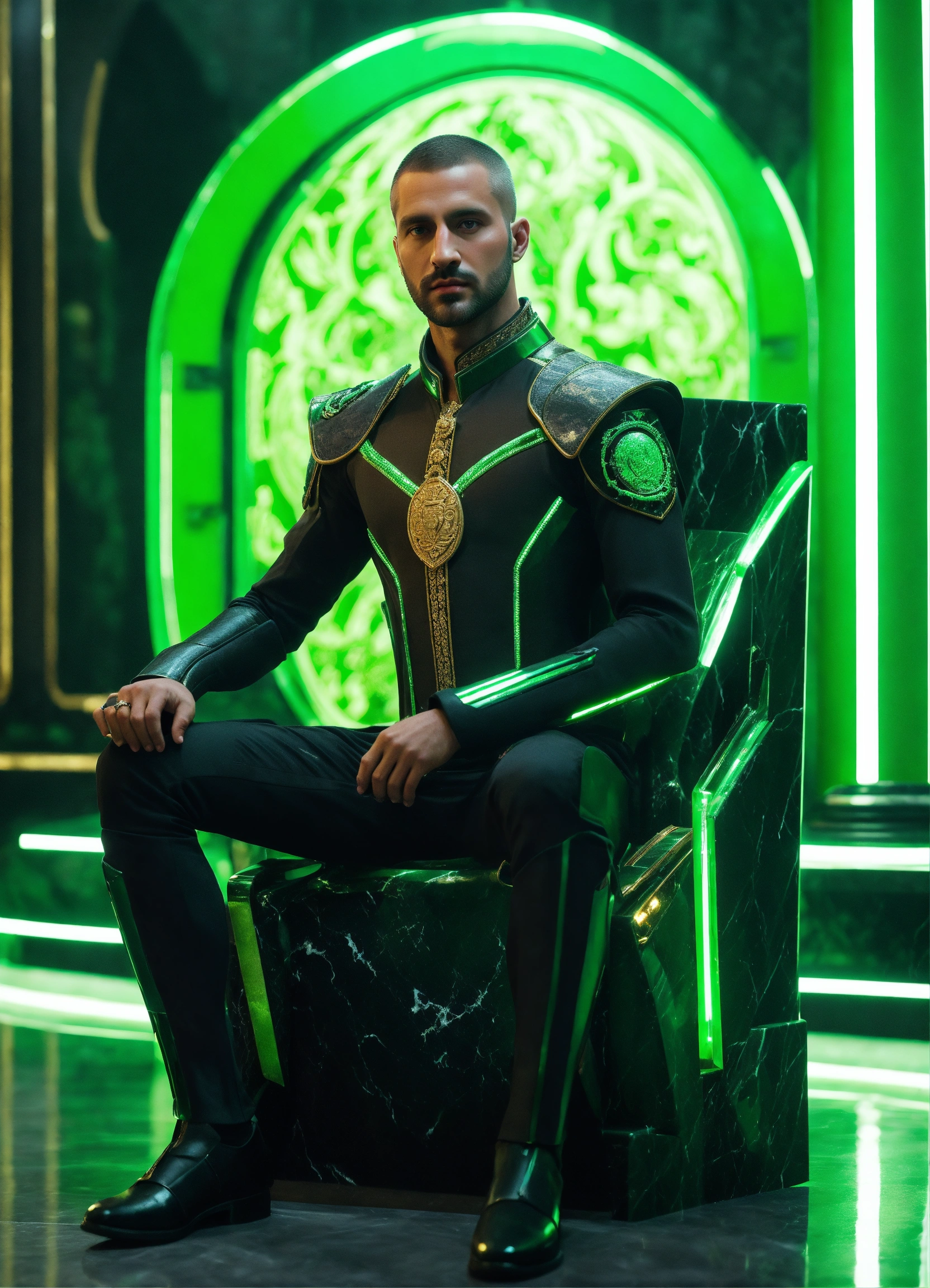 Full body image of a royal man wearing a black and green cybernetic uniform, sci fi, fair skinned, futuristic aristocrat standing in a black marble and jade throne room, turkish face, 32 years old, stoic, buzz cut, royalty, male, handsome, green eyes, unreal engine, 8k