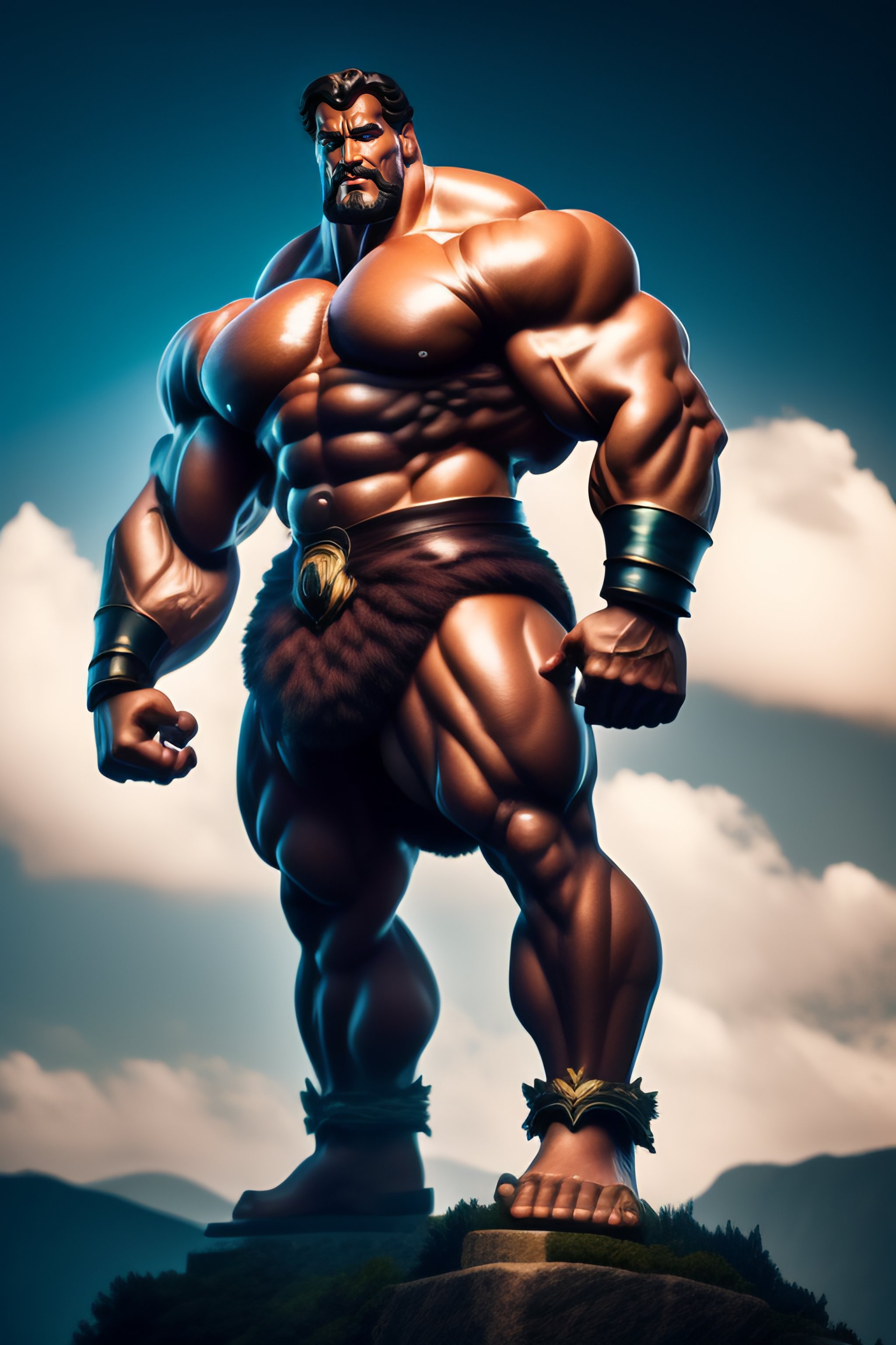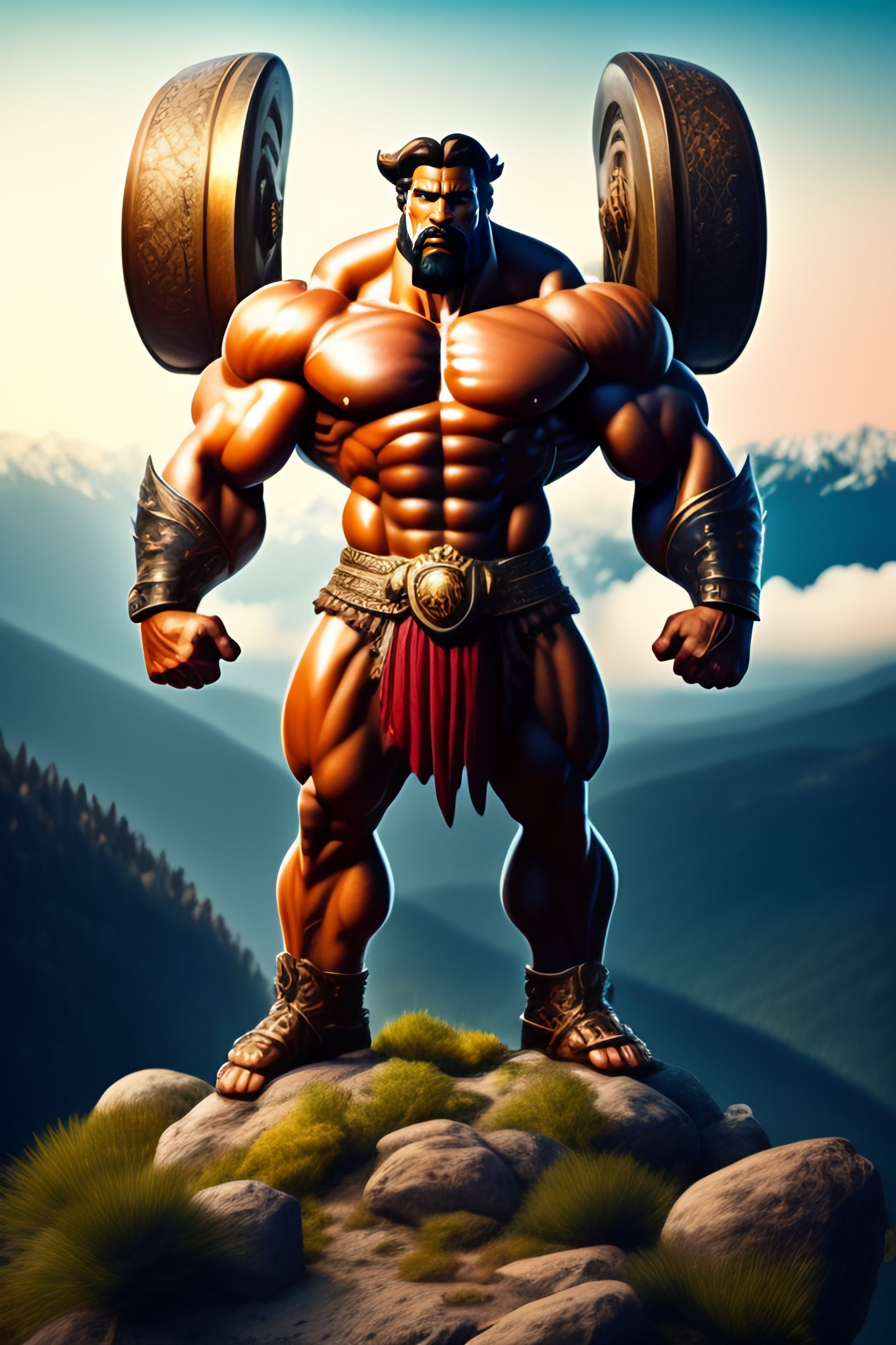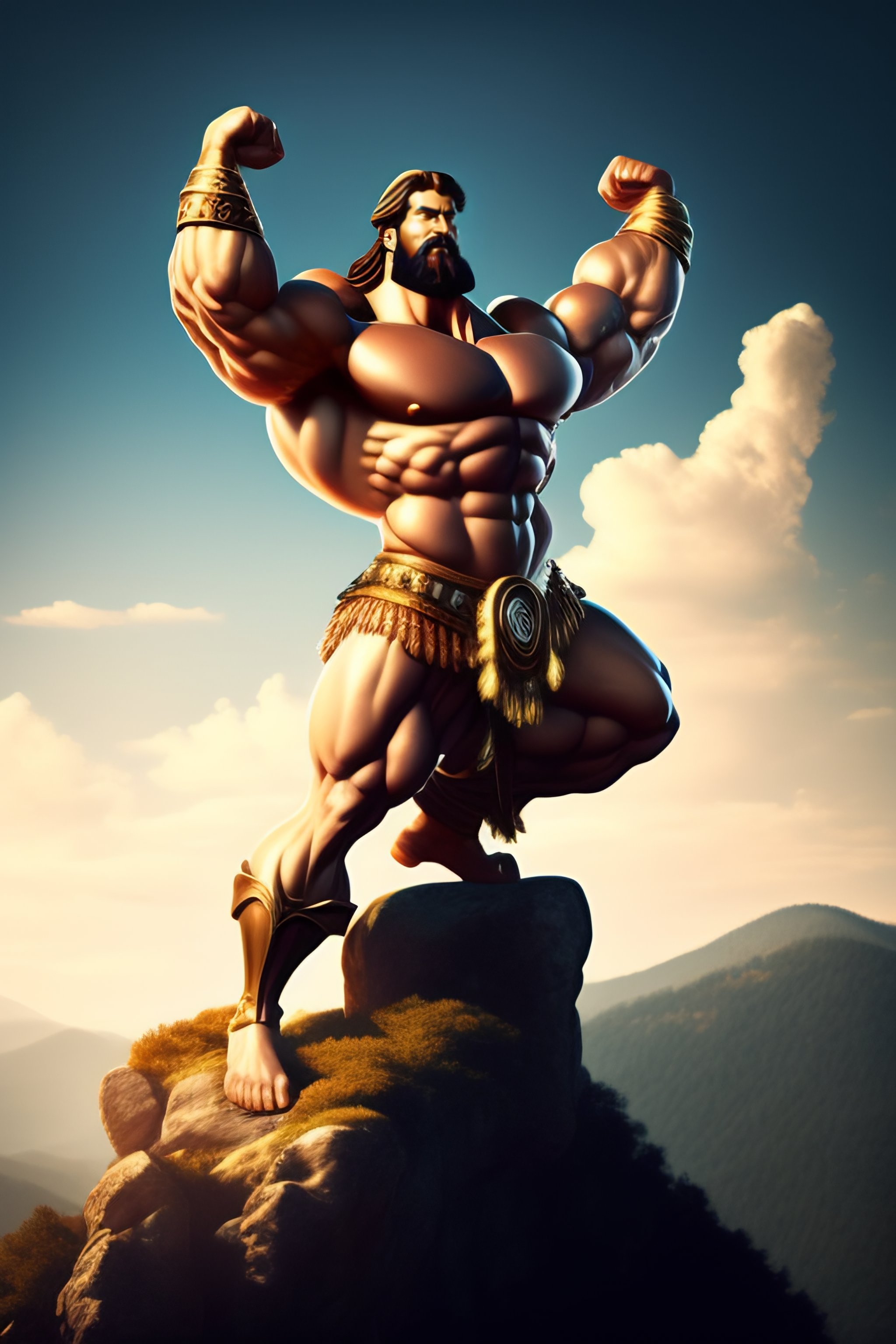 Hercules with big bear hands standing on the top of a mountain alone from the front