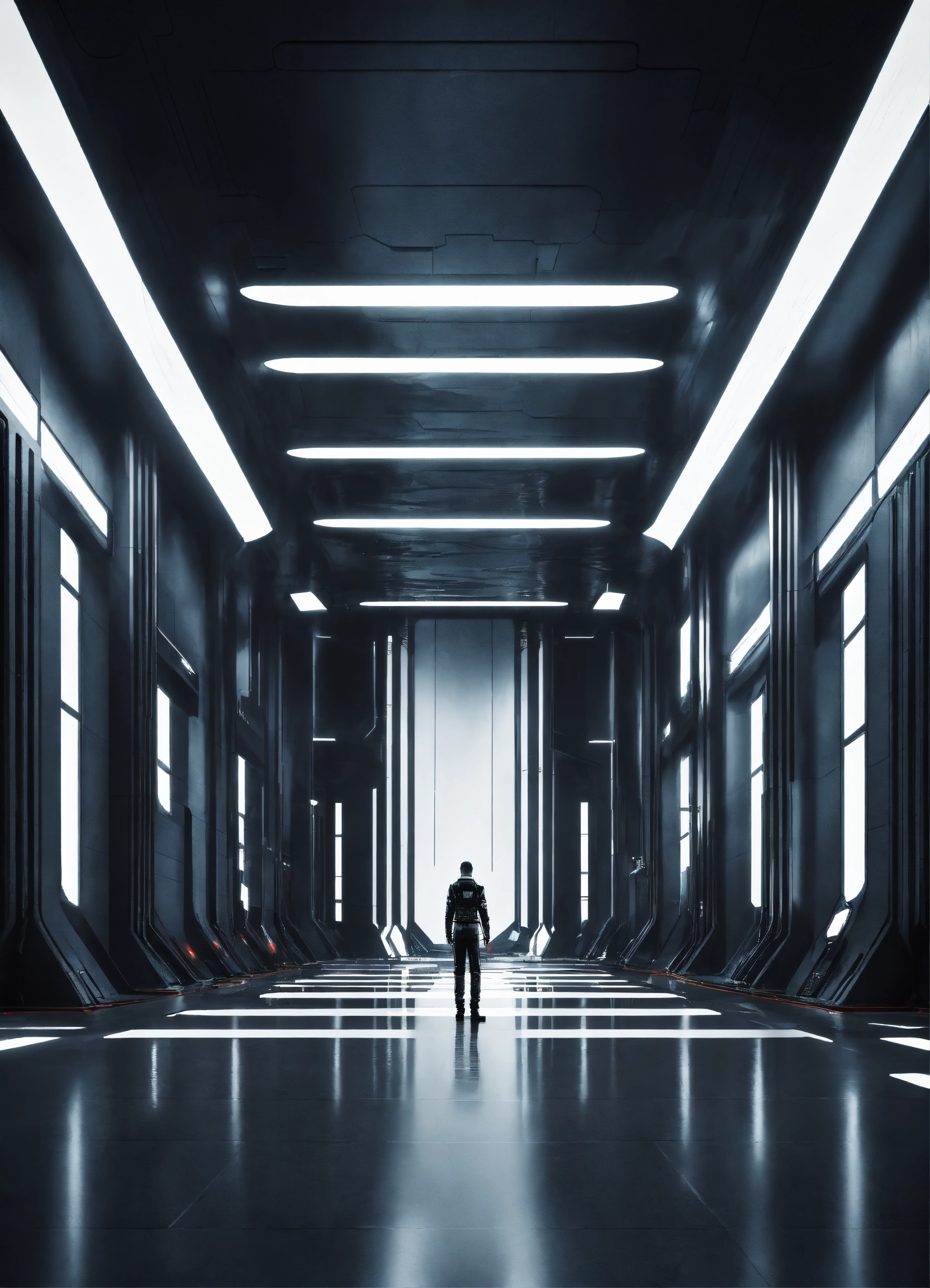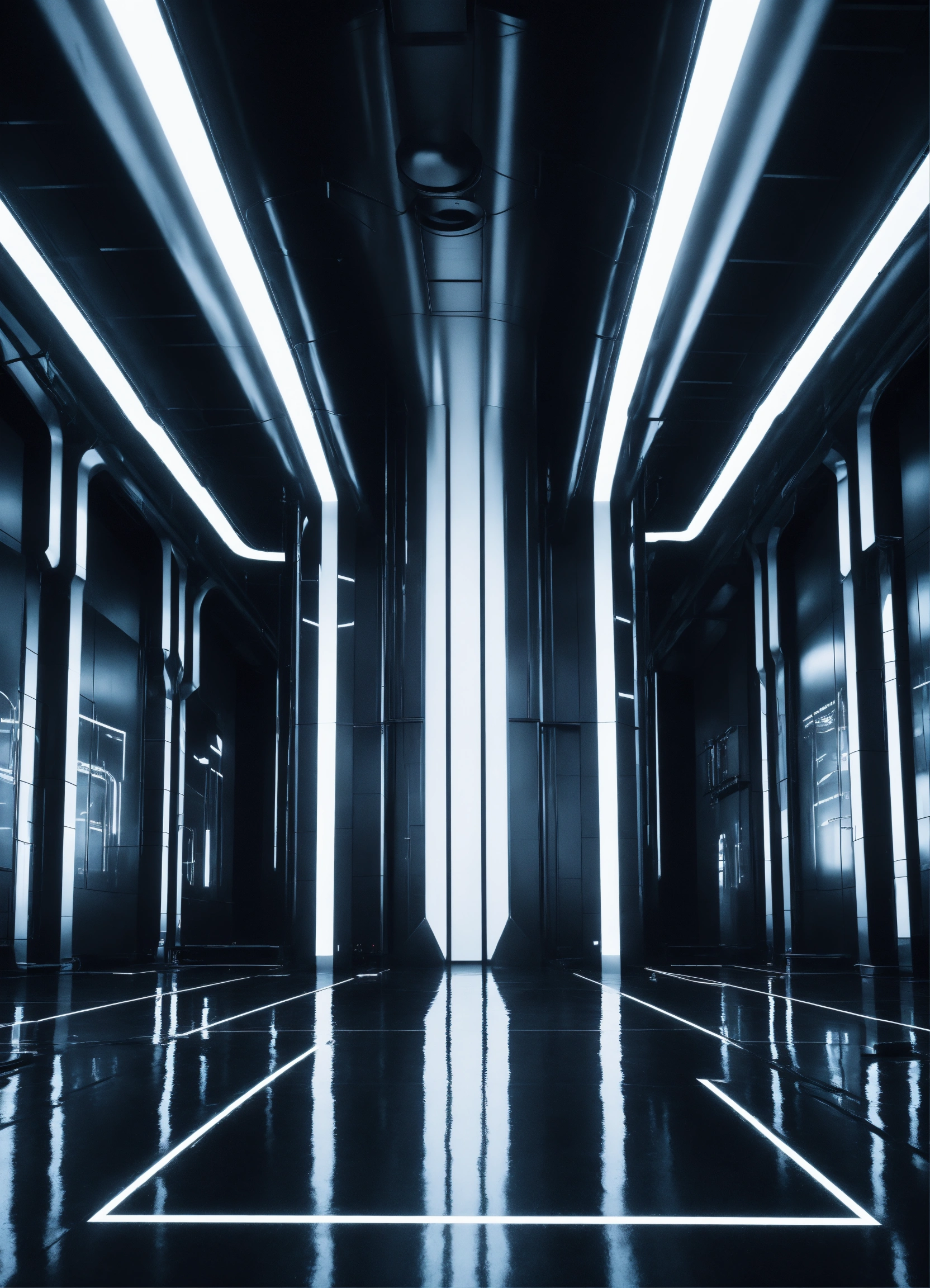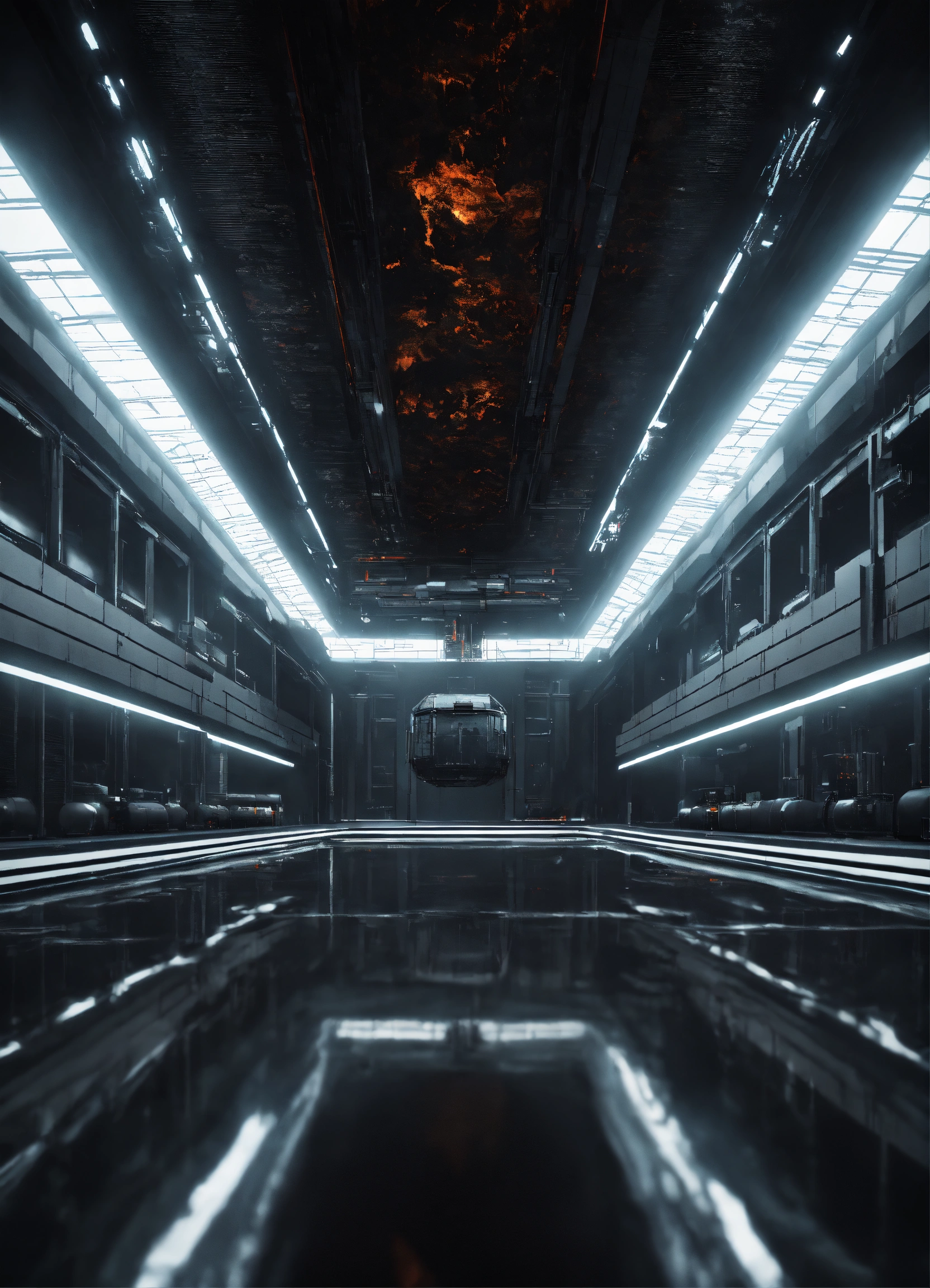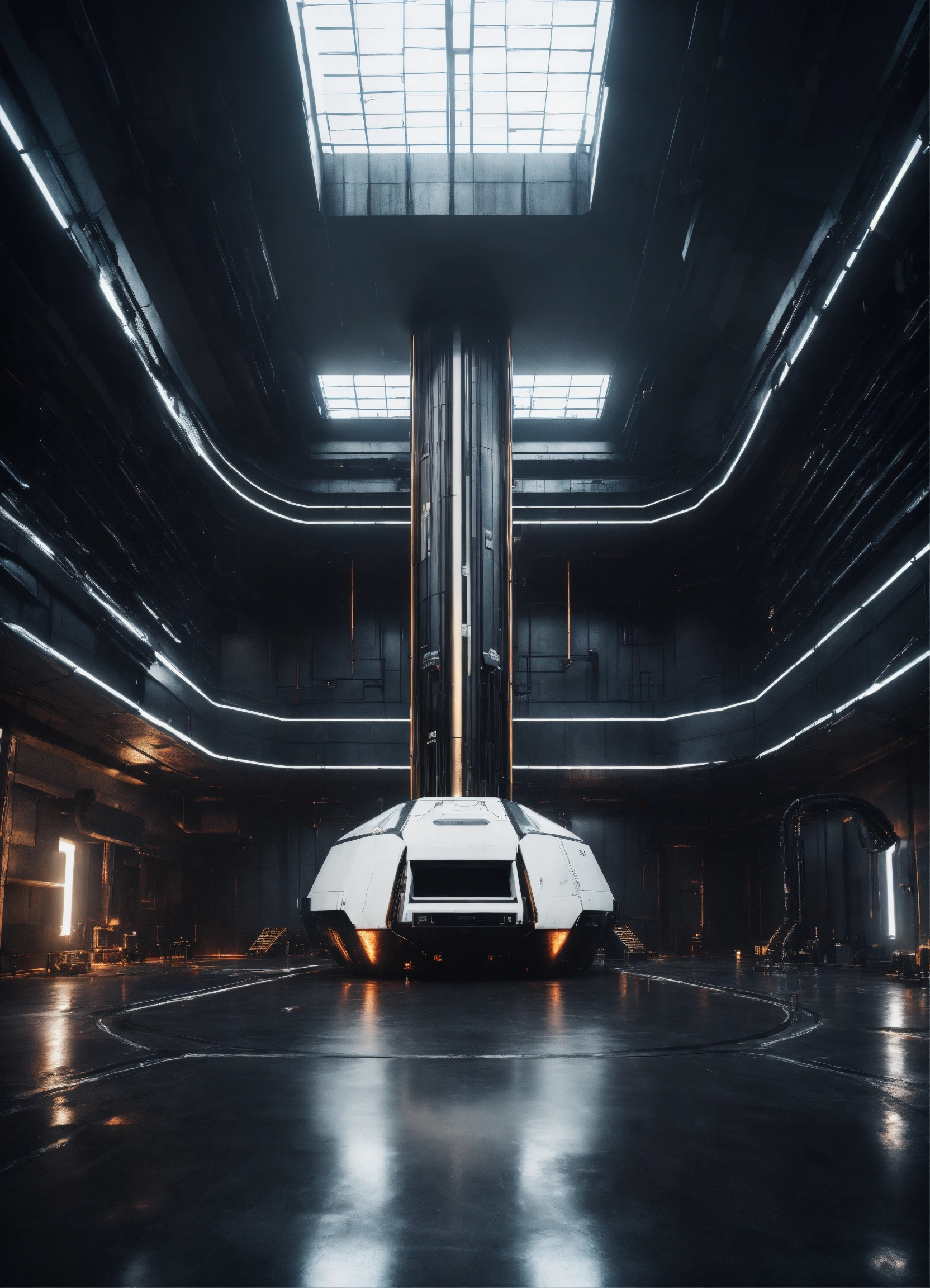 A realistic very dark photo of an enormous futuristic room, with a very long vertical tank filled with a liquid in the middle of the room, with white and black metal walls, very high ceiling, sci-fi, dark, dramatic, hyperdetailed, hyperrealistic, 8k