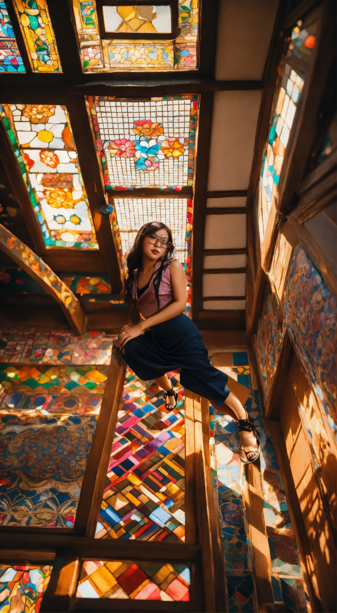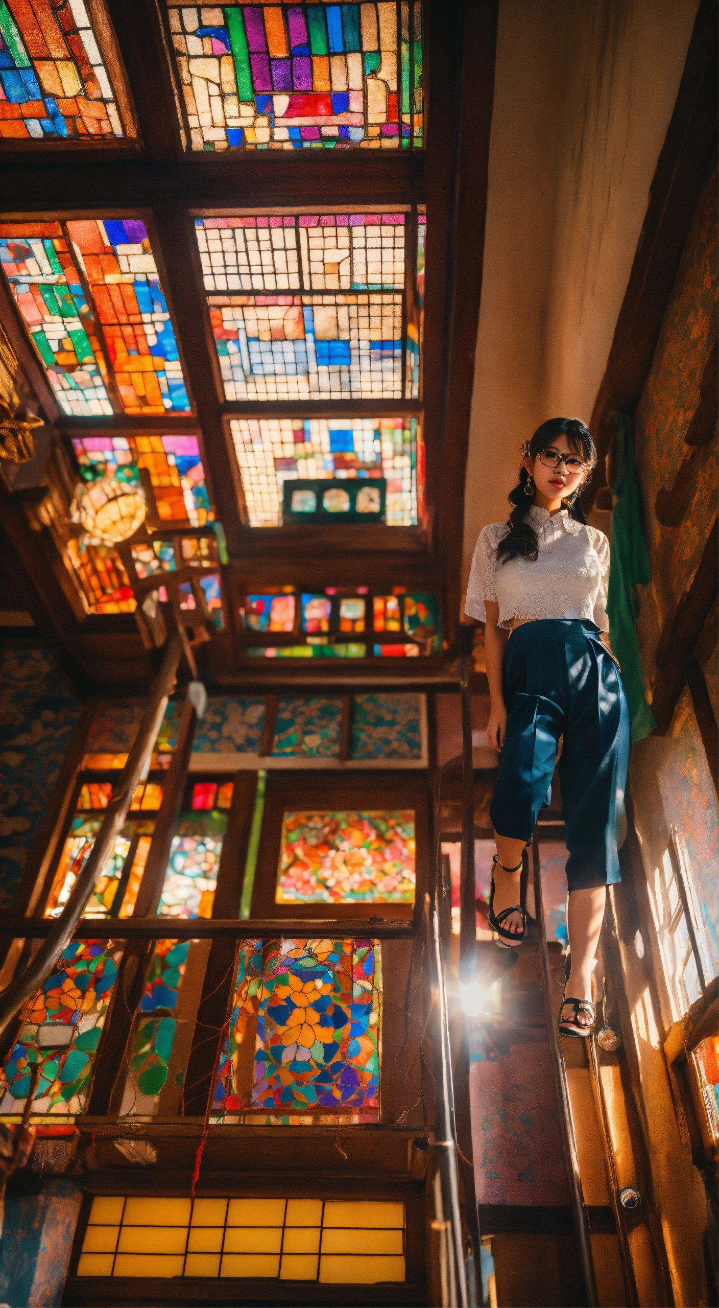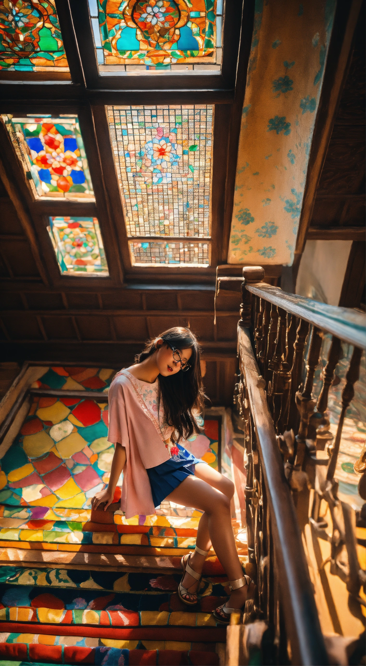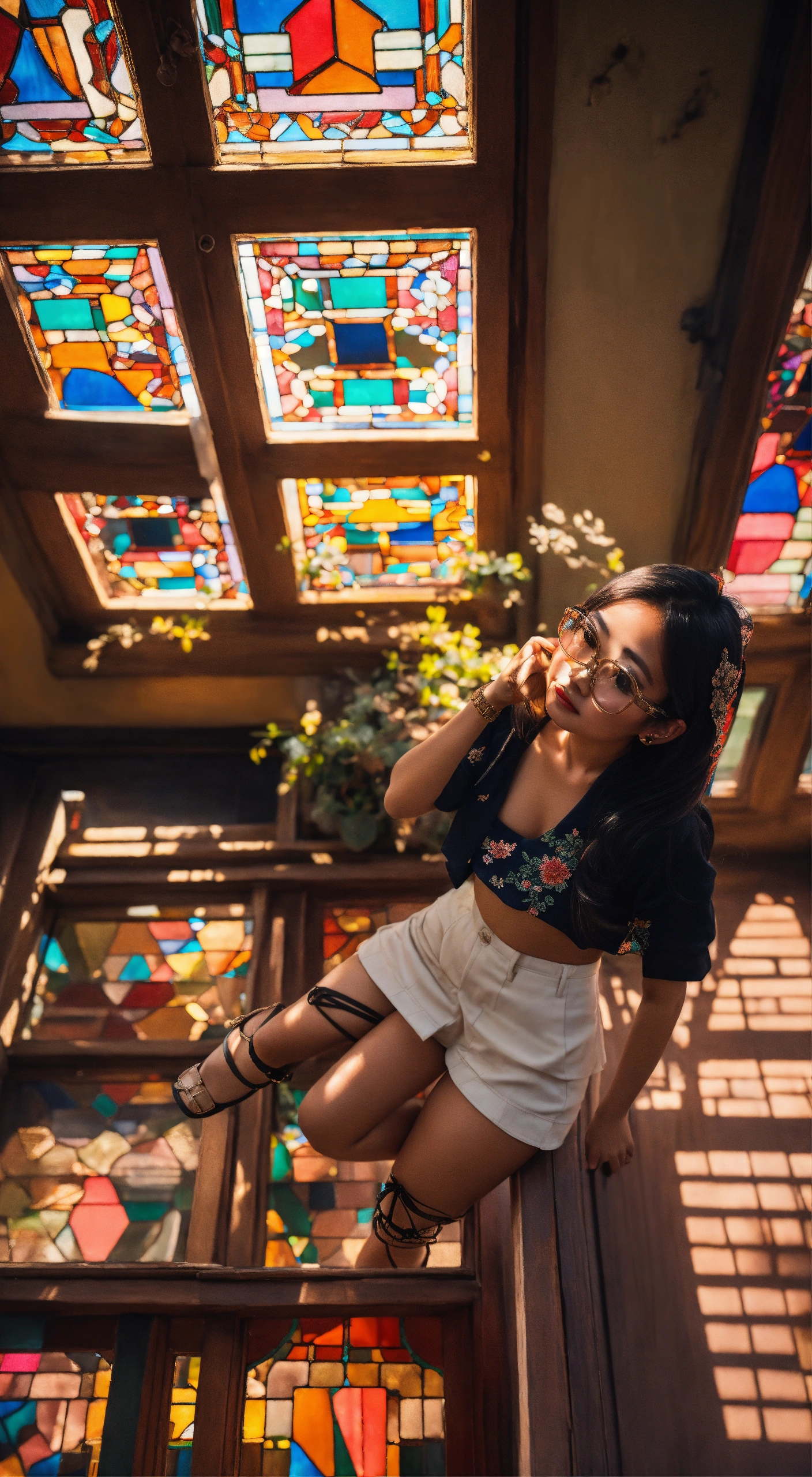 Portrait of a beautiful japanese schoolgirl wearing a crop top and a short with sandals, standing in a vintage house in yazd with colorful glasses on windows, highly detailed, 32k resolution, cinematic lighting, dramatic lighting, vertical shot, iranian architecture, persian culture background