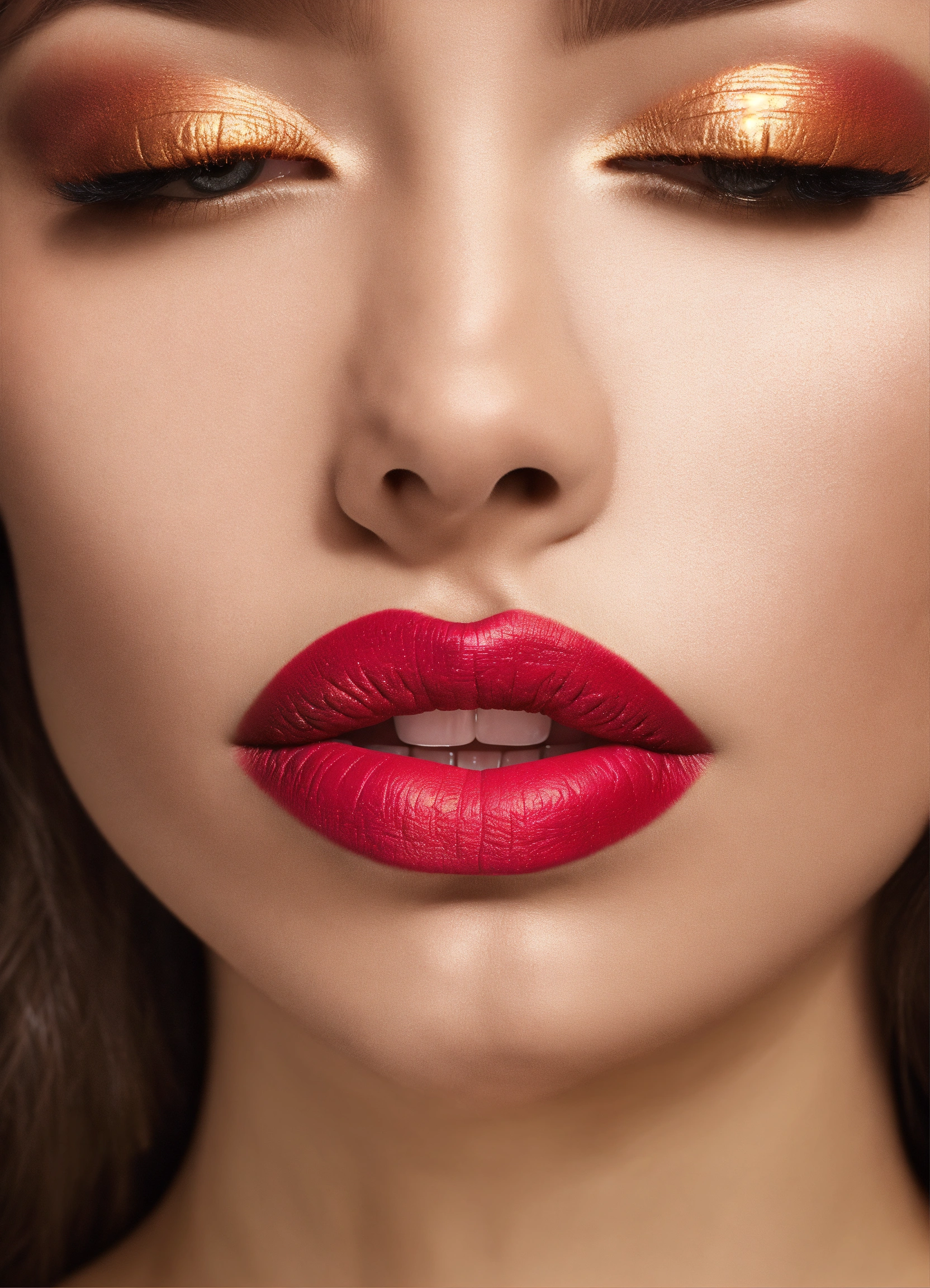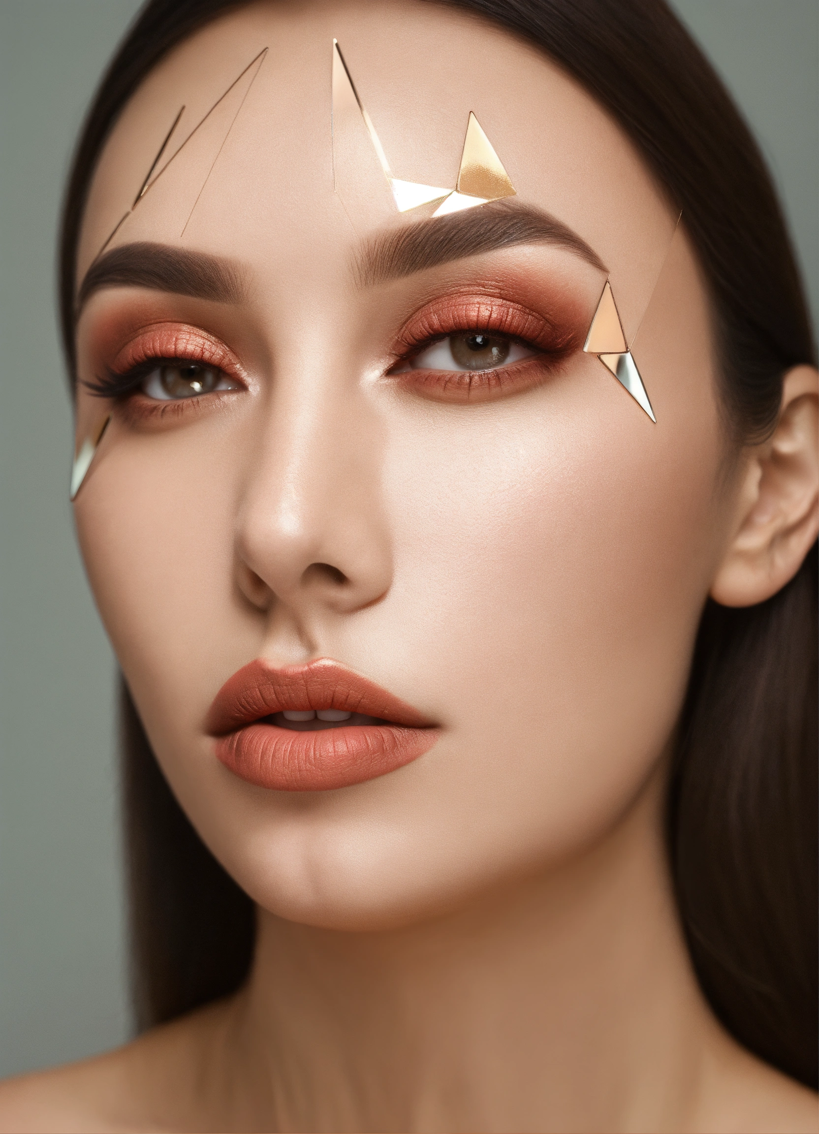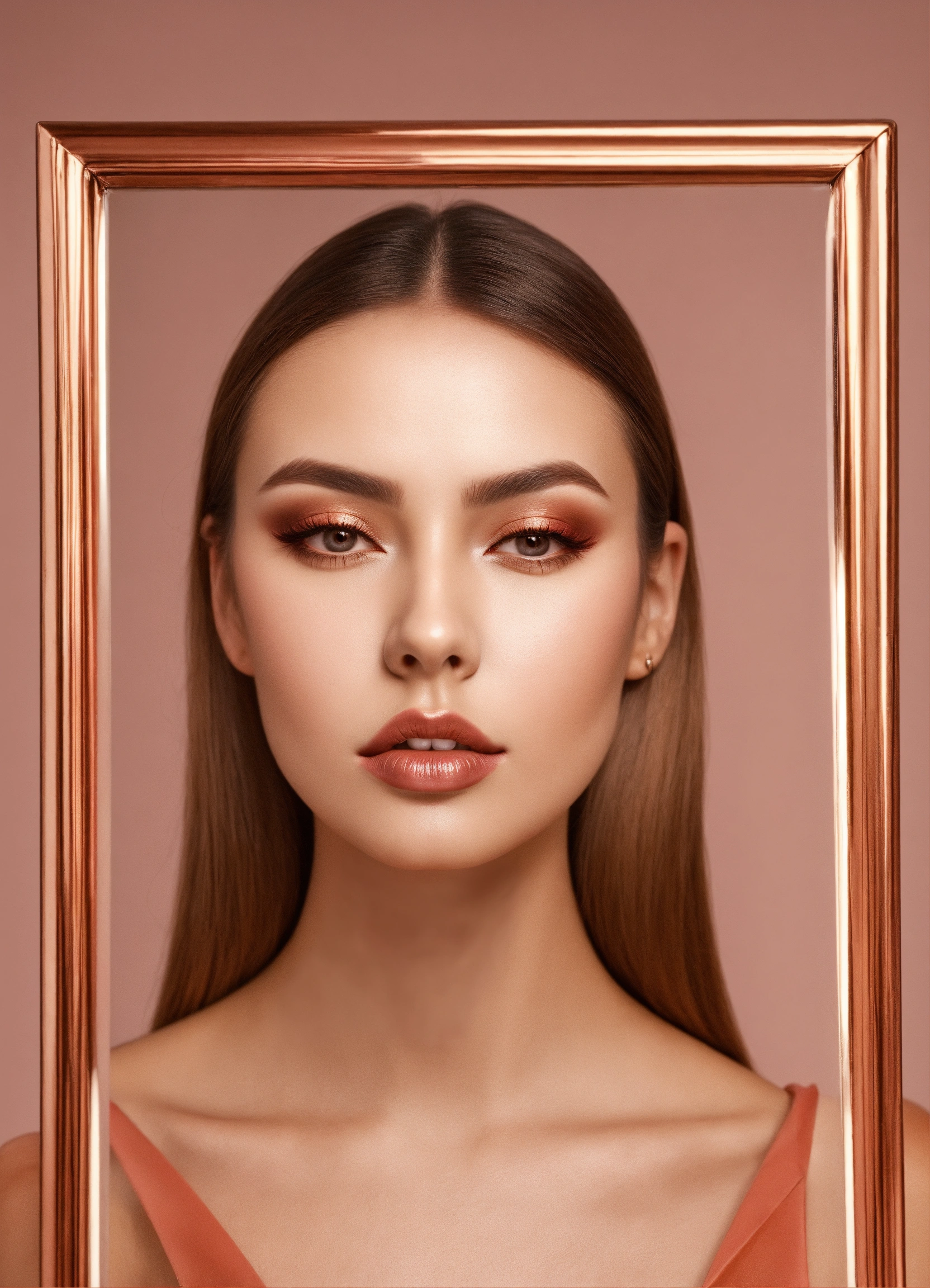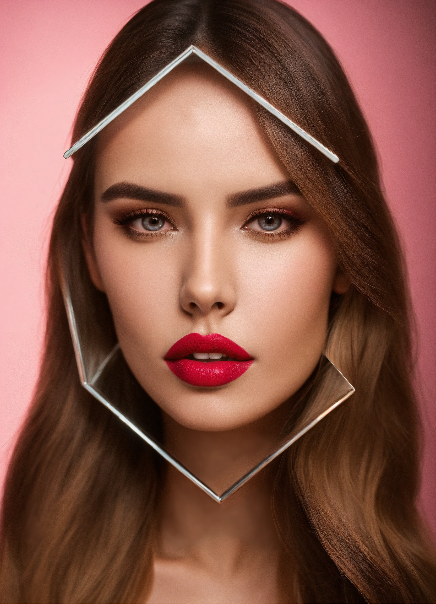 Lips makeup in triangle downwards pointed shaped mirror, beautiful woman with triangle downturned shaped face with large forefront and thin chin