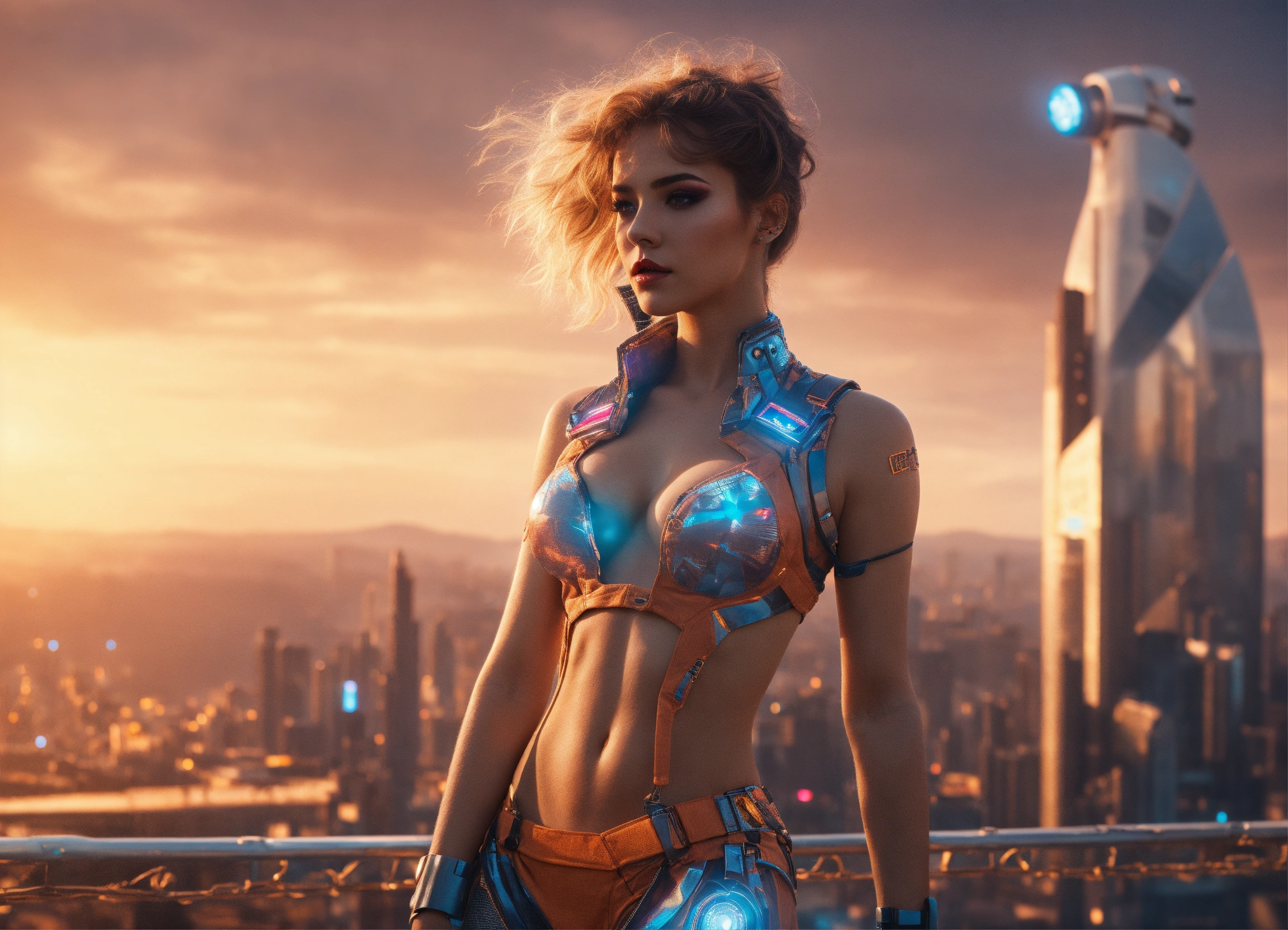 Full body, photo, sci-fi dream girl, futuristic, sunny weather, open shirt, wearing underwaee, 8k, extreme make-up, hair