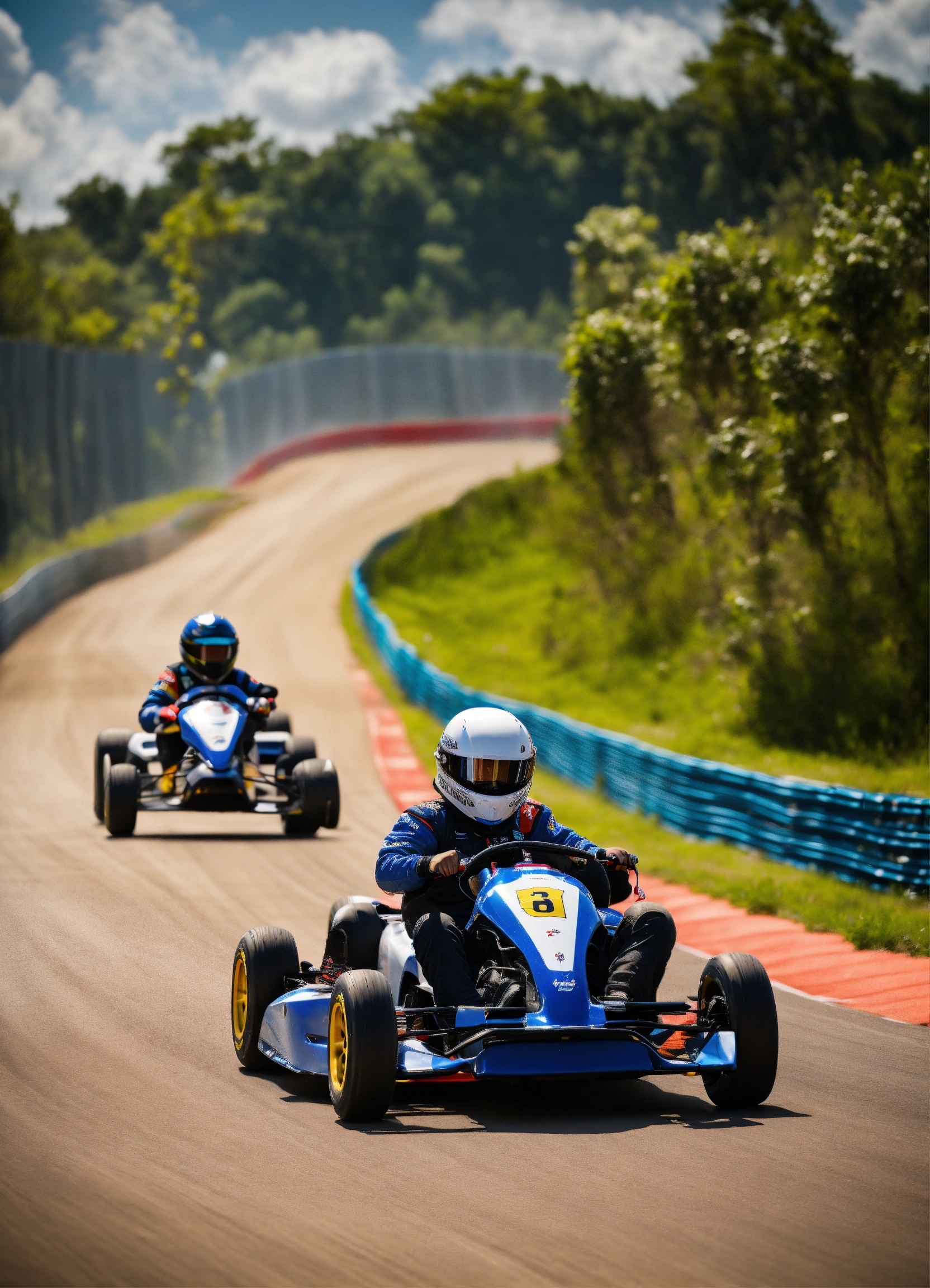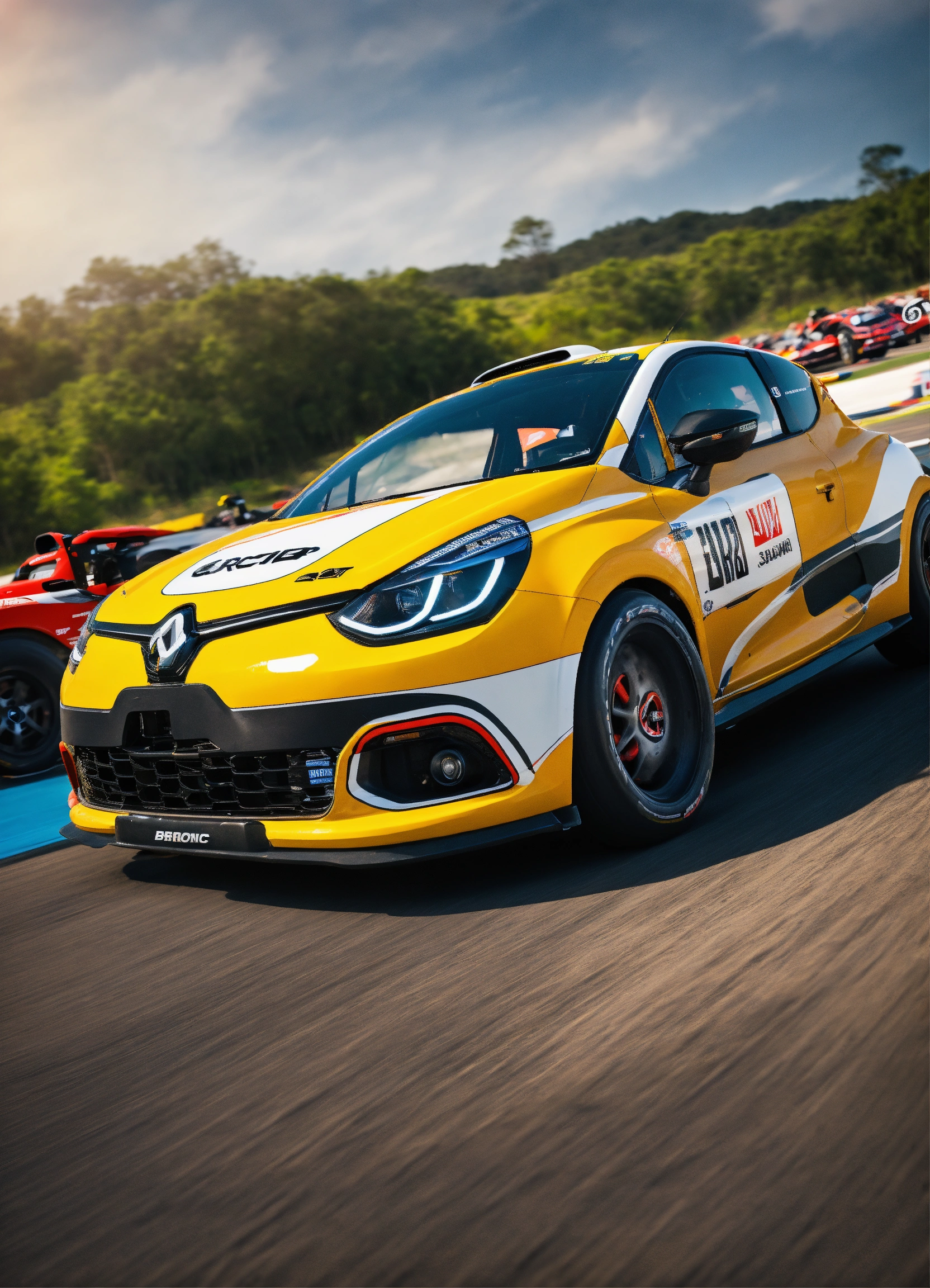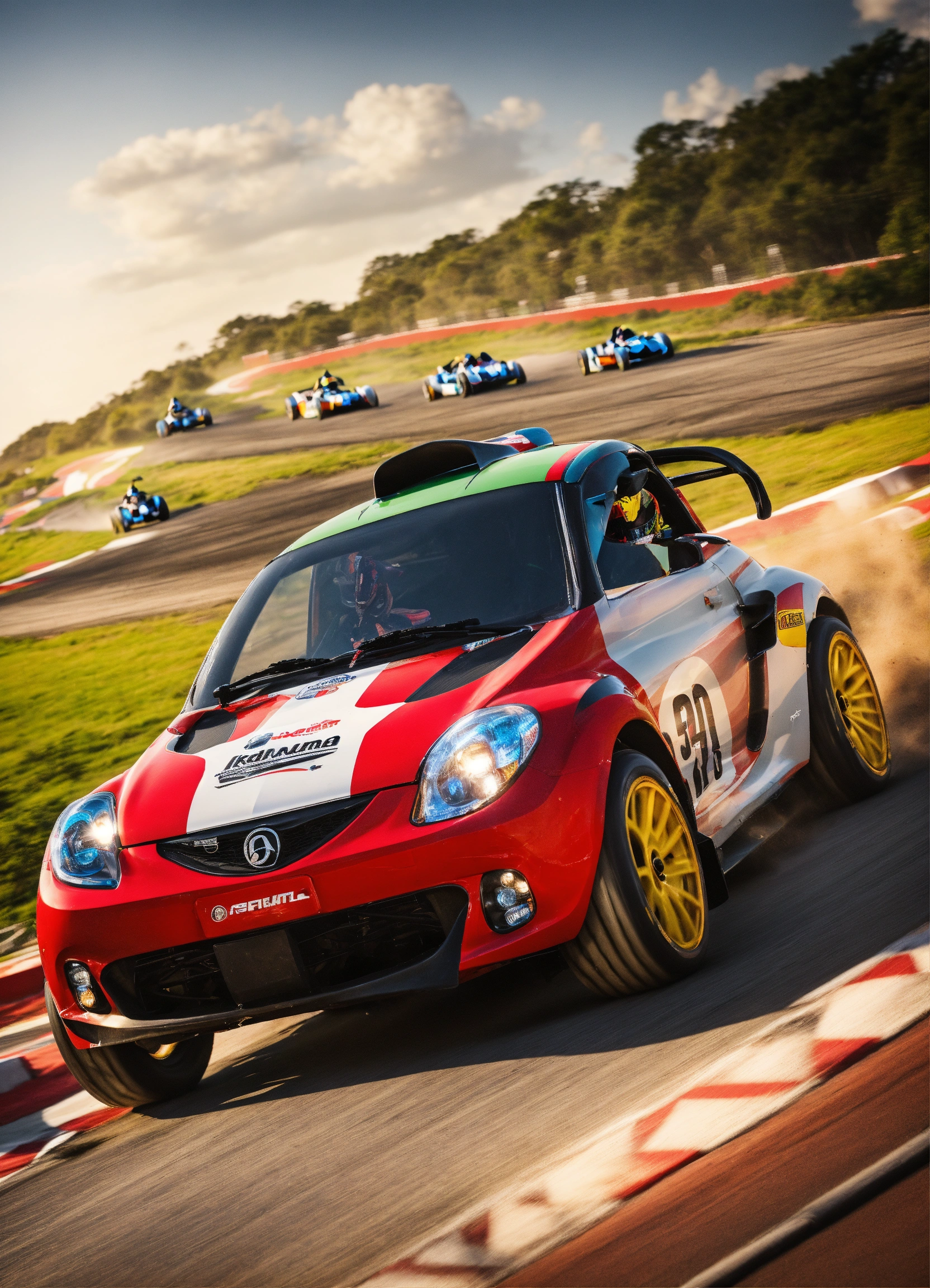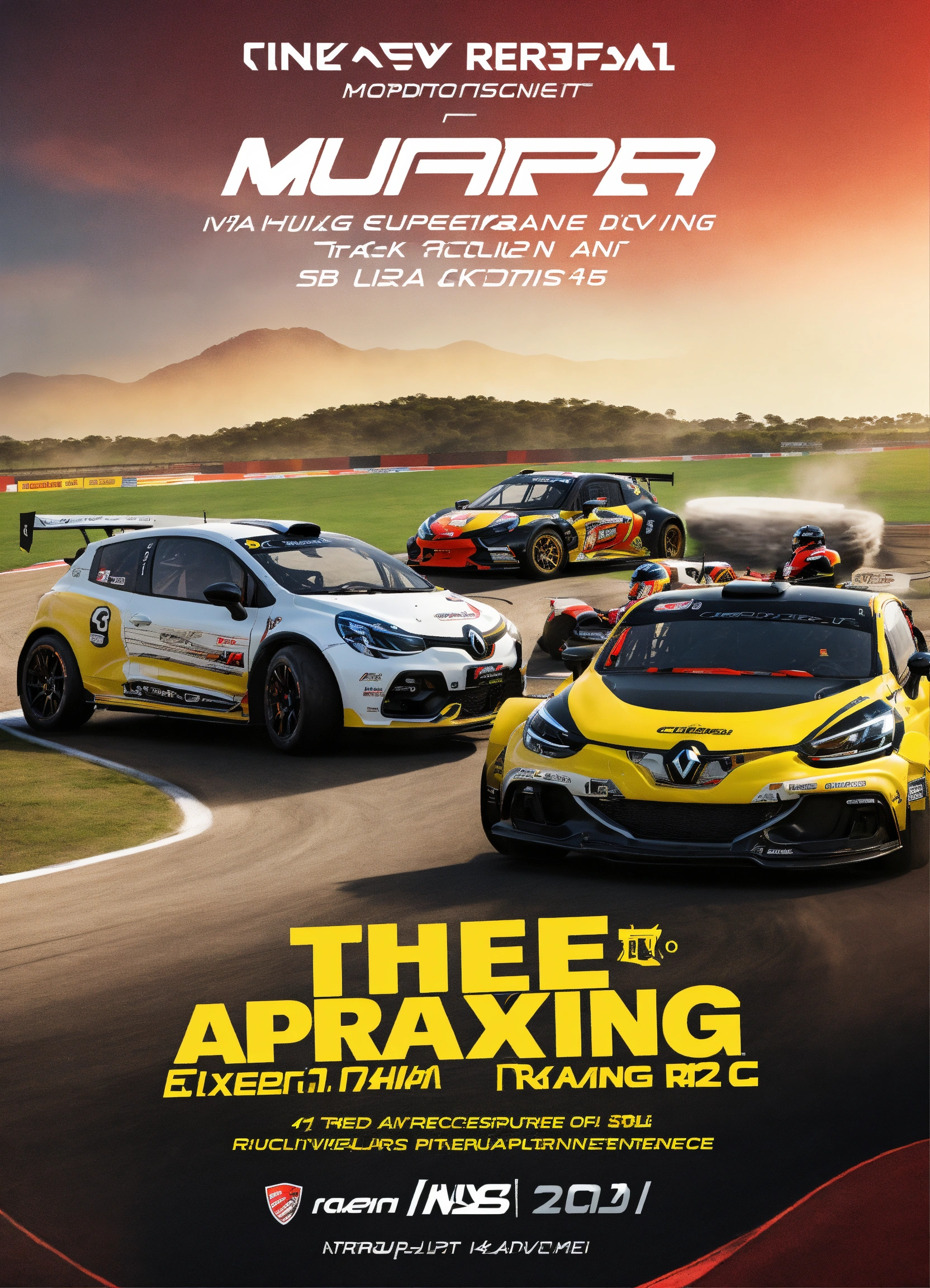 Generate a dynamic image of a motorsports flyer showcasing three thrilling driving experiences ultimate track experience - featuring the clio, sr1, and sr3, where participants can feel the rush of high-speed racing on a professional track. 4x4 branco adventure - highlighting off-road excitement with the rugged branco vehicles, offering an adrenaline-pumping journey through challenging terrains. karting - arrive and drive - showcasing instant racing fun suitable for all ages and skill levels on an exhilarating karting track. the image should convey the excitement and diversity of these motorsports experiences, enticing potential participants to take part in the adventure."