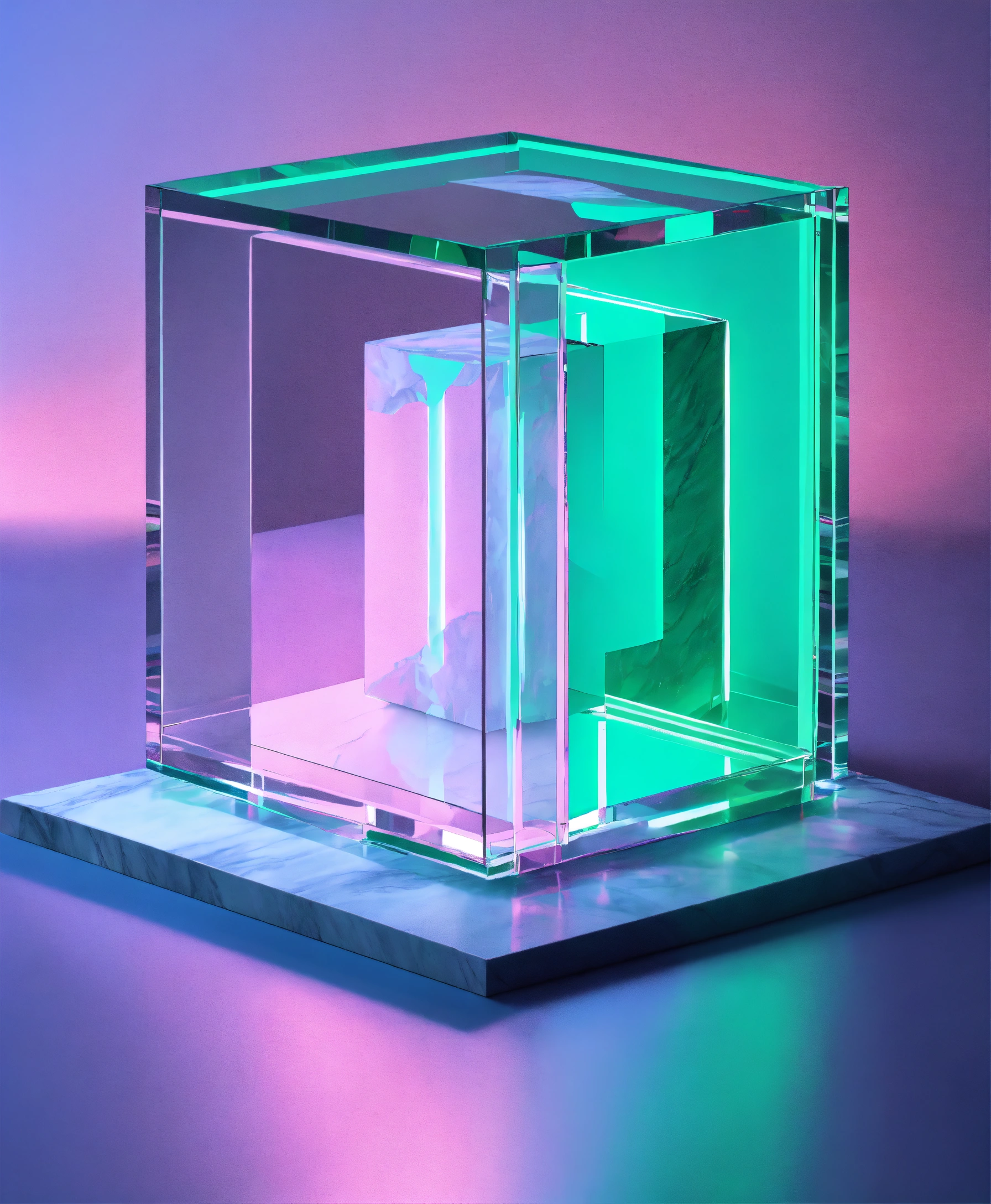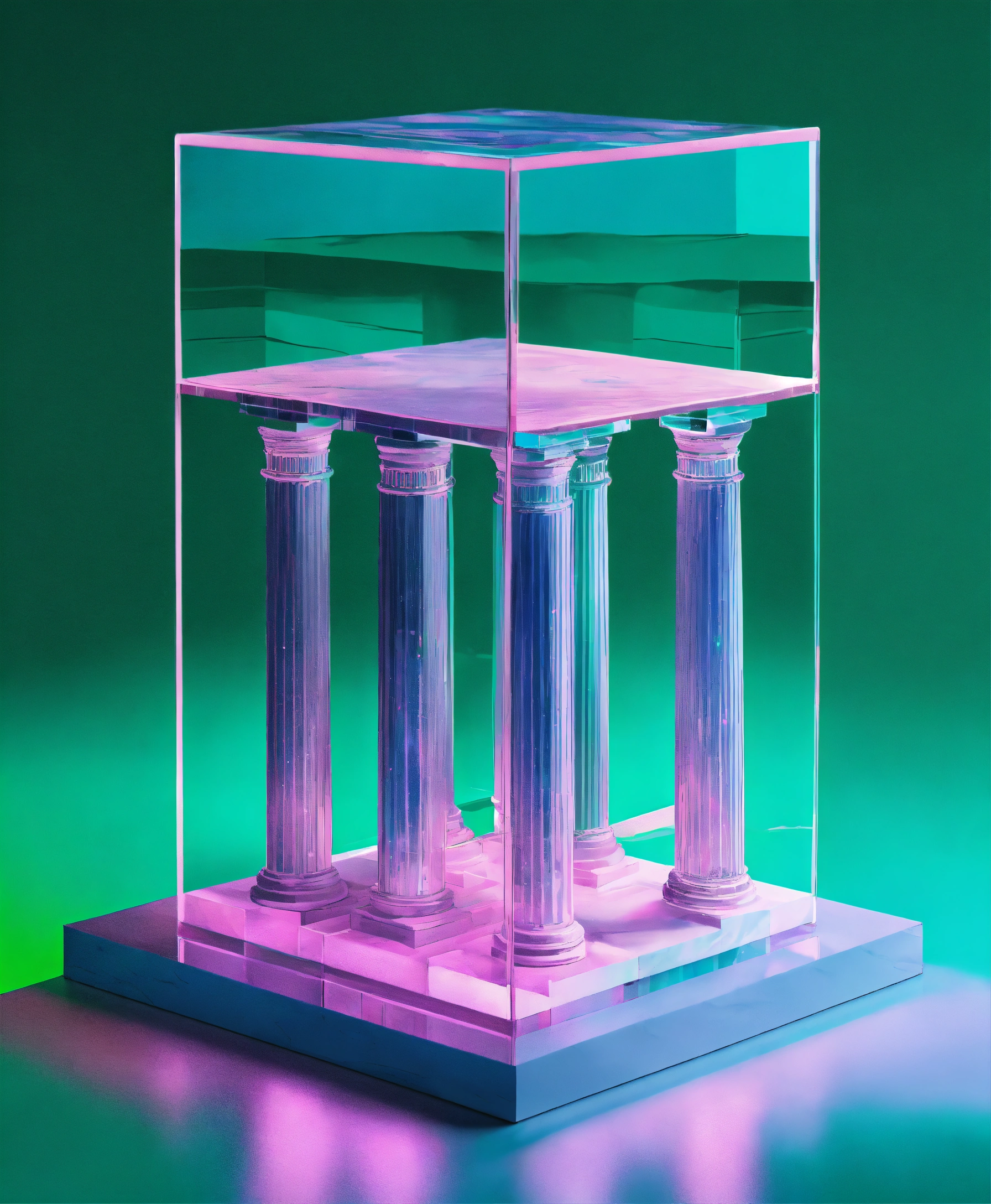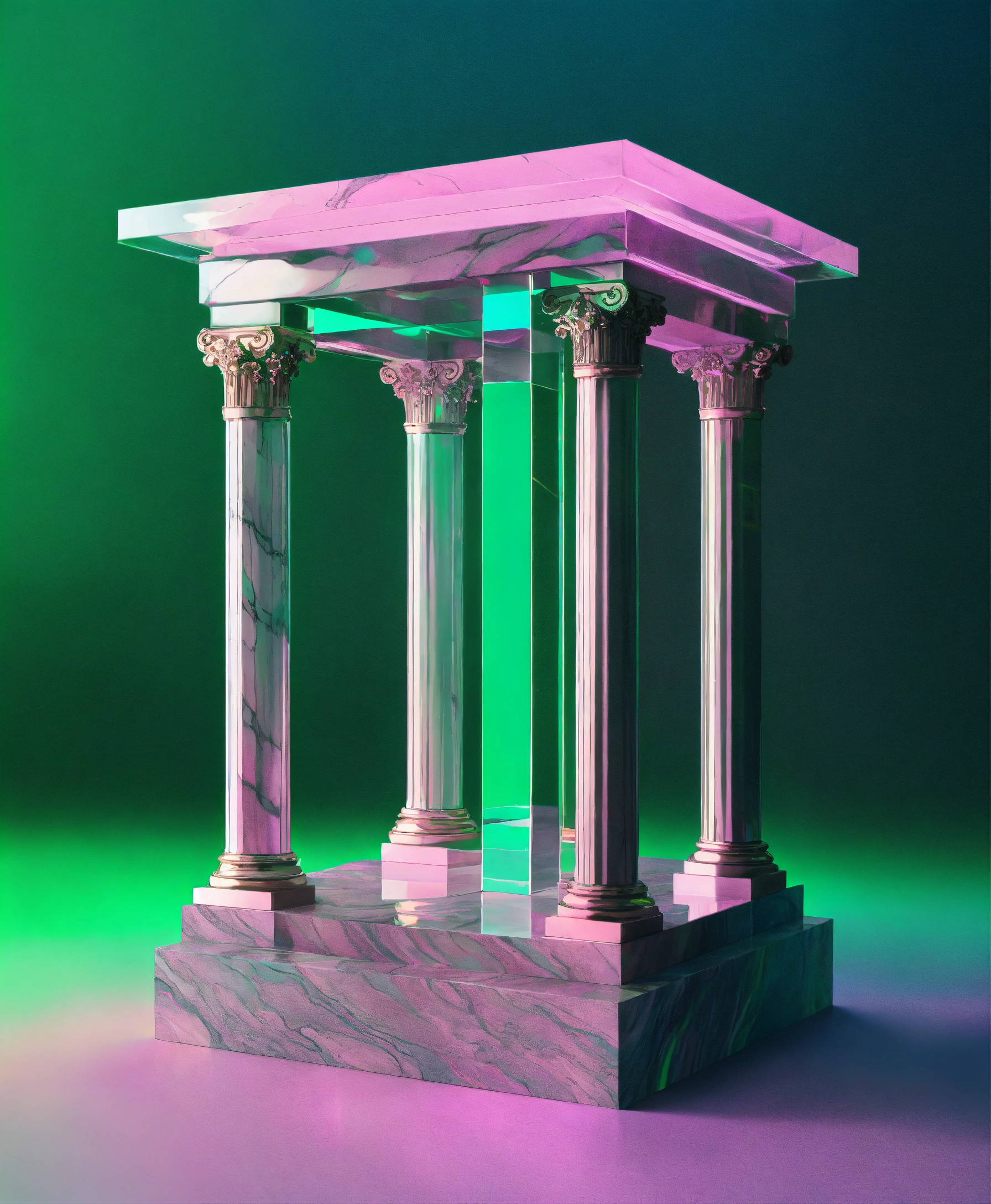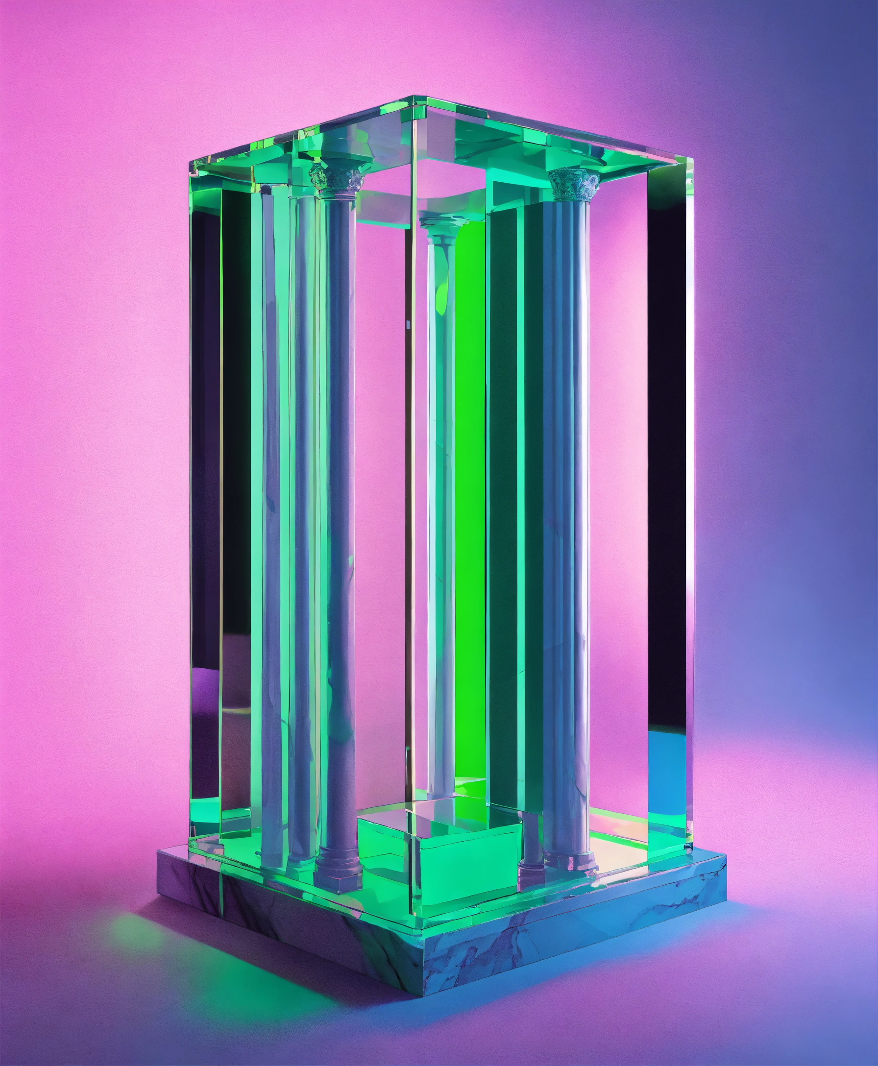 Isometric clear glass cube, stacked marble roman columns, studio photography, some neon green accent color, 4k, iridescent! muted color background! realistic!