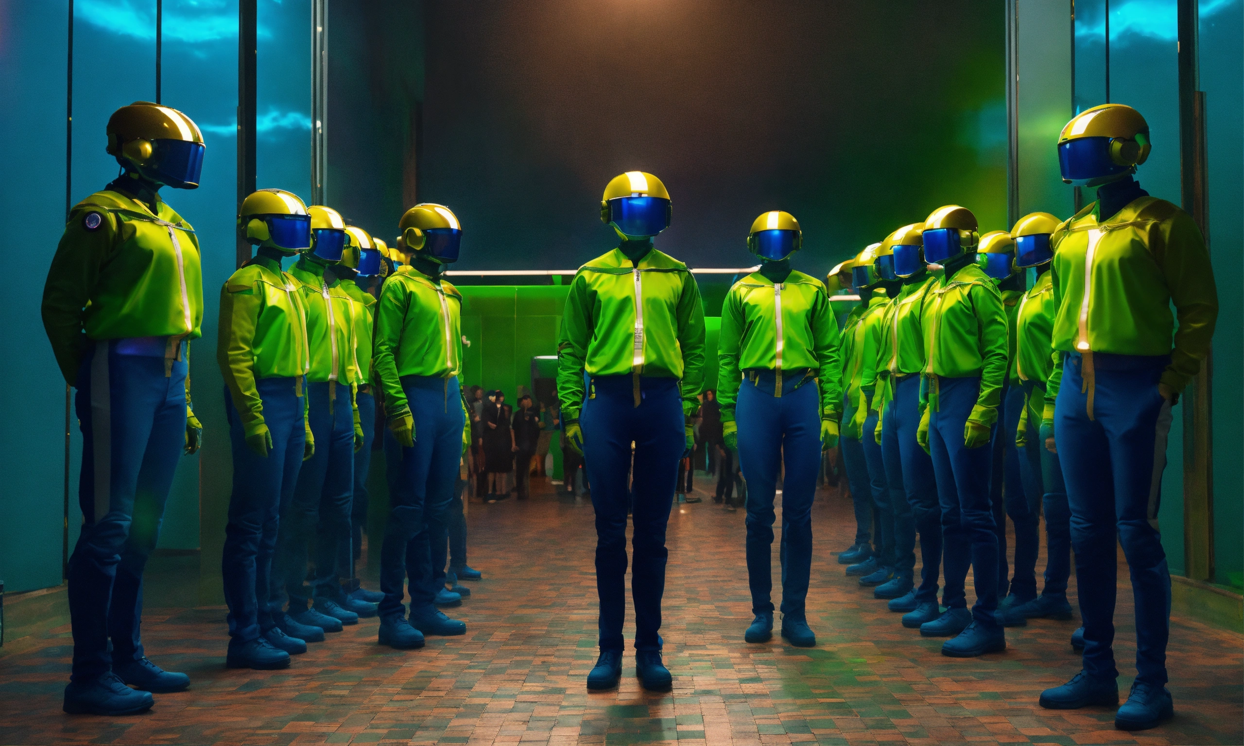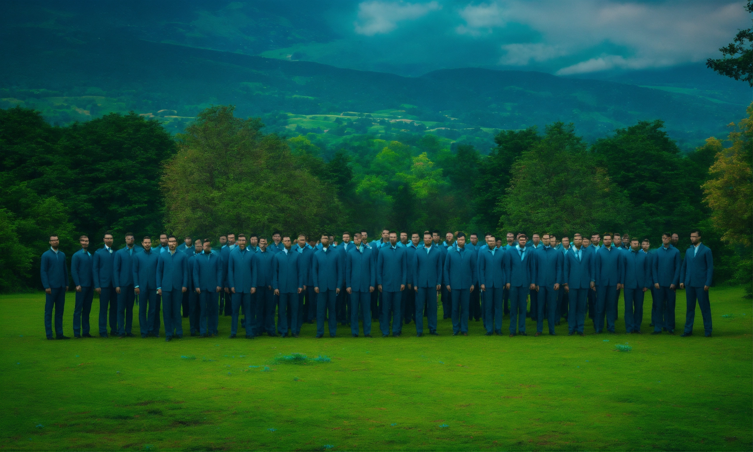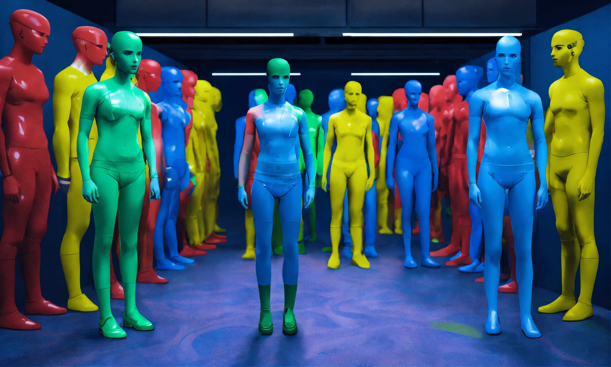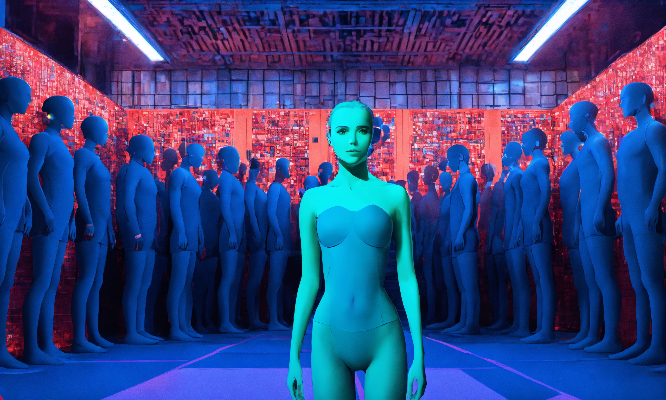 An ai that is able to clone a person, the person and the clone stand in the center of the picture, the colours should be tones of blue and some green