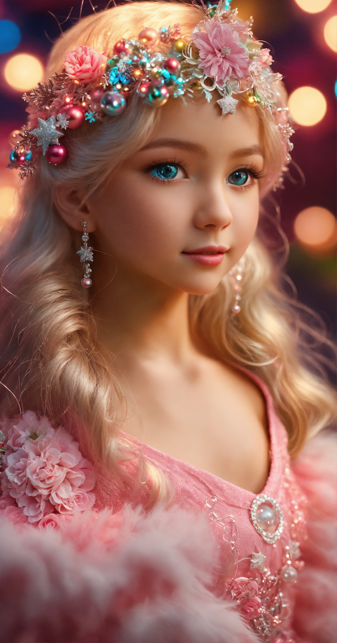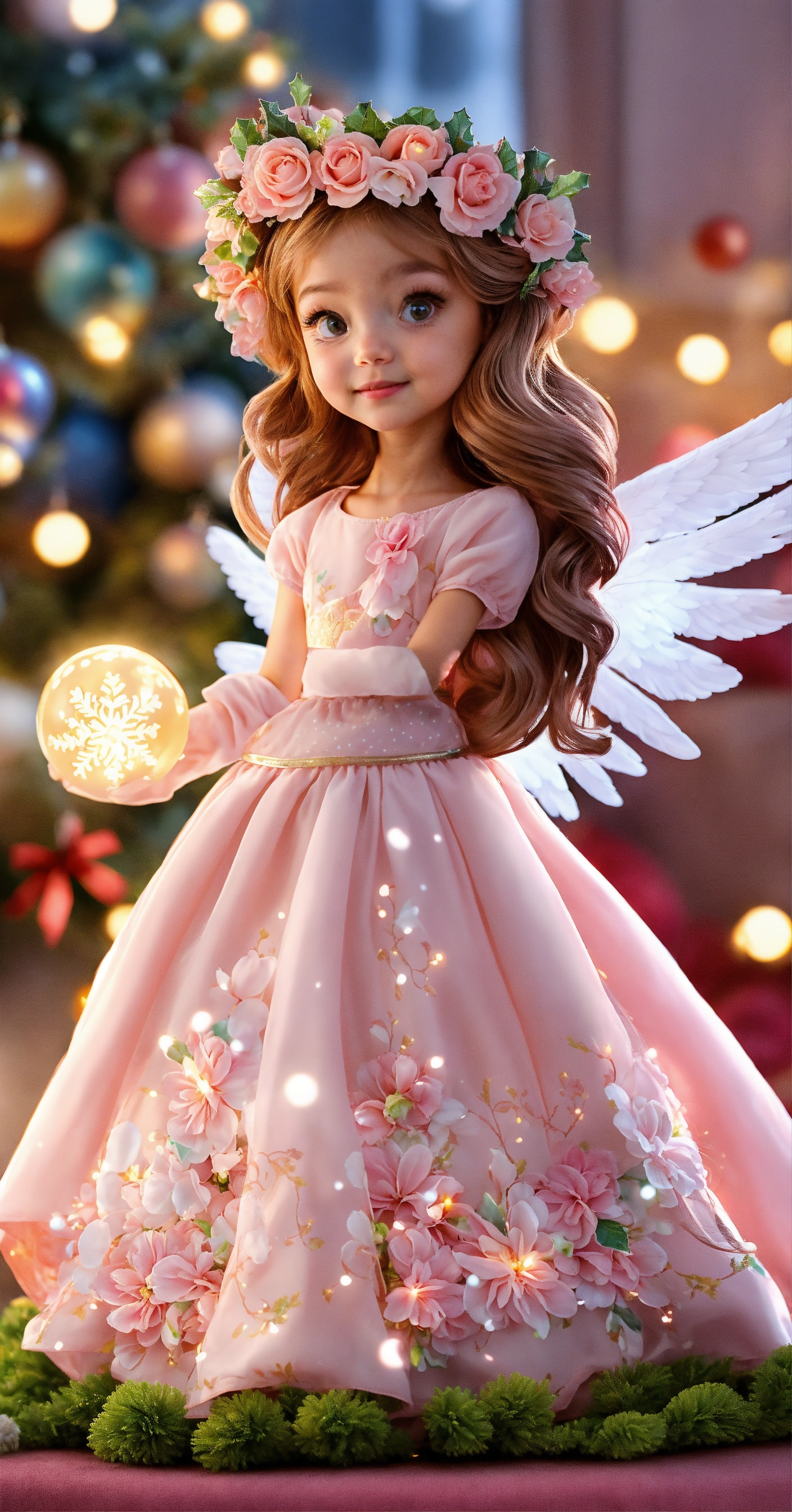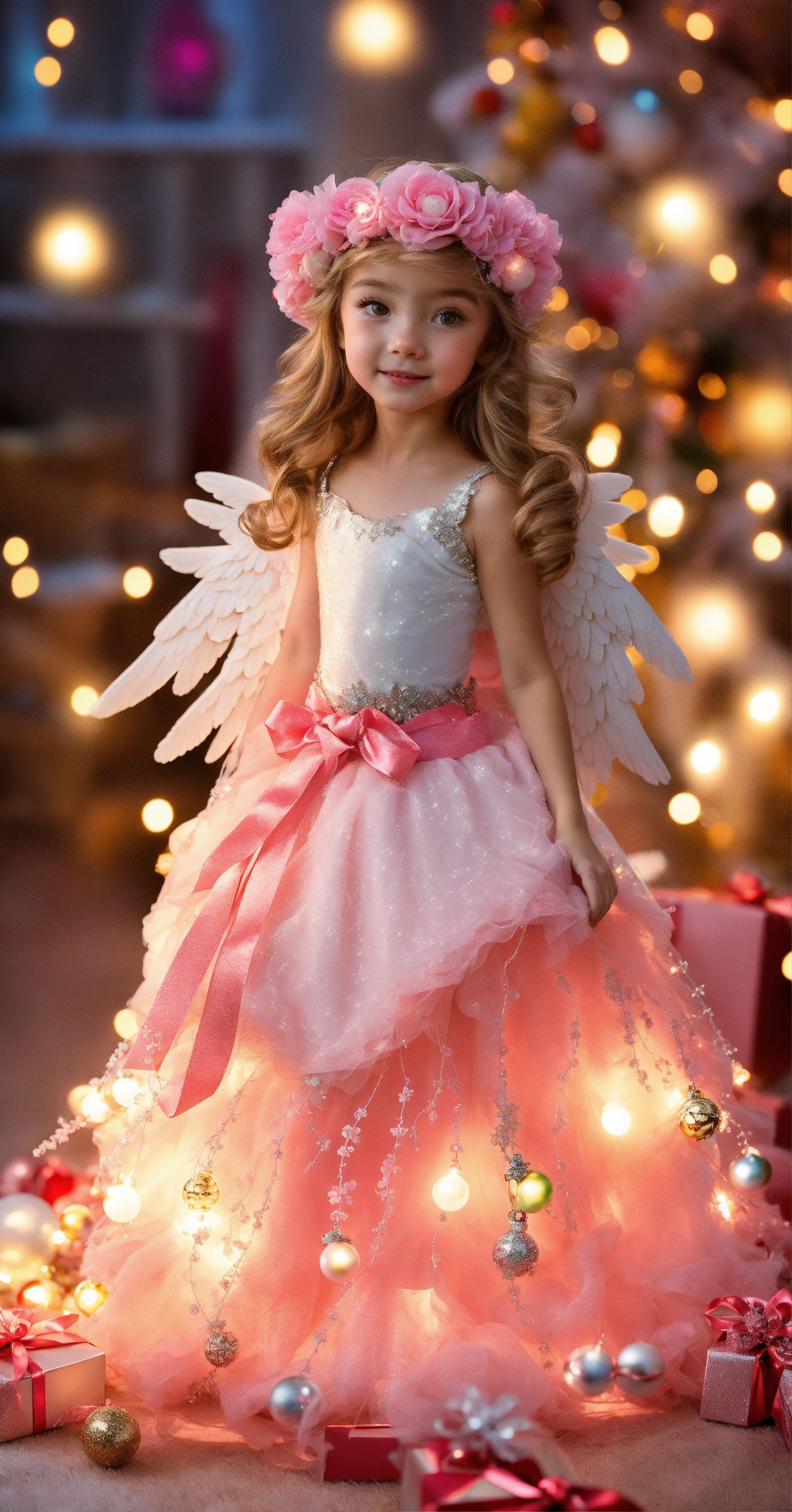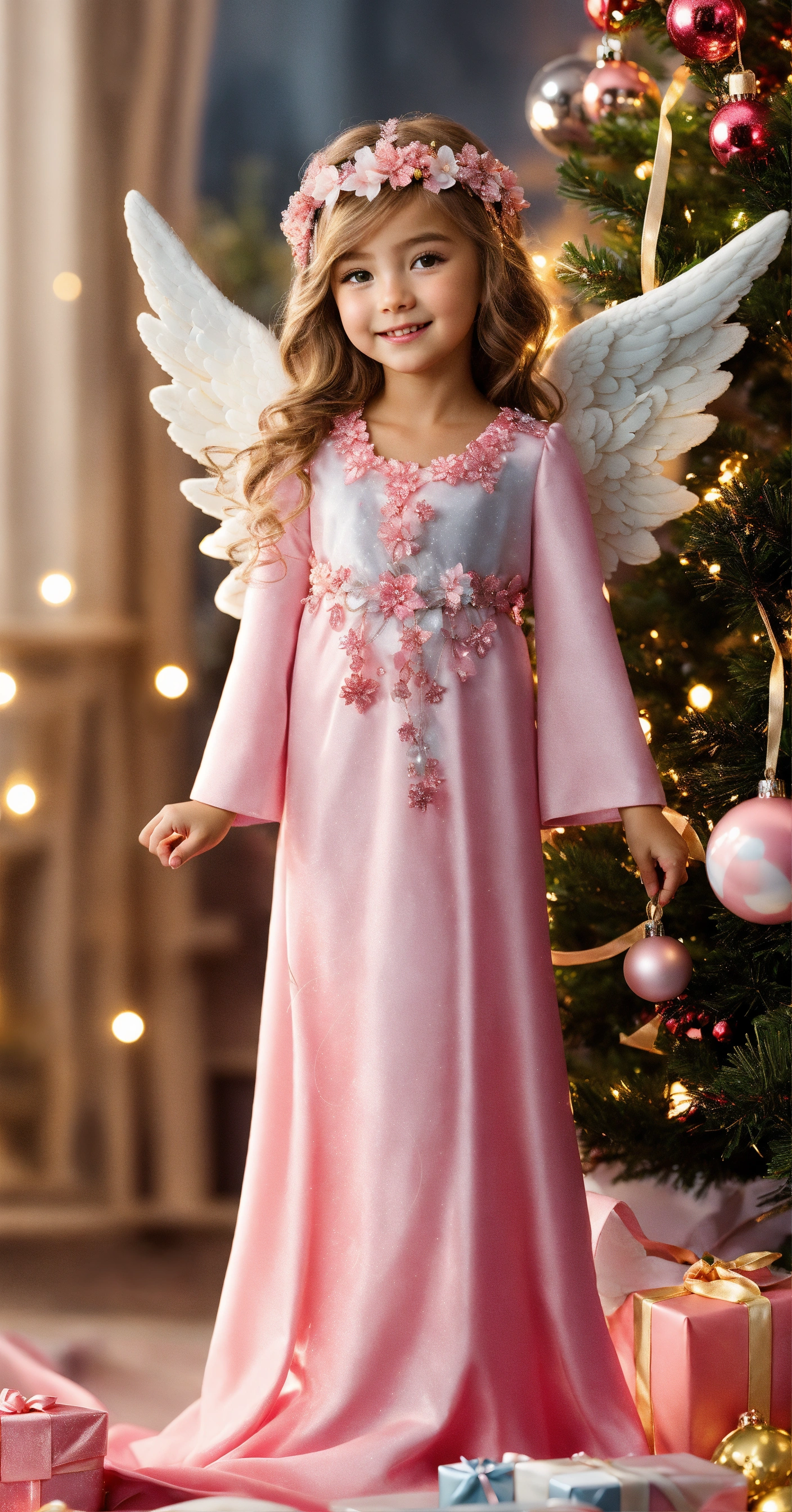 Árbol de navidad hermoso y detallado de color blanco y bolas de navidad rosadas y luces de colores rosadas y plateadas, tiene cajas de regalo de color plateado con moños rosados, al lado hay un angel niña de 12 años hermosa y perfecta con alas de angel de color rosado detalladas y luminosas, rostro hermoso y detallado, ojos claros con mirada profunda, angel sonriendo, cabello blanco, sombrero navideño de color rosado, tunica blanca con detalles rosados, obra maestra, realismo, ilustración digital, ilustración hiperdetallada, hd, alta calidad y resolución 8k