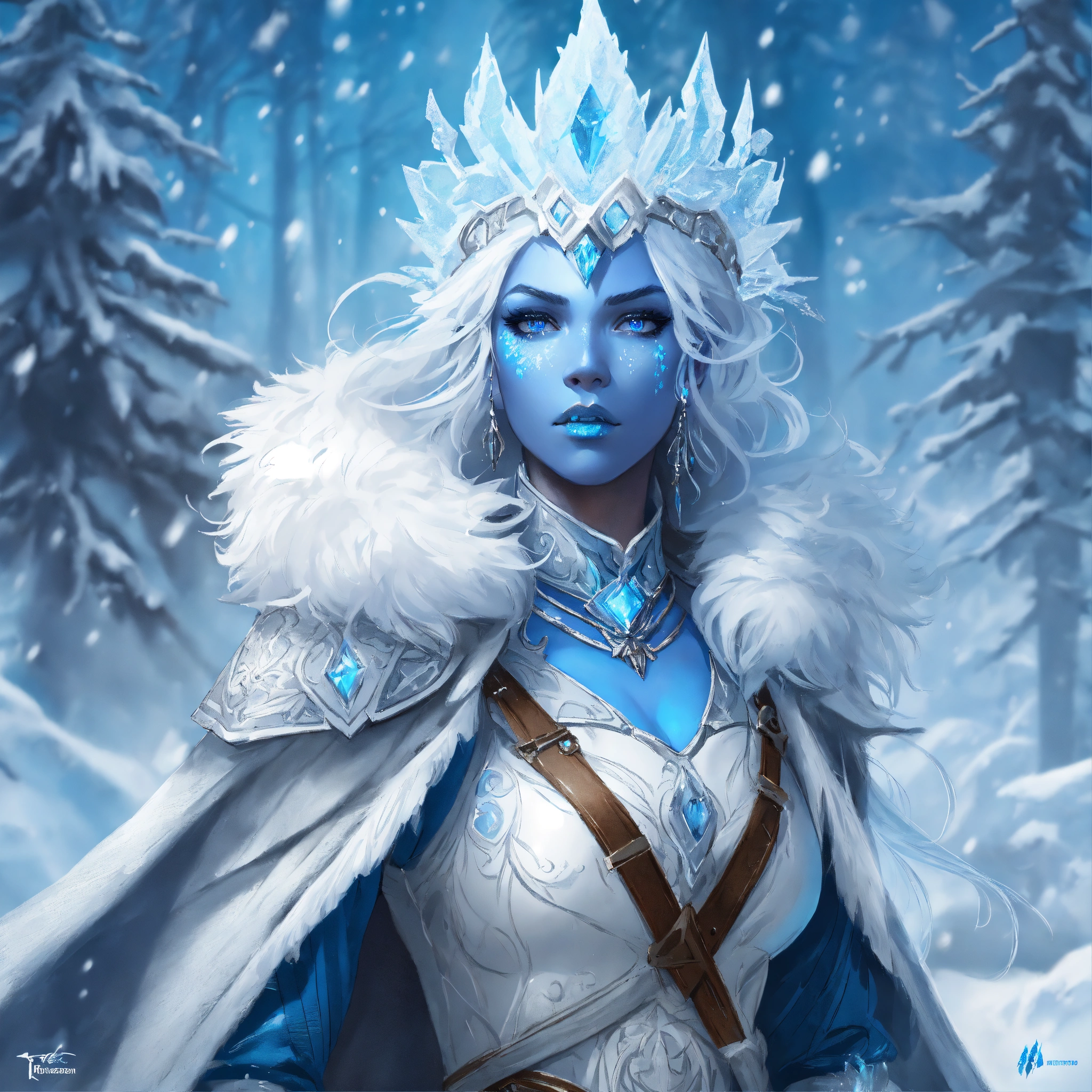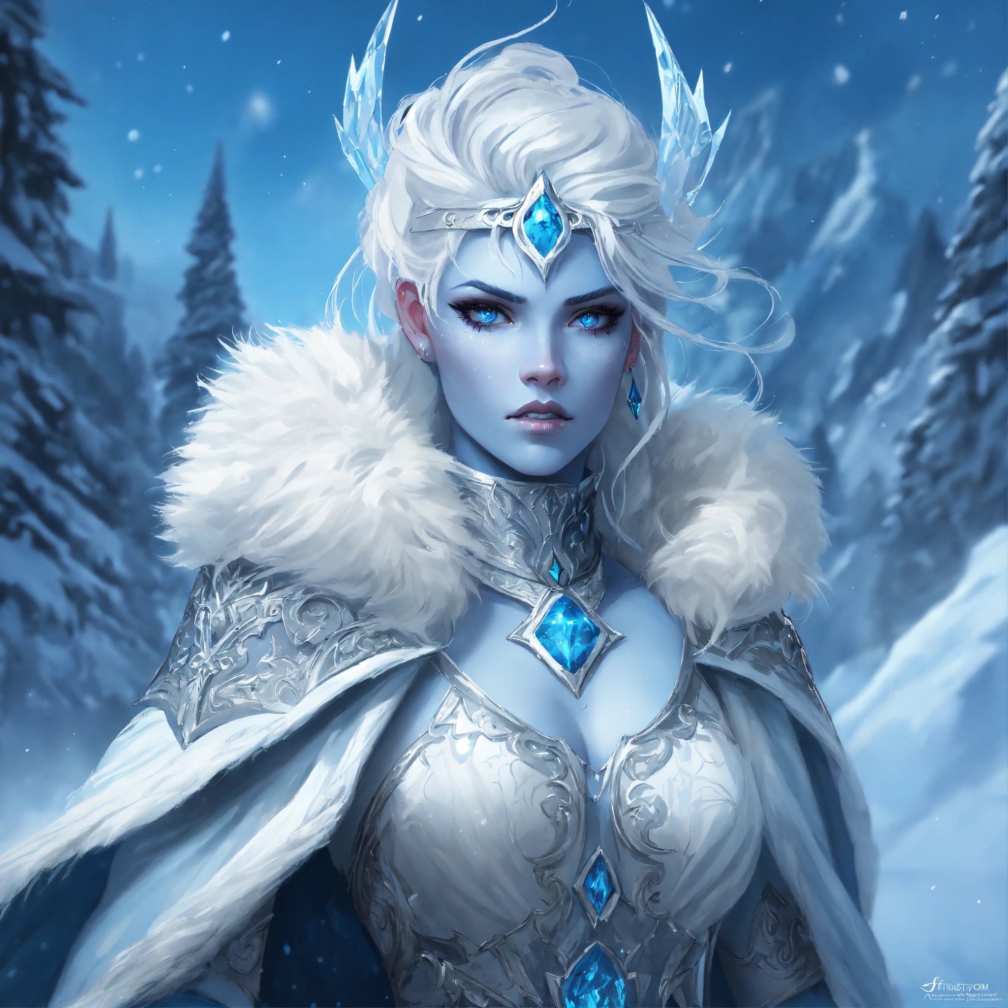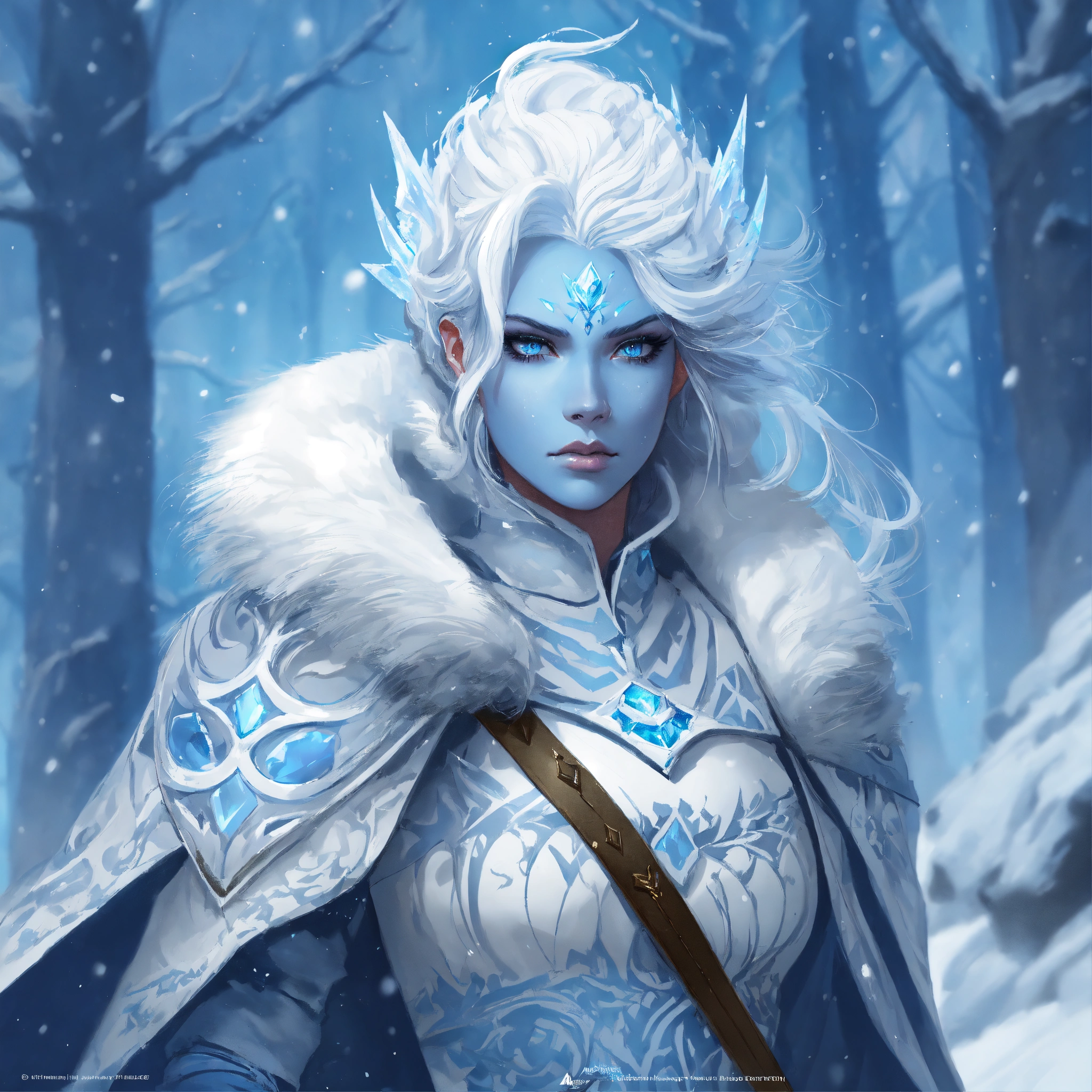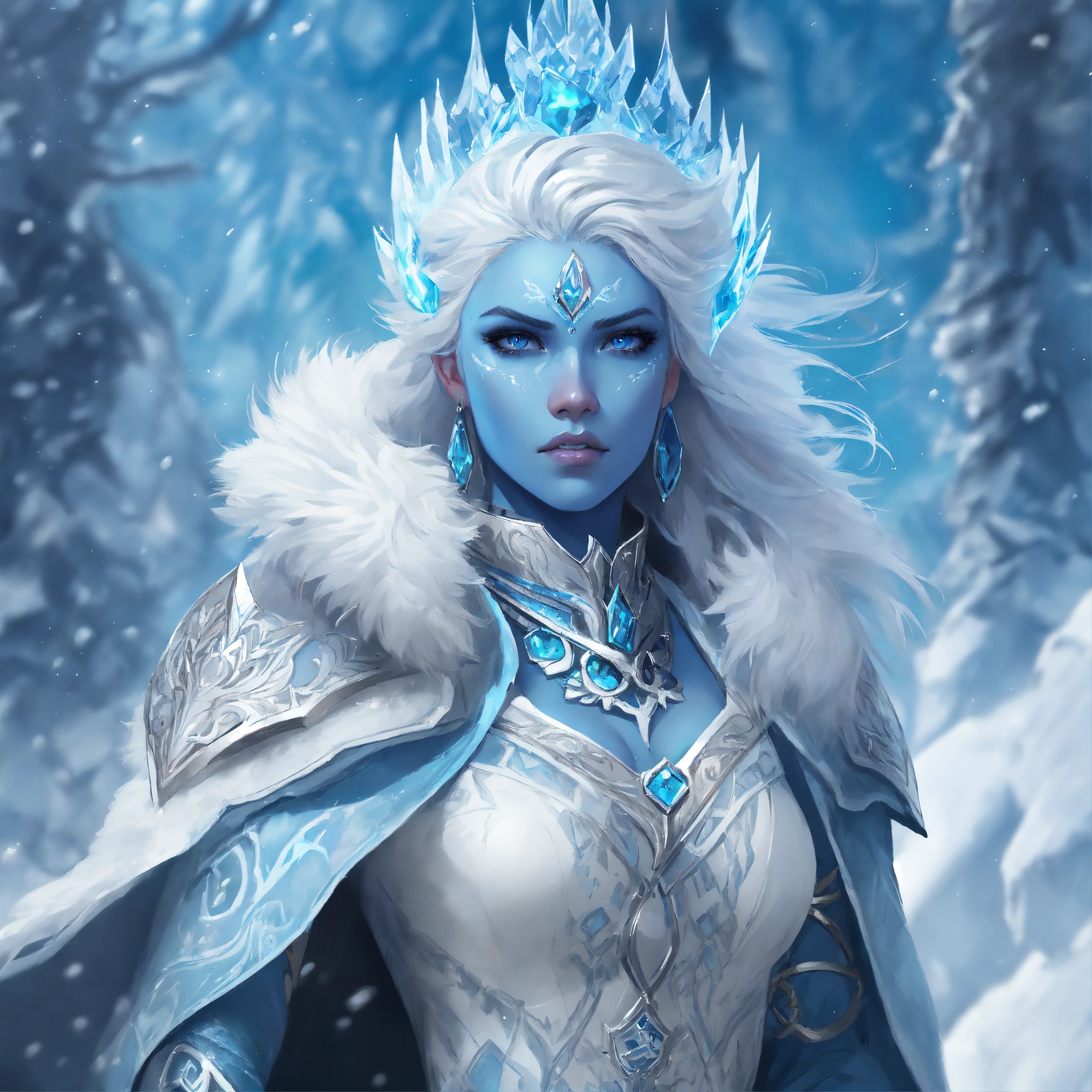 Ultra realistic illustration fantasy, ice genasi, young woman, blue skin, ice elemental, frost queen, stern expression, fierce look, piercing eyes, winter, frost, white hair, regal, explorer, elegant, highly detailed, digital painting, artstation, concept art, sharp focus, illustration, art by artgerm and greg rutkowski and alphonse mucha