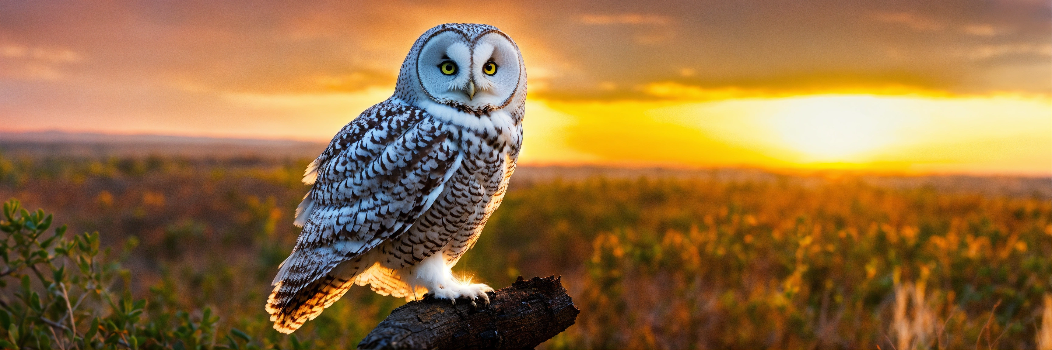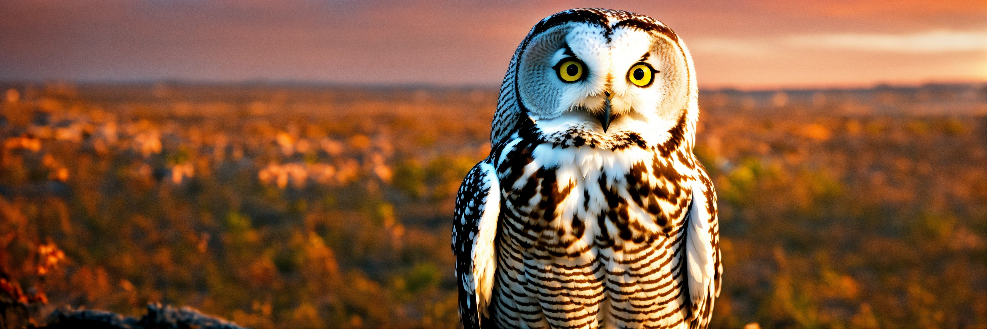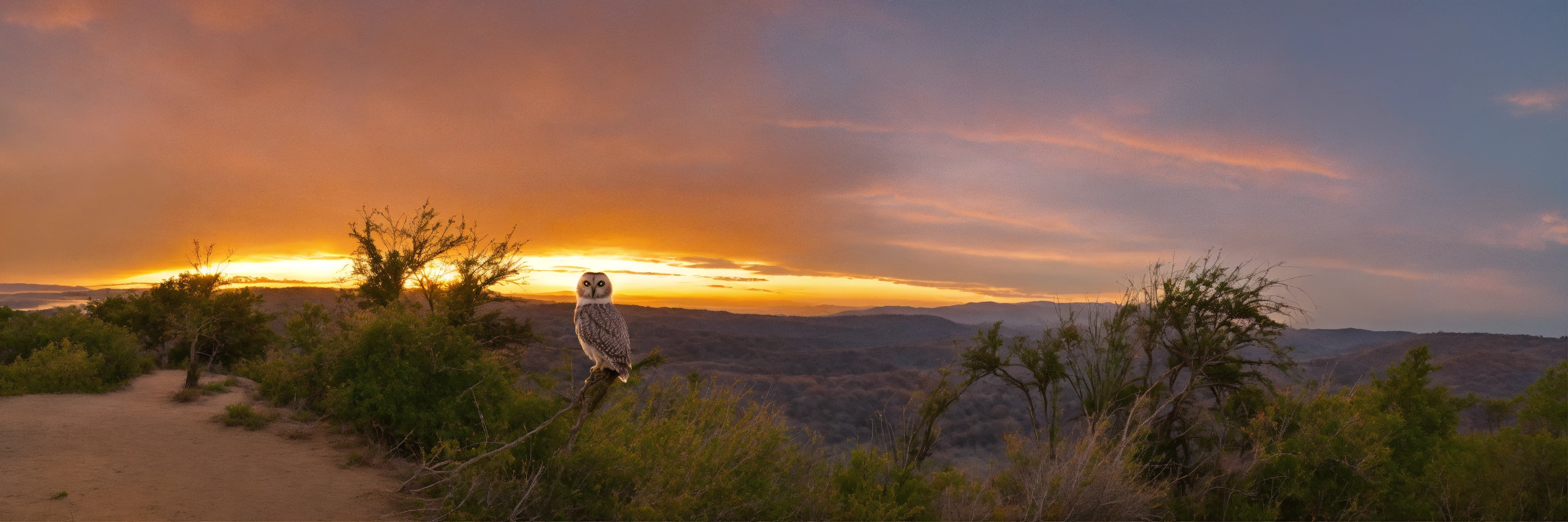 A white and light gray small owl with a sunset in the back ground
